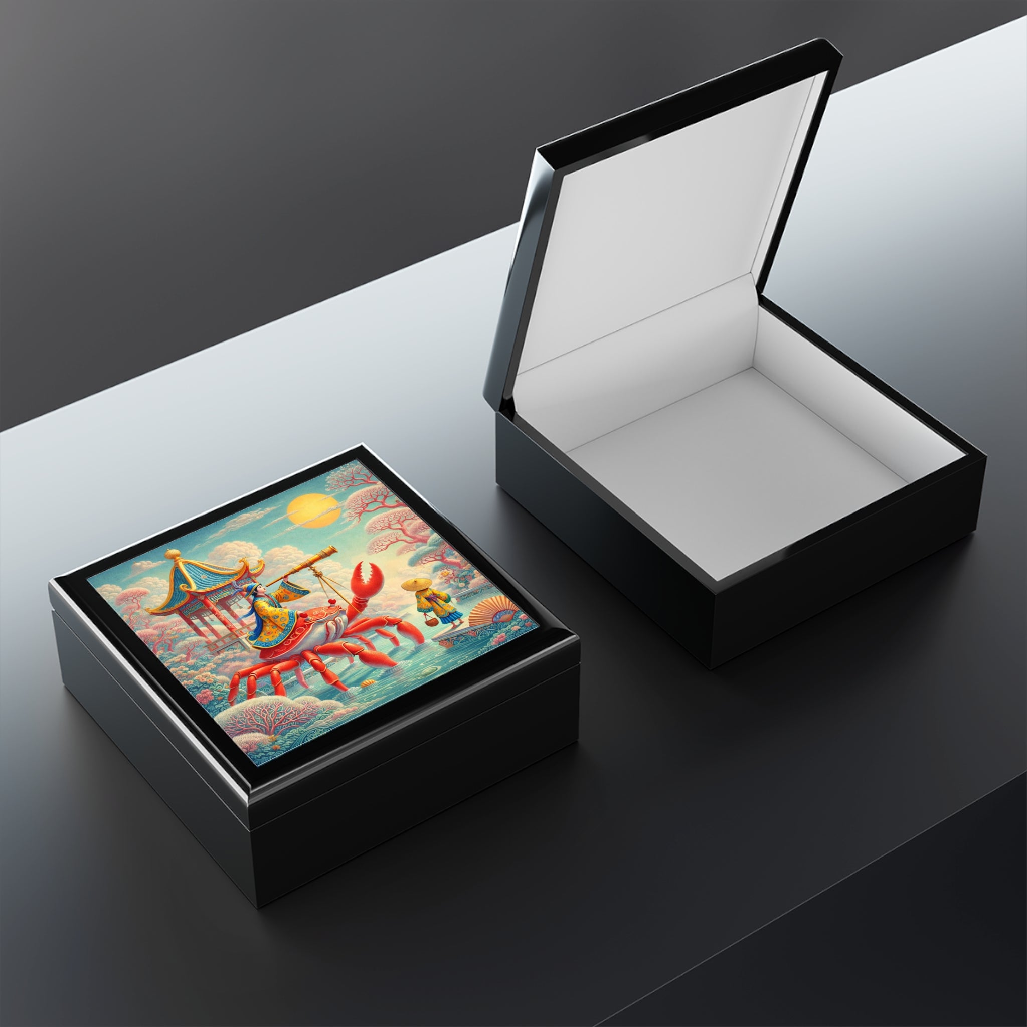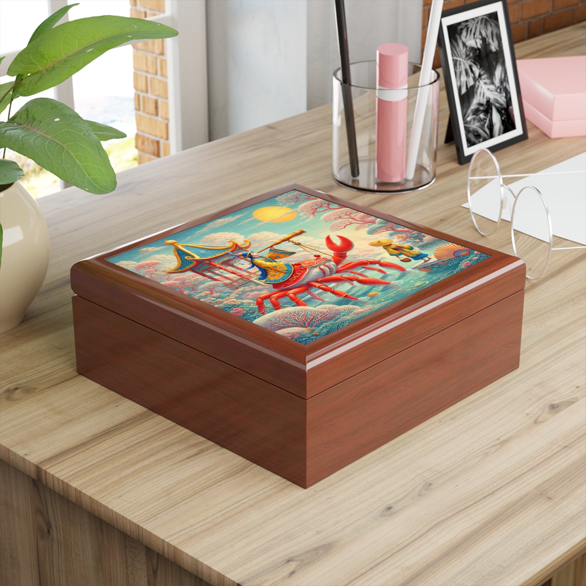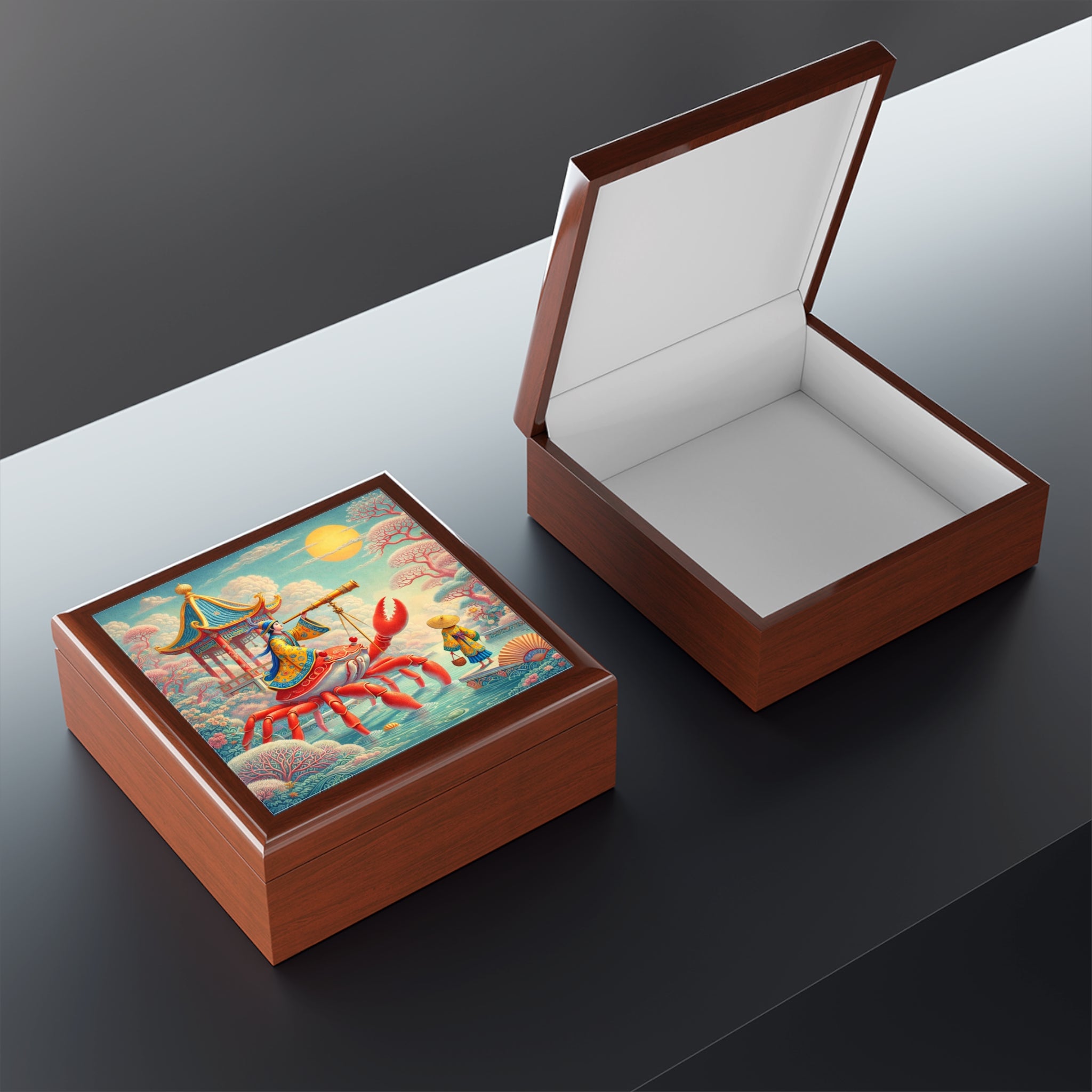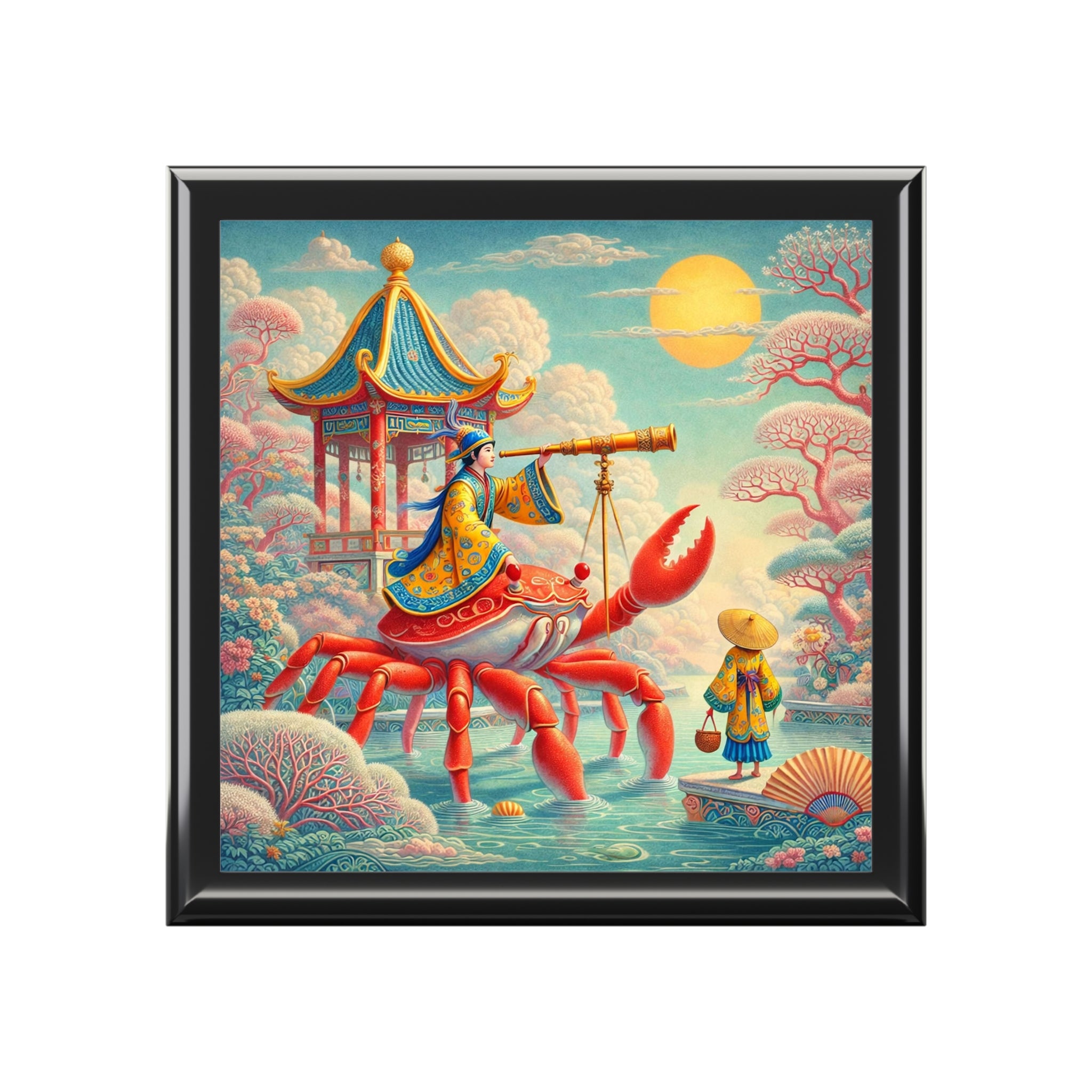 The Celestial Crab Navigator Jewelry Box blends functional elegance with imaginative storytelling, offering a refined place to store treasured pieces while bringing a sense of wonder to your space. Crafted from high-quality rubberwood with a glossy finish, this jewelry box opens smoothly on dual hinges and reveals a softly felt-lined interior designed to protect rings, earrings, and keepsakes. The decorative ceramic tile set into the lid transforms the box into a small art object—perfect for a vanity, dresser, or gift display.