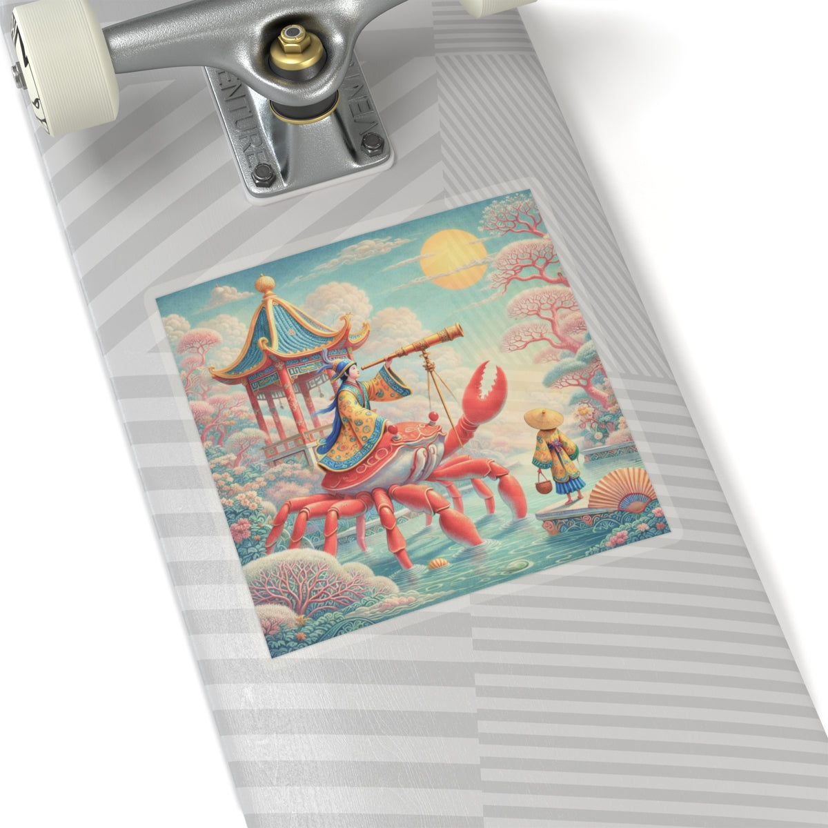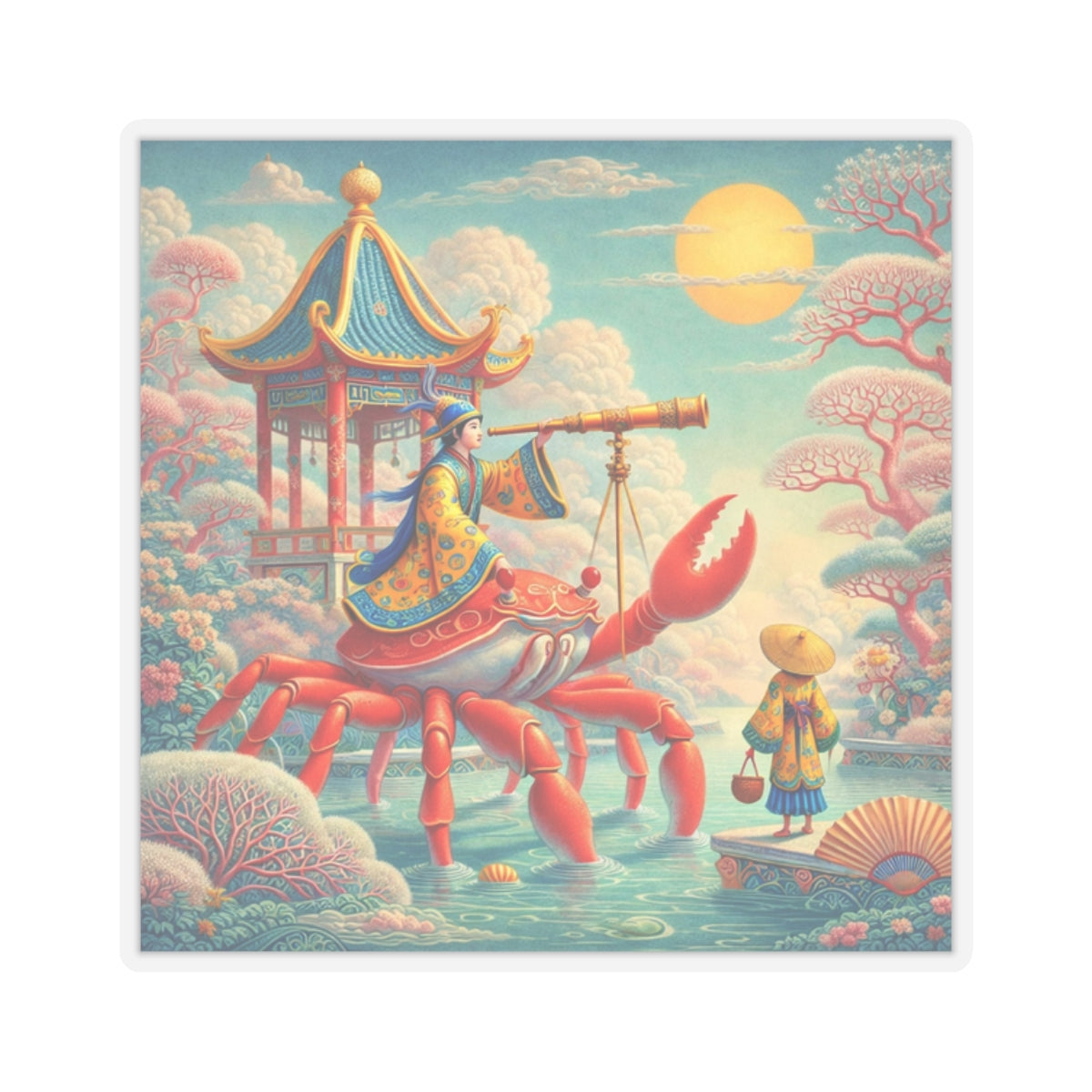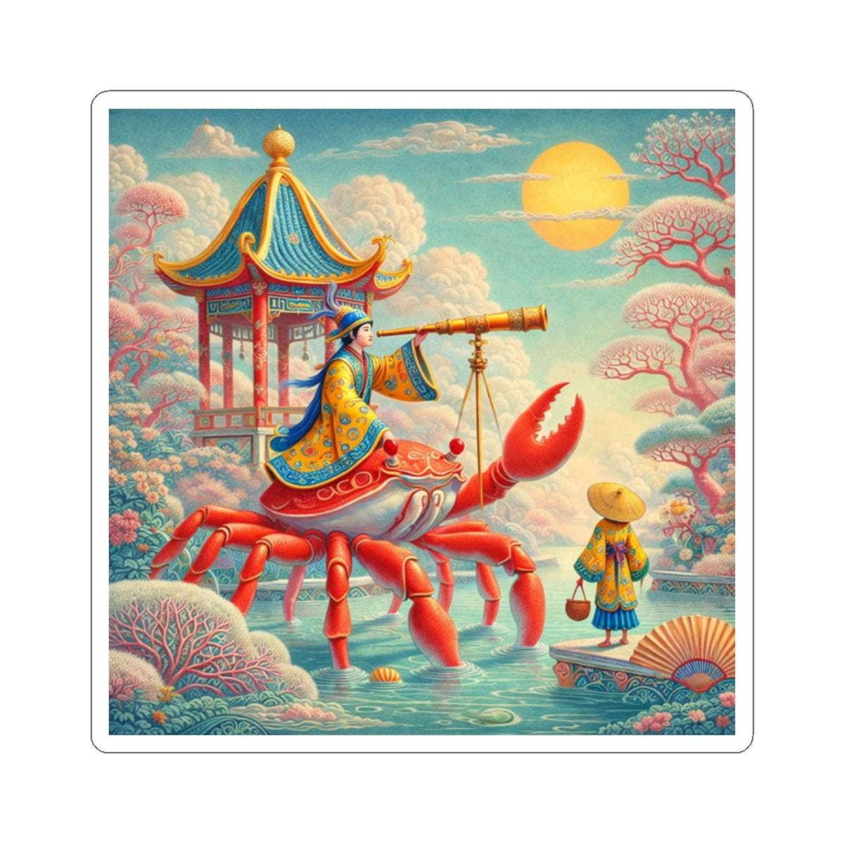 The celestial journey continues as a robed navigator rides a crimson crab, surveying stars and tides with calm purpose, transforming a simple sticker into a small piece of visual storytelling that feels both whimsical and refined.