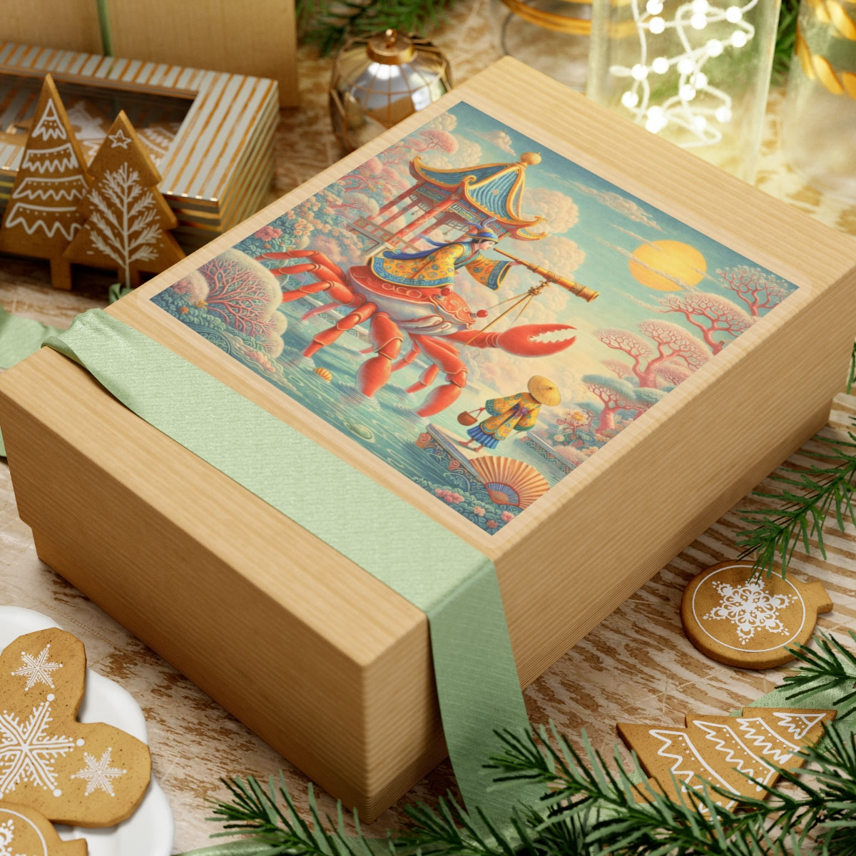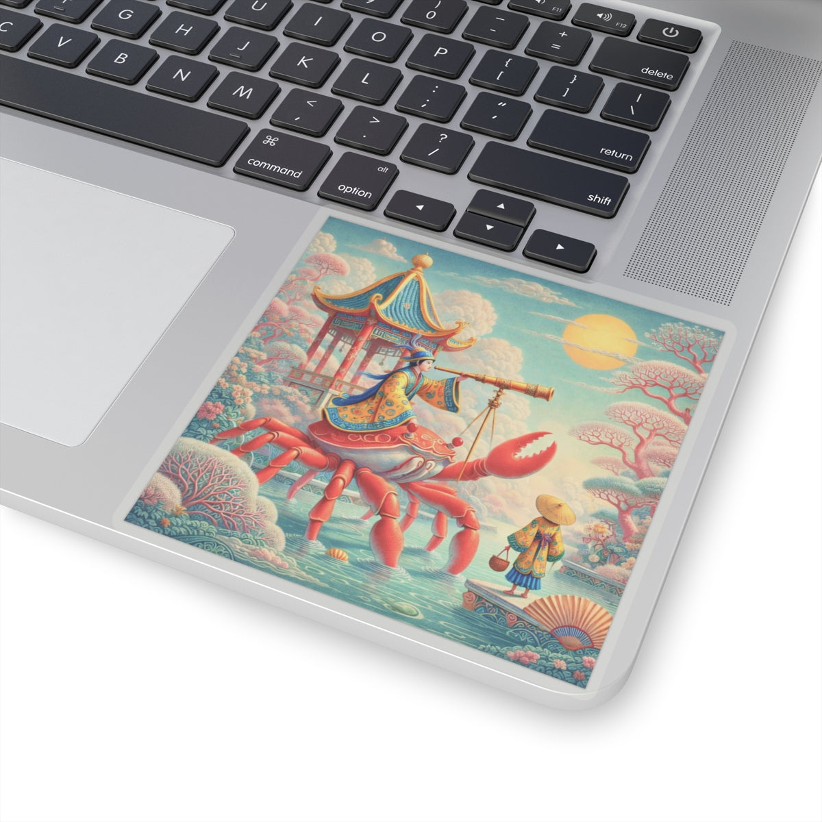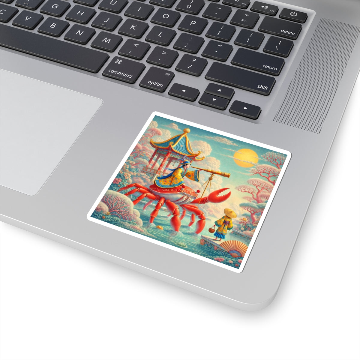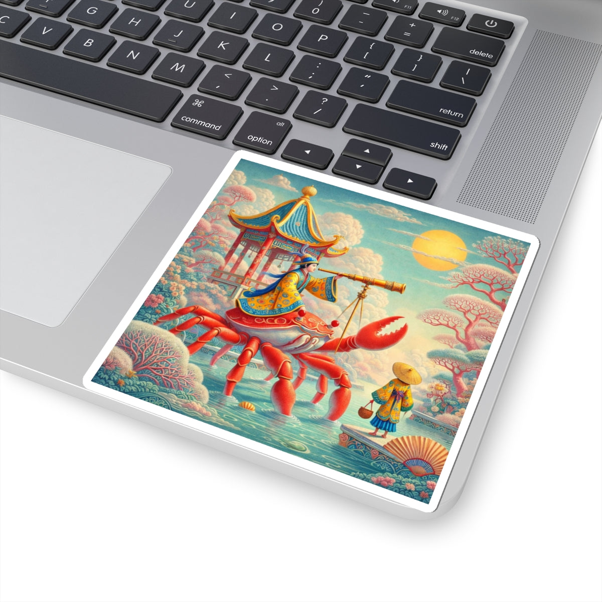 The celestial journey continues as a robed navigator rides a crimson crab, surveying stars and tides with calm purpose, transforming a simple sticker into a small piece of visual storytelling that feels both whimsical and refined.