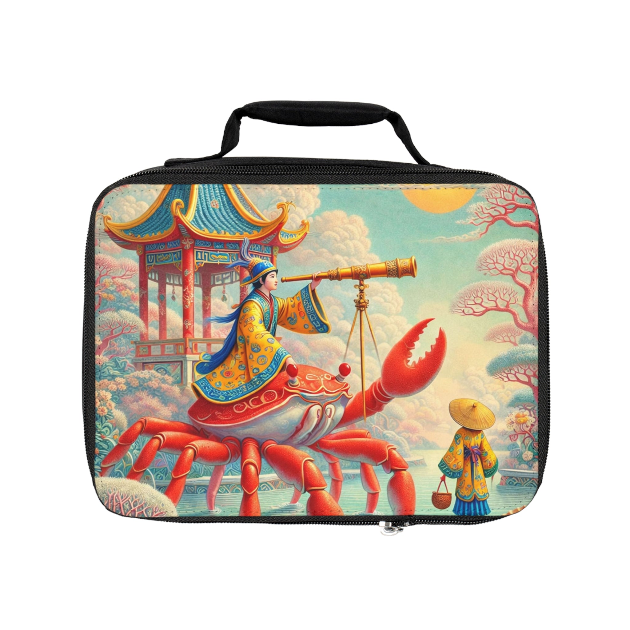 The artwork follows a richly robed figure riding atop a vivid crimson crab, gazing through a telescope as if charting stars, tides, and time itself. Pagoda forms, flowering trees, and patterned clouds frame the scene beneath a glowing sun, while a harmonious blend of corals, aquas, and warm golds creates a calm yet curious atmosphere. Blending whimsical surrealism with classical East Asian decorative influence, the design evokes poetic exploration and quiet wonder—bringing a sense of adventure to your daily routine.