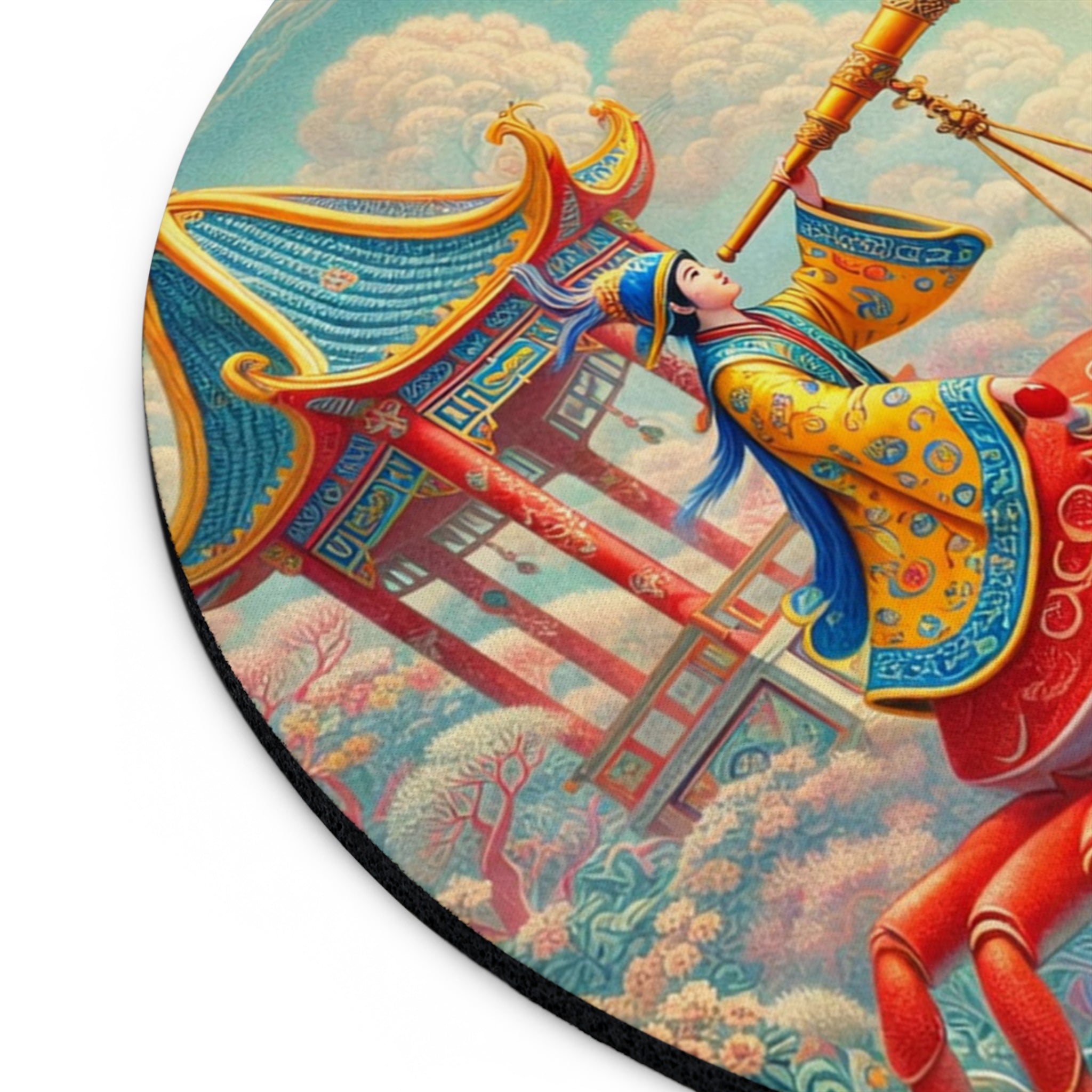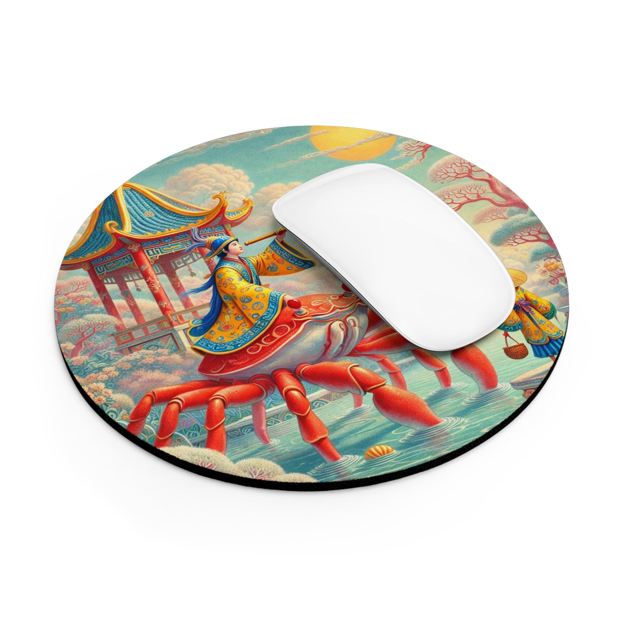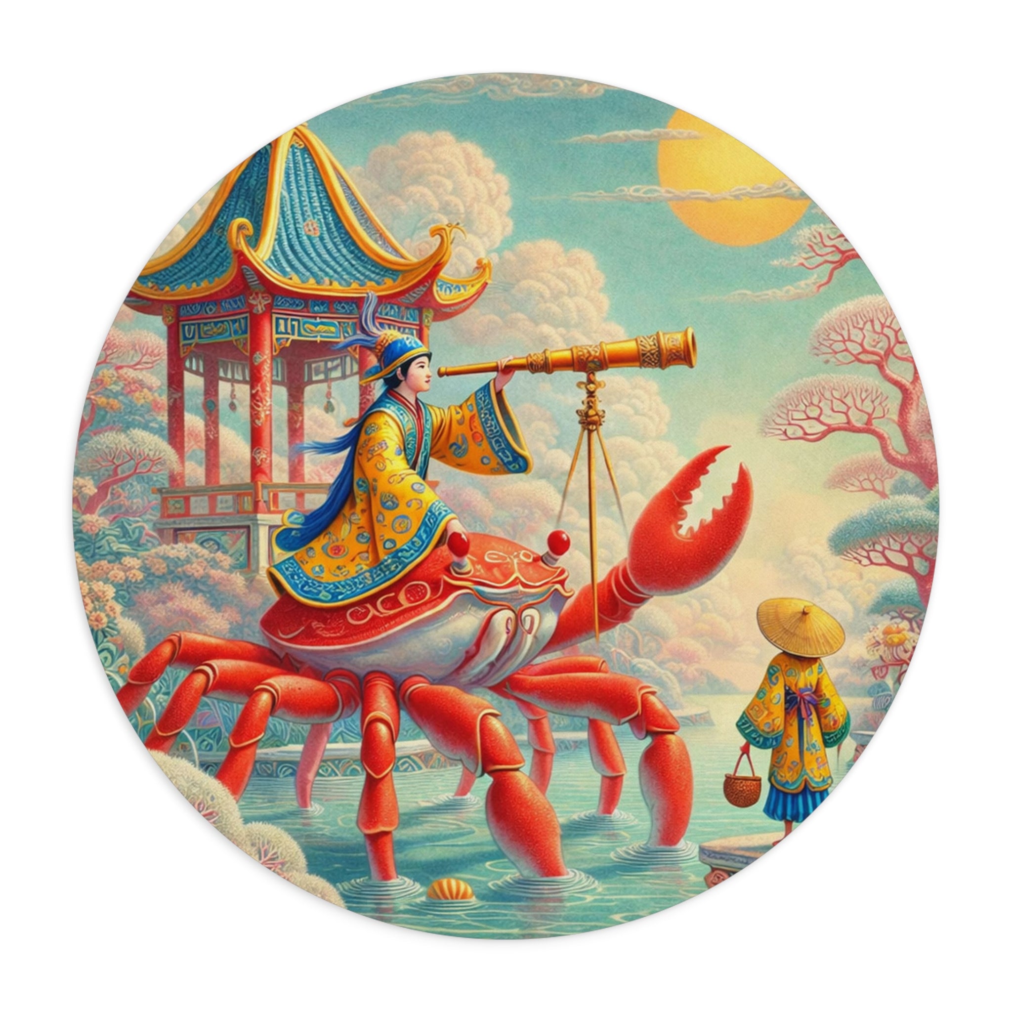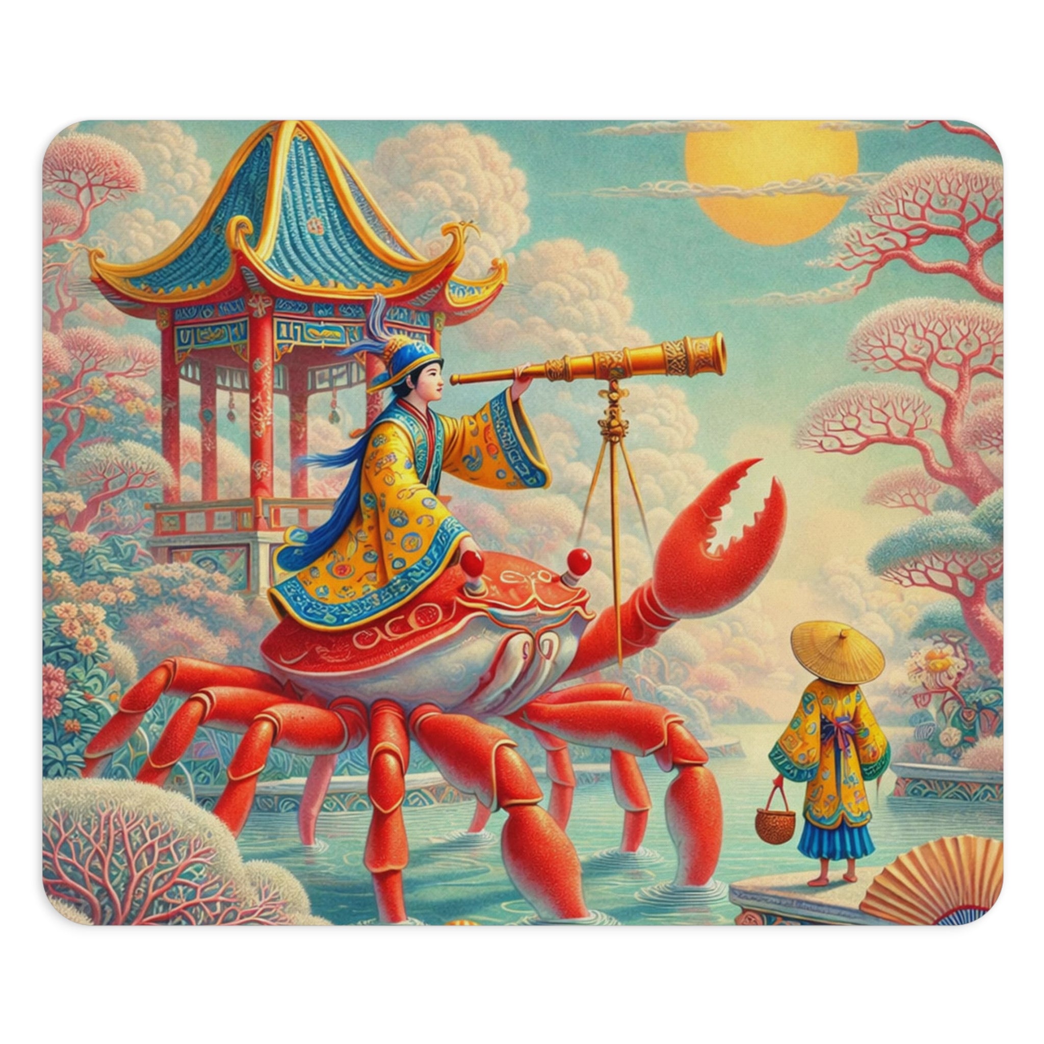 The artwork follows a richly robed figure astride a vivid crimson crab, peering through a telescope as if charting stars, tides, and time itself. Pagoda forms, flowering trees, and patterned clouds frame the scene beneath a glowing sun, while a harmonious blend of corals, aquas, and warm golds balances whimsical surrealism with classical East Asian decorative influence. The result feels serene yet imaginative—perfect for focused work, creative sessions, and daydream-worthy desk decor.