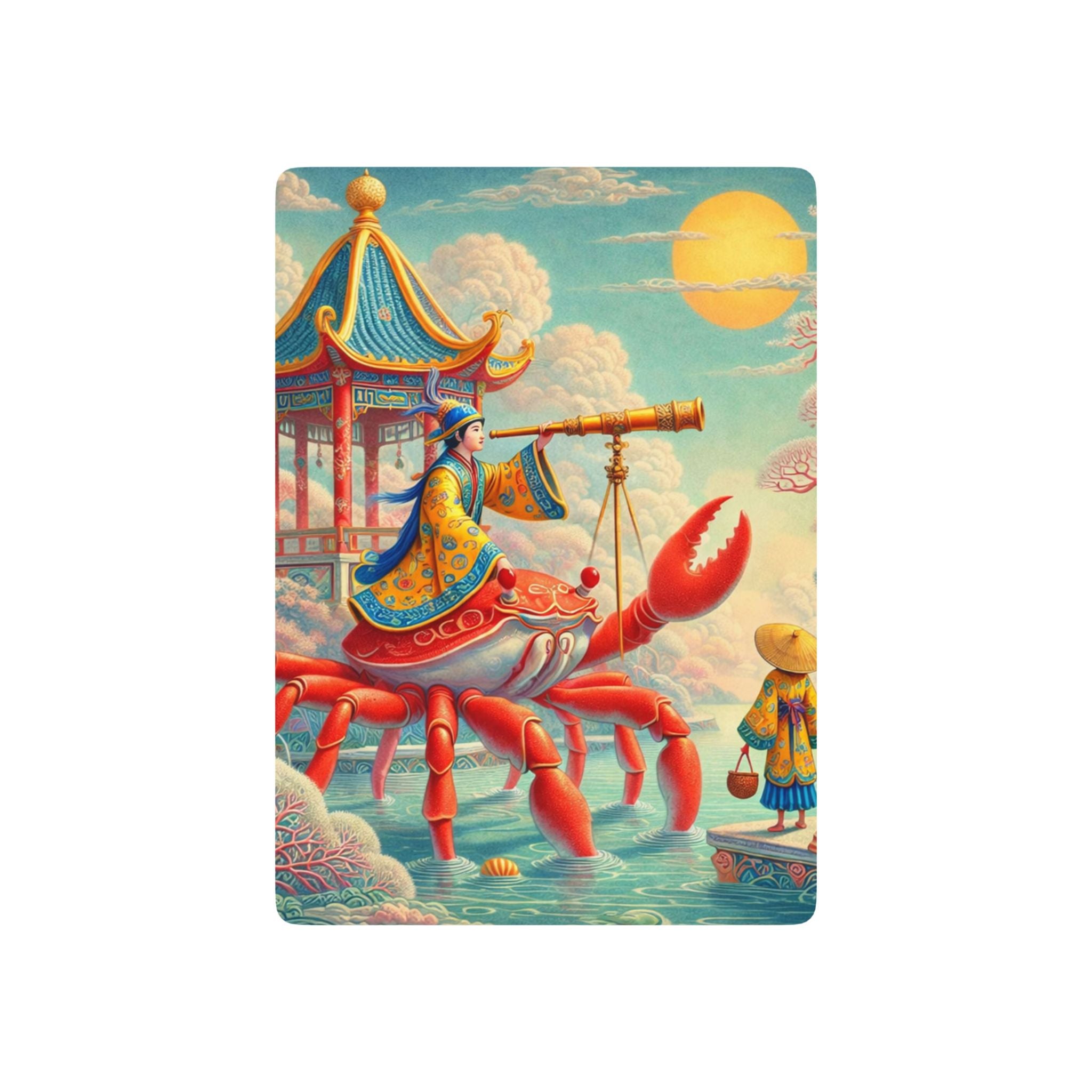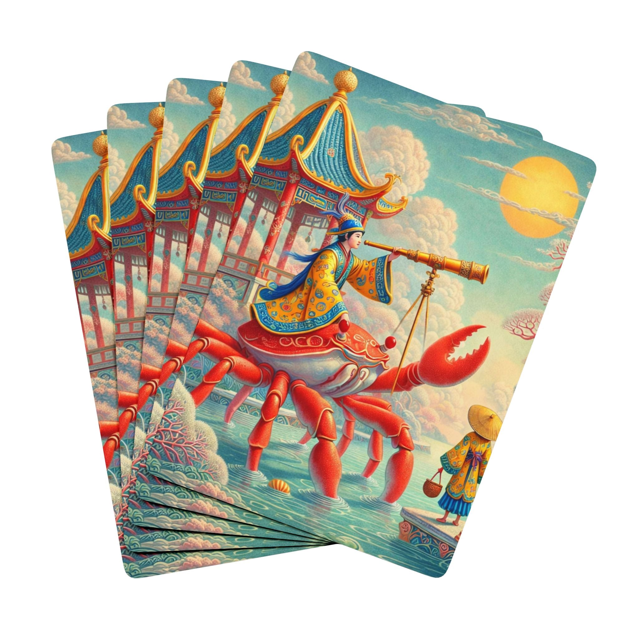 Within the artwork, a richly robed figure rides astride a vivid crimson crab, peering through a telescope as if charting stars, tides, and time itself. Pagoda silhouettes, flowering trees, and patterned clouds frame the scene beneath a glowing sun, while a harmonious palette of corals, aquas, and warm golds blends whimsical surrealism with classical East Asian decorative influence. The result evokes calm curiosity and gentle exploration—an imaginative world where navigation becomes a dream.