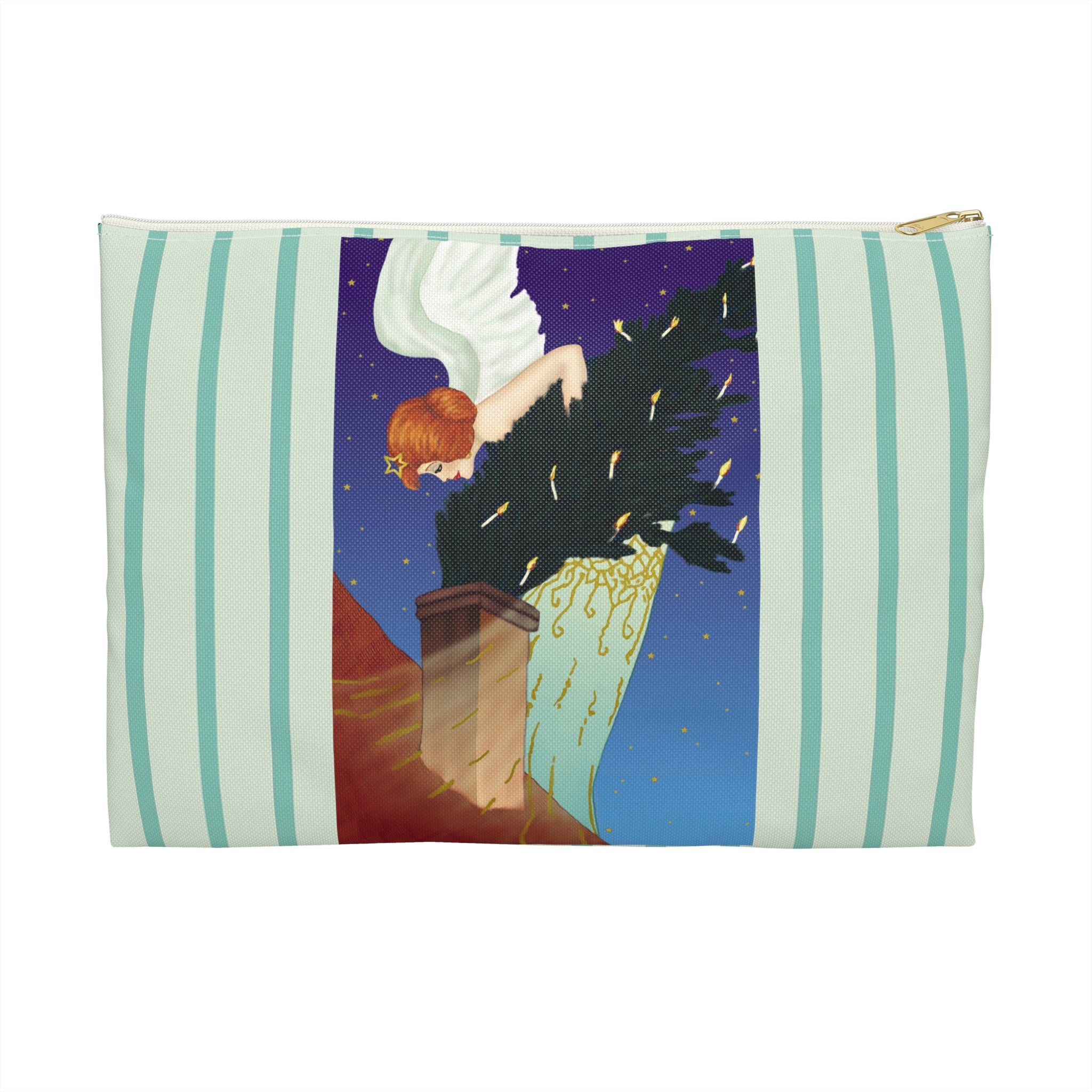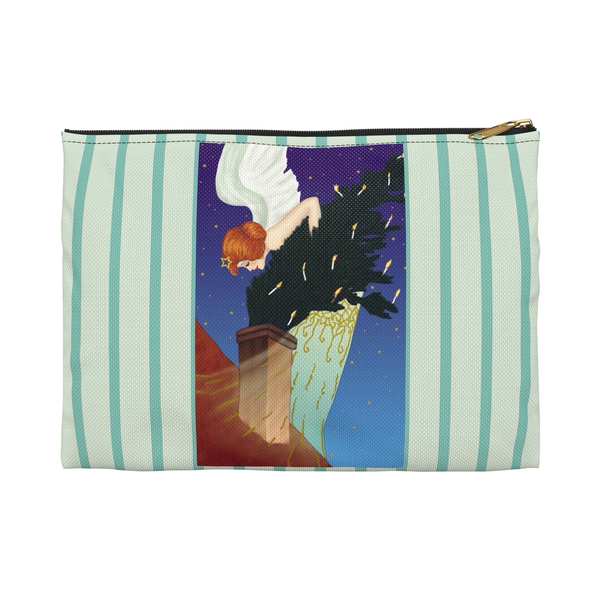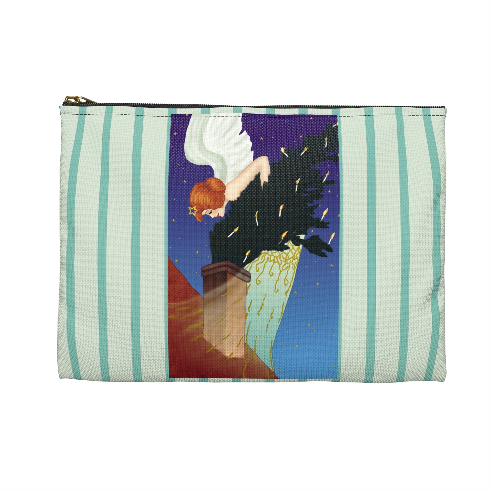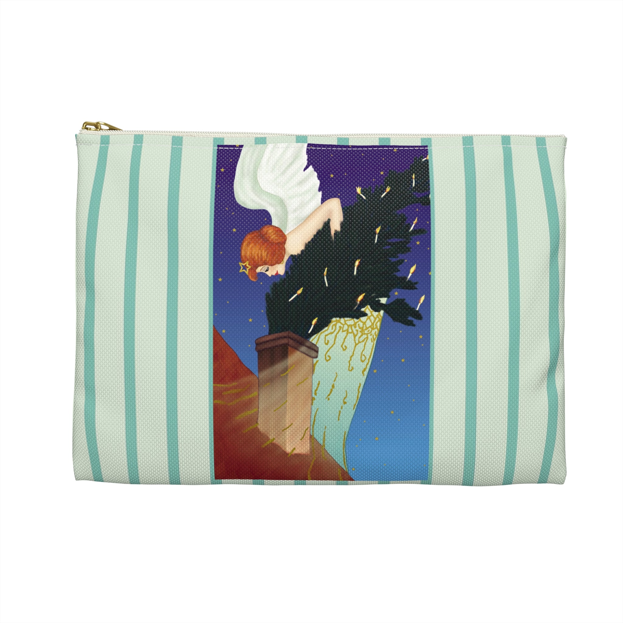 The design transforms each pouch into a storybook scene: a graceful angel with luminous white wings and fiery red hair leans over a snowy rooftop chimney, a golden star ornament glimmering in her hair. Draped in a pale mint gown adorned with golden threads that shimmer like starlight, she lowers a richly decorated Christmas tree into the home. Its dark evergreen branches sparkle with glowing candles, echoing the brilliance of the star-filled sky.