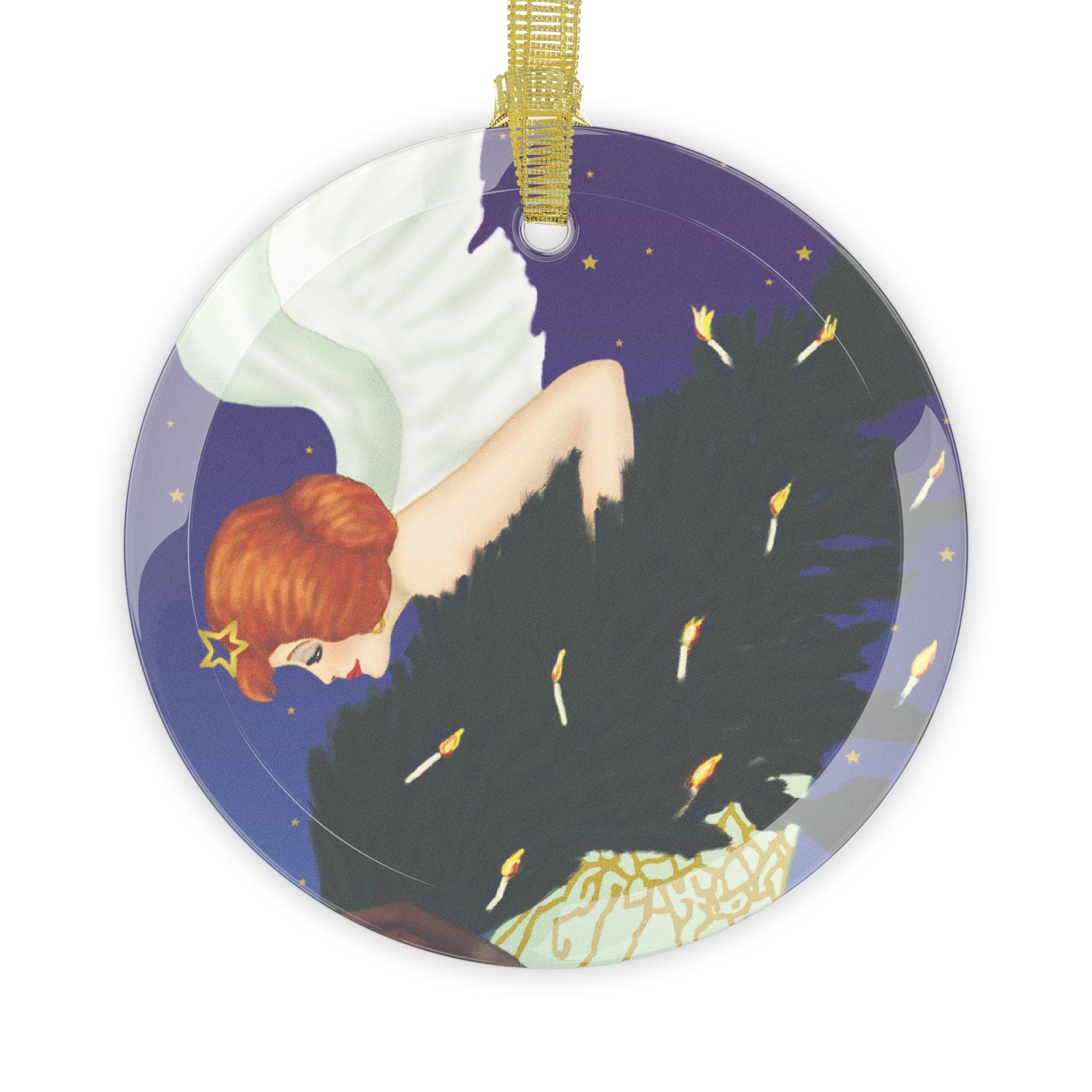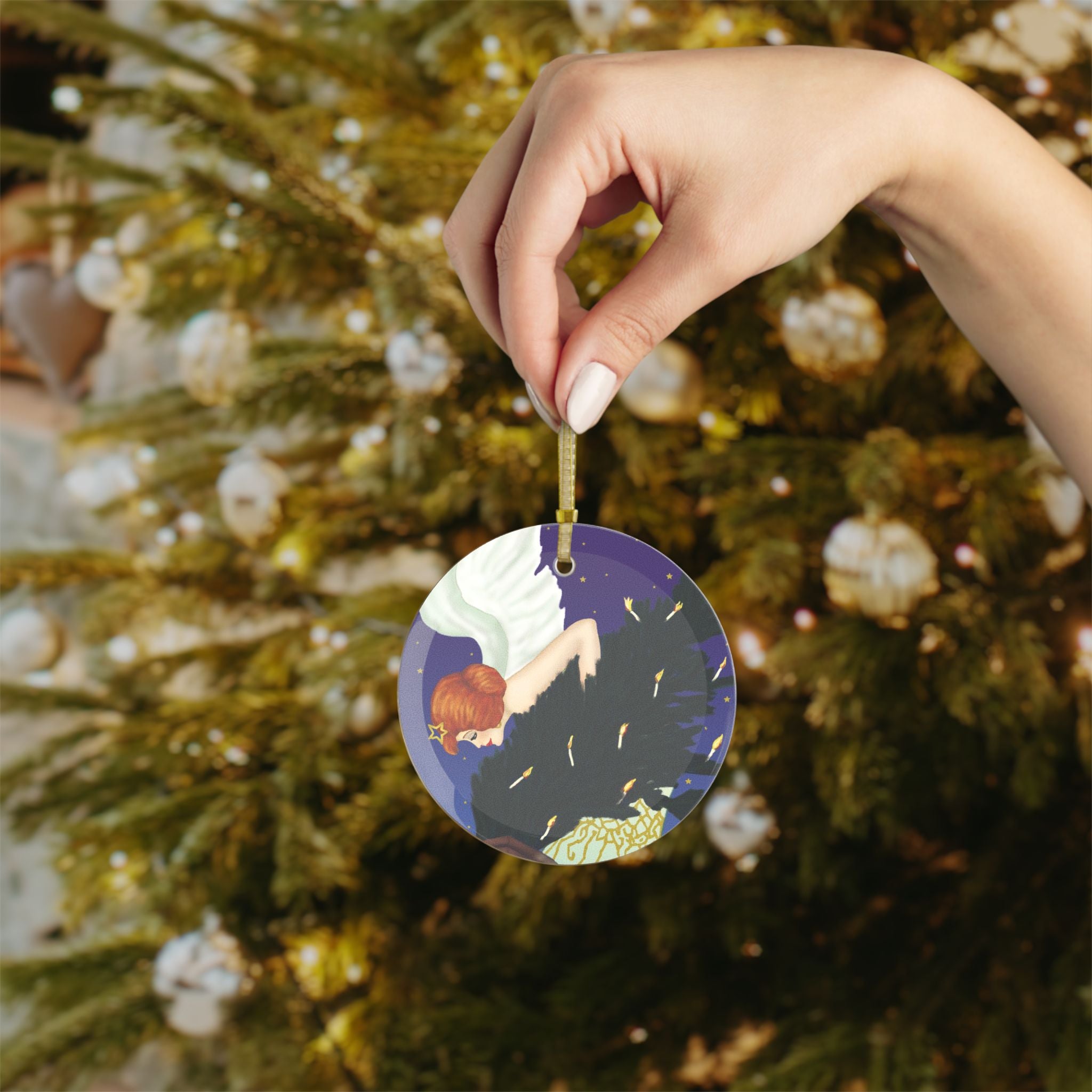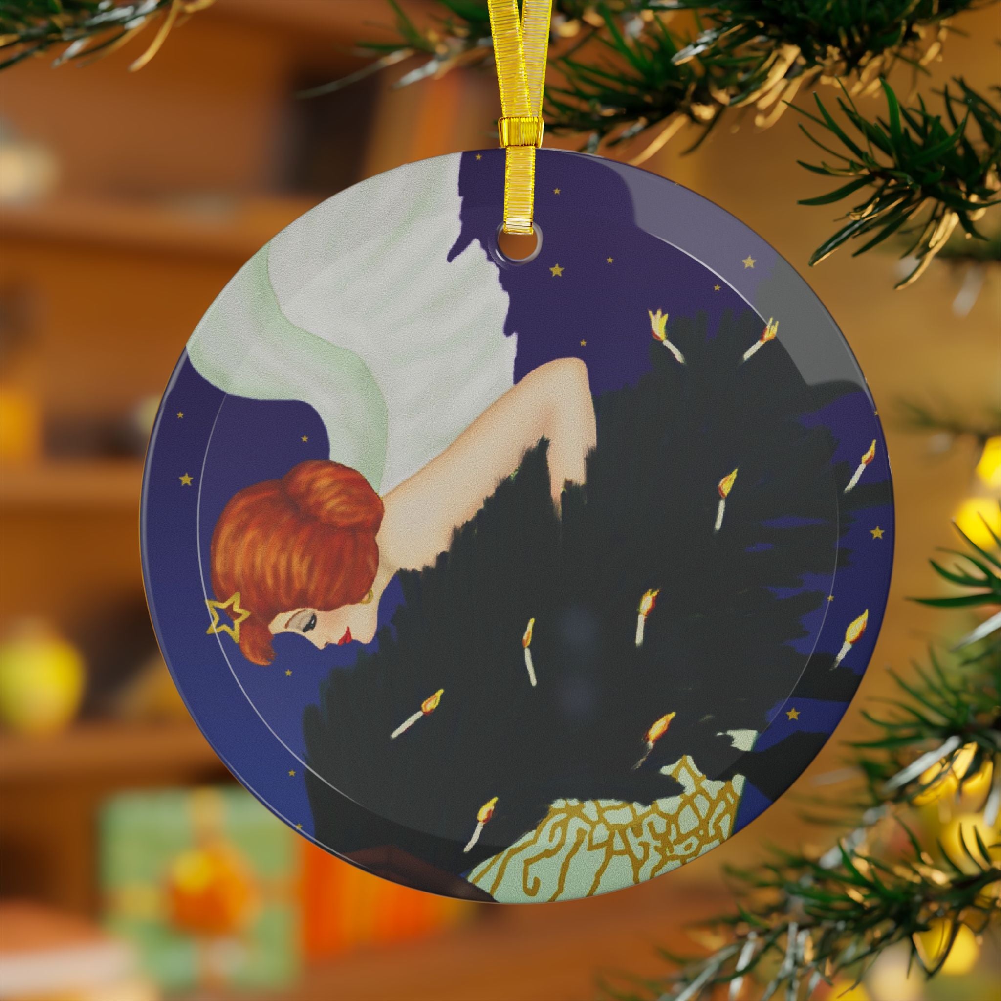 The artwork transforms the ornament into a glowing story: a graceful angel with luminous white wings and fiery red hair leans over a snowy rooftop chimney, a golden star ornament shining in her hair. Draped in a pale mint gown woven with golden threads like starlight, she lowers a richly decorated Christmas tree into the home. Its evergreen branches sparkle with glowing candles, echoing the brilliance of the night sky above.