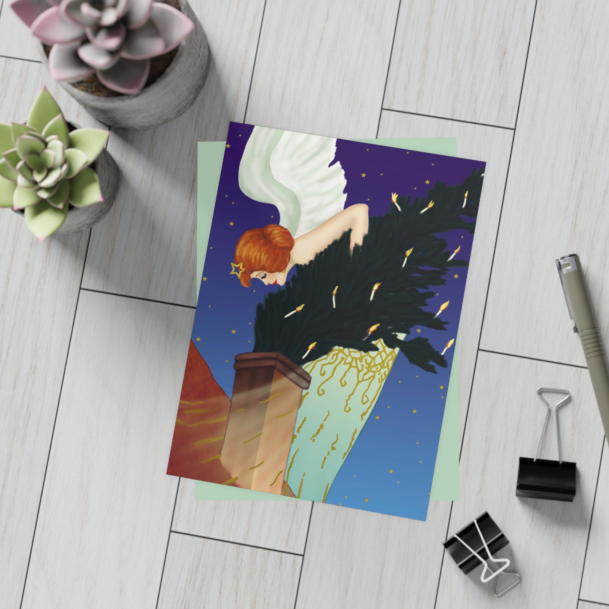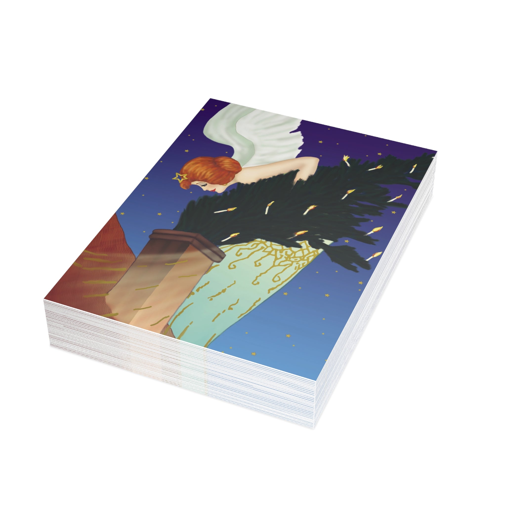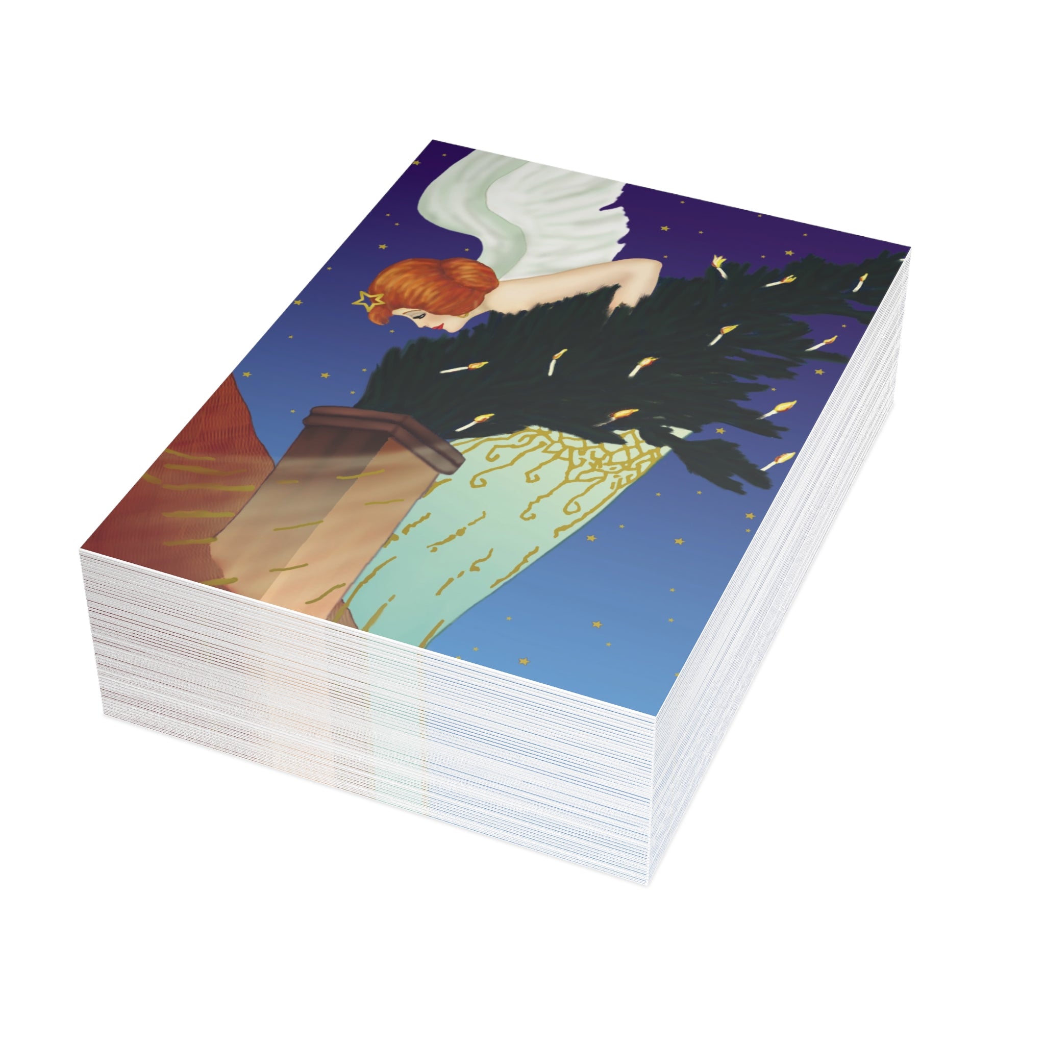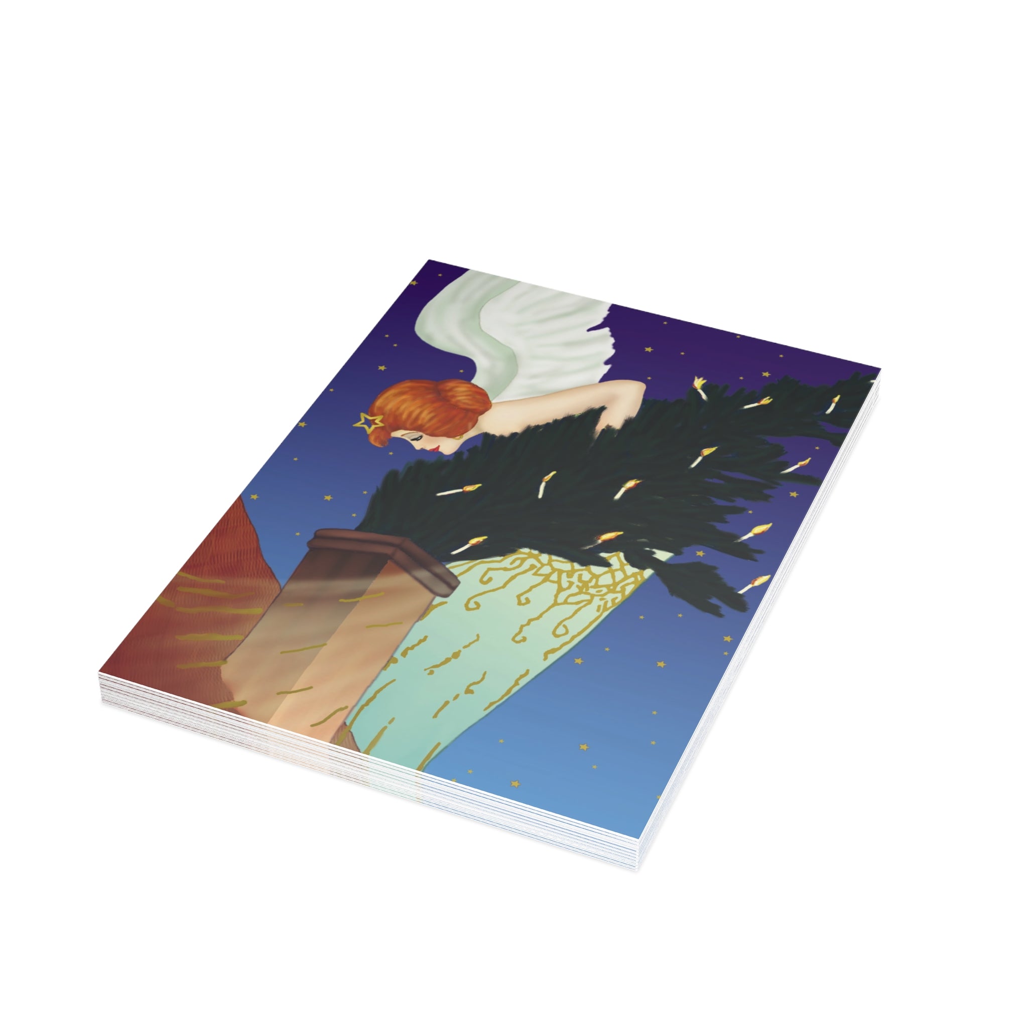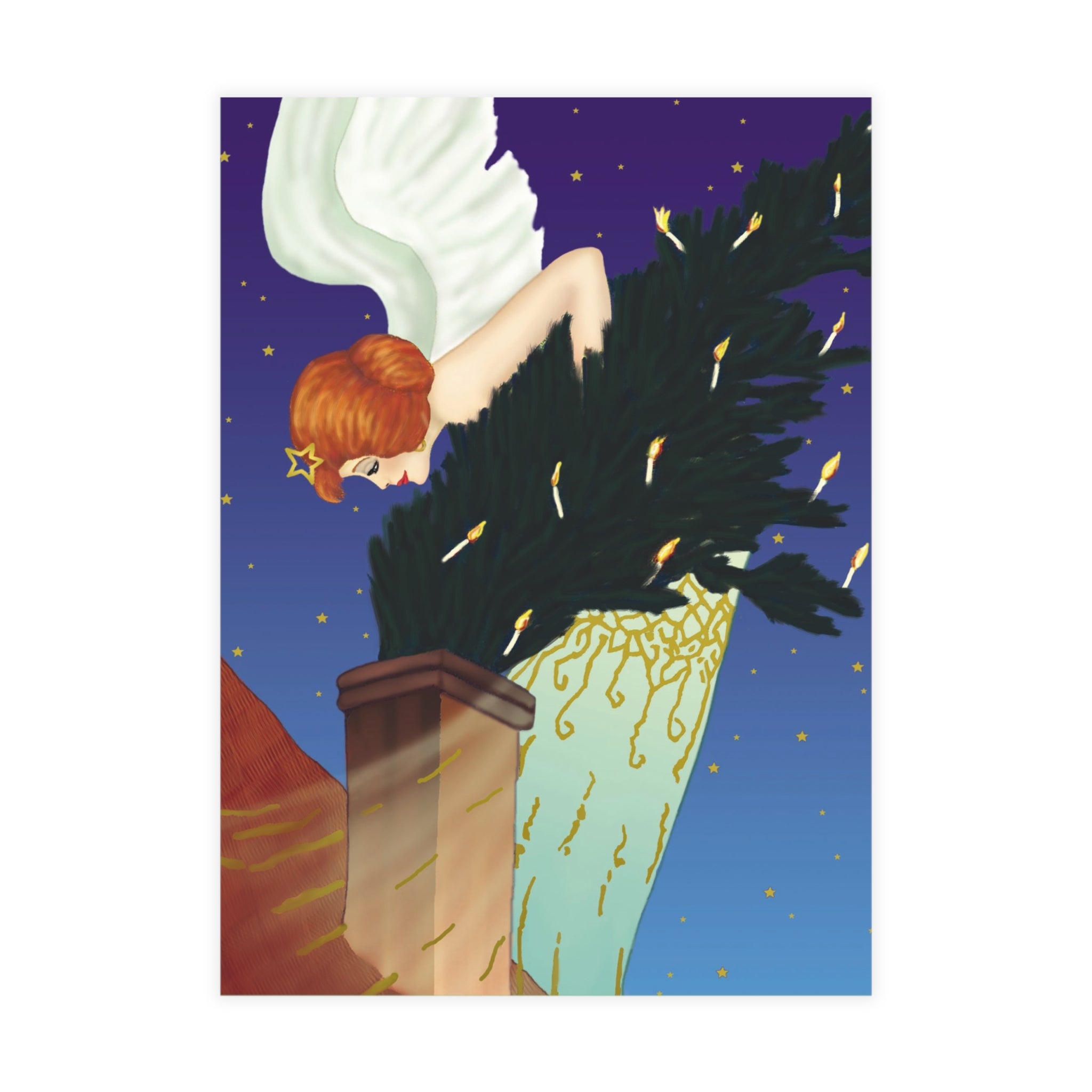 The artwork transforms each card into a keepsake: a graceful angel with luminous white wings and fiery red hair leans gently over a rooftop chimney, a golden star ornament glowing in her hair. Draped in a pale mint gown threaded with golden details that shimmer like starlight, she lowers a richly decorated Christmas tree into the home. Its evergreen branches sparkle with glowing candles, radiating the magic of the night sky.