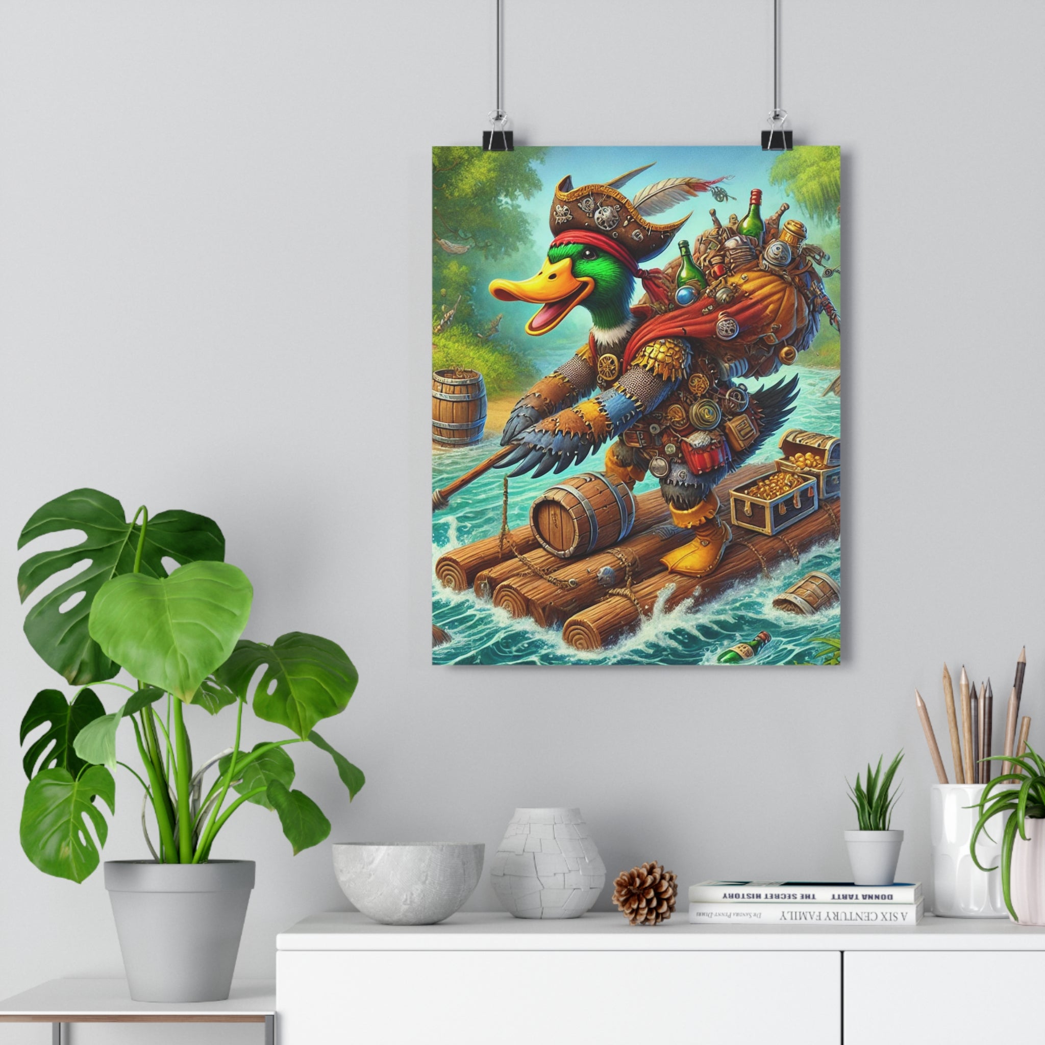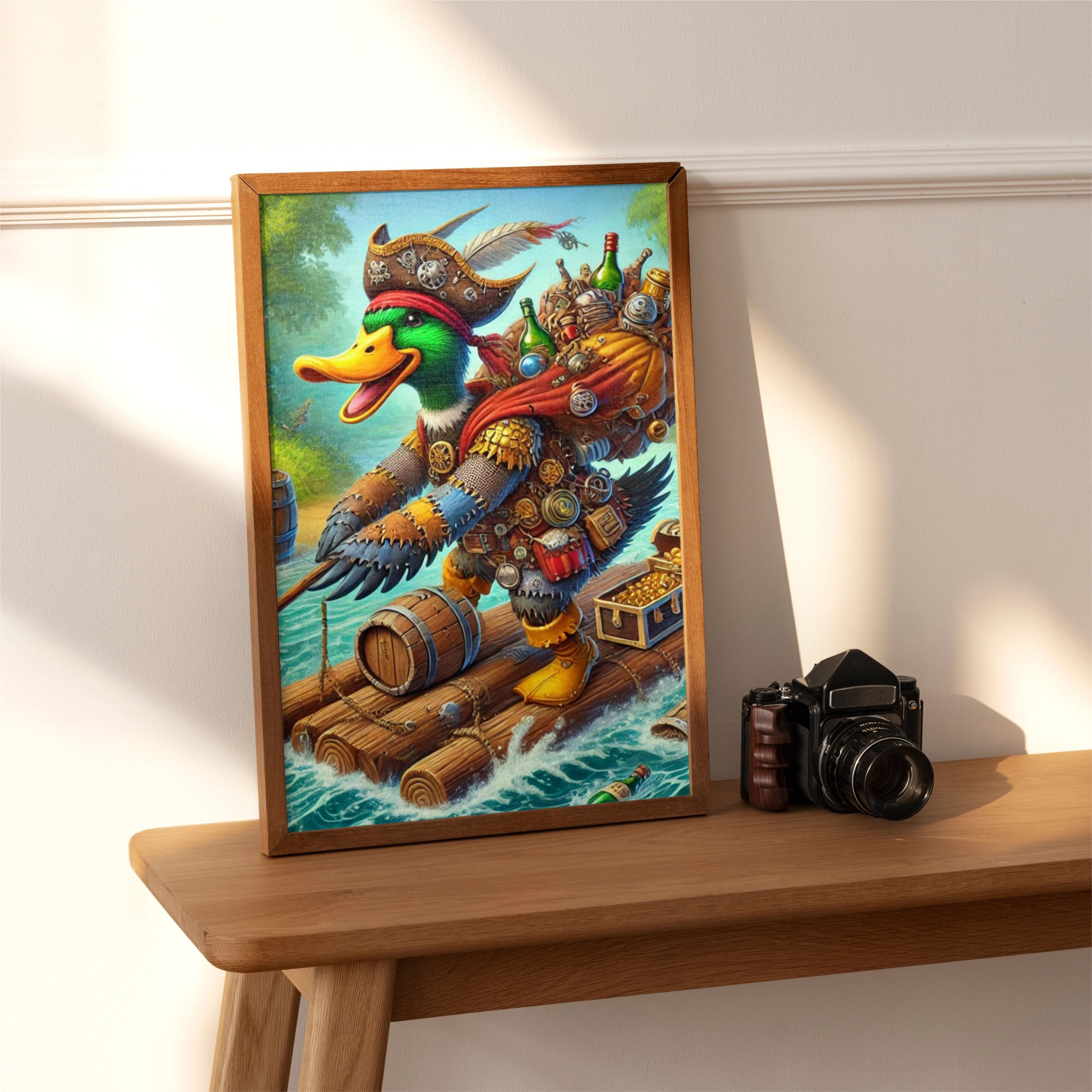 The captivating artwork, The Daring Drake, depicts a fearless drake navigating a rushing river atop a makeshift raft, clad in patchwork armor forged from shiny trinkets and rustic scrap metal. A treasure chest teeters beside him while an overstuffed backpack jingles with maps, bottles, and artifacts—tokens of countless adventures. As shadowy pursuers scramble in the distance, the drake charges forward, eyes gleaming with determination. The piece blends fantasy, humor, and courage into a spirited celebration of freedom, resilience, and daring discovery.