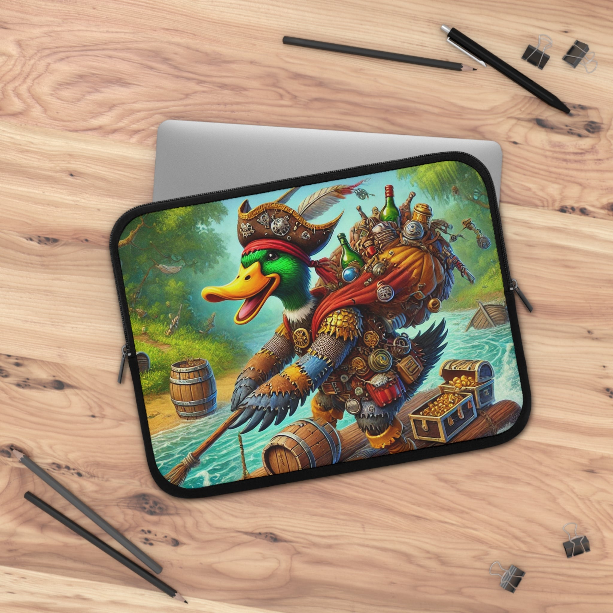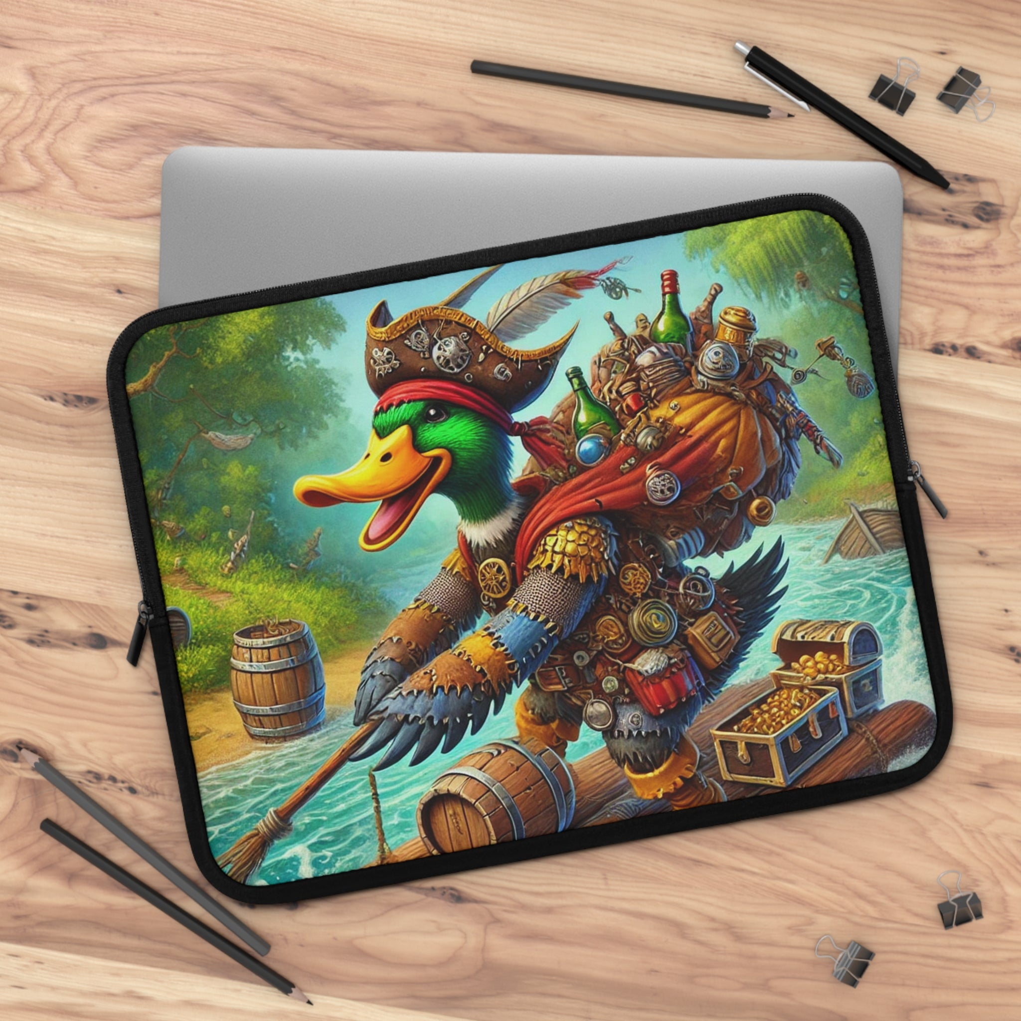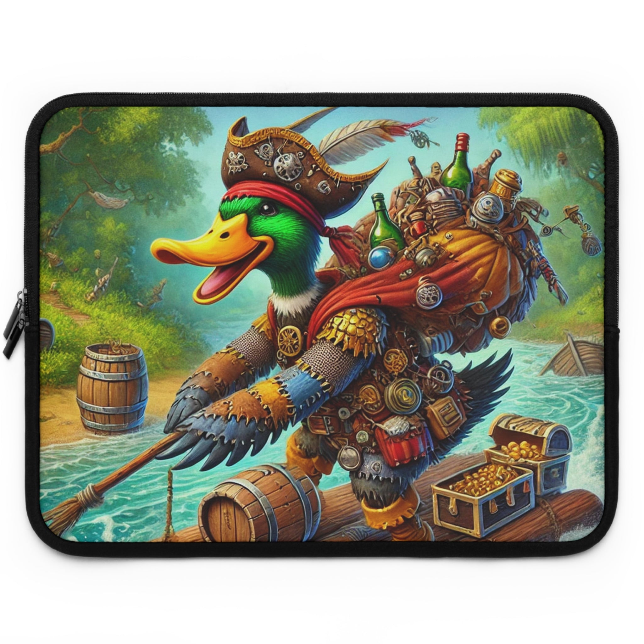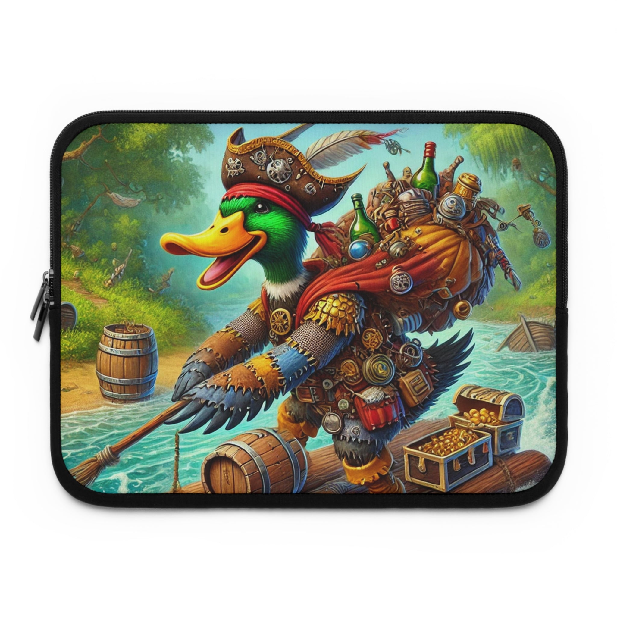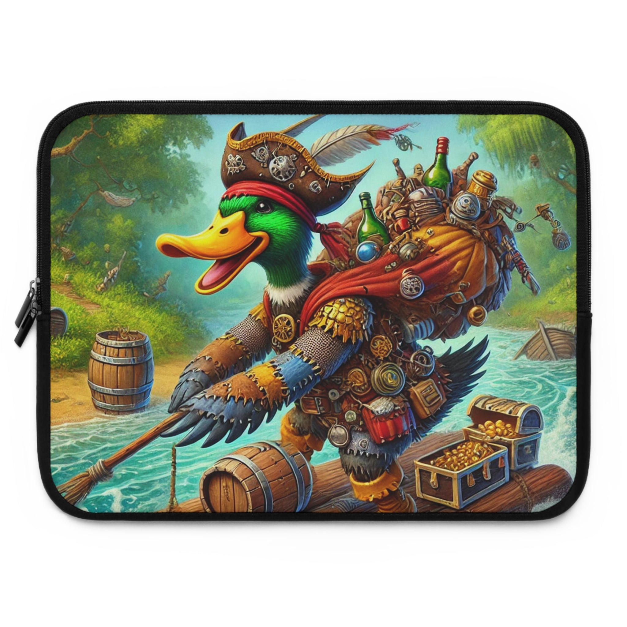 Set your creativity adrift on a current of adventure with The Daring Drake Laptop Sleeve. This bold design captures a fearless drake navigating a rushing river atop a makeshift raft, clad in patchwork armor forged from shiny trinkets and rustic scrap metal. A treasure chest wobbles at his side while an overstuffed backpack jingles with maps, bottles, and artifacts — the spoils of countless daring quests. Behind him, shadowy pursuers fade into the mist as he rides the churning waters with a grin of triumph, embodying the spirit of freedom, luck, and boundless imagination.