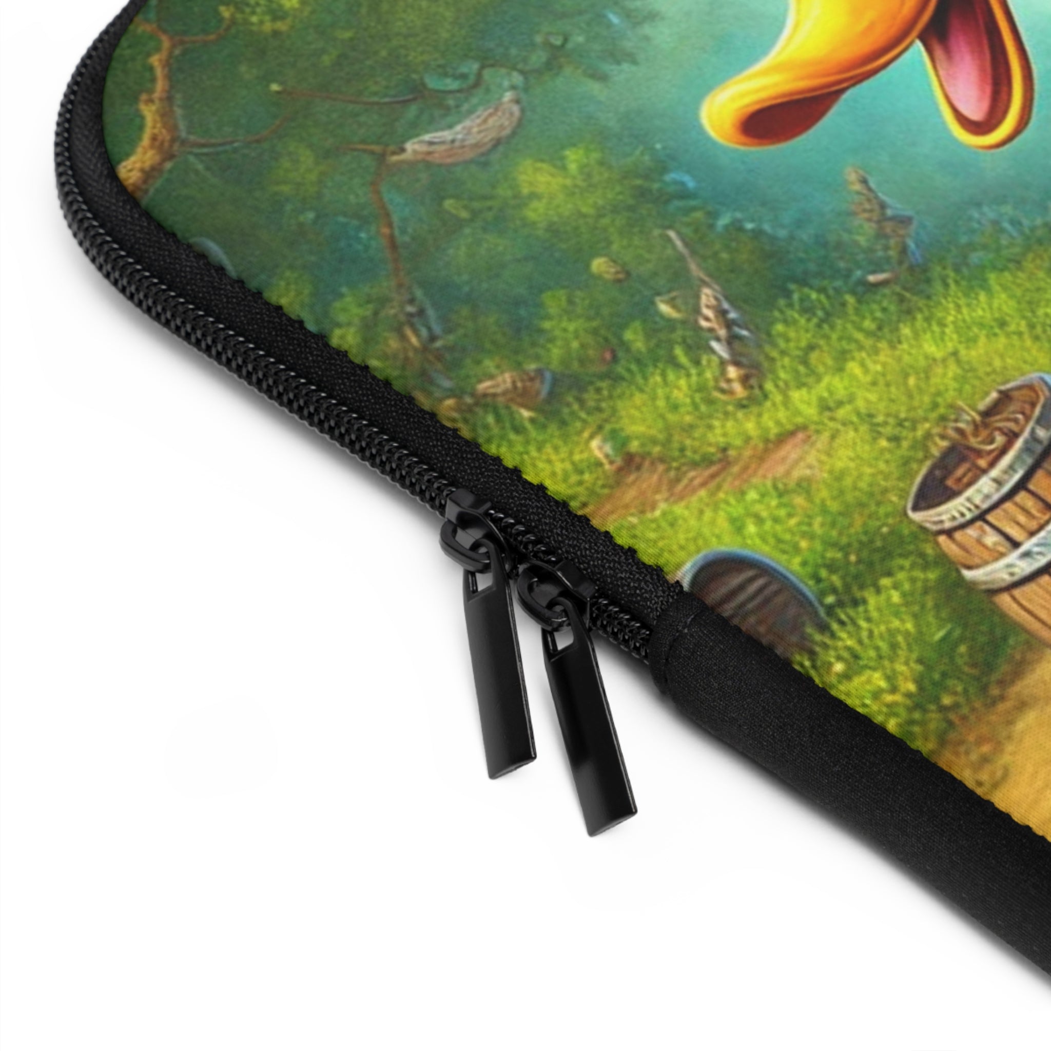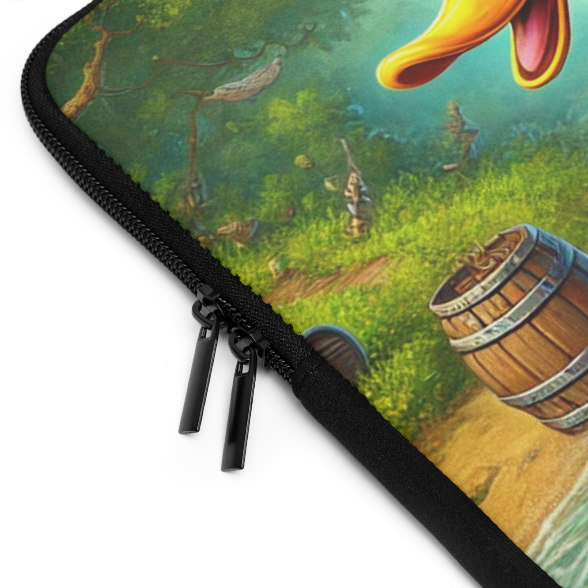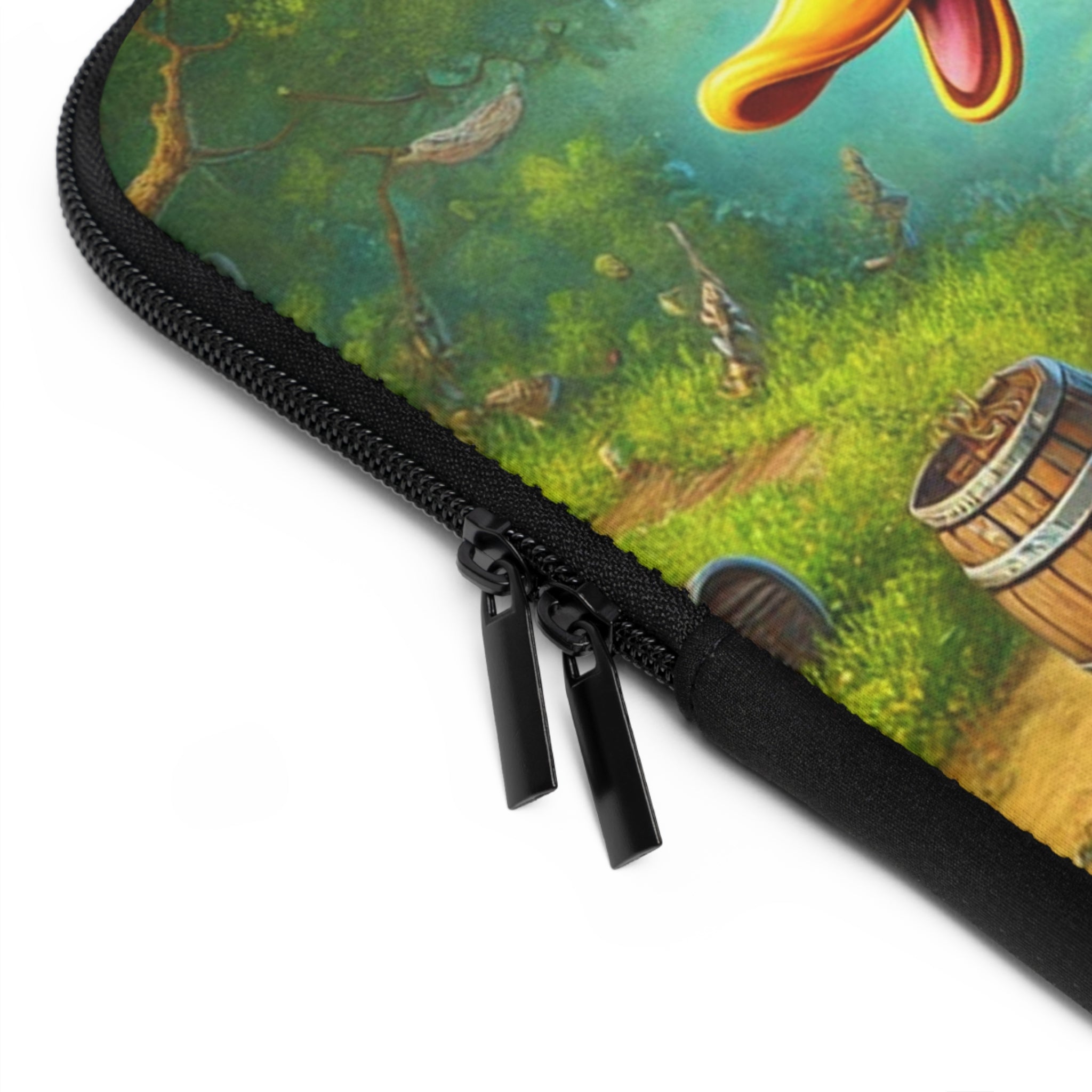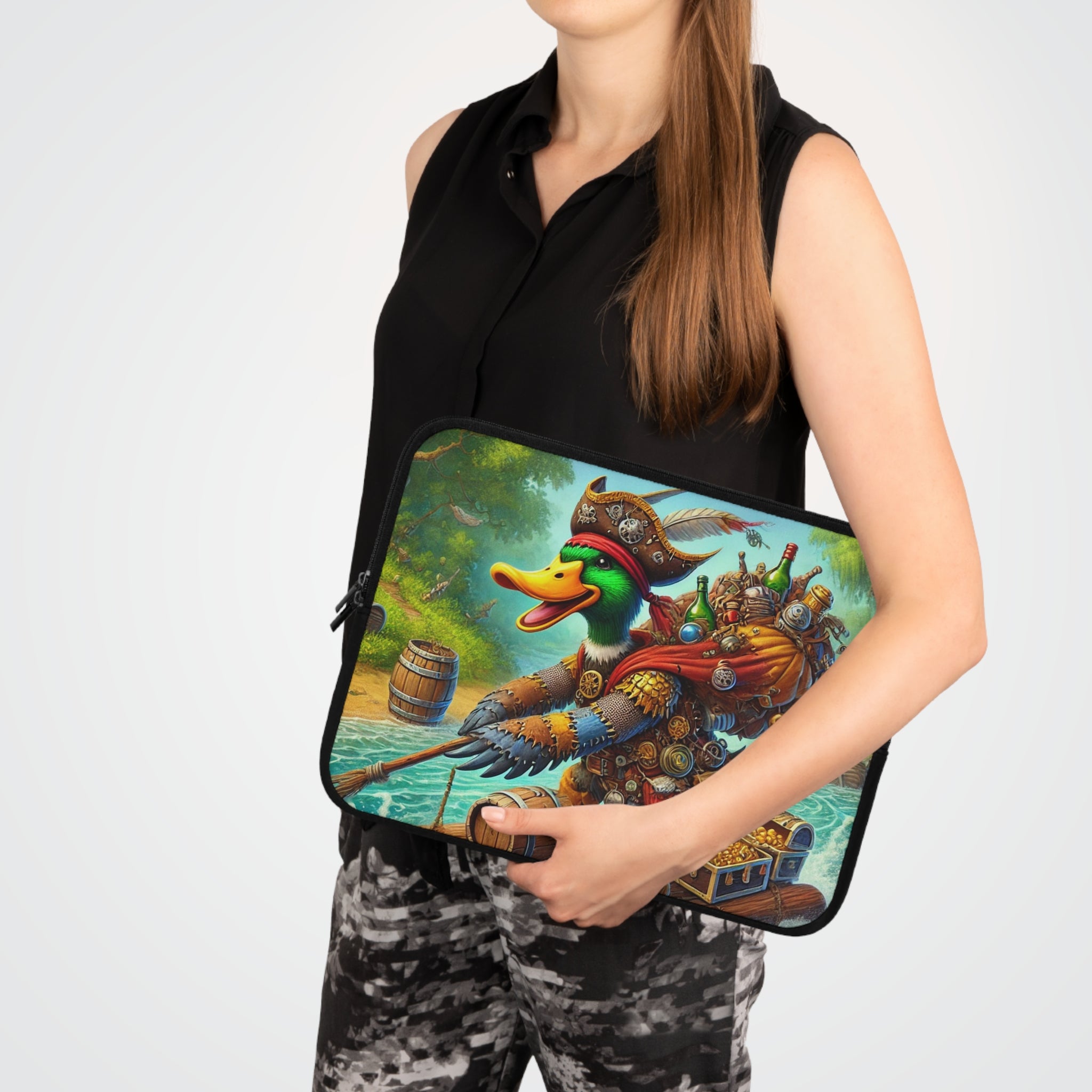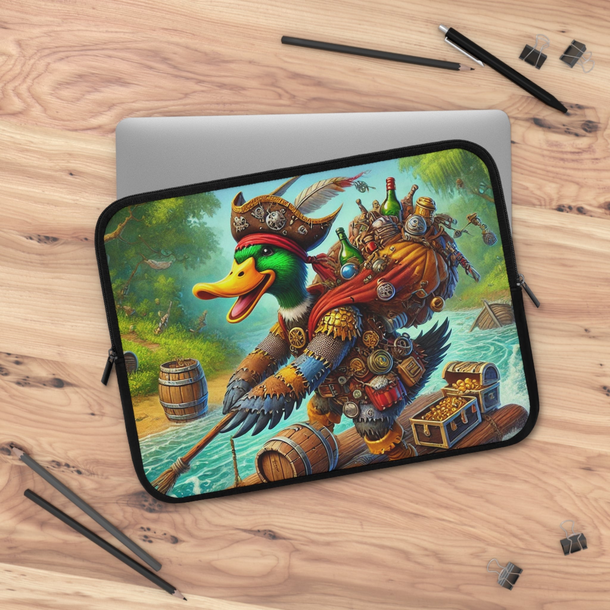Set your creativity adrift on a current of adventure with The Daring Drake Laptop Sleeve. This bold design captures a fearless drake navigating a rushing river atop a makeshift raft, clad in patchwork armor forged from shiny trinkets and rustic scrap metal. A treasure chest wobbles at his side while an overstuffed backpack jingles with maps, bottles, and artifacts — the spoils of countless daring quests. Behind him, shadowy pursuers fade into the mist as he rides the churning waters with a grin of triumph, embodying the spirit of freedom, luck, and boundless imagination.