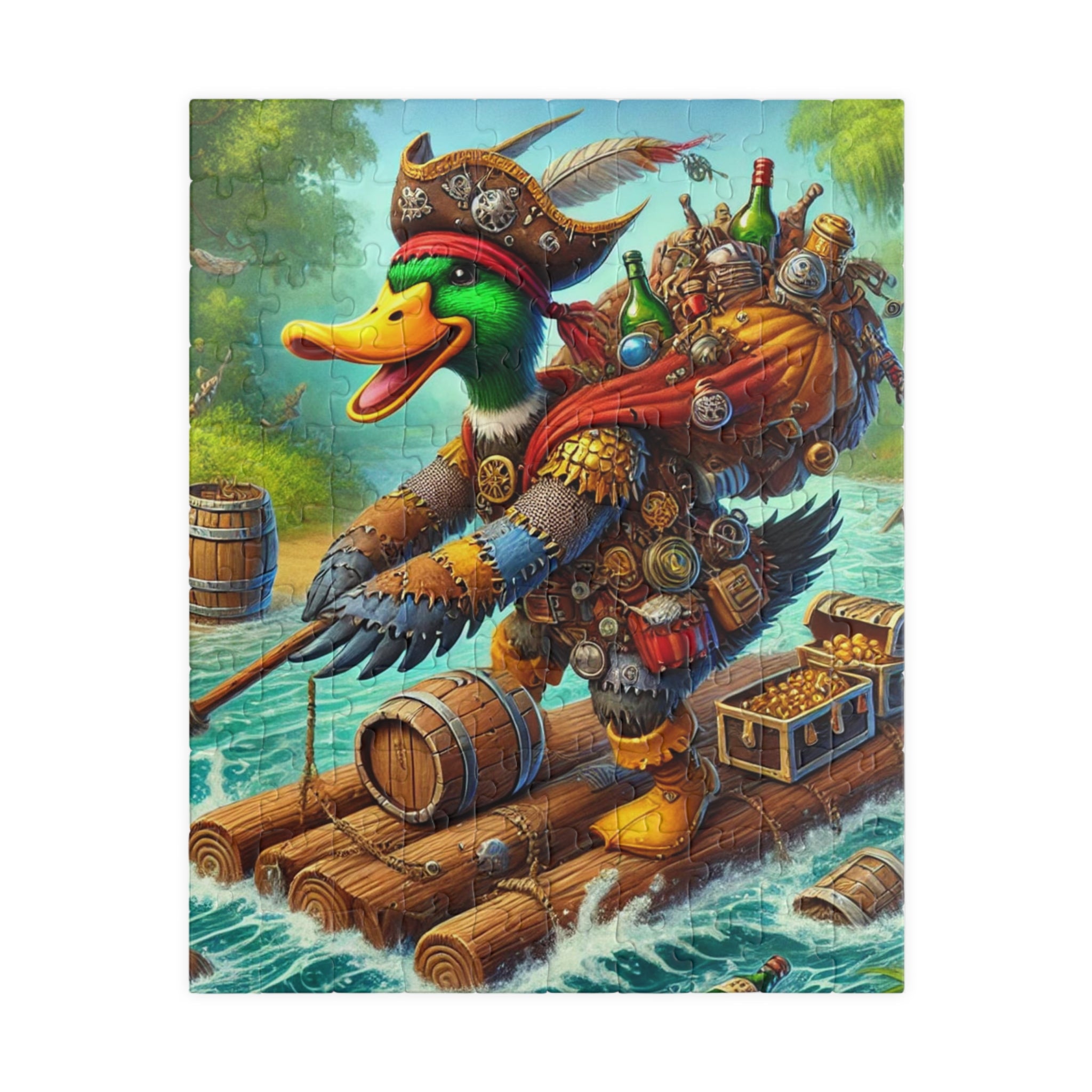The Daring Drake artwork features a fearless drake navigating a rushing river atop a makeshift raft, clad in patchwork armor fashioned from shiny trinkets and rustic scrap metal. A treasure chest teeters beside him as his overstuffed backpack jingles with maps, bottles, and mysterious artifacts. Behind him, shadowy pursuers scramble to keep up as he speeds through the roaring current, eyes bright with mischief and determination. The scene overflows with movement, color, and personality — a whimsical celebration of bravery, cleverness, and the joy of adventure.