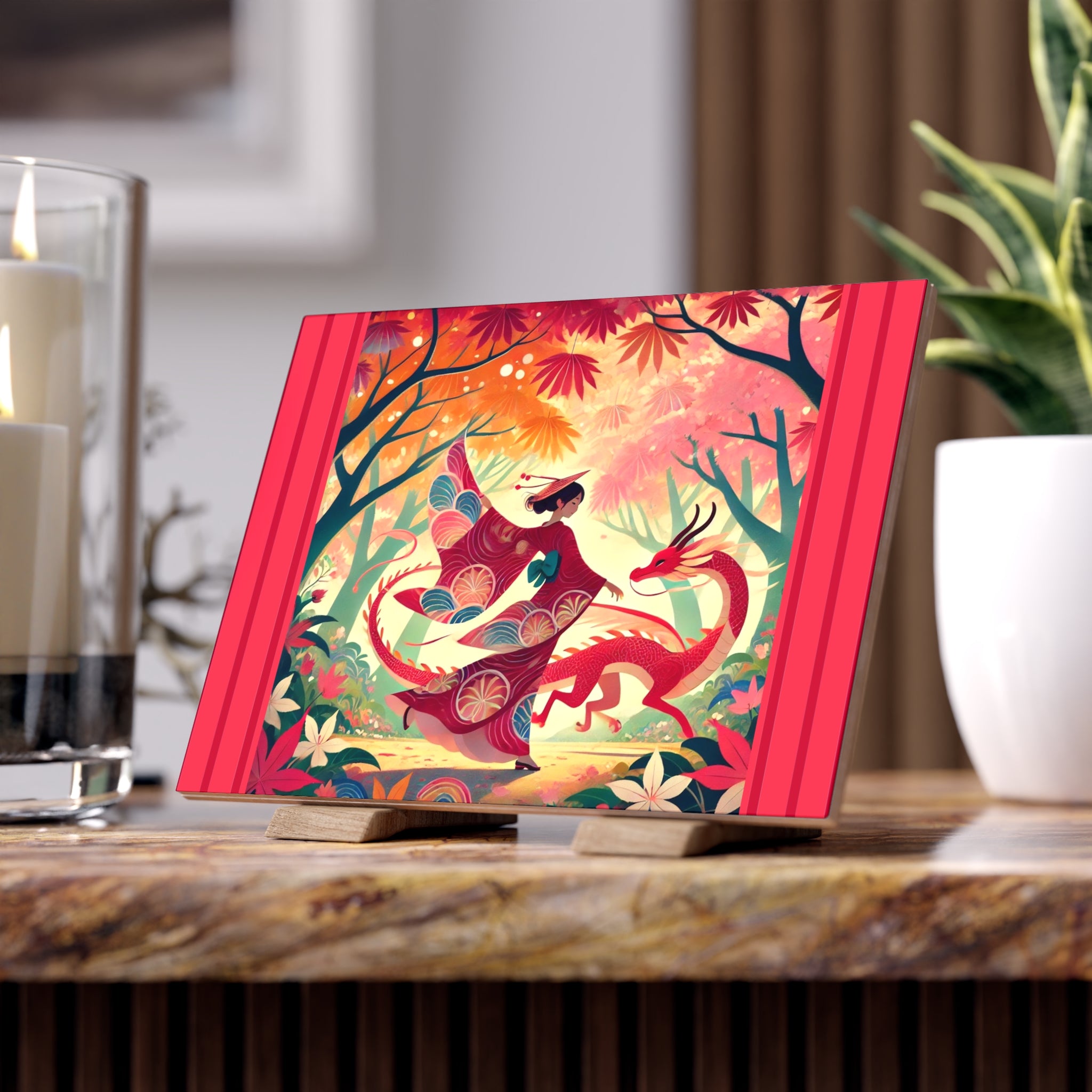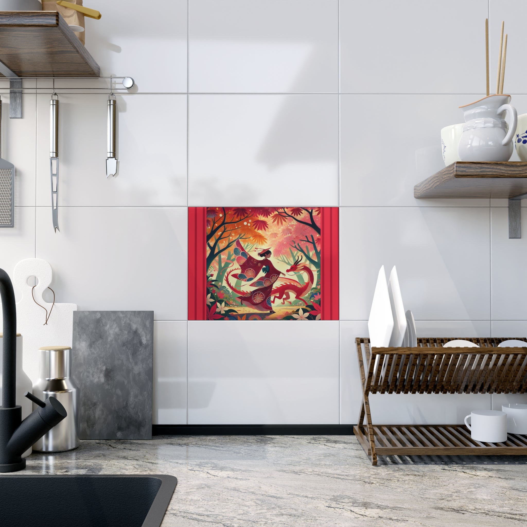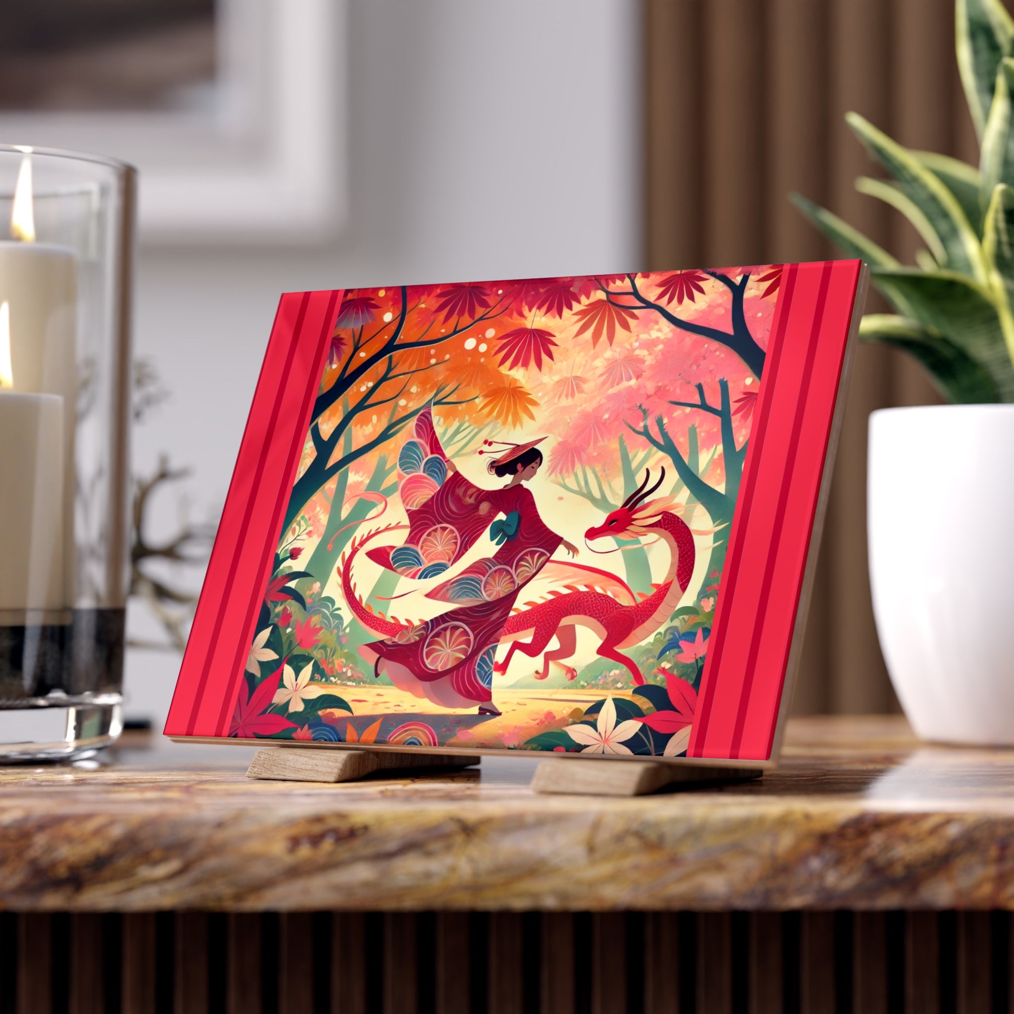This exquisite ceramic tile features an enchanting illustration of a modern dragon fairy and her red dragon companion dancing through a grove of vibrant spring maples. The design captures the magic and energy of the season, making it a perfect accent piece for any room. Ideal for those who love fantasy art and mythical creatures, this tile is great for decorating during springtime, or as a unique gift for a myth lover.