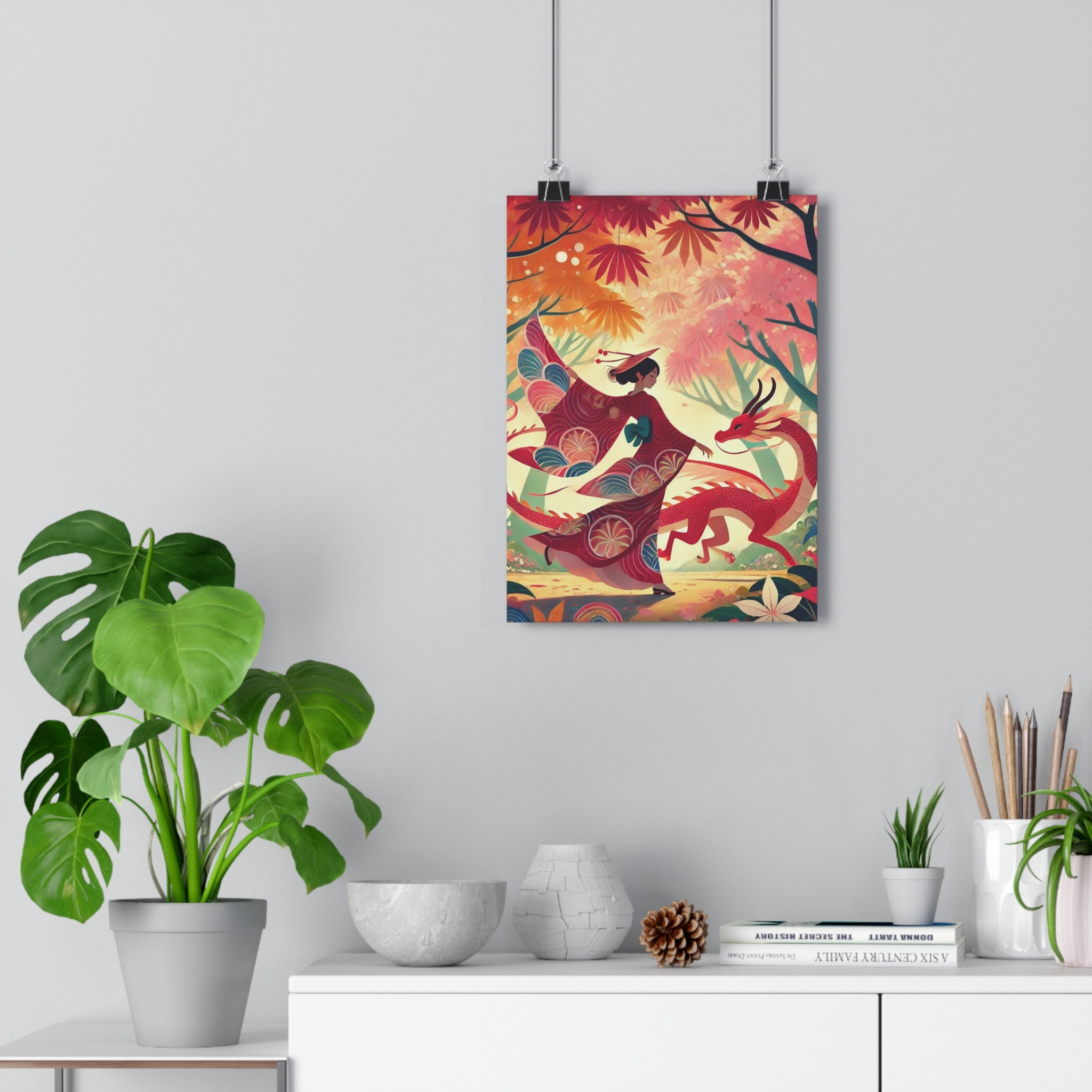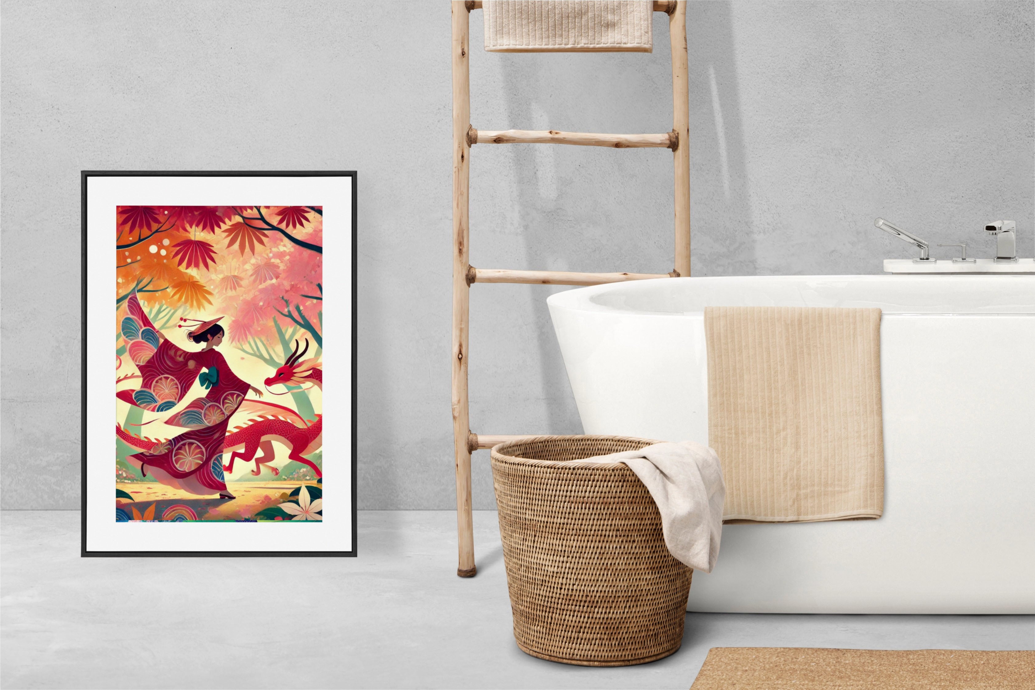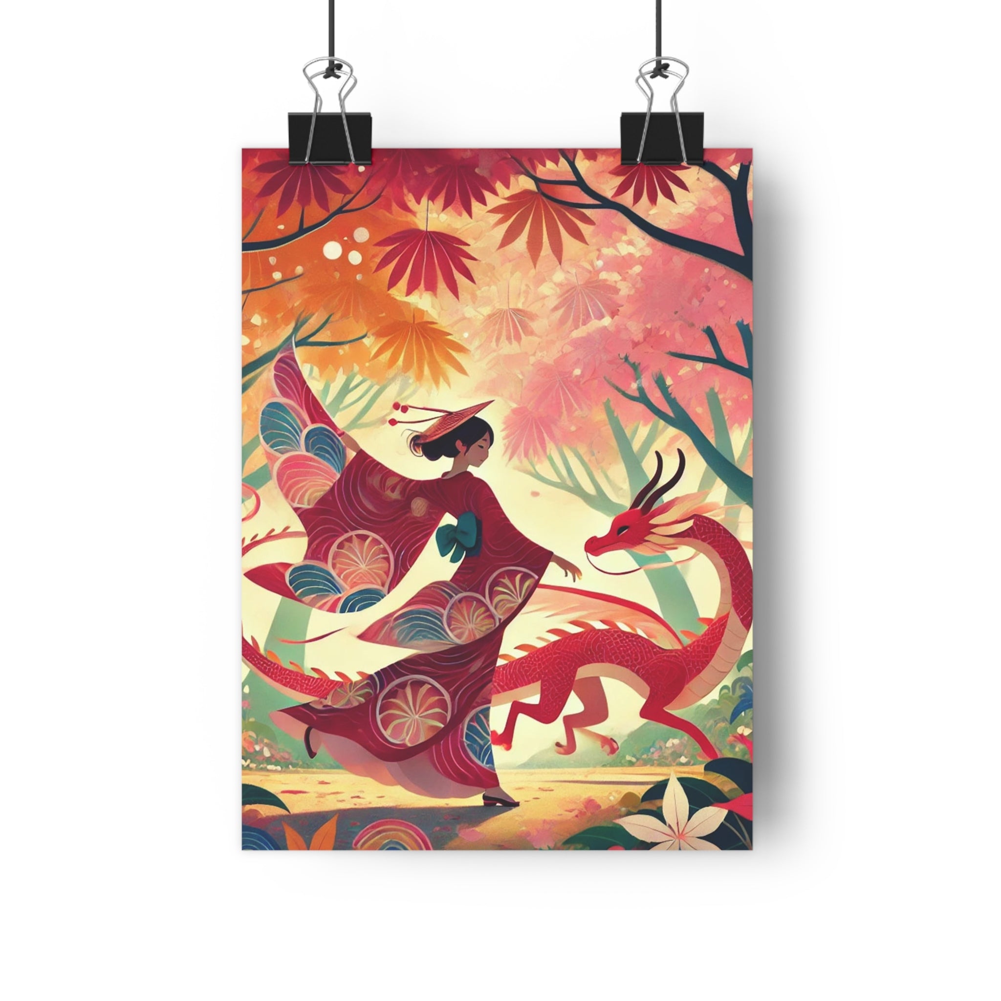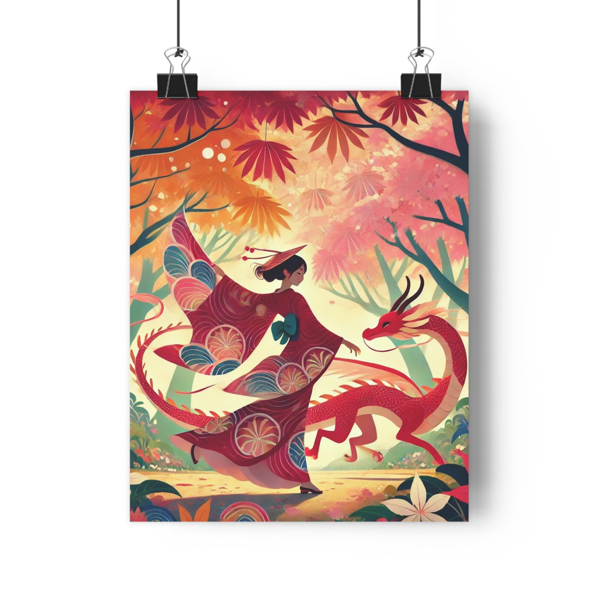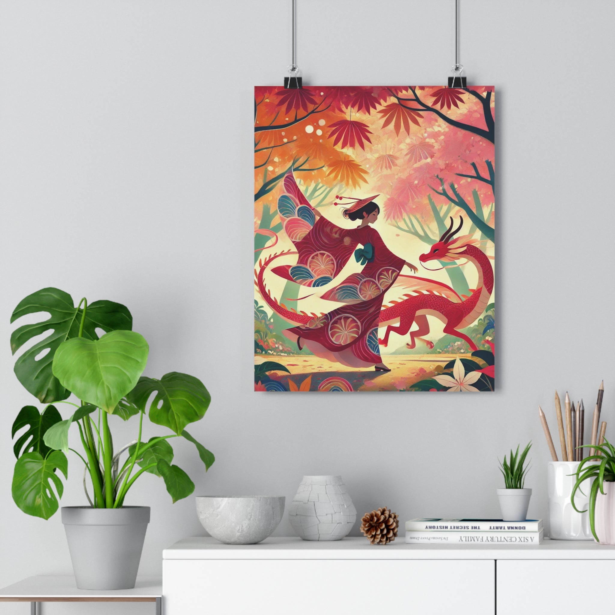 The enchanting artwork, The Dragon Fairy’s Dance, portrays a mesmerizing scene of a dragon fairy moving gracefully through a grove of vibrant red and pink spring maples. Her flowing kimono glows with intricate, petal-like patterns that echo the swirling leaves around her. By her side weaves a majestic red dragon, its golden eyes radiating wisdom and calm power. Bathed in the golden warmth of sunlight, the scene captures the magical balance between nature’s wild beauty and the fairy’s ethereal grace—an elegant dance of strength, serenity, and enchantment.