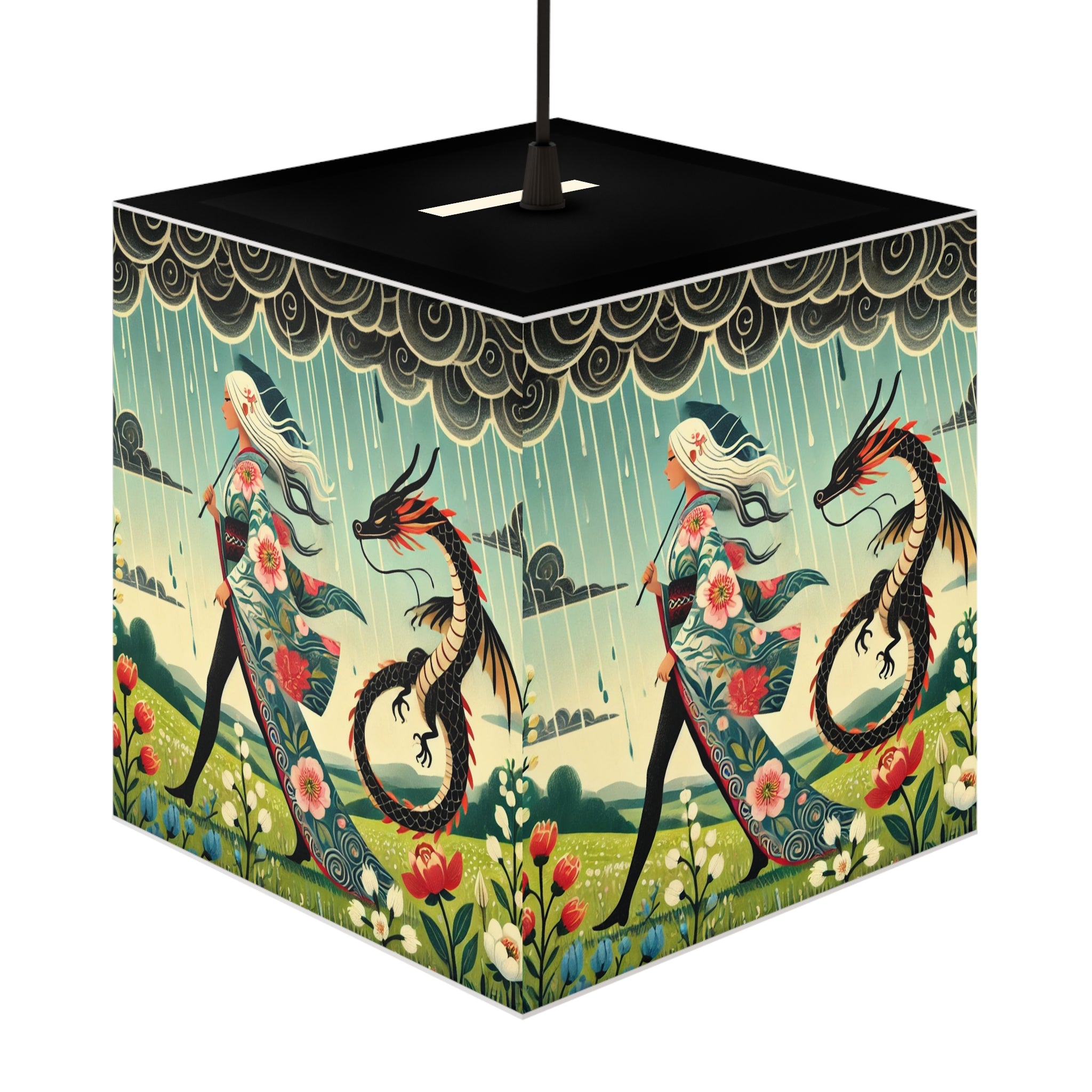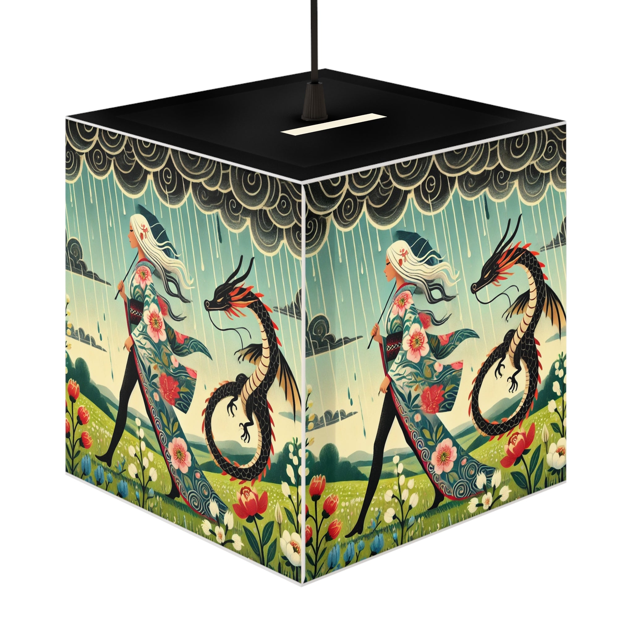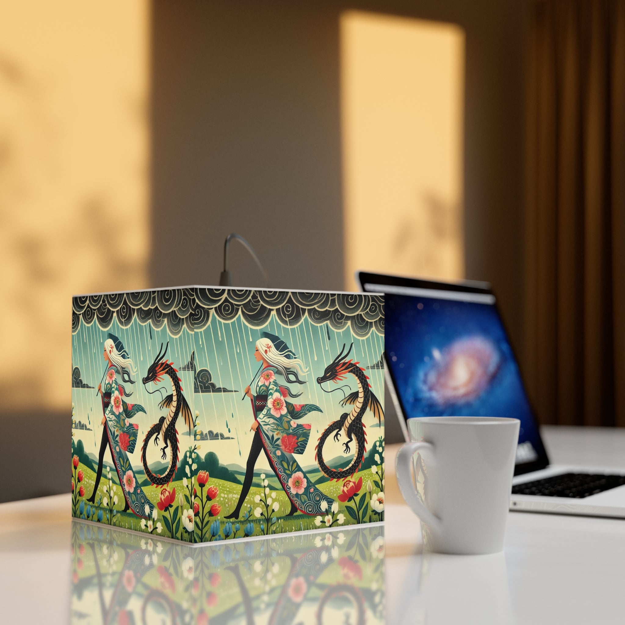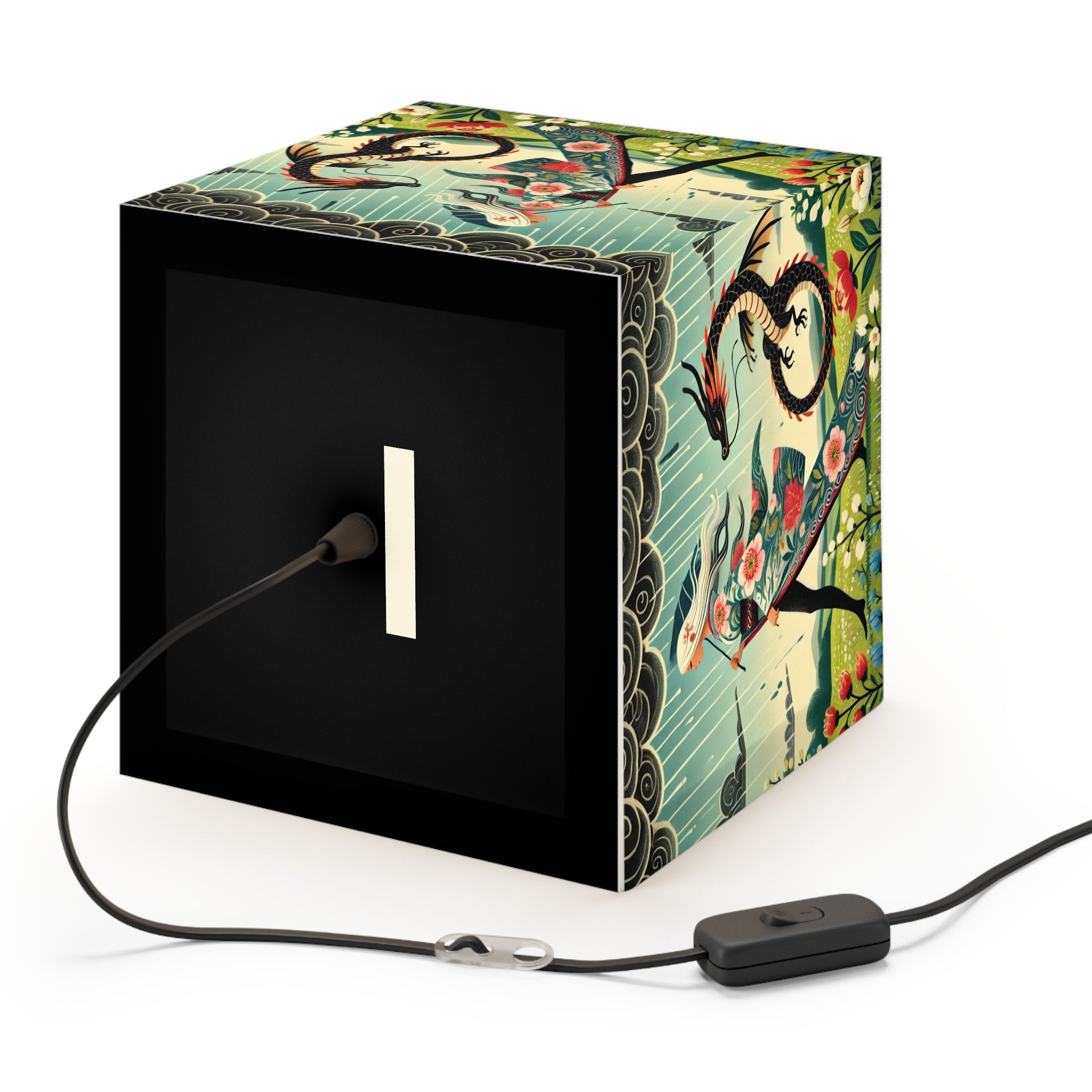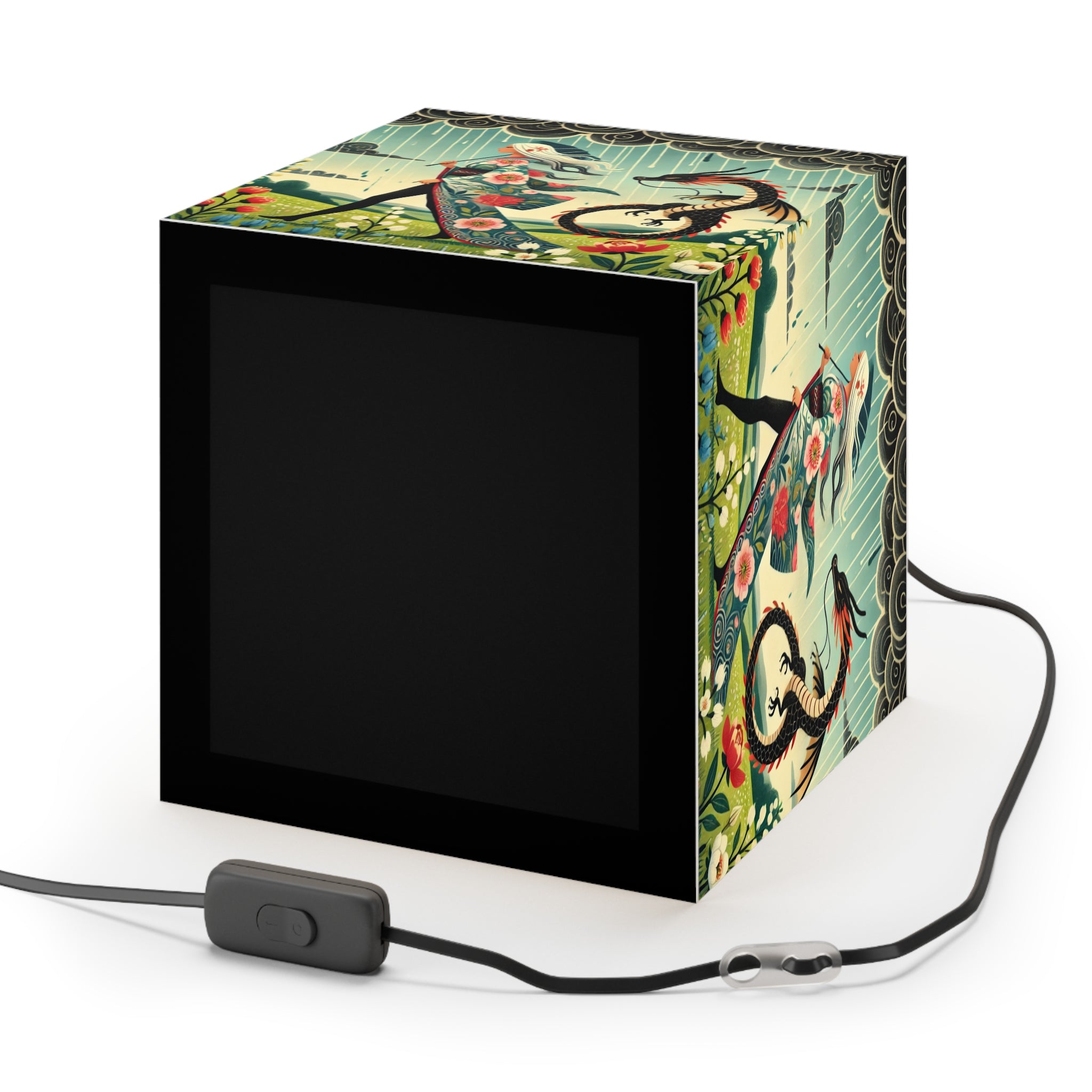 Transform any space into a serene, dreamlike retreat with this beautifully designed light cube lamp. Made from durable polyester film with a matte-coated finish, this lamp emits a soft, calming glow that enhances any room. Featuring an enchanting scene of a dragon fairy gliding effortlessly through a mystical landscape, her flowing garments adorned with delicate cherry blossoms, this design brings a sense of wonder and magic.
