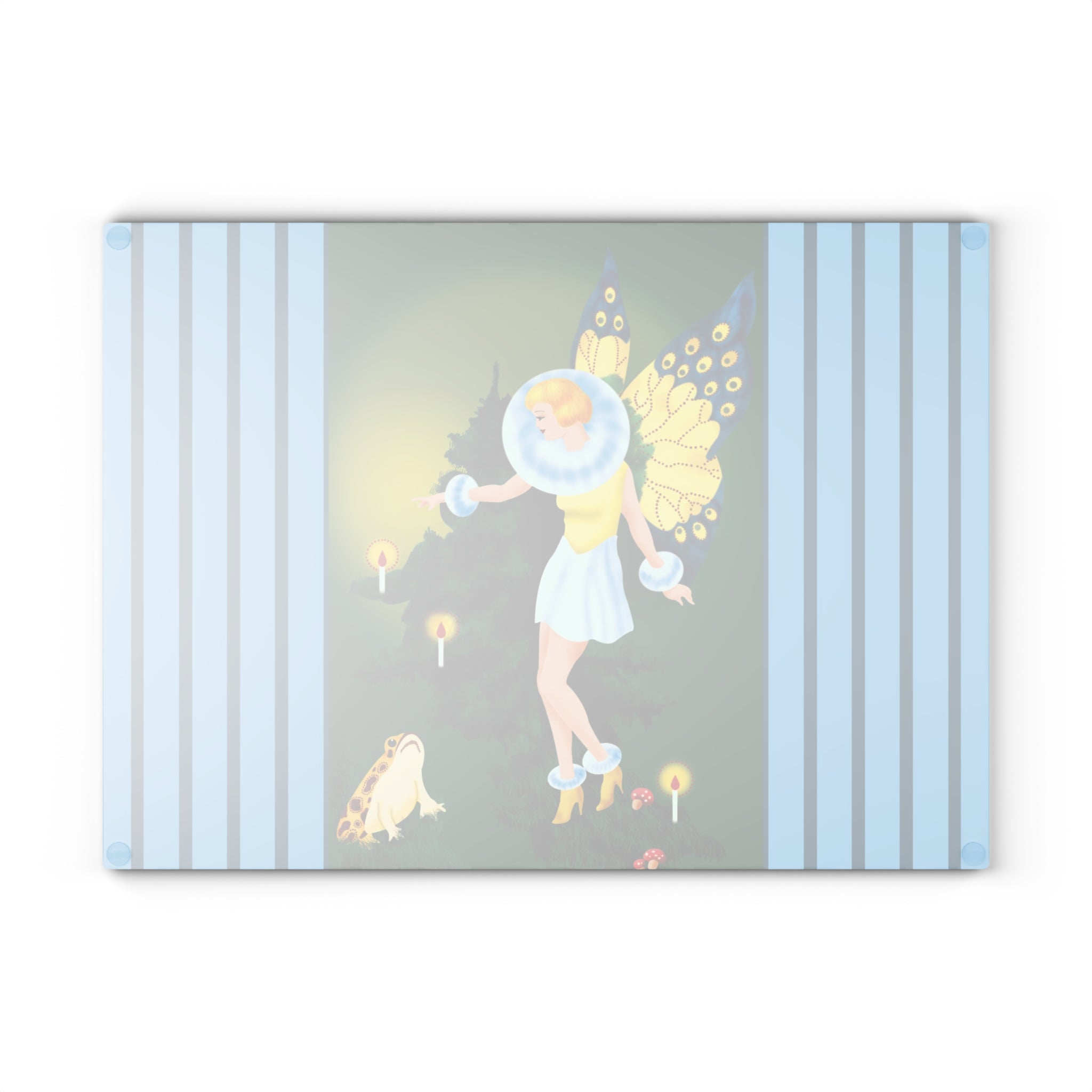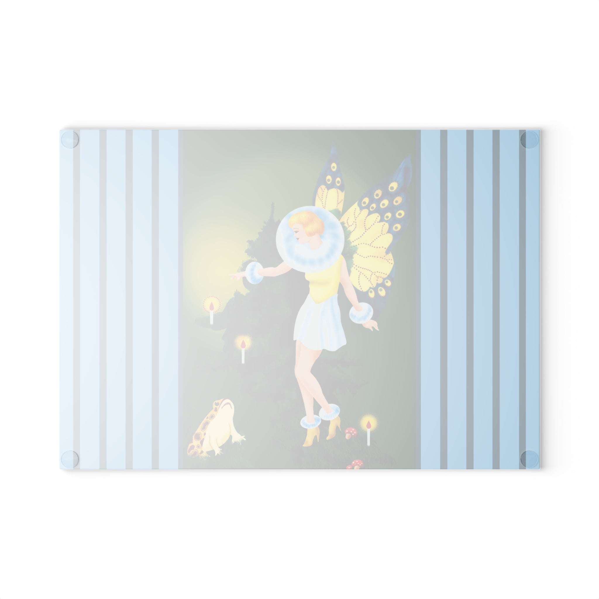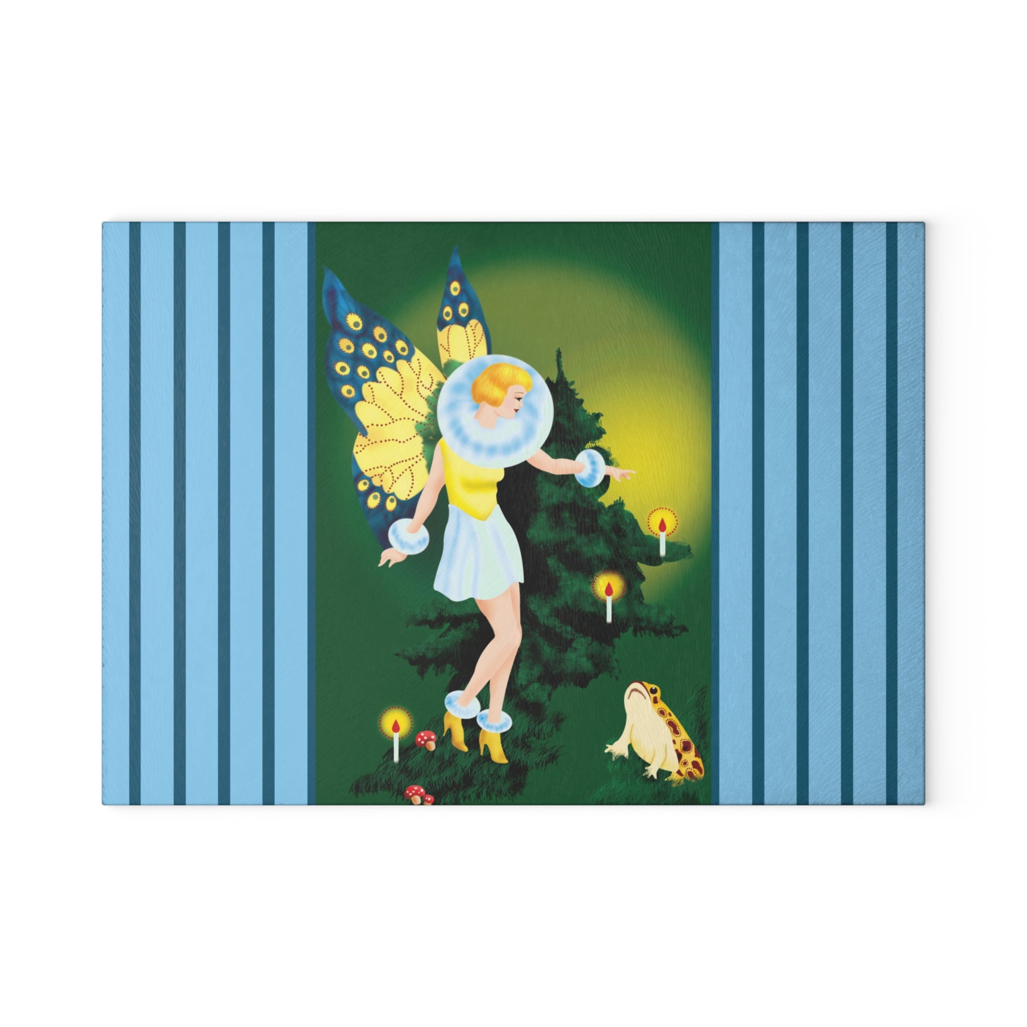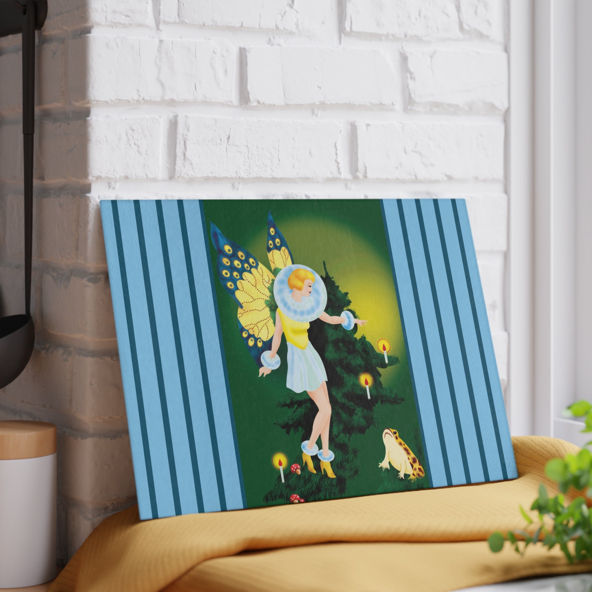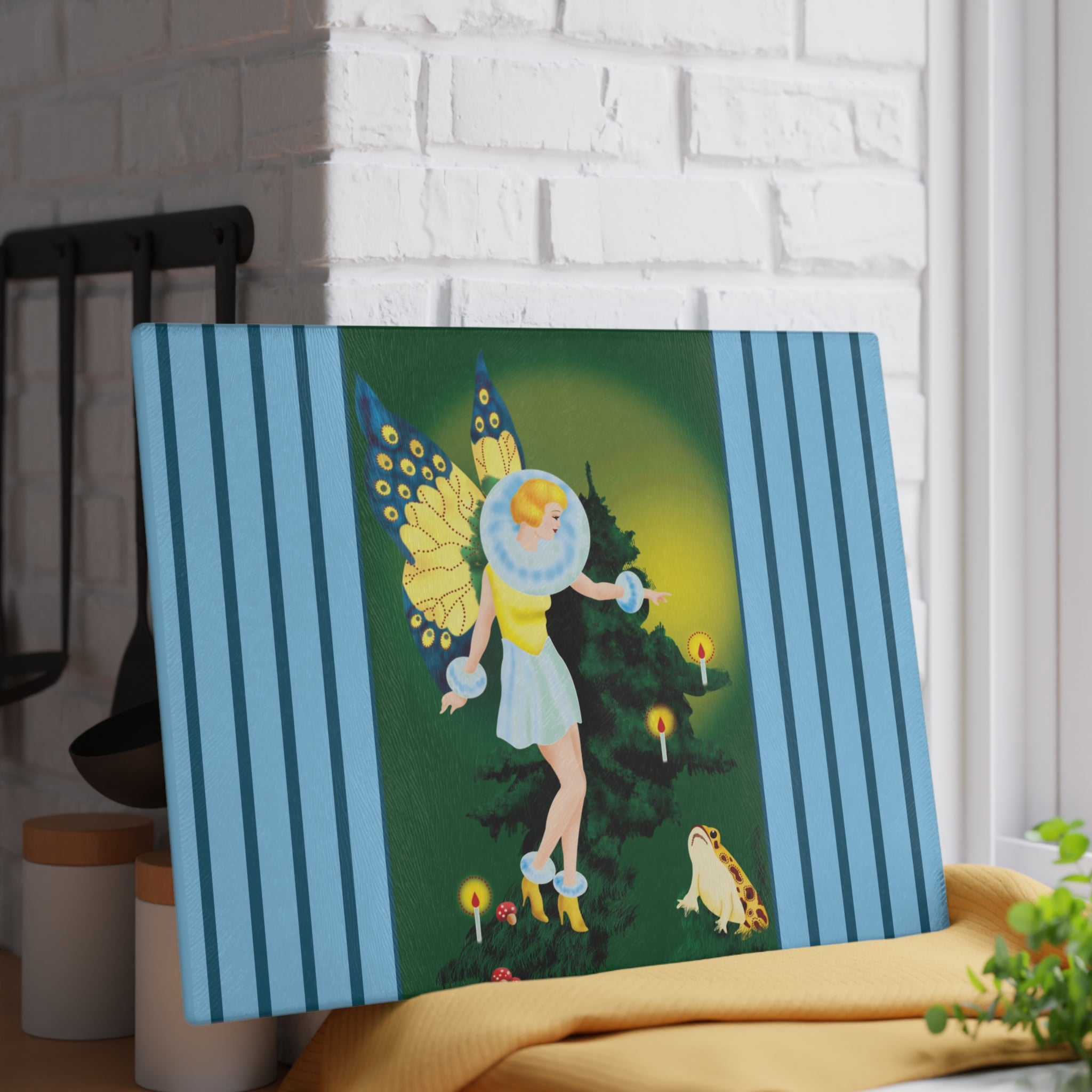 The artwork brings fairytale charm to the kitchen — a golden-haired fairy with butterfly wings, dressed in a white fur-trimmed dress and golden heels, stands before a towering evergreen. Flickering candles, red-capped mushrooms, and a deep green woodland backdrop complete this enchanting scene.