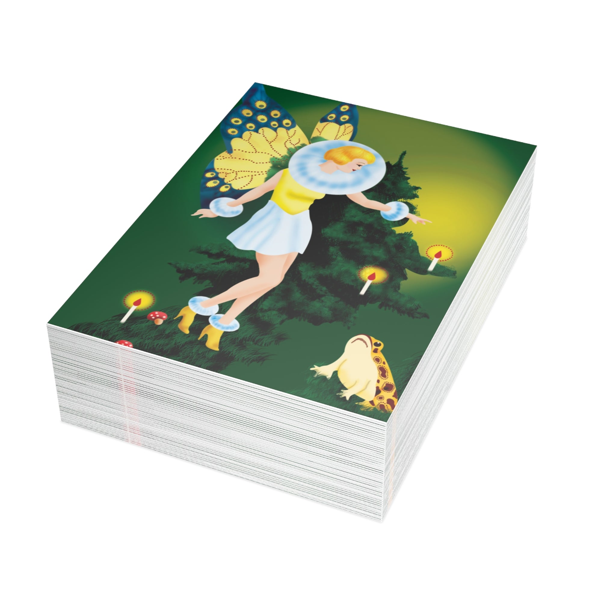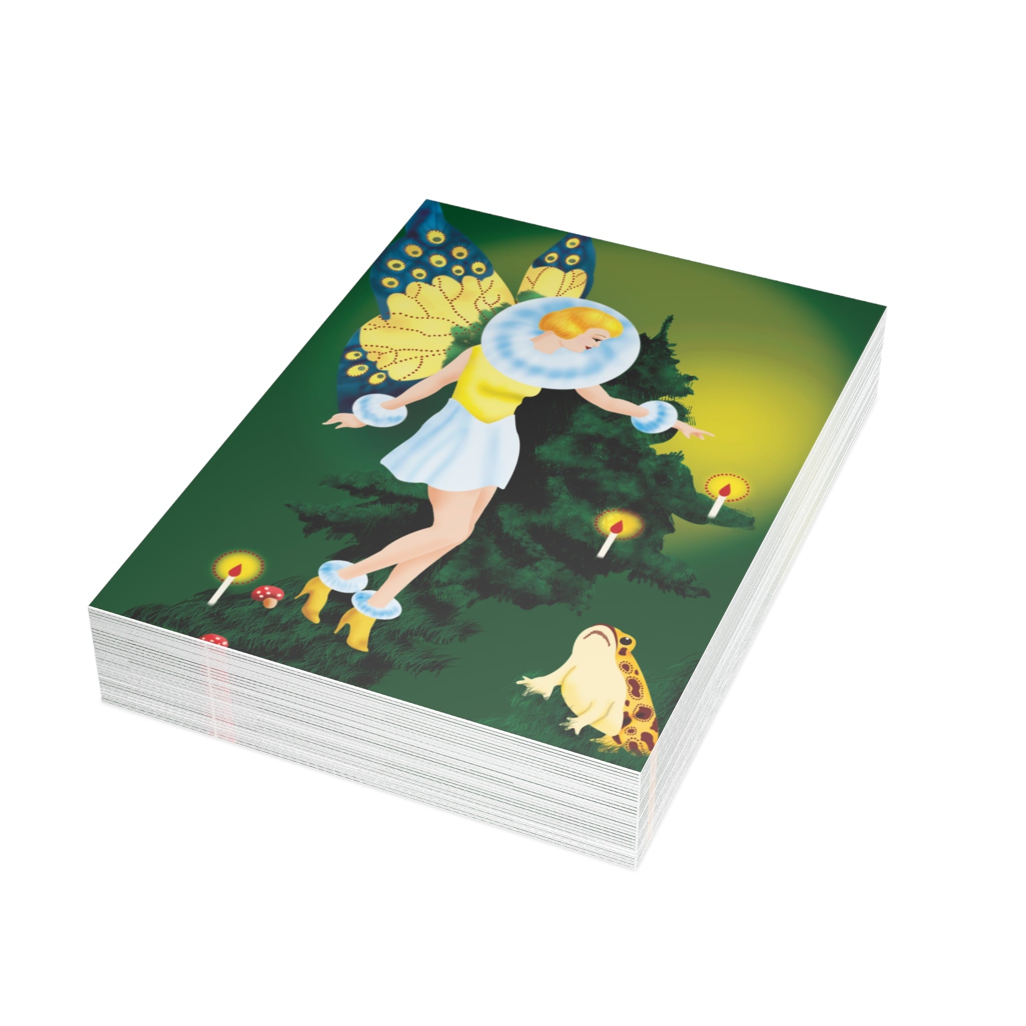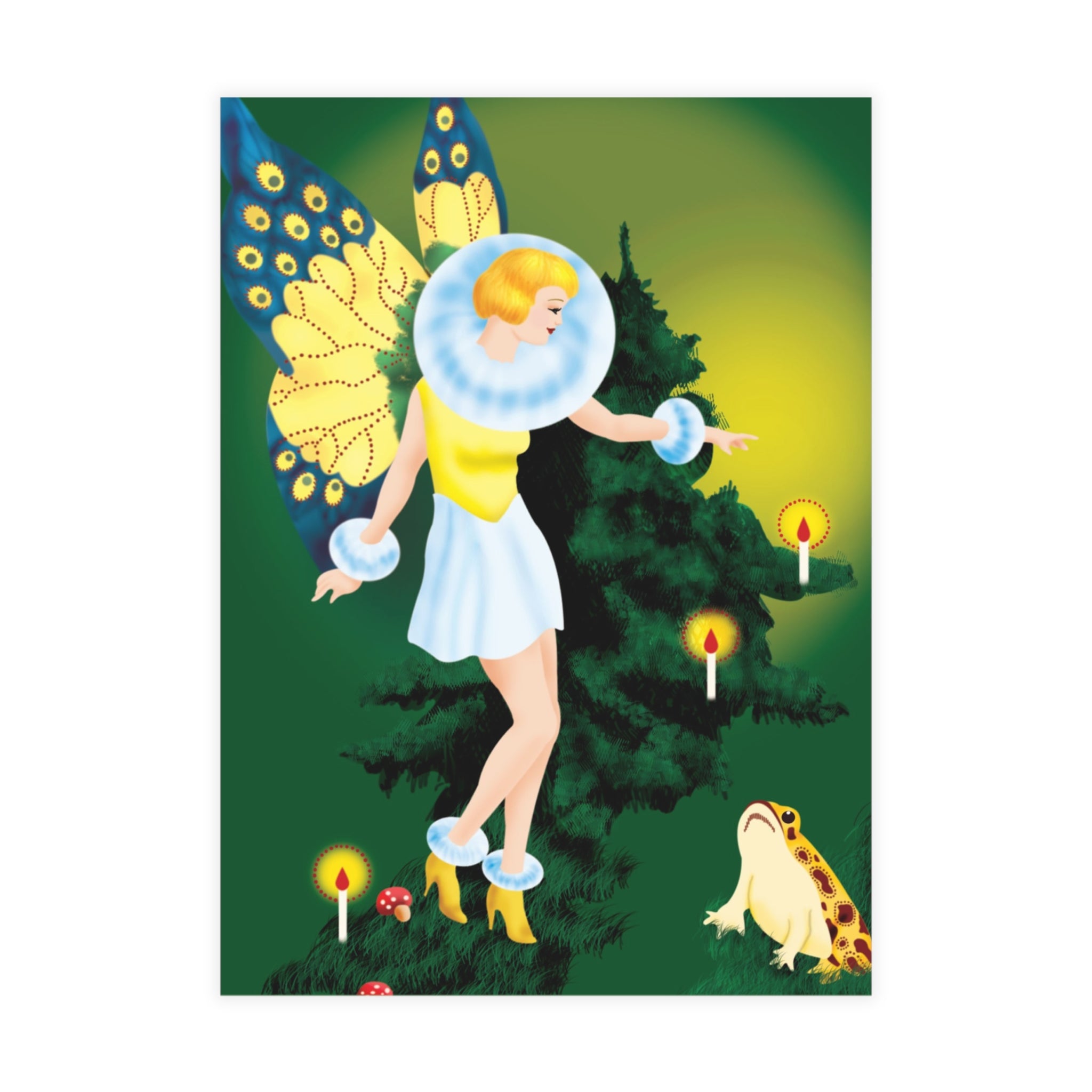 The design features a golden-haired fairy with butterfly wings, dressed in a white fur-trimmed dress and golden heels, standing before a towering evergreen. Flickering candles, red-capped mushrooms, and a deep green backdrop complete this enchanting woodland scene.