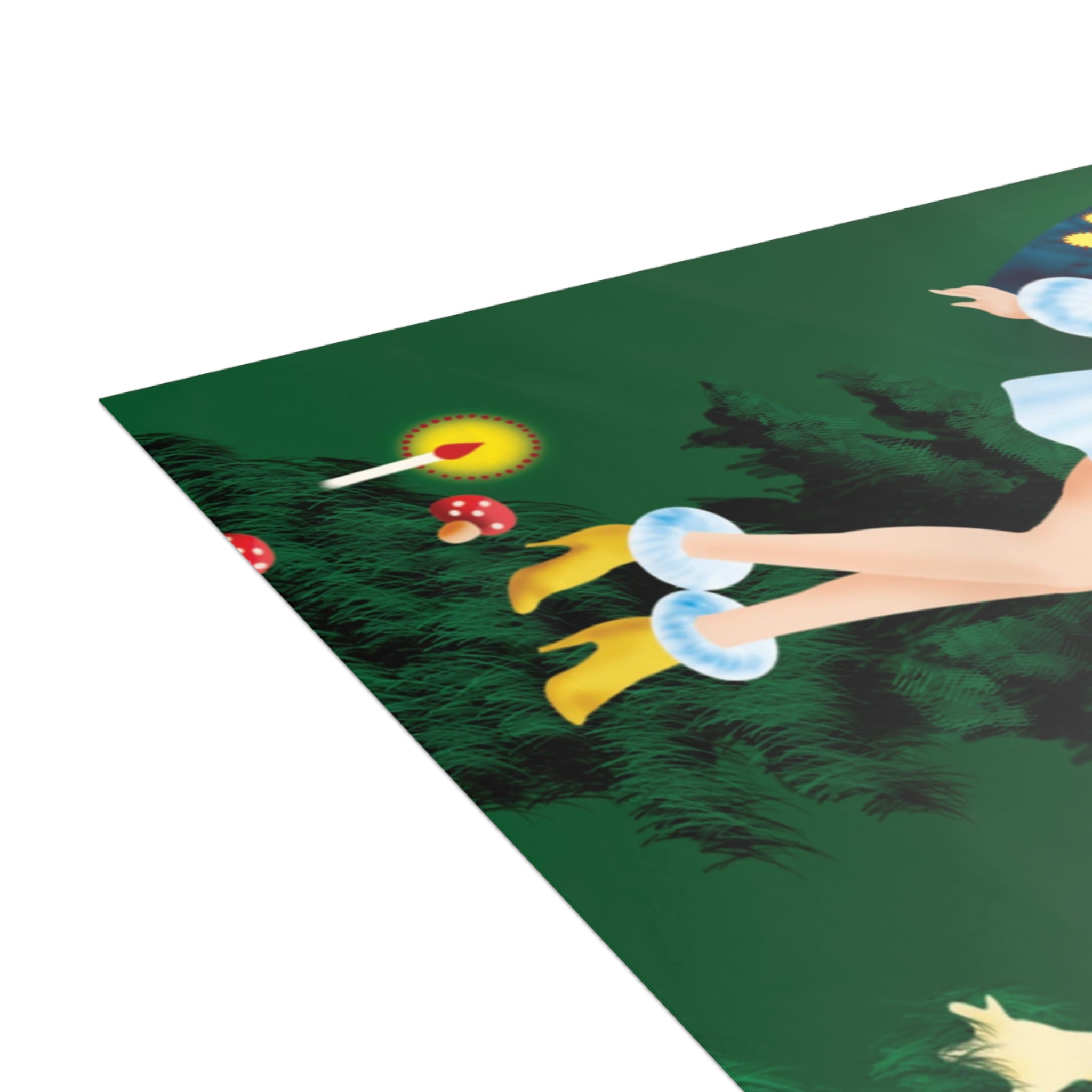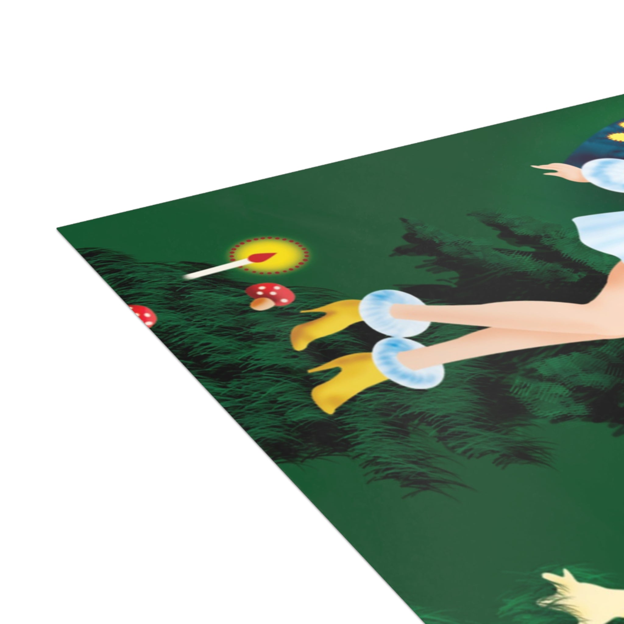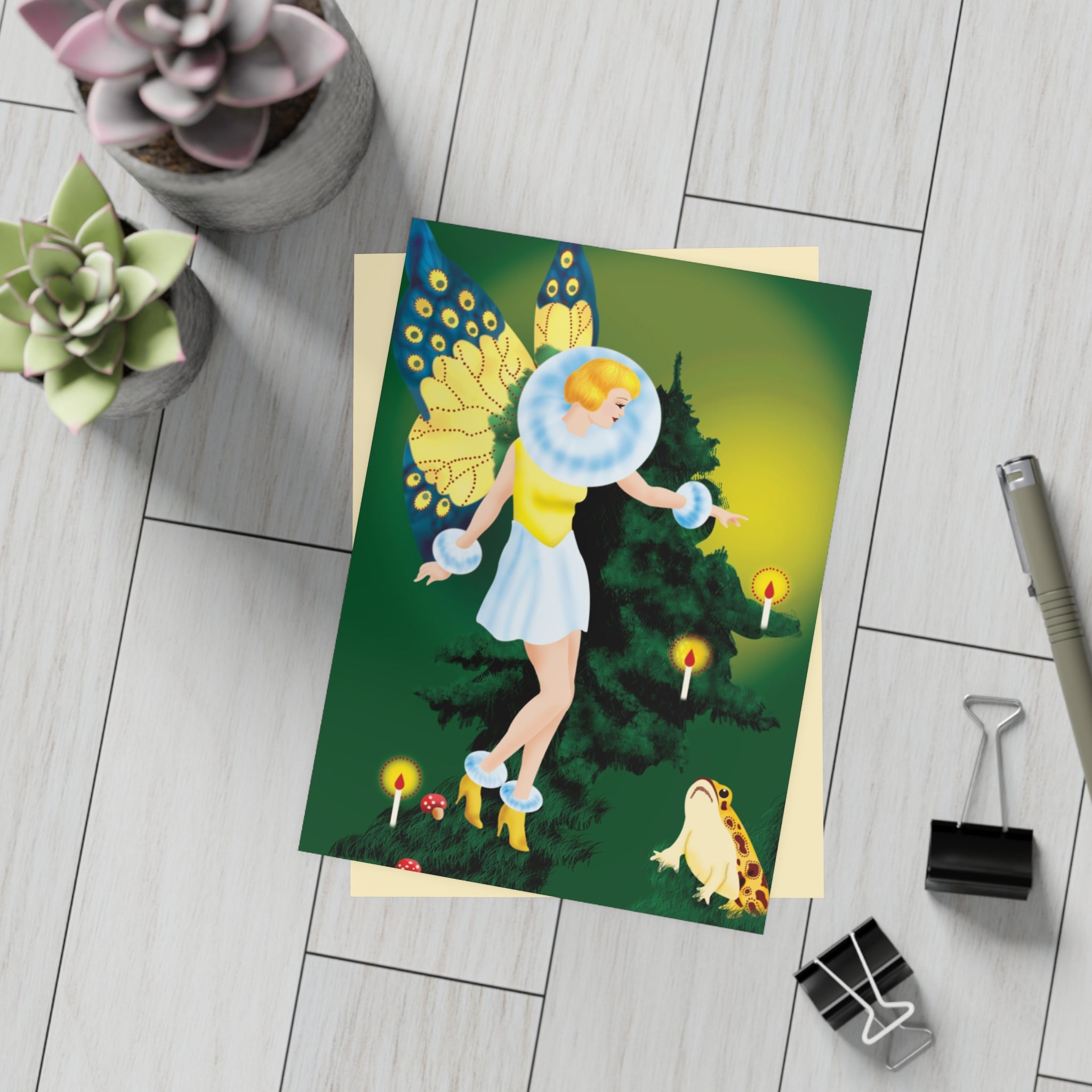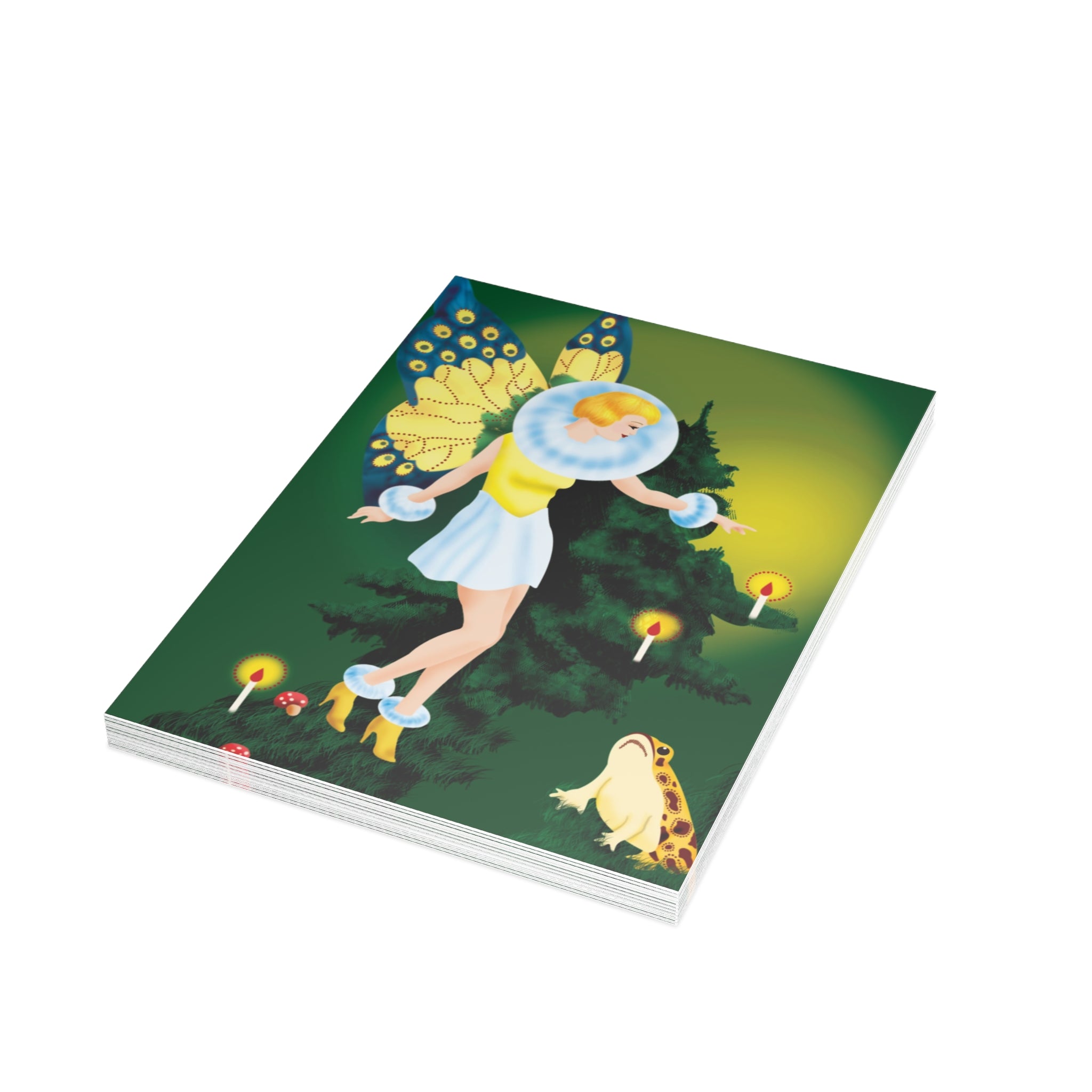 The design features a golden-haired fairy with butterfly wings, dressed in a white fur-trimmed dress and golden heels, standing before a towering evergreen. Flickering candles, red-capped mushrooms, and a deep green backdrop complete this enchanting woodland scene.