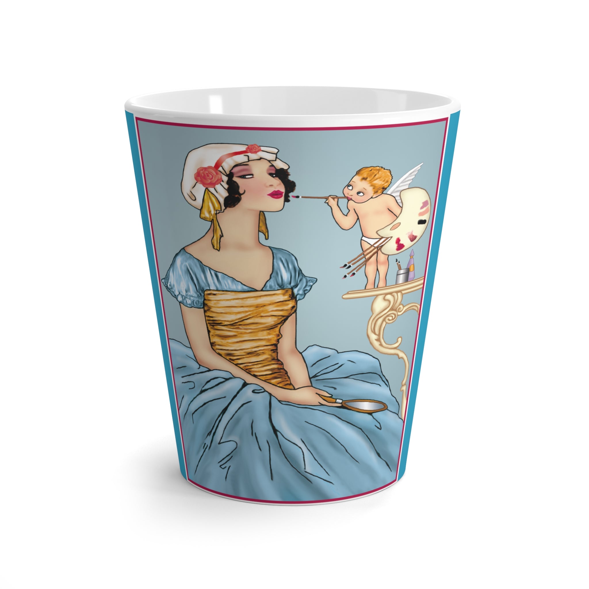 Artwork designed and digitally remastered by Sarasvati Designs. In this vintage painting, a charming woman is depicted wearing a stylish blue dress with a large tan fabric belt accentuating her slender figure. Adorned with a loose white bonnet embellished with woven roses, she sits gracefully with her hands resting on her lap, holding a mirror. Standing beside her on an ornate table is a small fairy with delicate wings, who holds a palette of paints and thin brushes. The fairy is engaged in the task of meticulously applying lipstick to the woman's lips.