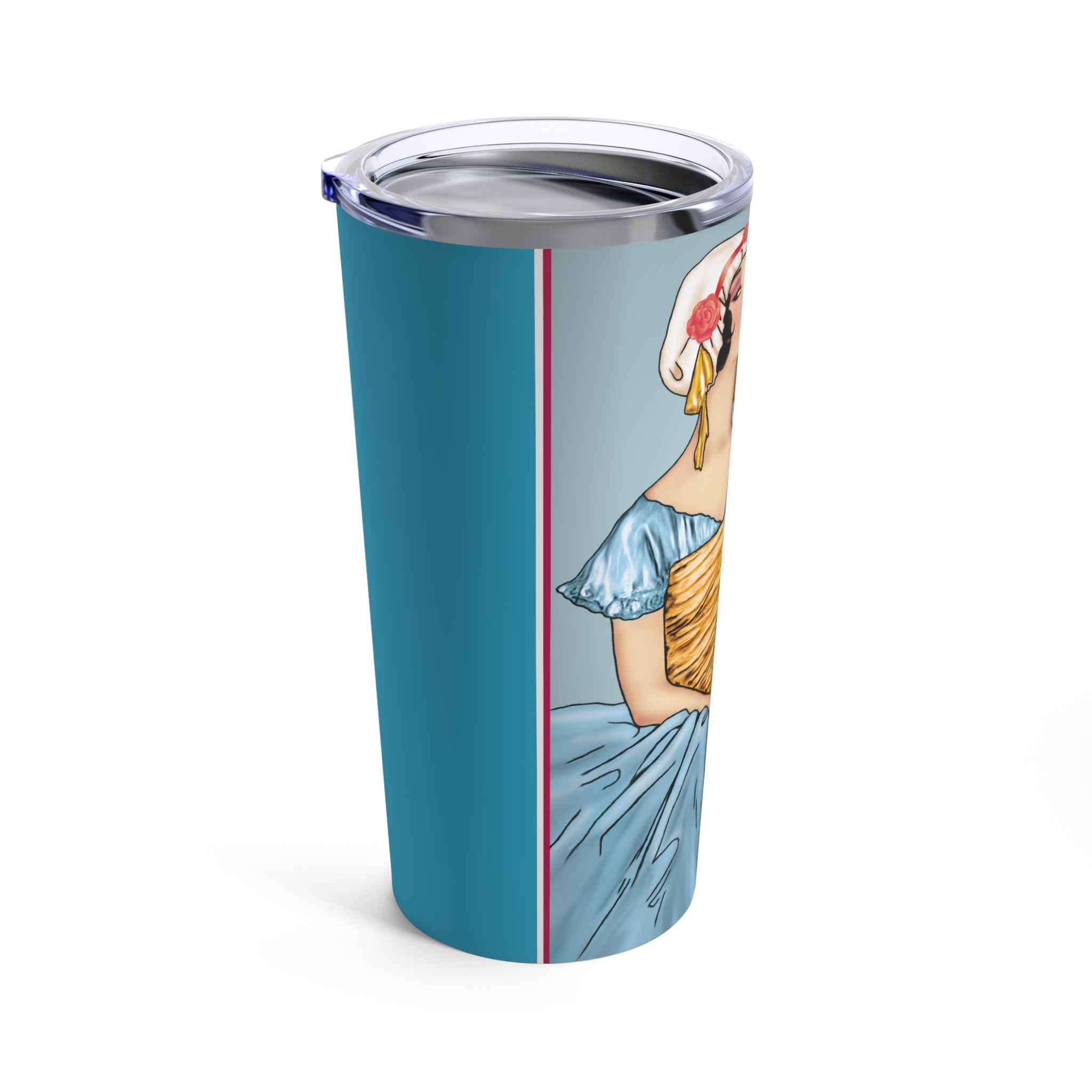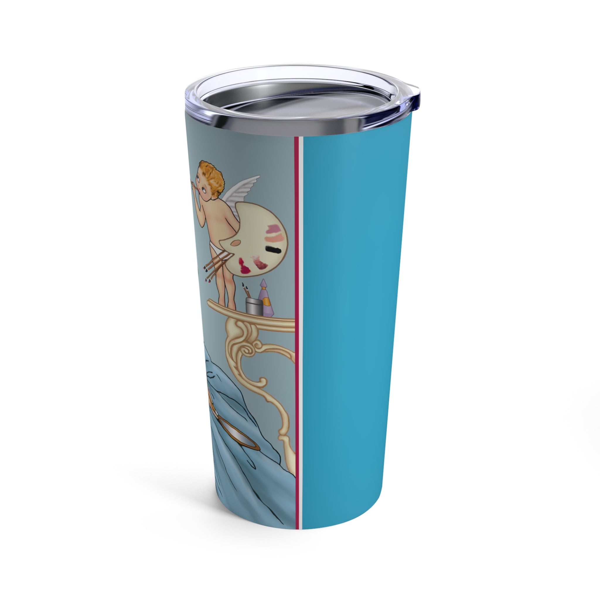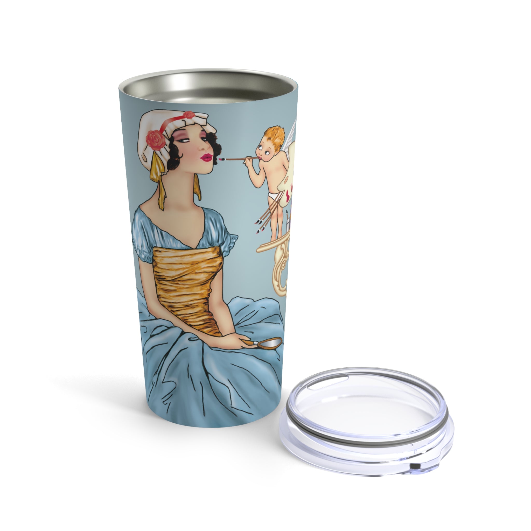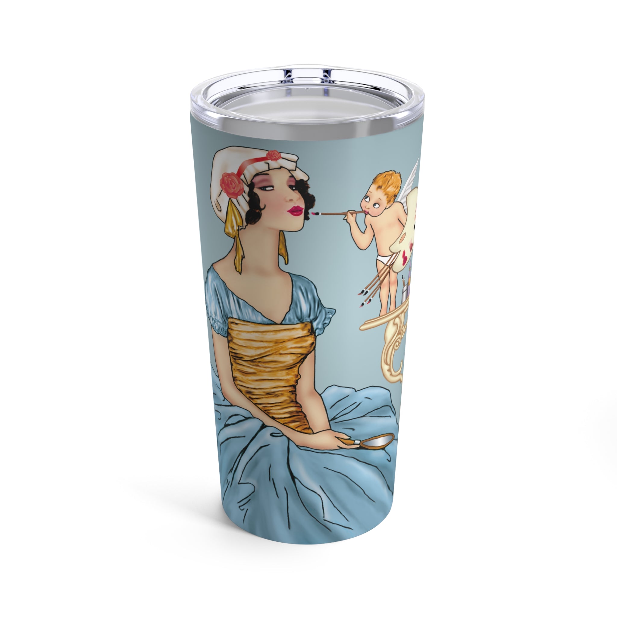 Artwork designed and digitally remastered by Sarasvati Designs. In this vintage painting, a charming woman is depicted wearing a stylish blue dress with a large tan fabric belt accentuating her slender figure. Adorned with a loose white bonnet embellished with woven roses, she sits gracefully with her hands resting on her lap, holding a mirror. Standing beside her on an ornate table is a small fairy with delicate wings, who holds a palette of paints and thin brushes. The fairy is engaged in the task of meticulously applying lipstick to the woman's lips.