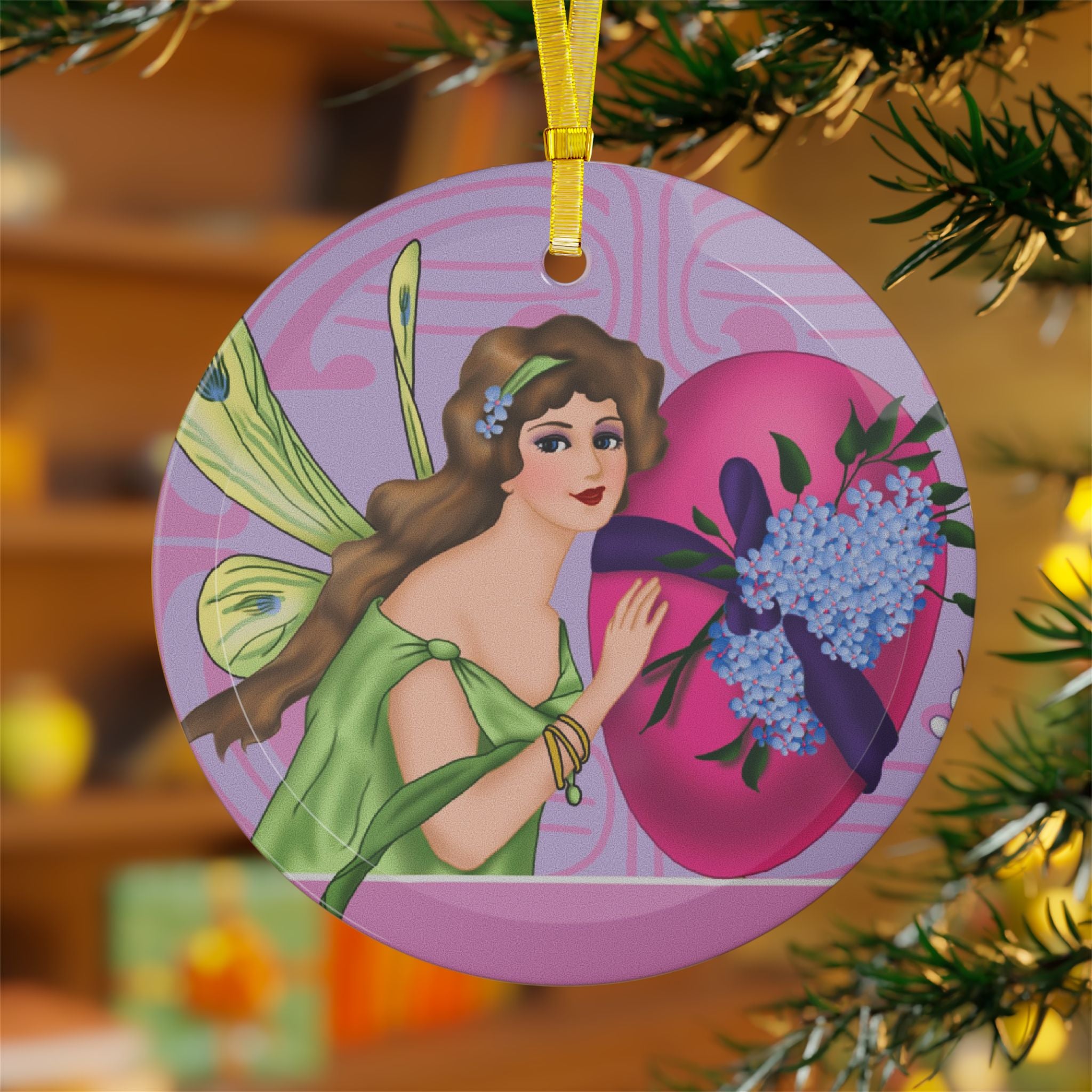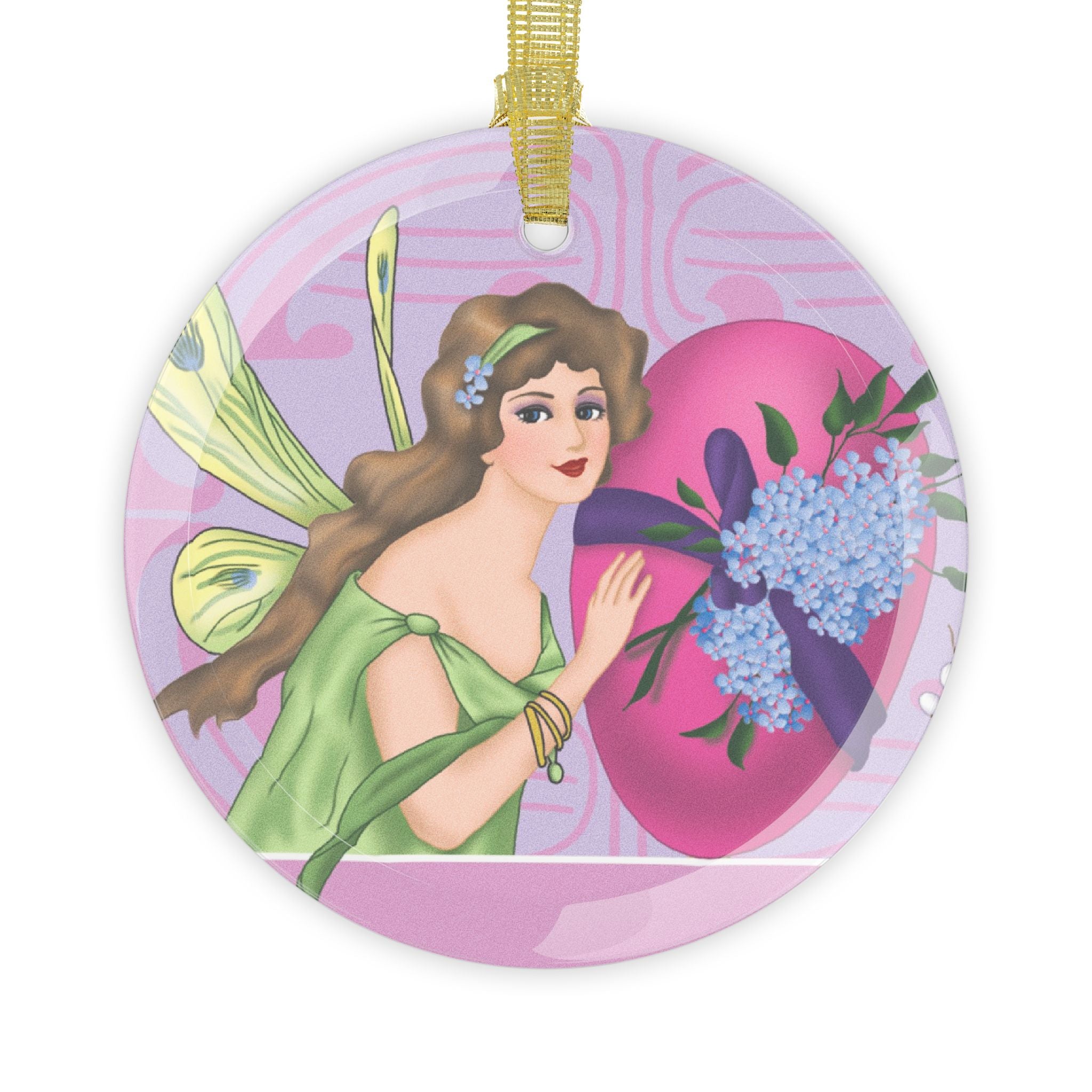 The artwork features a winged fairy with flowing brown hair and a green gown leaning against a giant, vibrant magenta Easter egg. The egg is adorned with a thick cluster of blue and lavender flowers tied with a purple ribbon, while a curious brown rabbit stands at the base holding a pussy willow branch in its mouth. Set against a soft lilac background with symmetrical ornamental swirling patterns, the scene feels decorative, dreamy, and richly detailed—like a tiny storybook moment captured in glass.