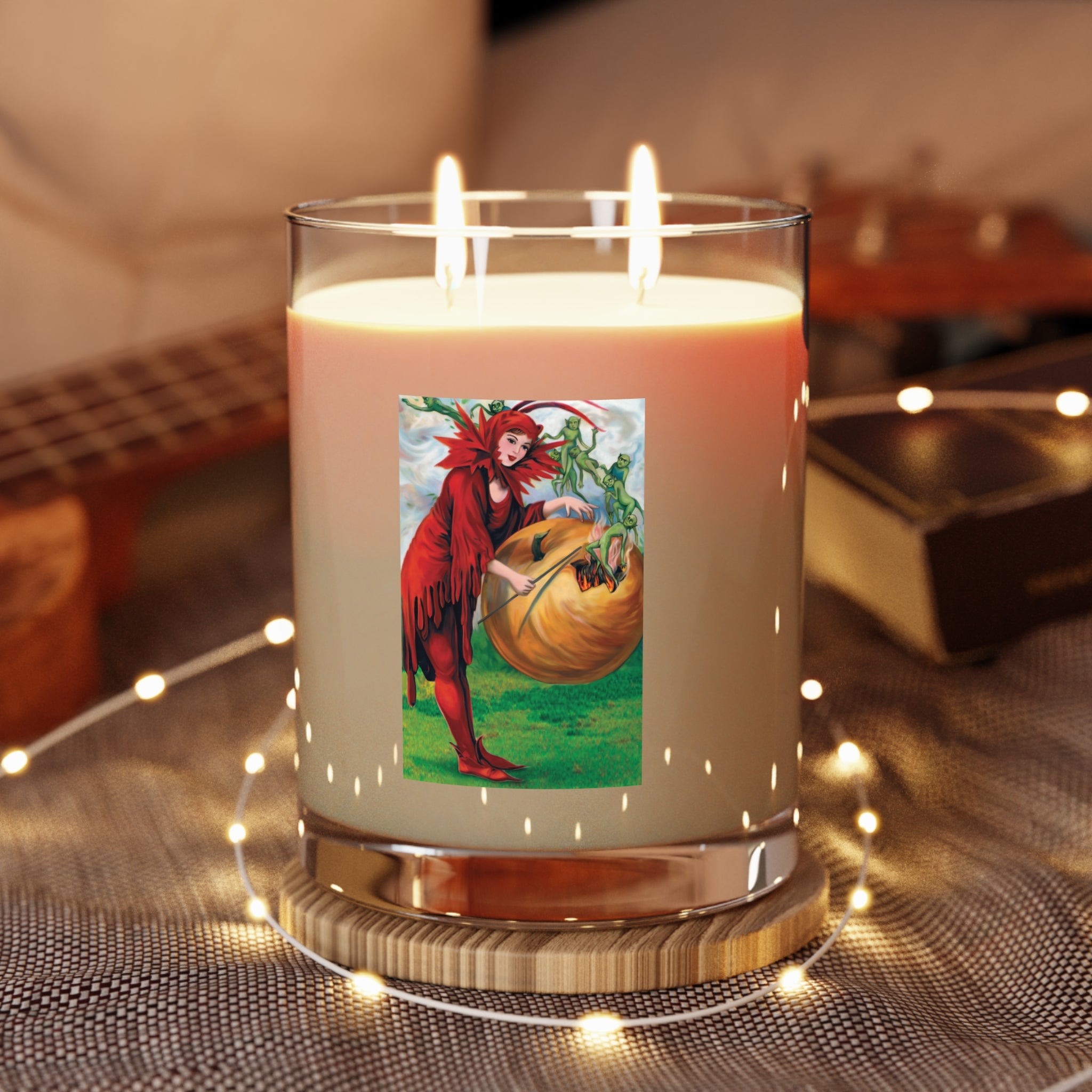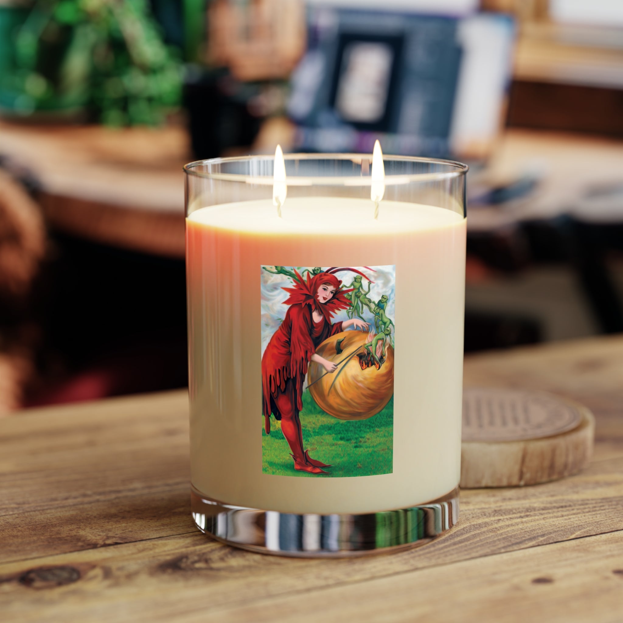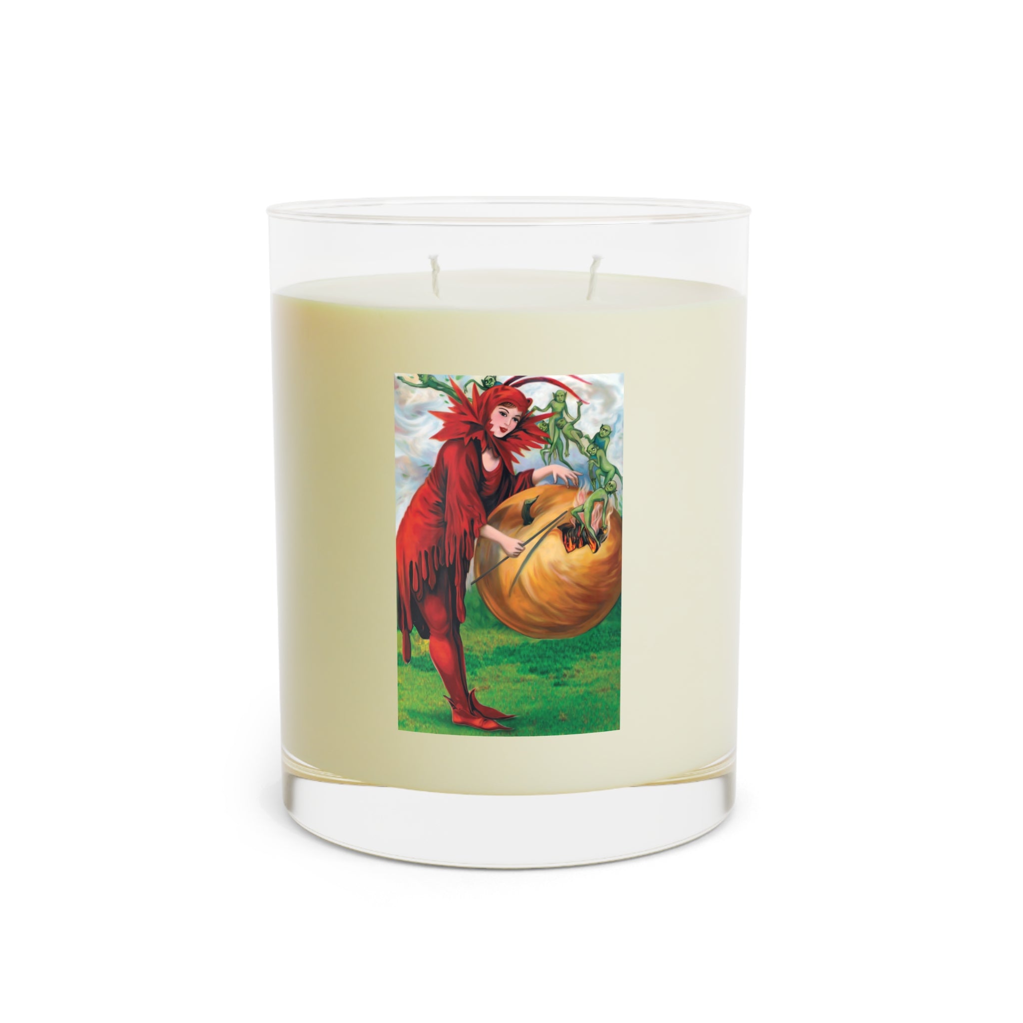 Bring the mystery of Halloween into your home with this scented candle featuring a repainted vintage artwork of a woman in red casting a spell over a pumpkin, releasing tiny green elves in an enchanting scene. The vibrant design is digitally enhanced by Sarasvati Designs and printed directly on glass for a premium look that glows beautifully as the candle burns.