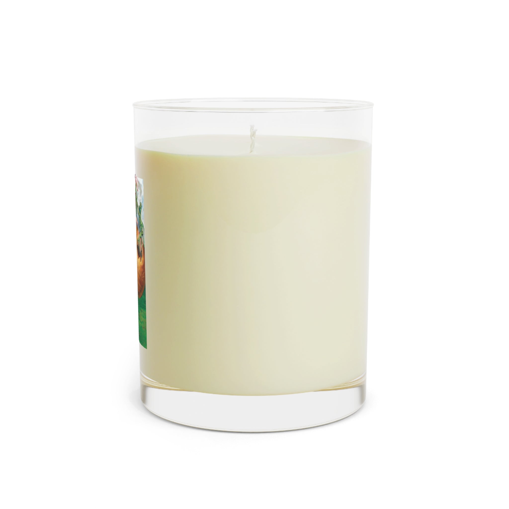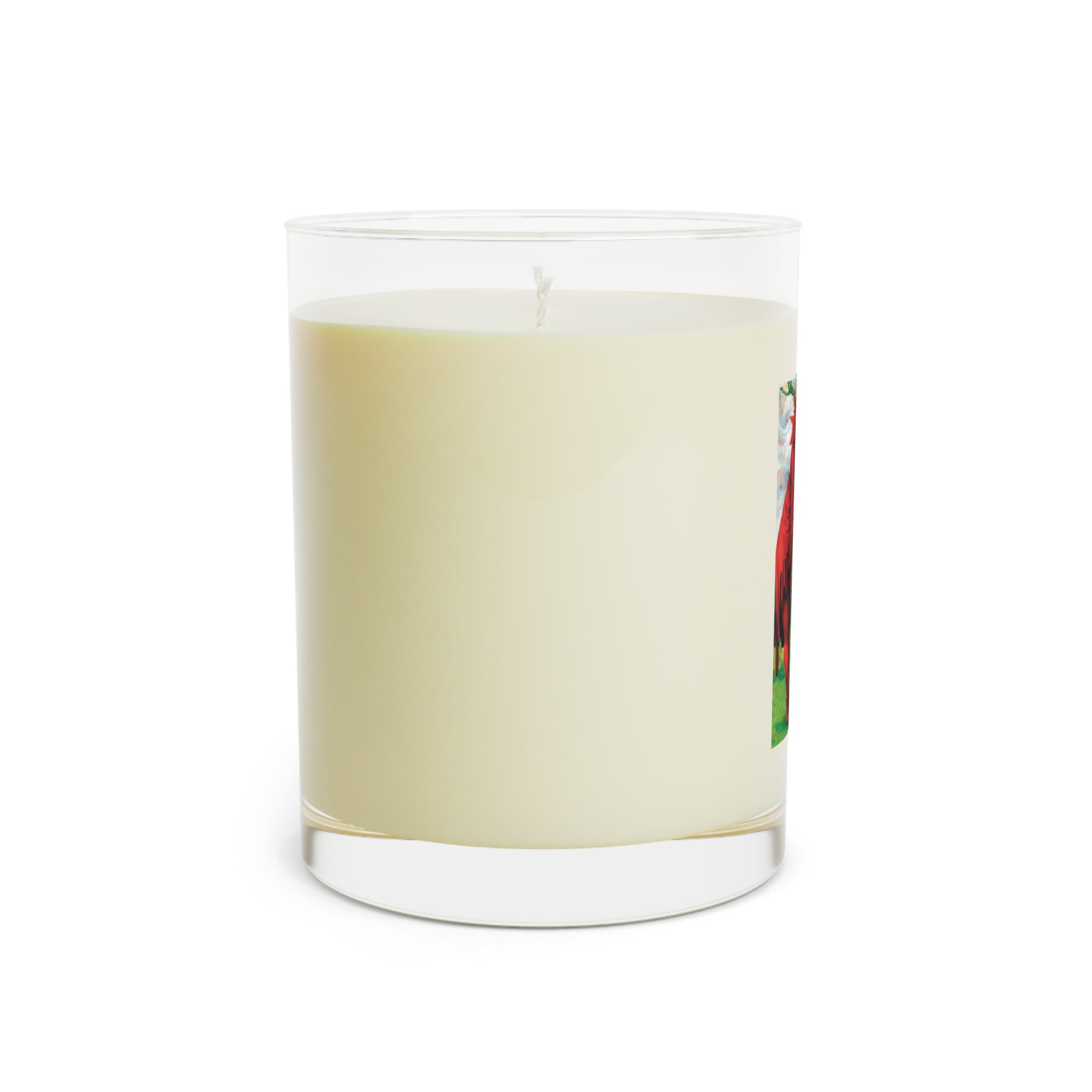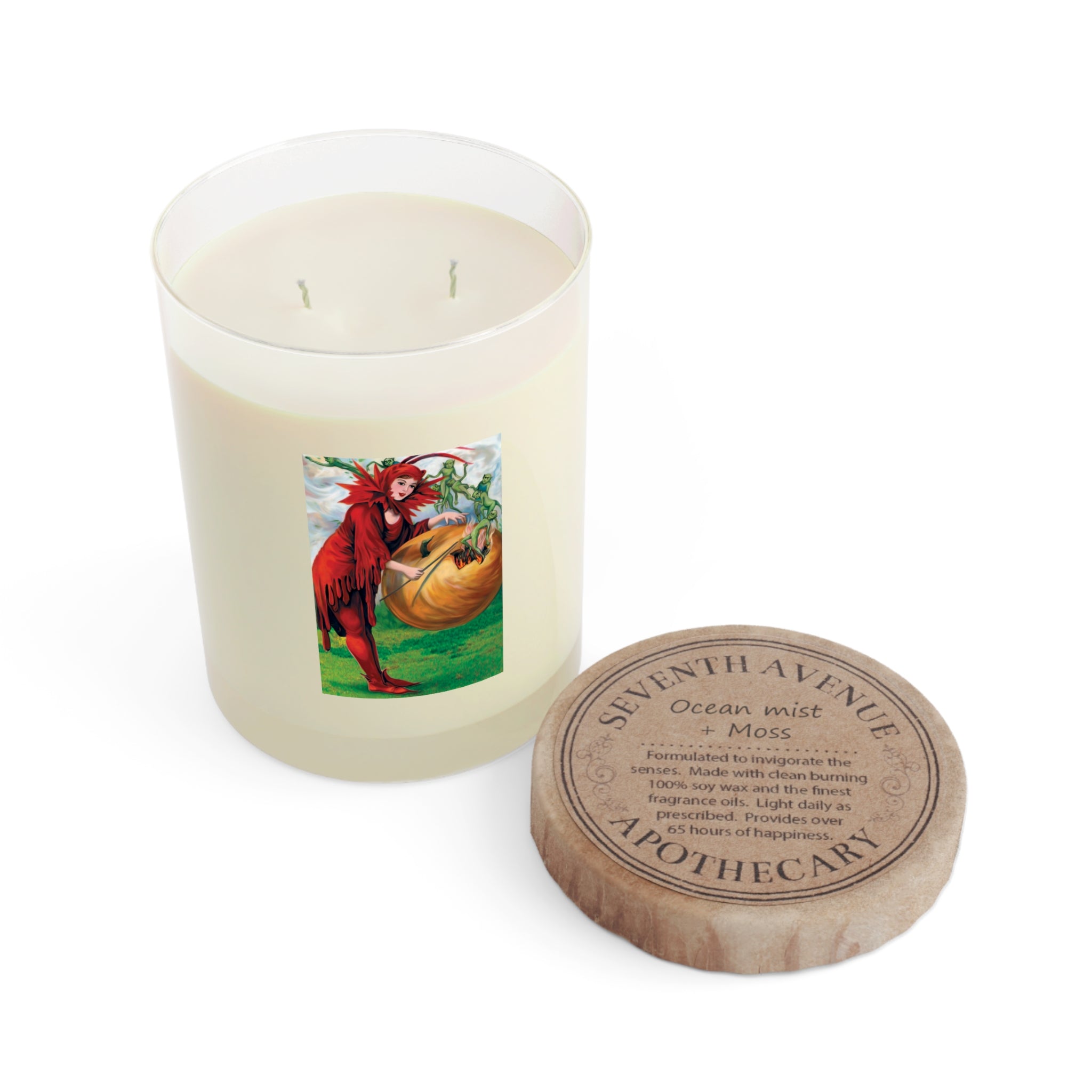 Bring the mystery of Halloween into your home with this scented candle featuring a repainted vintage artwork of a woman in red casting a spell over a pumpkin, releasing tiny green elves in an enchanting scene. The vibrant design is digitally enhanced by Sarasvati Designs and printed directly on glass for a premium look that glows beautifully as the candle burns.