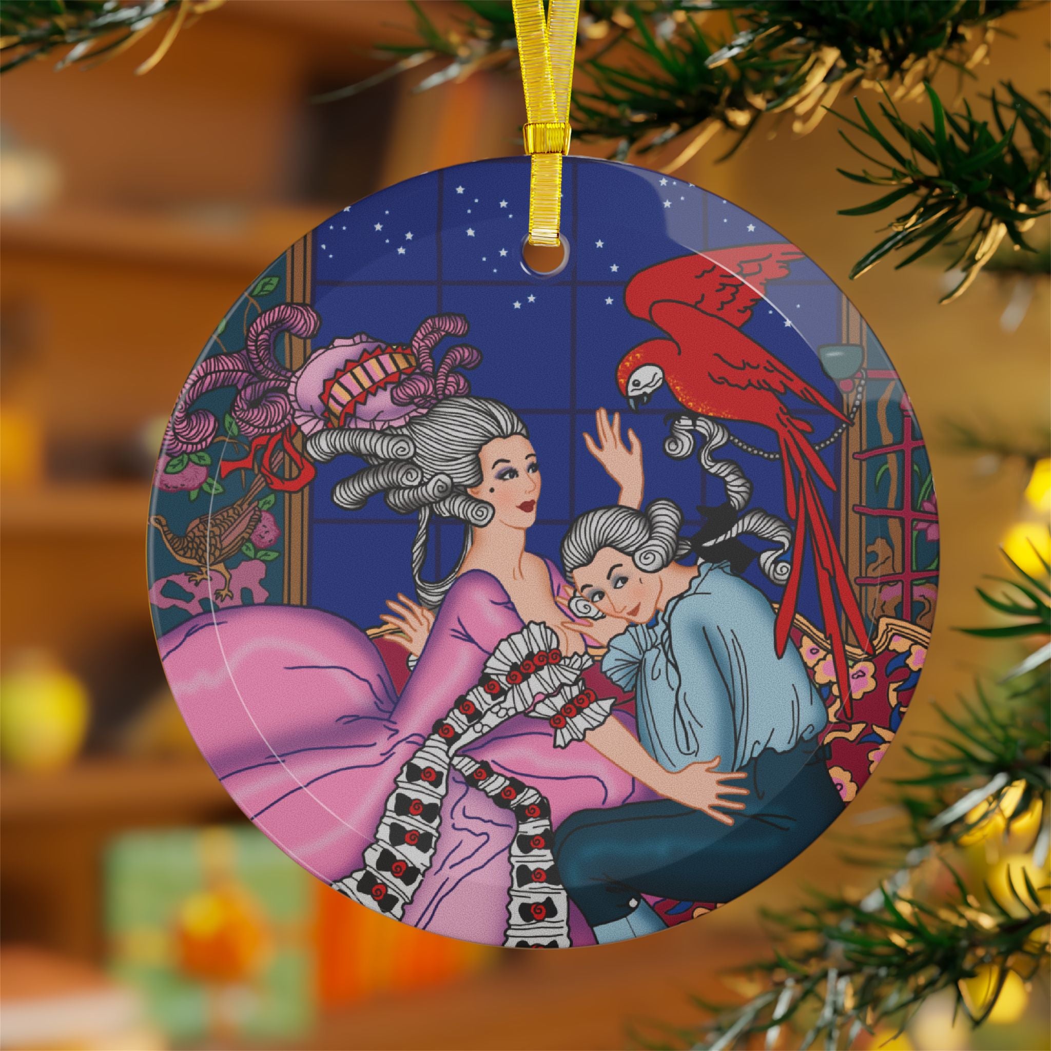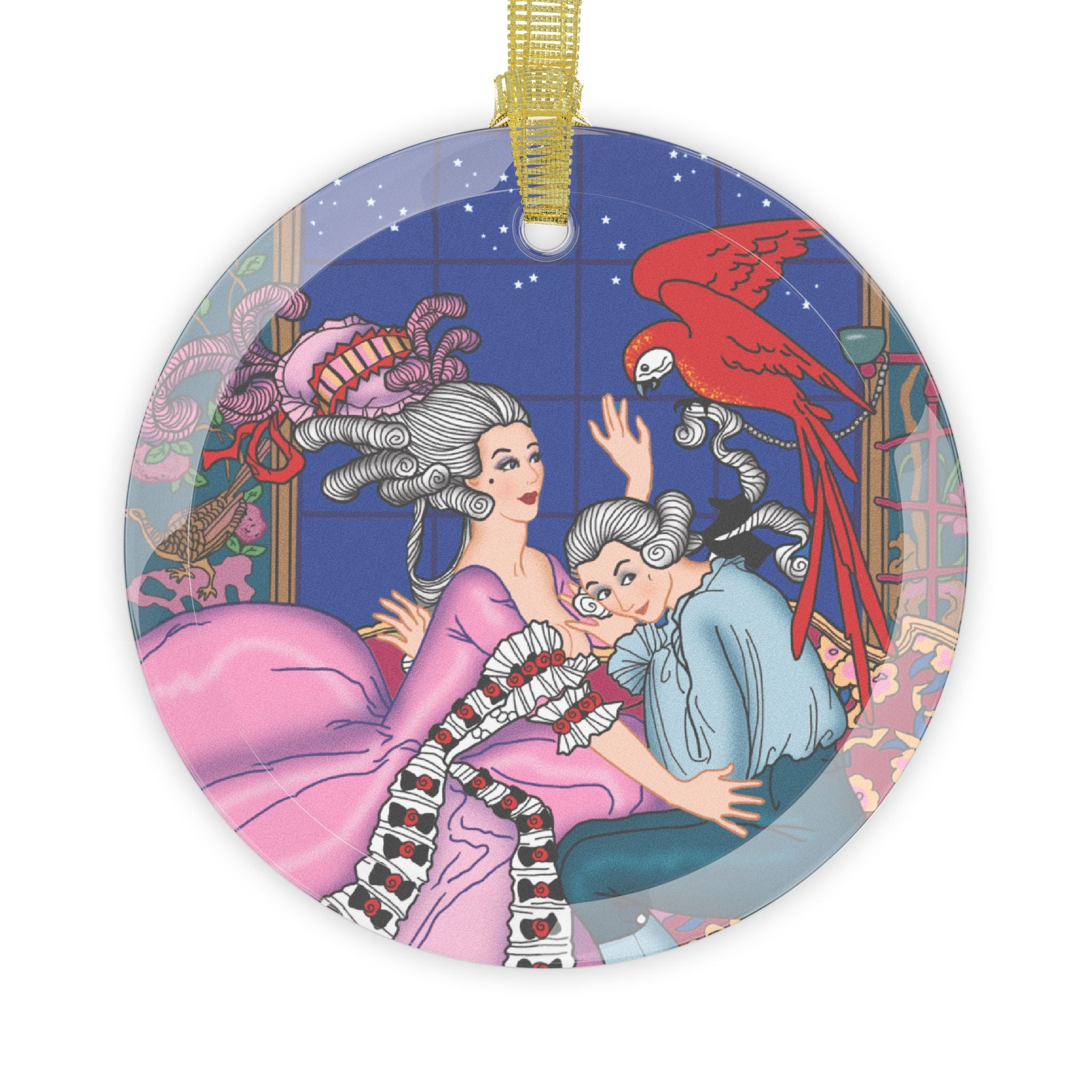 The Jealous Parrot Glass Ornament captures the intrigue and elegance of 1920s Art Deco illustration. This luxurious 100% glass ornament showcases George Barbier’s pochoir masterpiece “La Guirlande, Le Perroquet Jaloux,” where a striking parrot becomes the center of a romantic tale filled with beauty, tension, and mystery. Its beveled edges and gold ribbon add a refined touch to any holiday display, making it a standout collectible or a dazzling gift for lovers of vintage design.