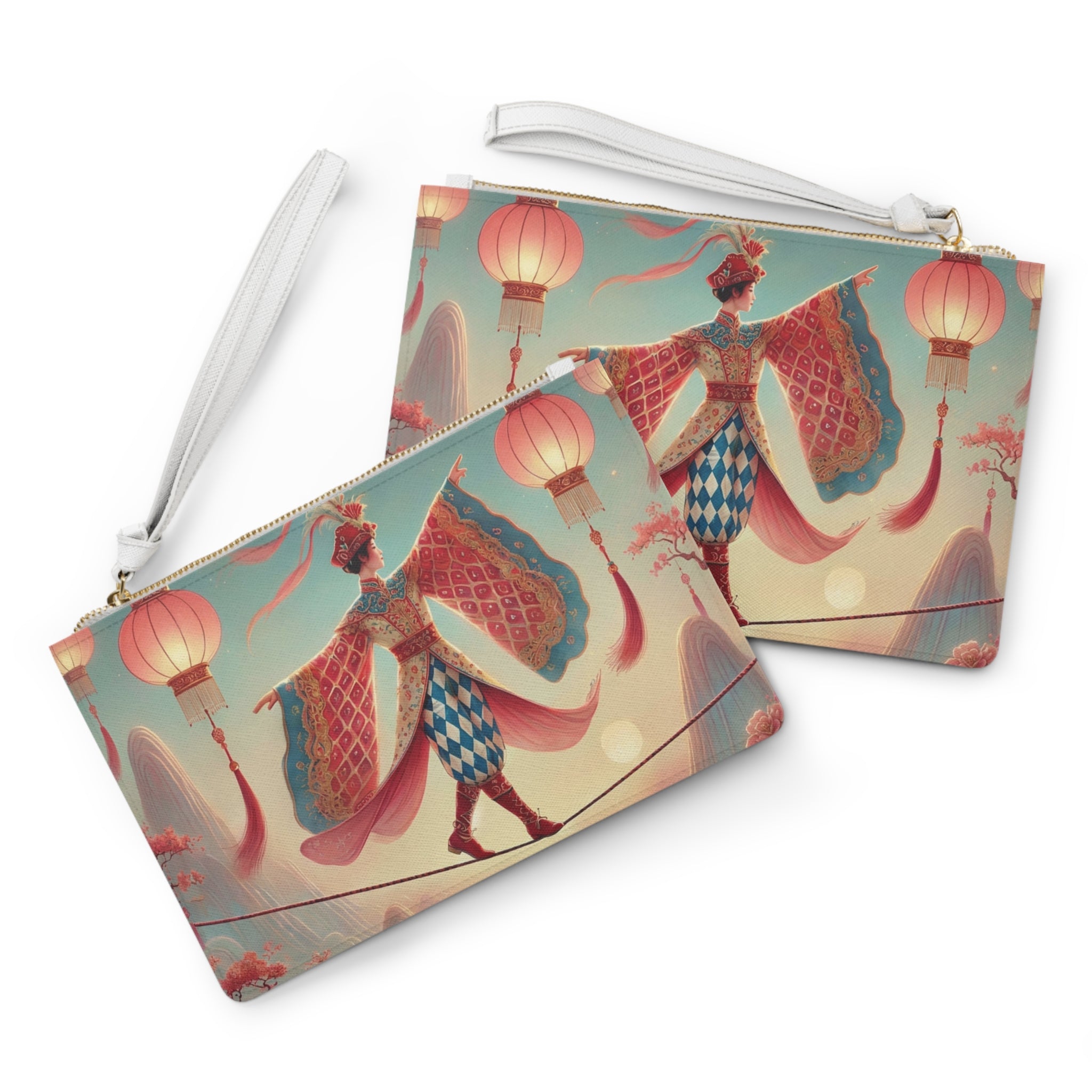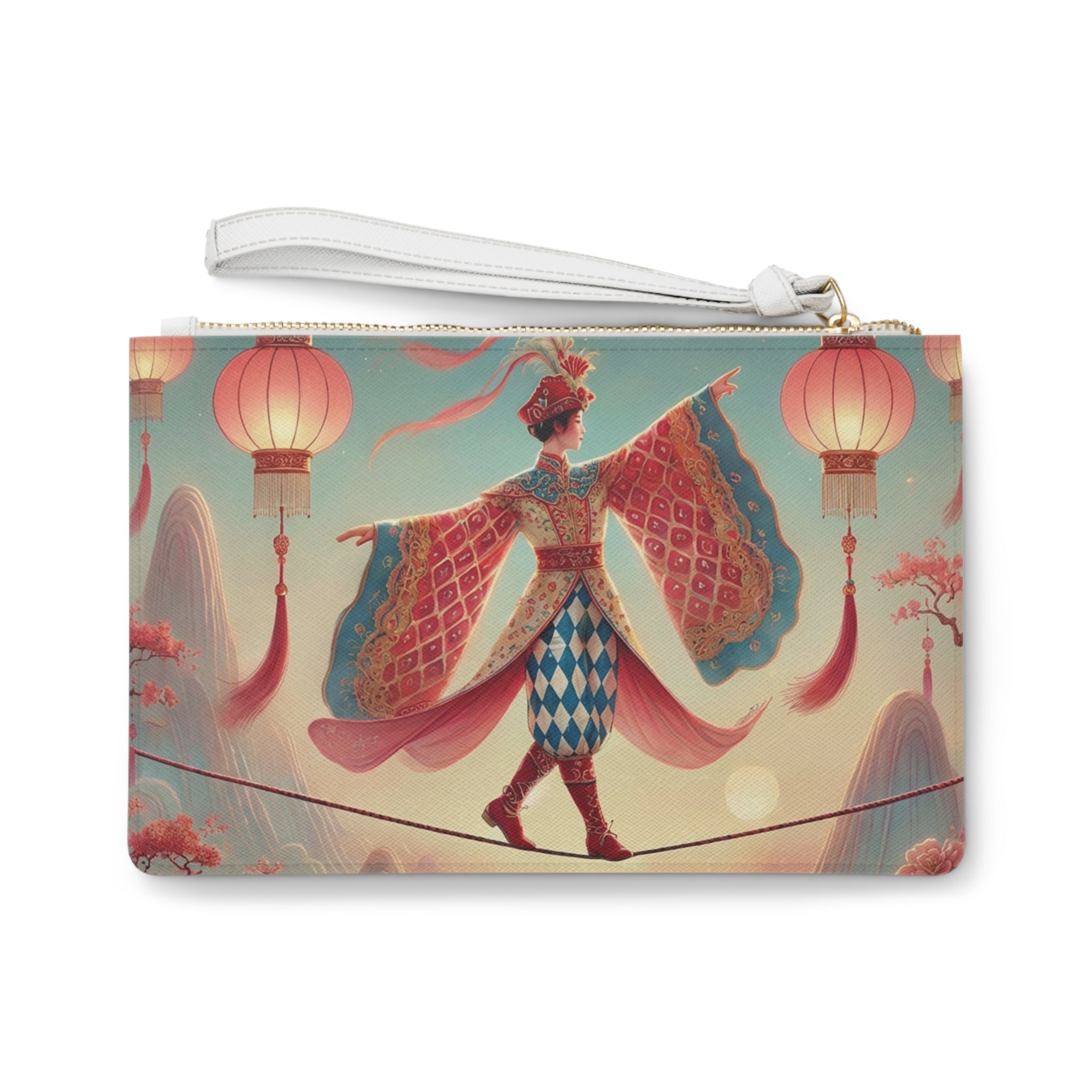 The artwork features a graceful figure crossing a narrow rope suspended above drifting clouds, softly illuminated by hanging lanterns. Flowing garments and outstretched sleeves suggest balance and quiet motion, while misty mountains and blossoming branches create a tranquil, fantastical backdrop. Inspired by classical East Asian motifs, the scene evokes focus, poise, and gentle elegance—perfectly paired with the refined Saffiano-pattern finish (inspired by Prada) for a polished, modern look.