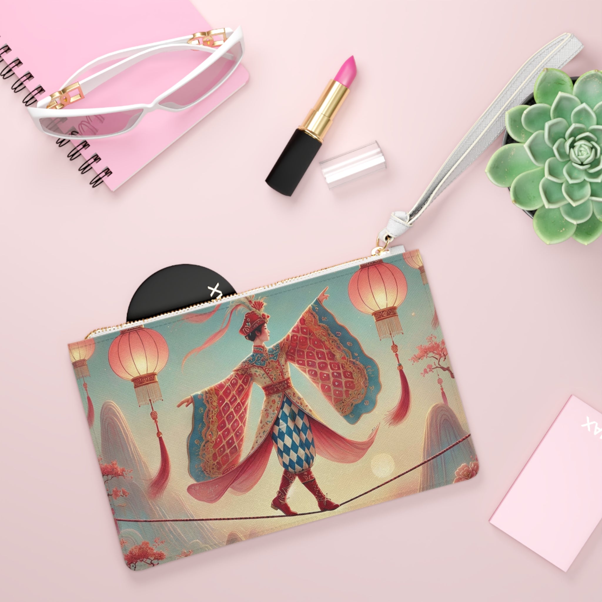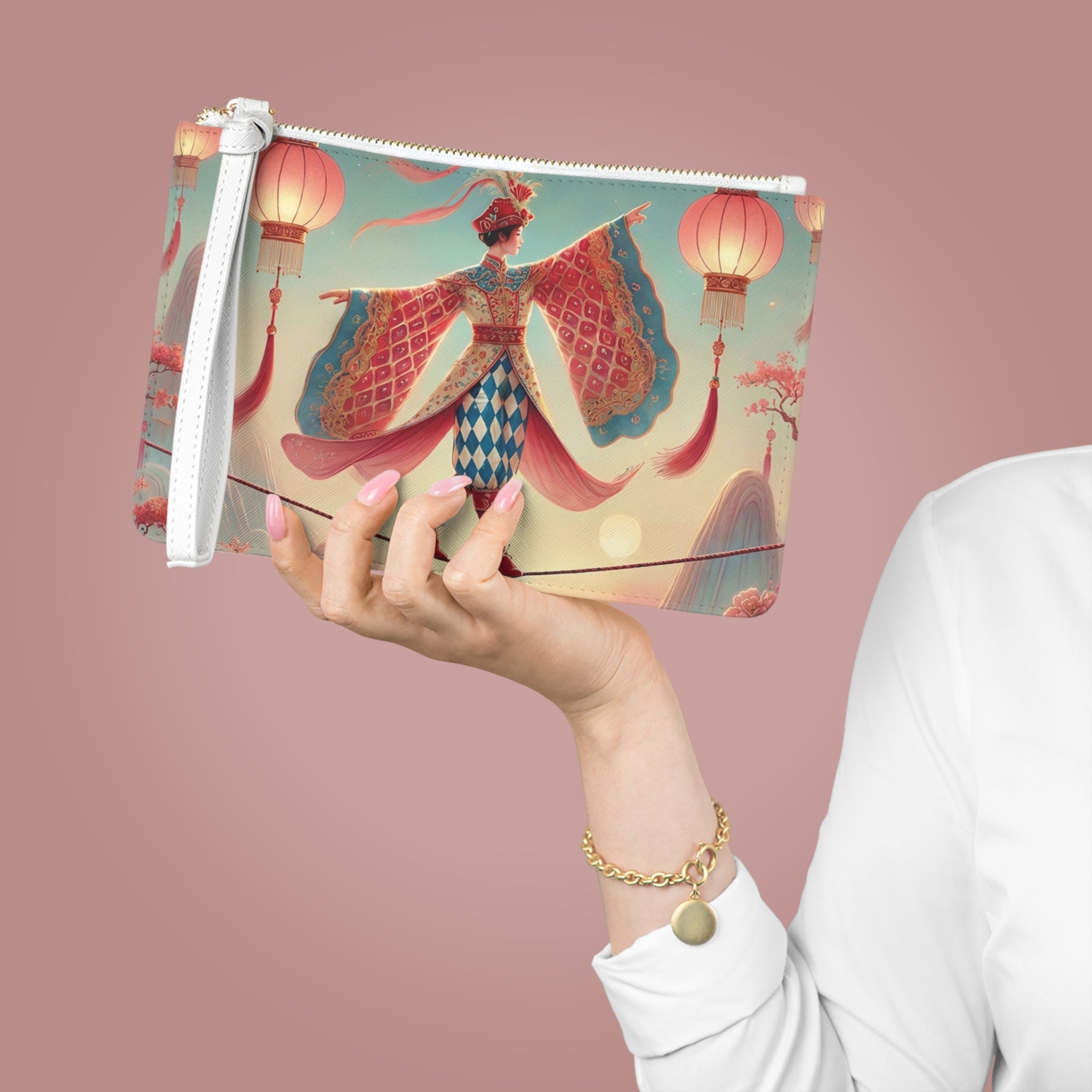 The Lantern Walker Clutch Bag is designed for the fashionista on the go, blending sleek everyday function with a serene, dreamlike work of art. With a loop wrist strap to quickly free your hands, this elegant clutch carries your essentials—phone, wallet, keys—while adding a calm, storybook sophistication to any outfit.