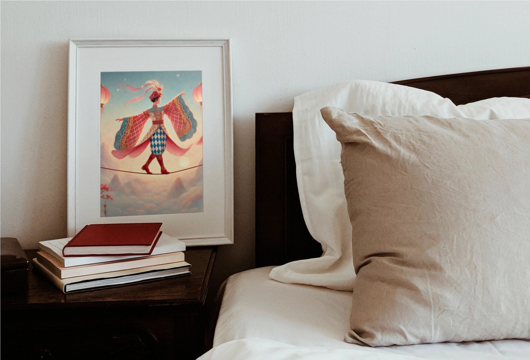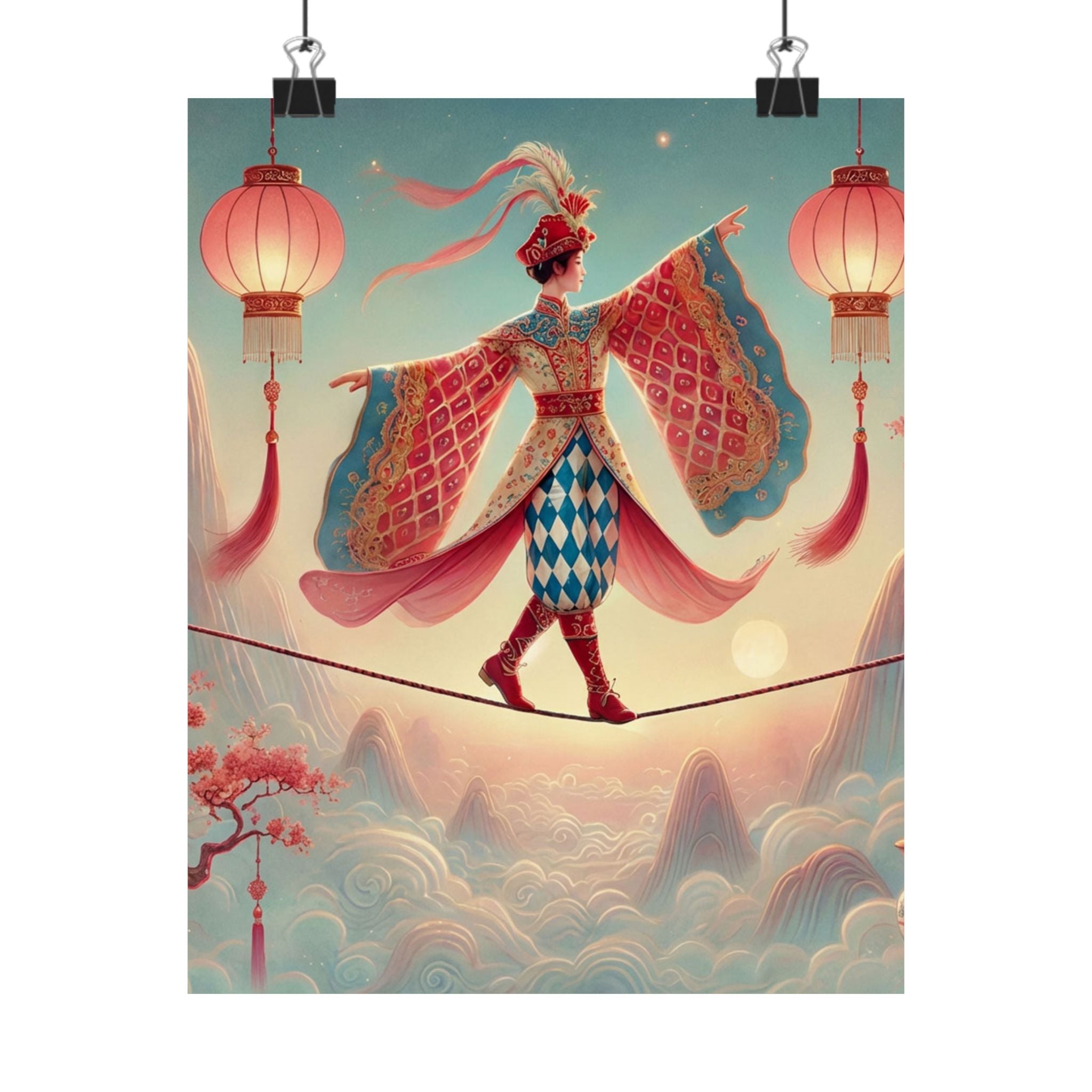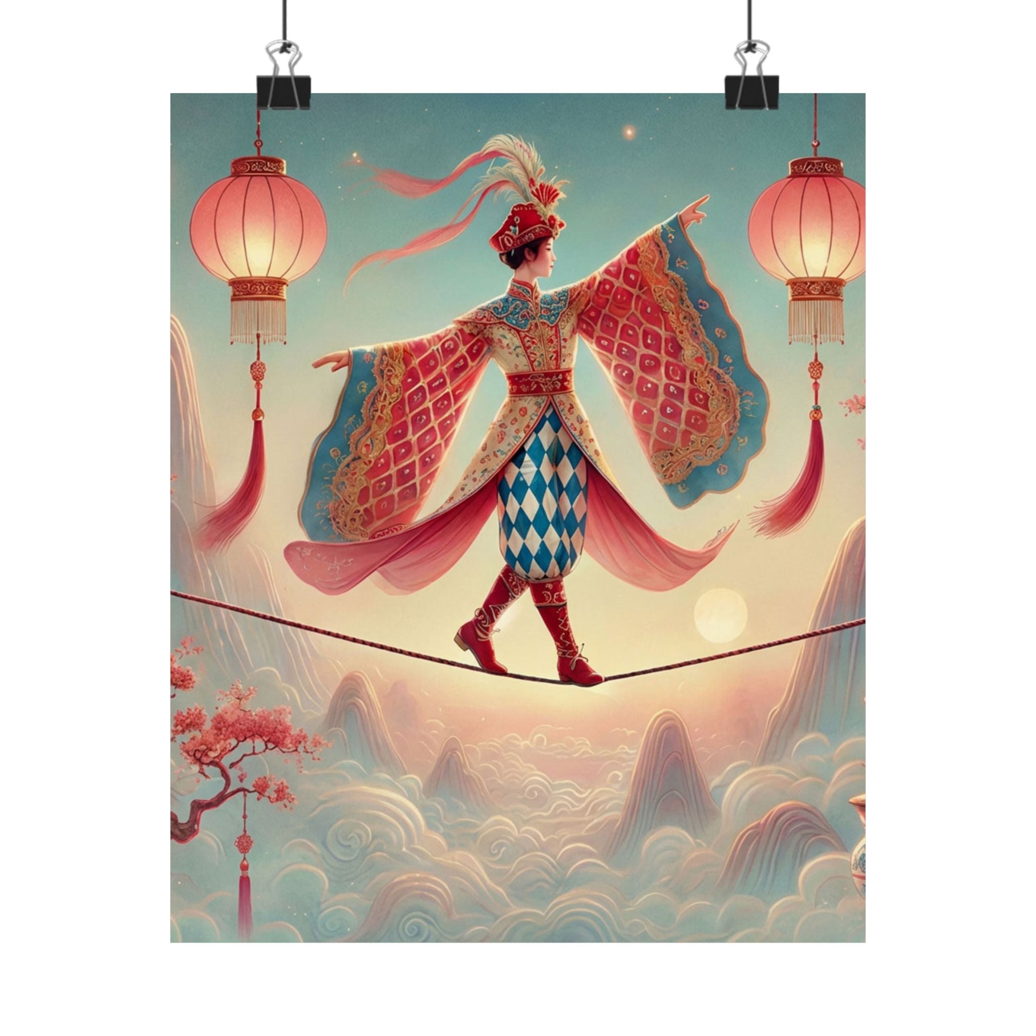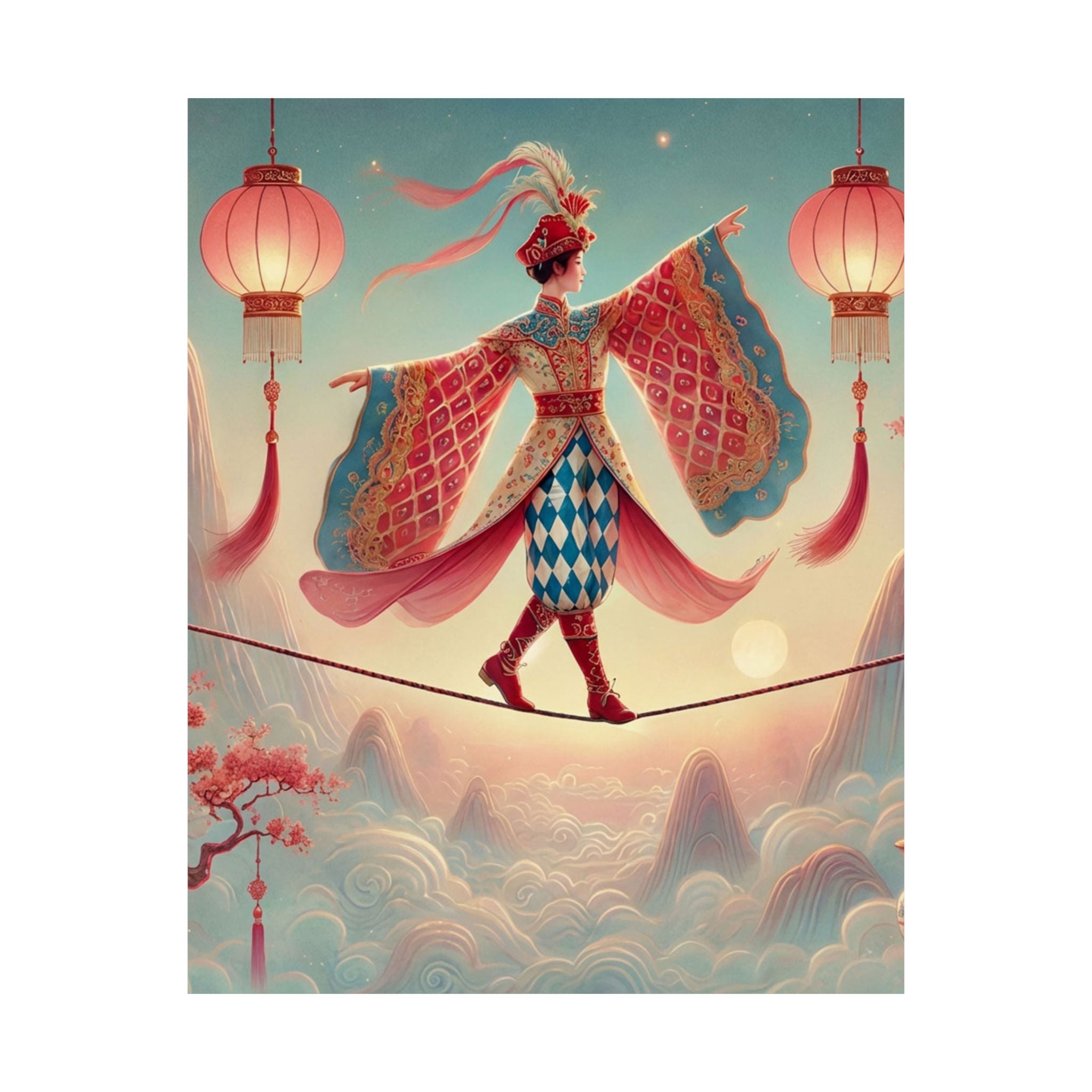 The Lantern Walker Matte Vertical Posters capture a serene, dreamlike moment as a graceful figure crosses a narrow rope suspended above drifting clouds, softly illuminated by hanging lanterns. Flowing garments and outstretched sleeves suggest balance and quiet motion, while misty mountains and blossoming branches create a calm, fantastical backdrop. Drawing on classical East Asian motifs, the composition evokes focus, poise, and gentle elegance—like a whispered reminder to move carefully, beautifully, and with intention.