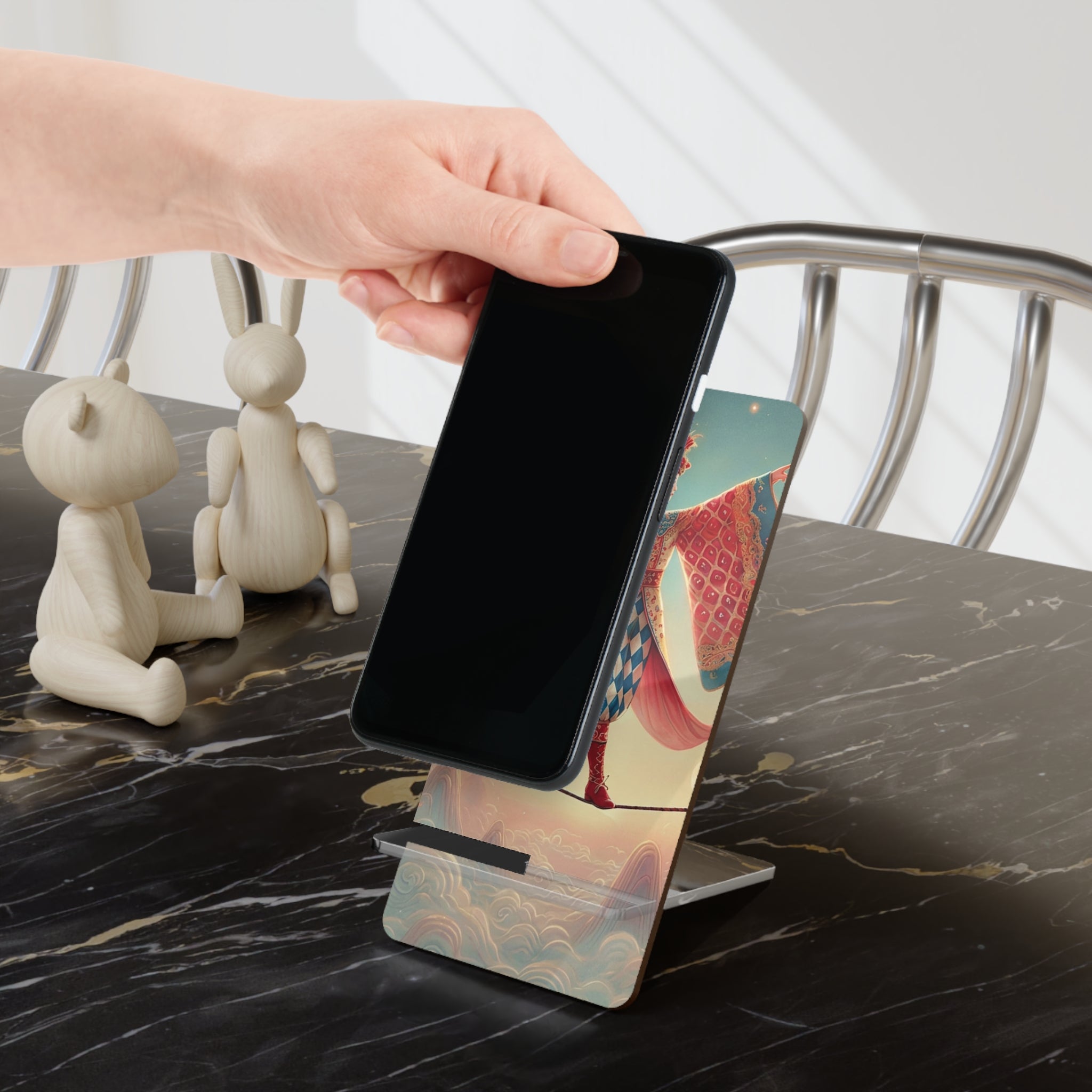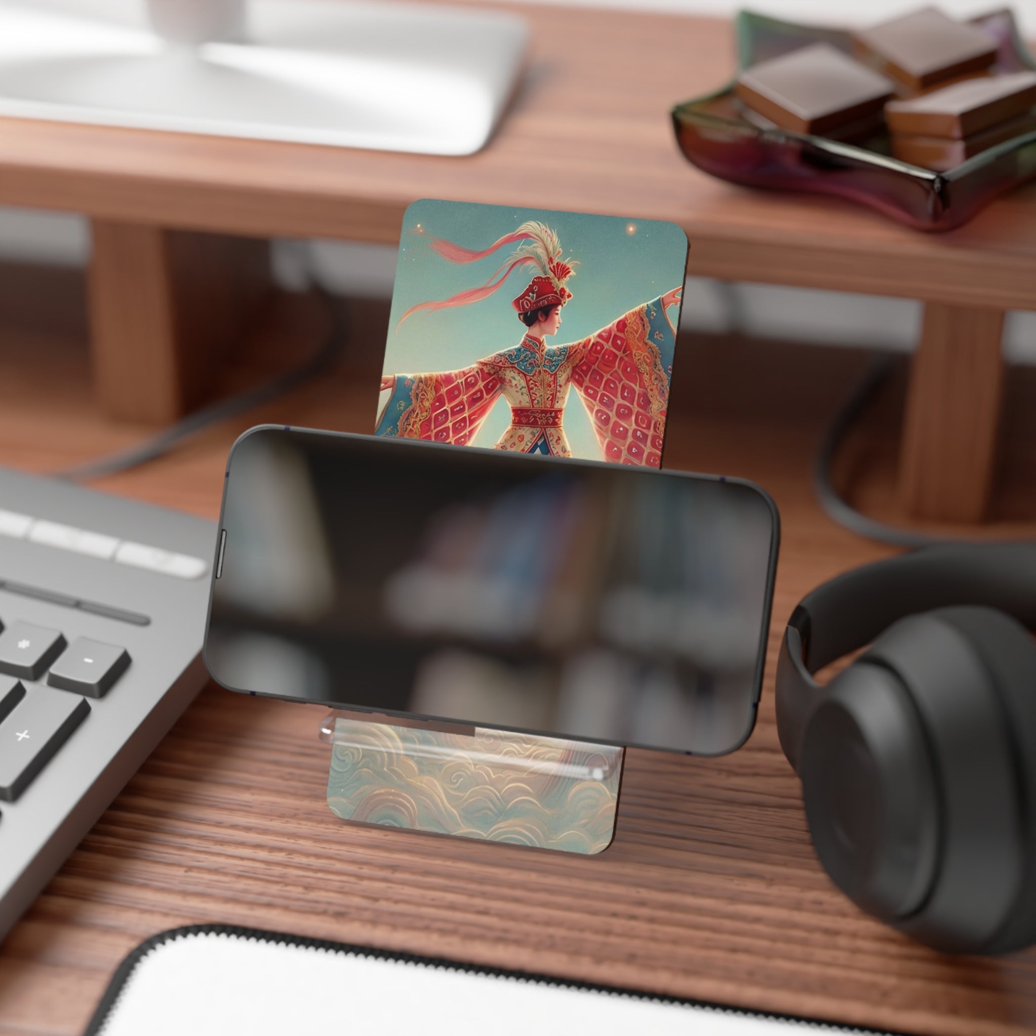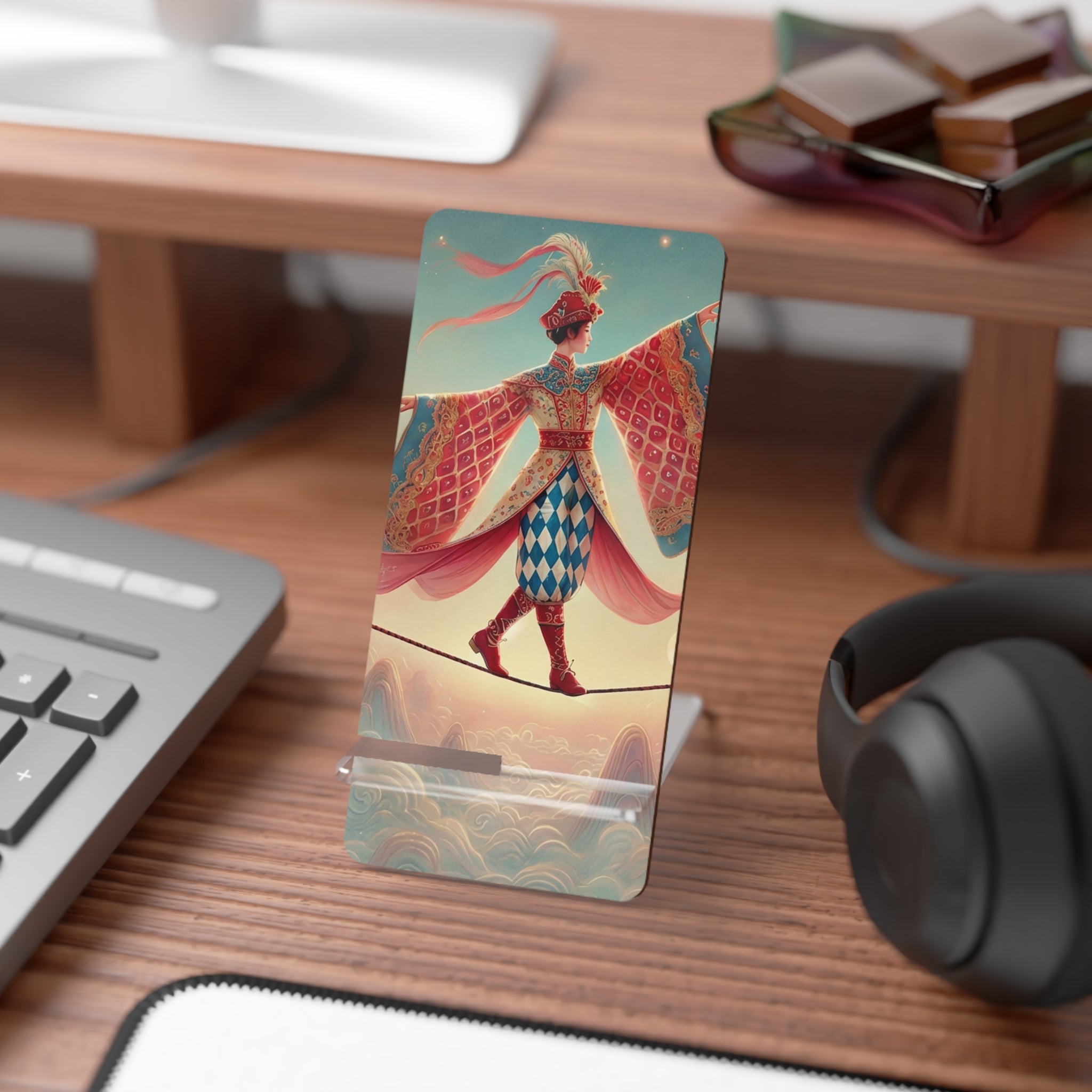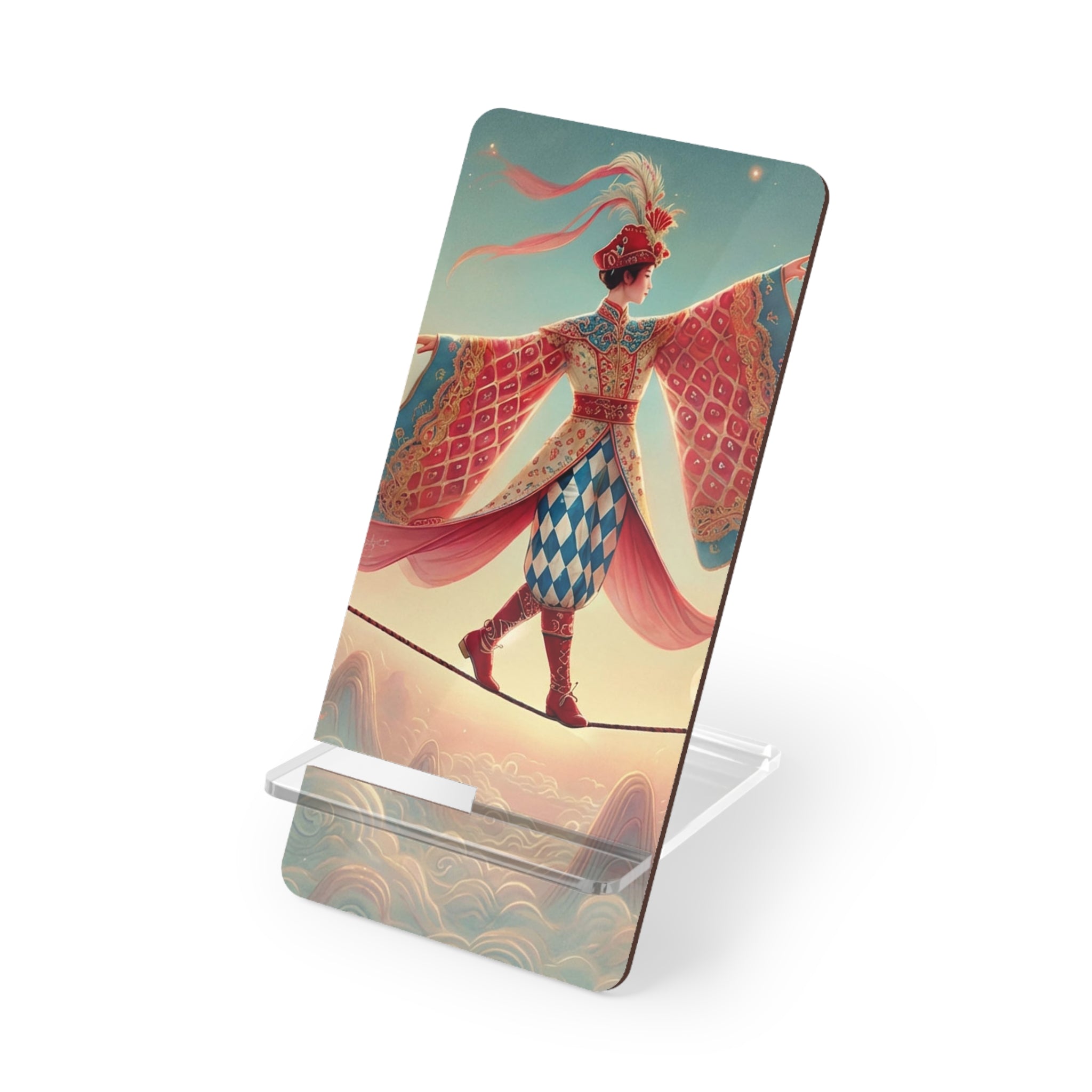 The glossy, one-sided print showcases a serene, dreamlike illustration of a graceful figure crossing a narrow rope suspended above drifting clouds, softly illuminated by hanging lanterns. Flowing garments and outstretched sleeves suggest balance and quiet motion, while misty mountains and blossoming branches create a calm, fantastical backdrop. Inspired by classical East Asian motifs, the artwork evokes focus, poise, and gentle elegance—turning a simple phone stand into a small piece of visual meditation.