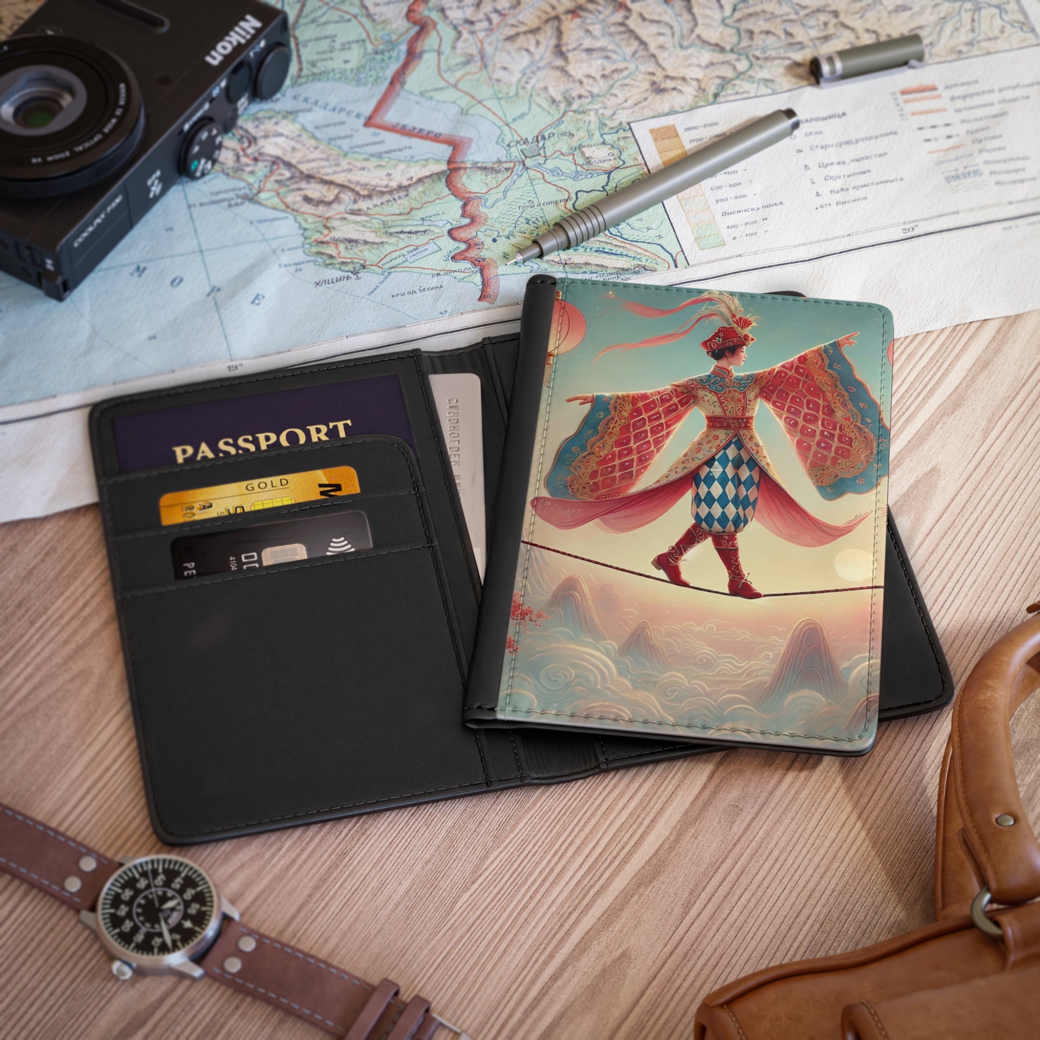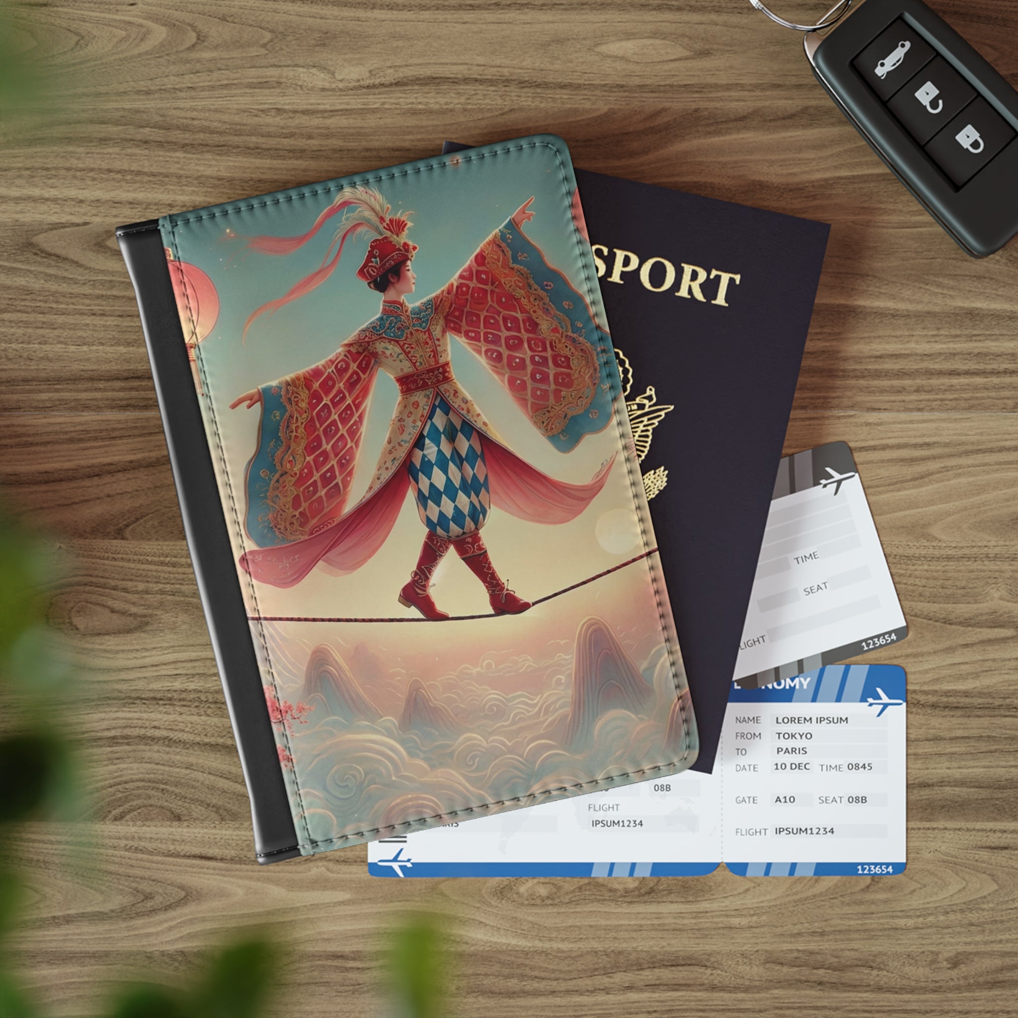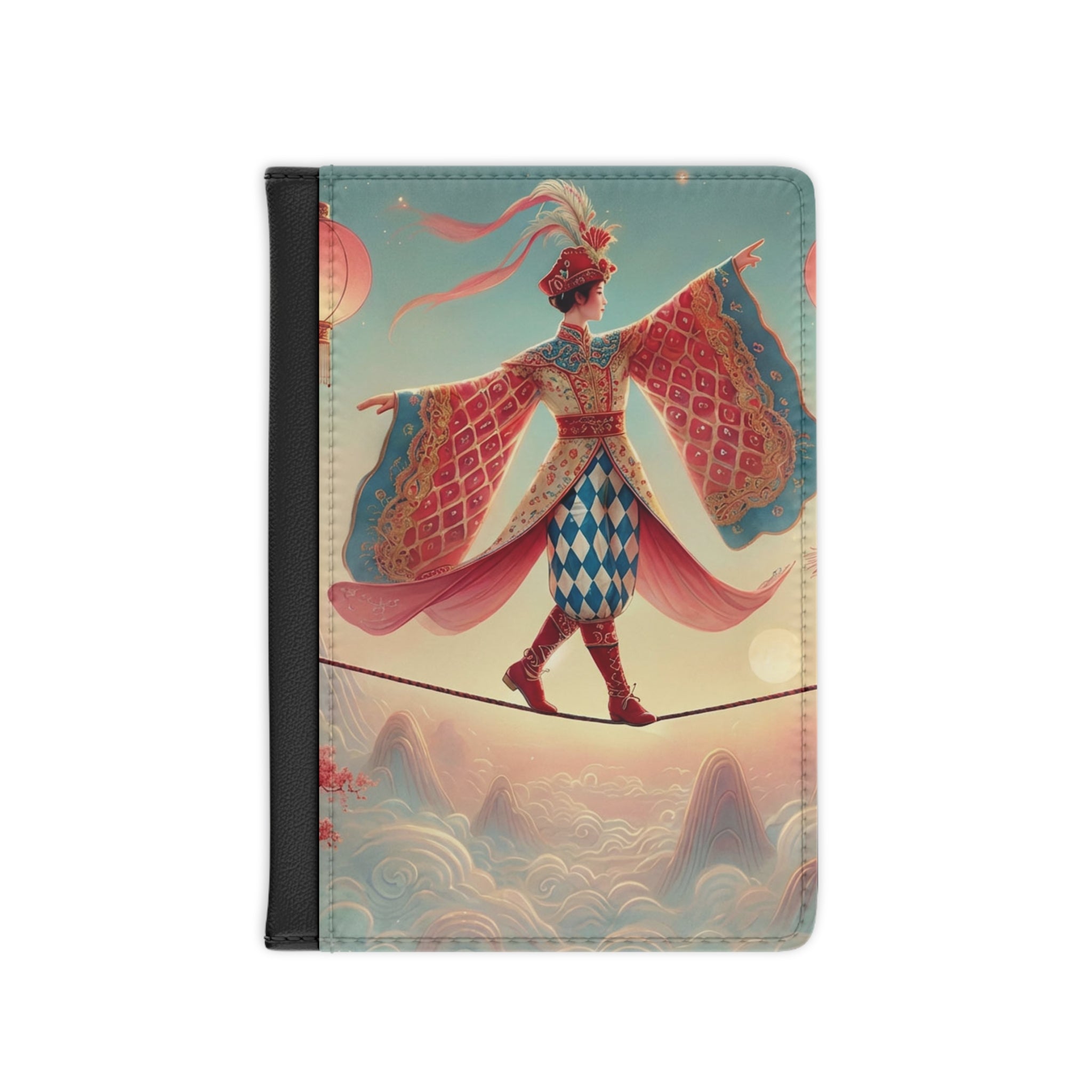 The front cover features a serene, dreamlike illustration of a graceful figure crossing a narrow rope suspended above drifting clouds, softly illuminated by hanging lanterns. Flowing garments and outstretched sleeves convey balance and quiet motion, while misty mountains and blossoming branches form a calm, fantastical backdrop. Inspired by classical East Asian motifs, the artwork evokes focus, poise, and gentle elegance, transforming a travel essential into a portable piece of art. Please note that slight fading may occur along the edges for solid or darker colors.