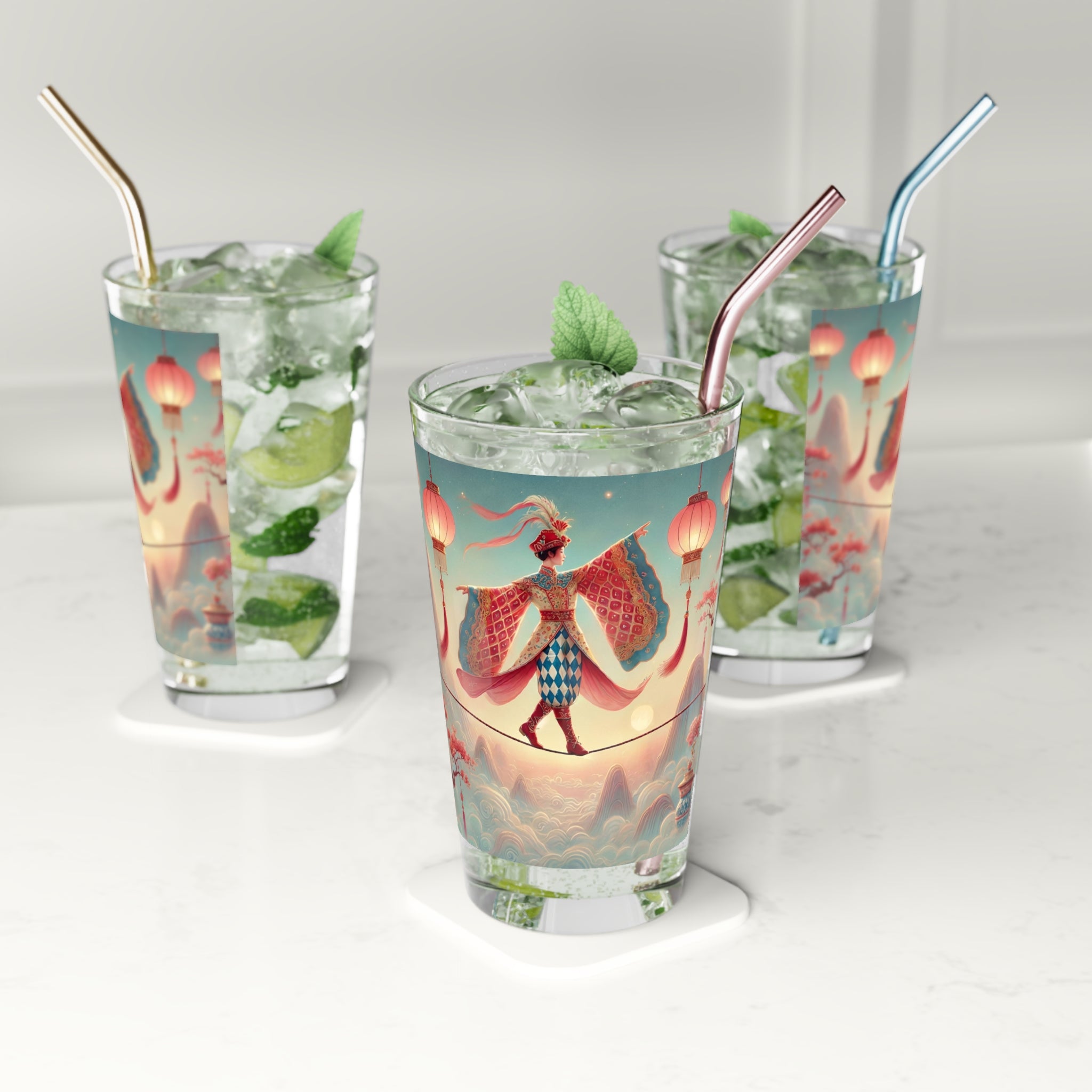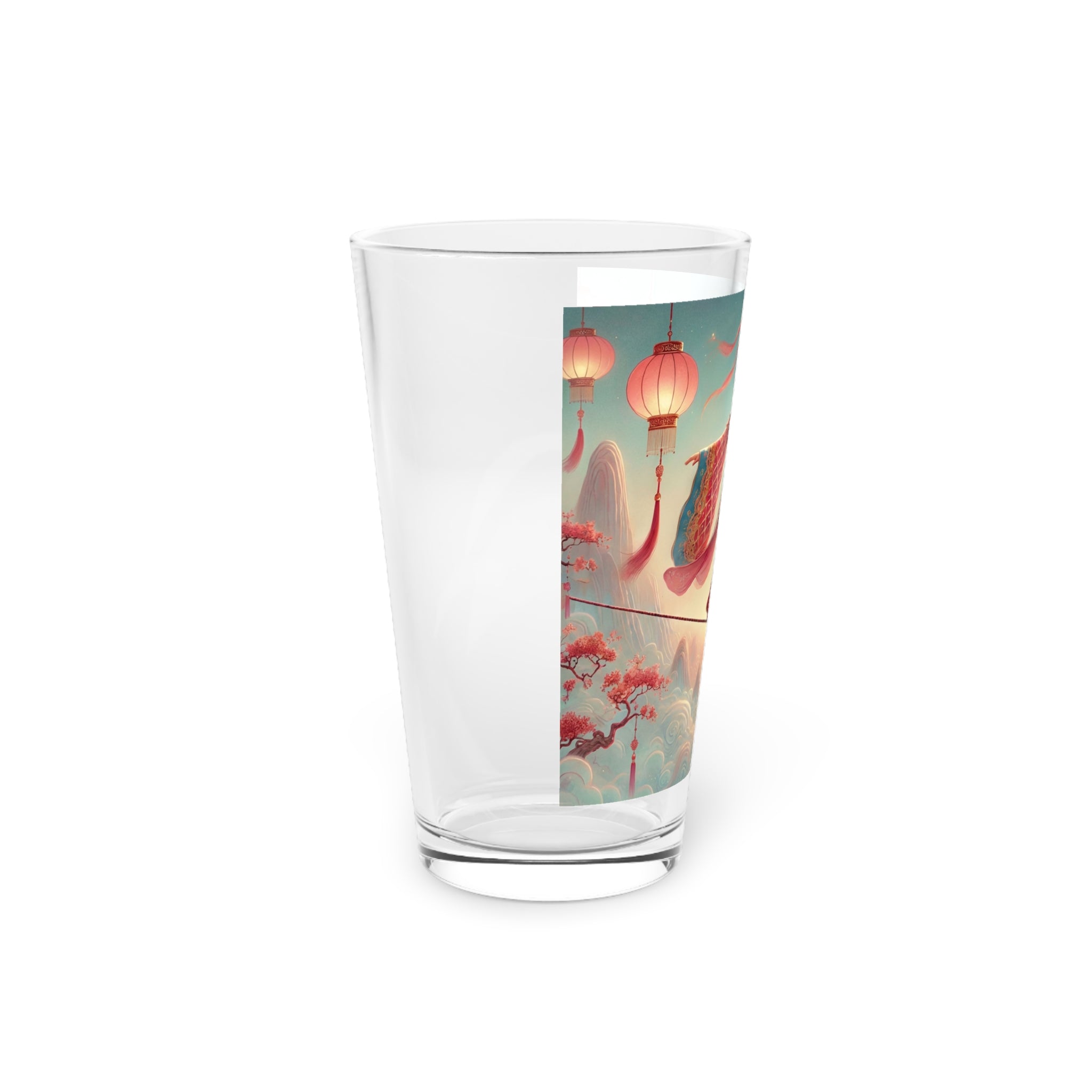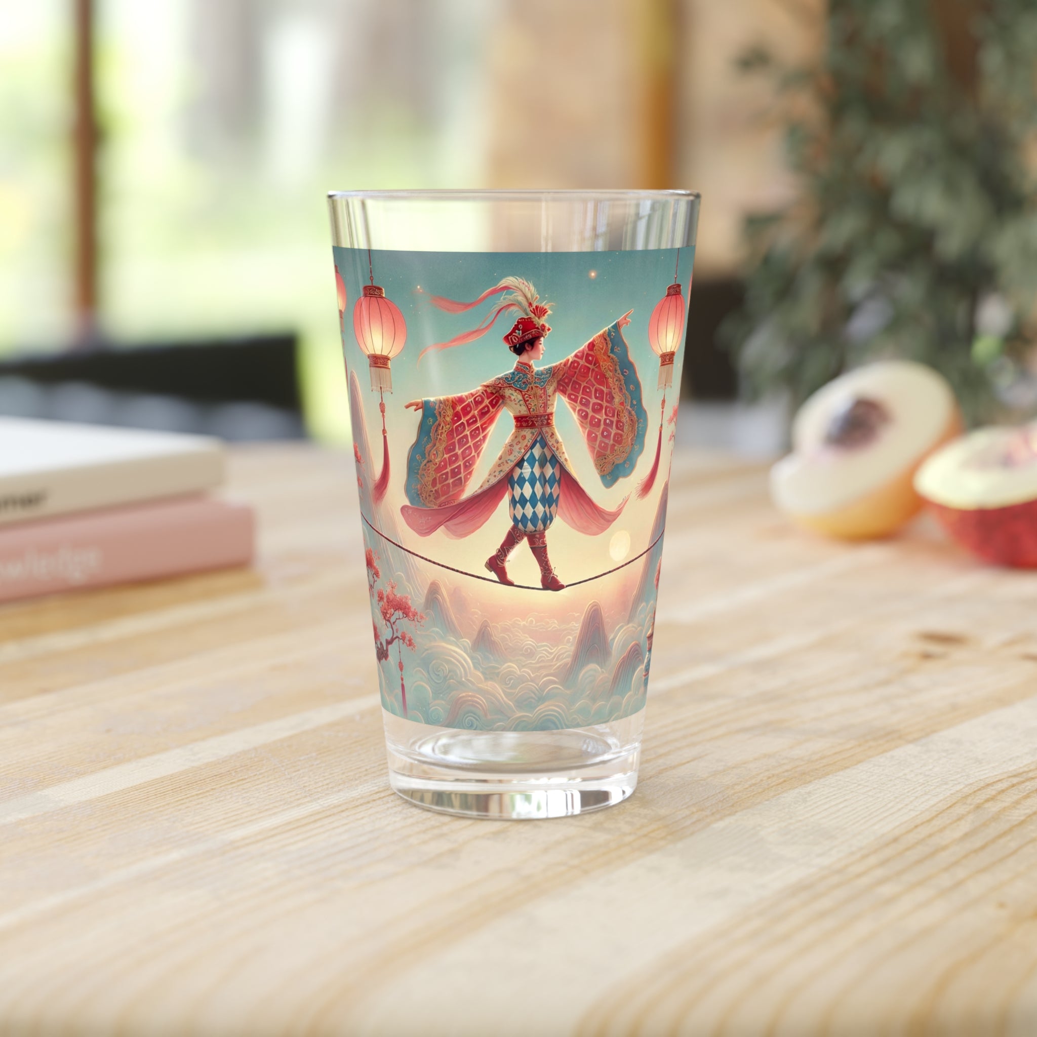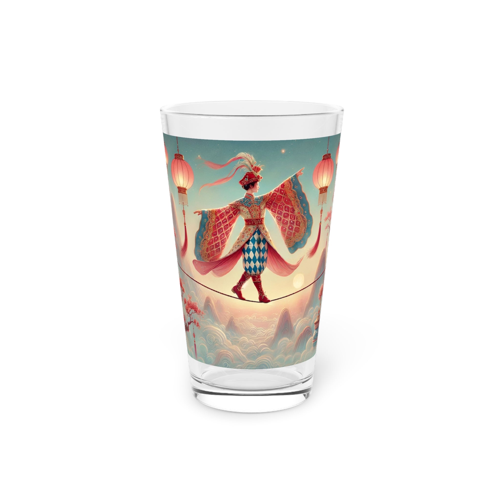Printed directly onto the glass, the artwork reveals a serene, dreamlike scene of a graceful figure crossing a narrow rope suspended above drifting clouds, softly illuminated by hanging lanterns. Flowing garments and outstretched sleeves suggest balance and quiet motion, while misty mountains and blossoming branches create a calm, fantastical atmosphere. Inspired by classical East Asian motifs, the illustration evokes focus, poise, and gentle elegance. Due to the digital inkjet printing process, faint horizontal lines may be visible on the final product, a natural characteristic of this technique.