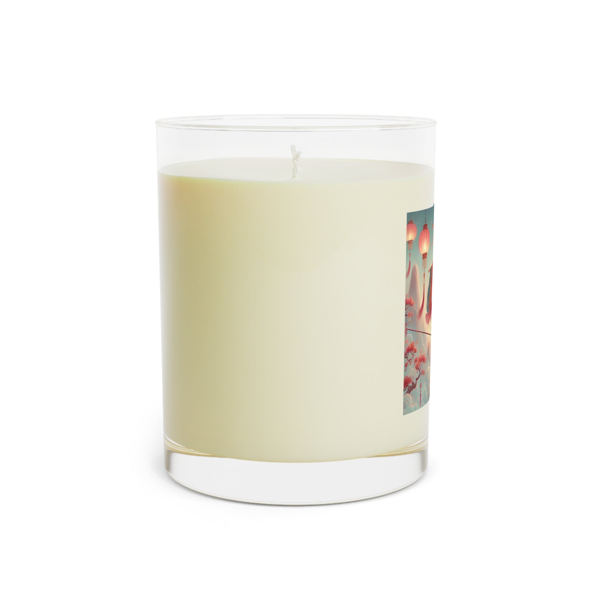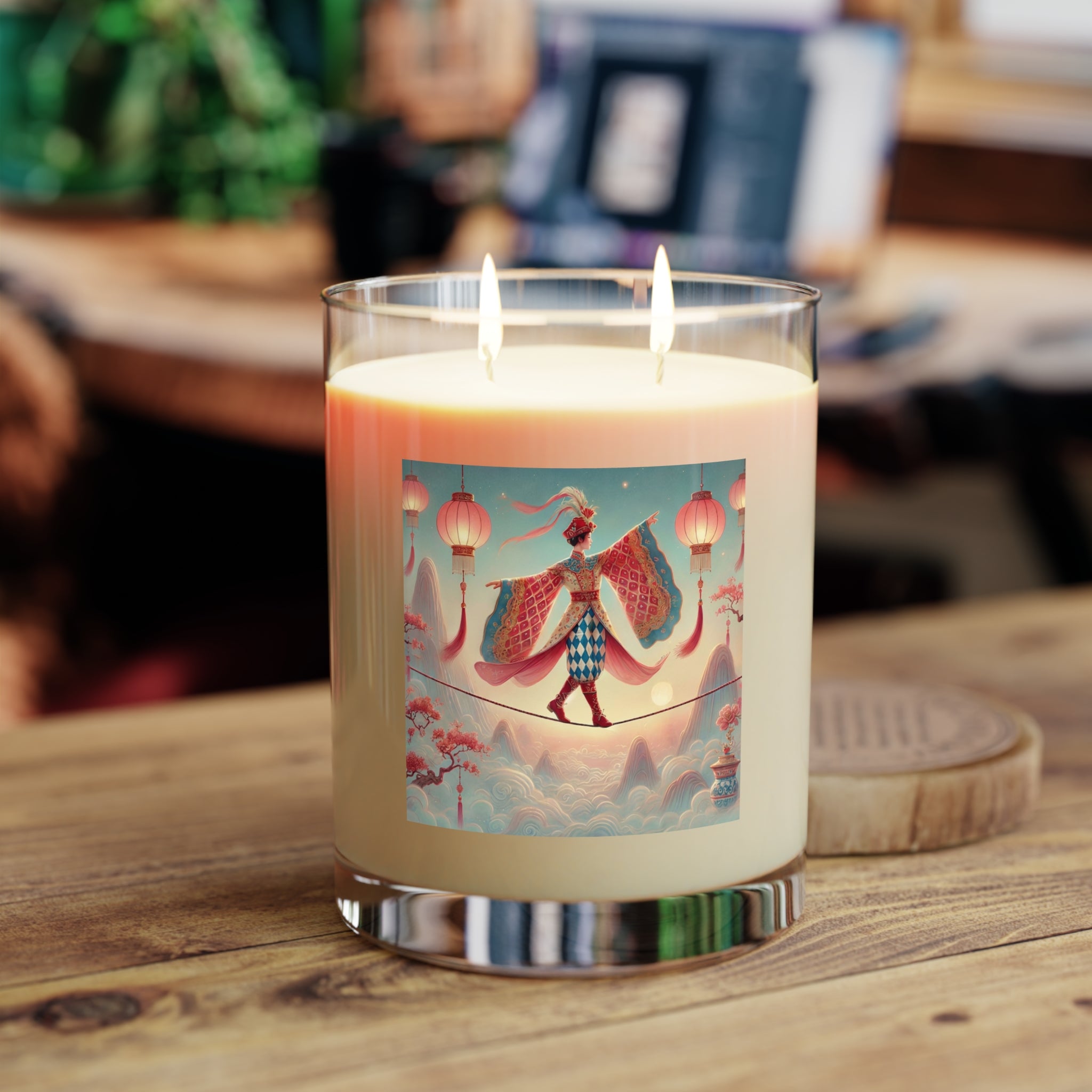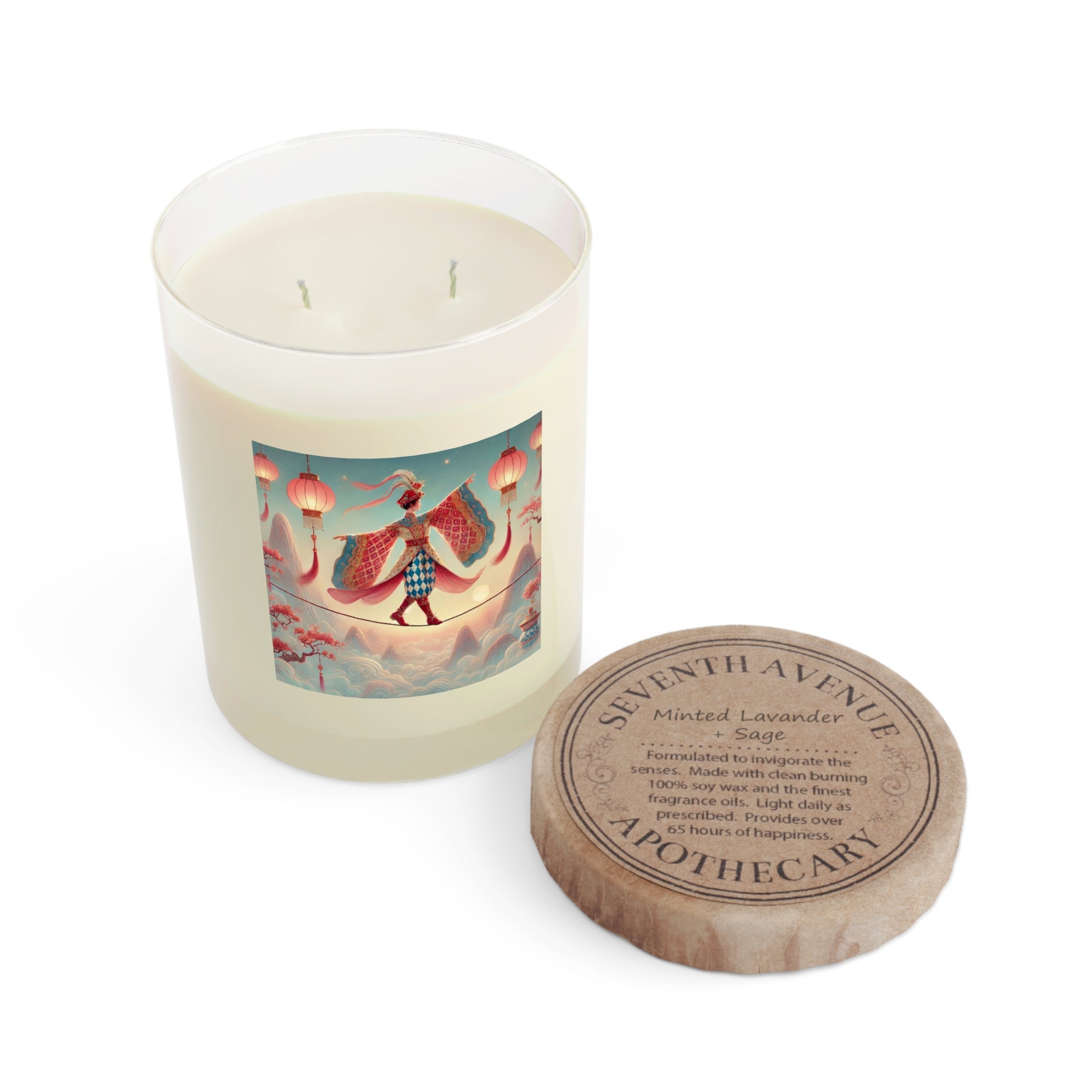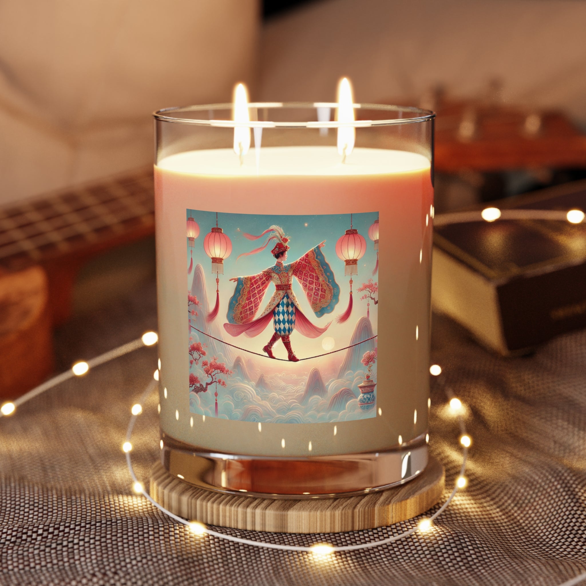 The candle features a dreamlike scene of a graceful figure crossing a narrow rope suspended above drifting clouds, softly illuminated by hanging lanterns. Flowing garments and outstretched sleeves suggest balance and quiet motion, while misty mountains and blossoming branches create a calm, fantastical backdrop. Inspired by classical East Asian aesthetics, the artwork evokes focus, poise, and gentle contemplation—perfectly complementing moments of rest and reflection.