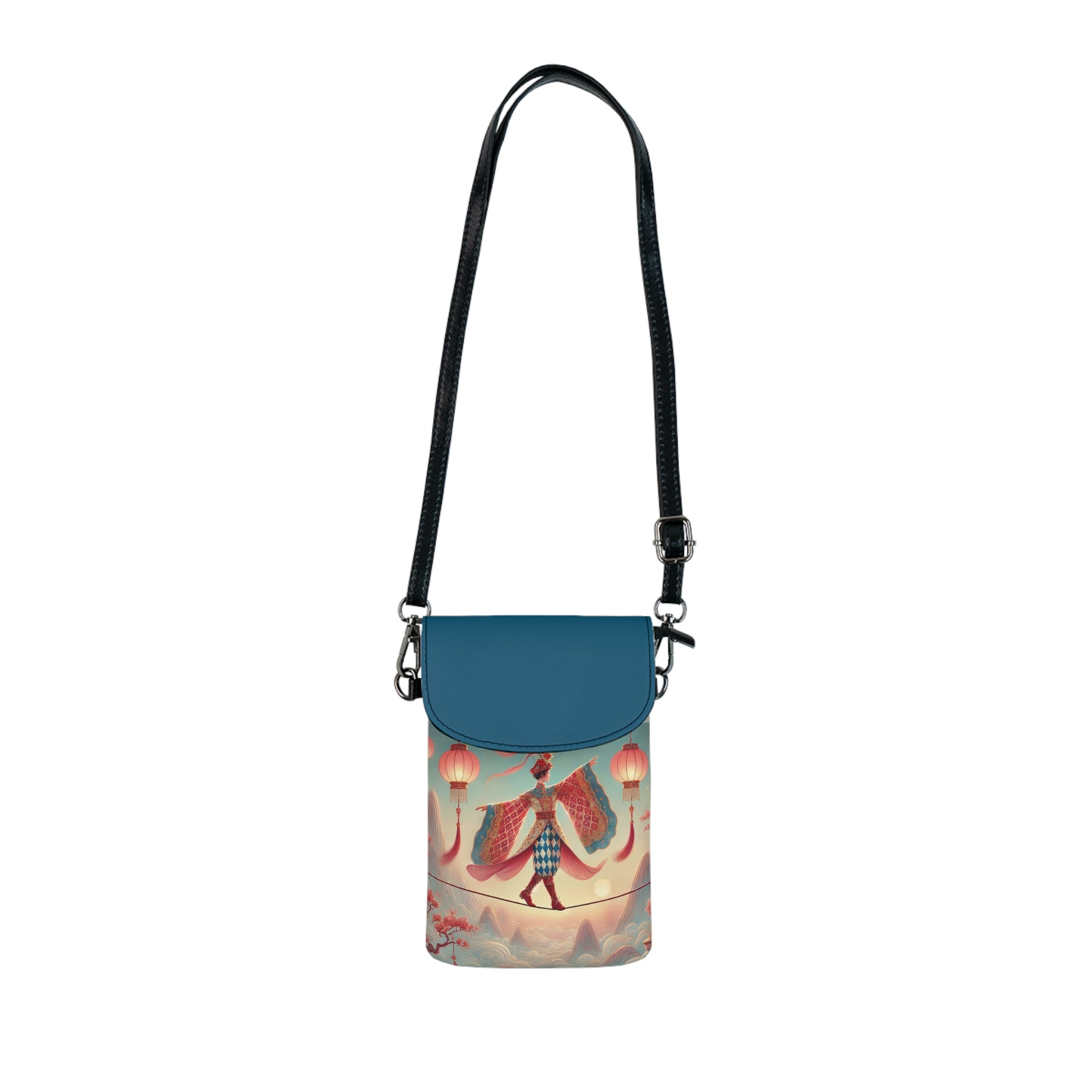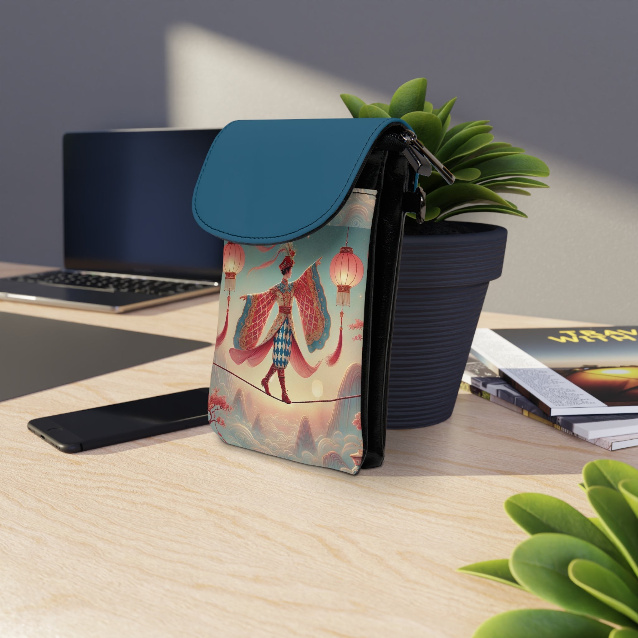 The front of the wallet is adorned with a serene, dreamlike illustration of a graceful figure crossing a narrow rope suspended above drifting clouds, softly illuminated by hanging lanterns. Flowing garments and outstretched sleeves convey balance and quiet motion, while misty mountains and blossoming branches create a calm, fantastical atmosphere. Inspired by classical East Asian motifs, the artwork evokes focus, poise, and gentle elegance, transforming a practical accessory into a wearable piece of art.