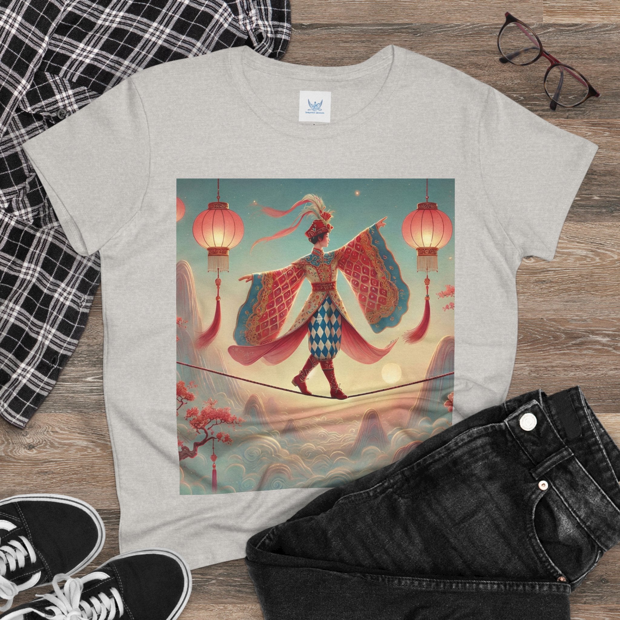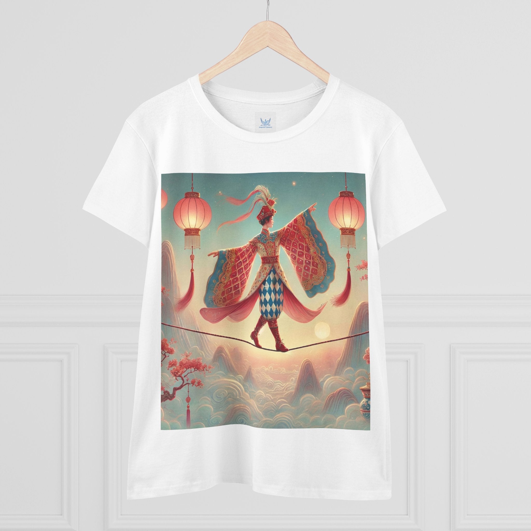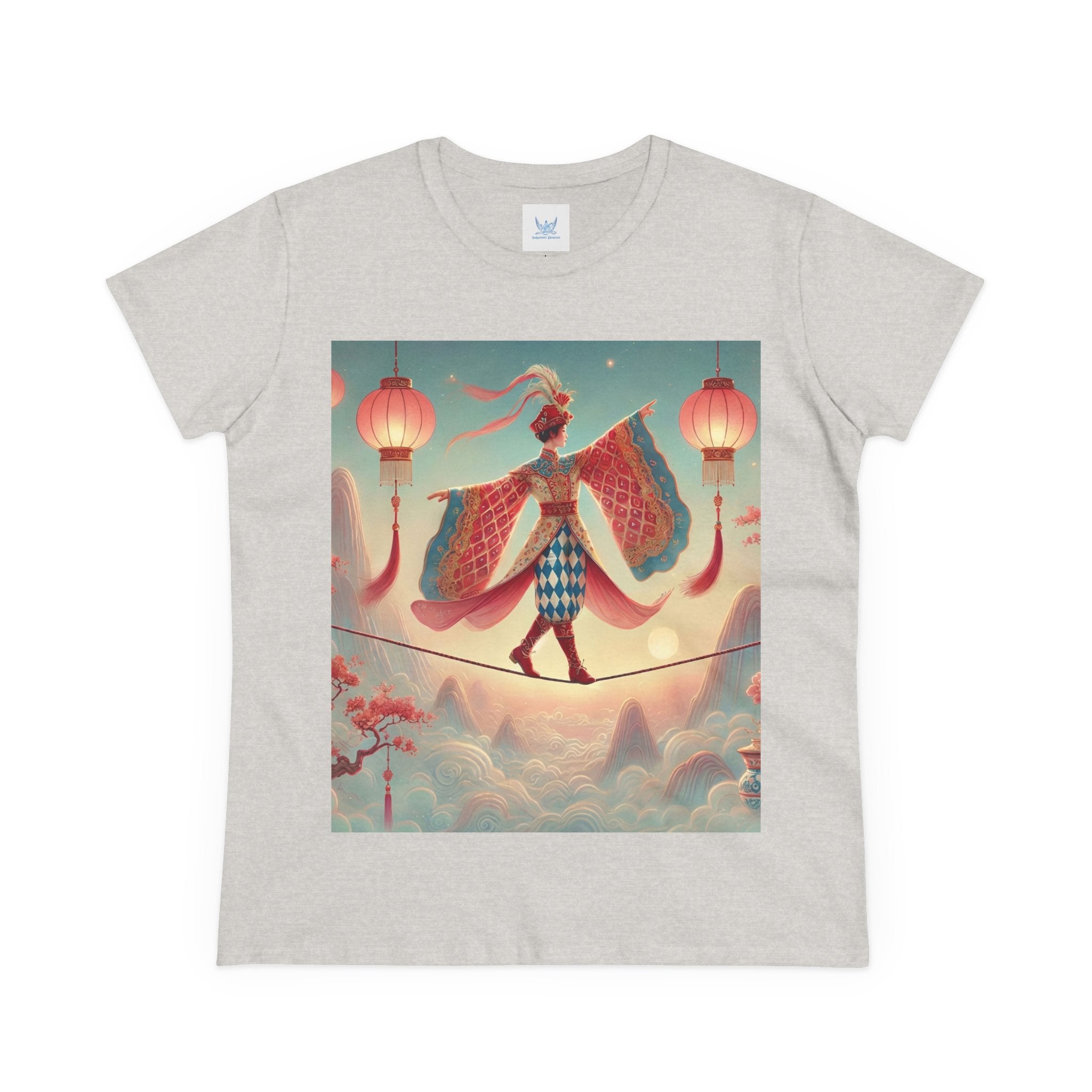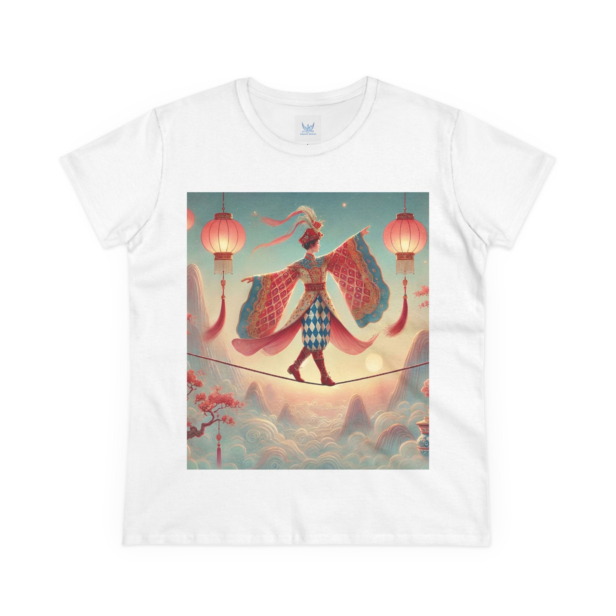 The artwork printed on the tee reveals a serene, dreamlike scene of a graceful figure crossing a narrow rope suspended above drifting clouds, softly illuminated by hanging lanterns. Flowing garments and outstretched sleeves convey balance and quiet motion, while misty mountains and blossoming branches form a calm, fantastical backdrop. Inspired by classical East Asian motifs, the illustration evokes focus, poise, and gentle elegance, turning a casual tee into wearable art.