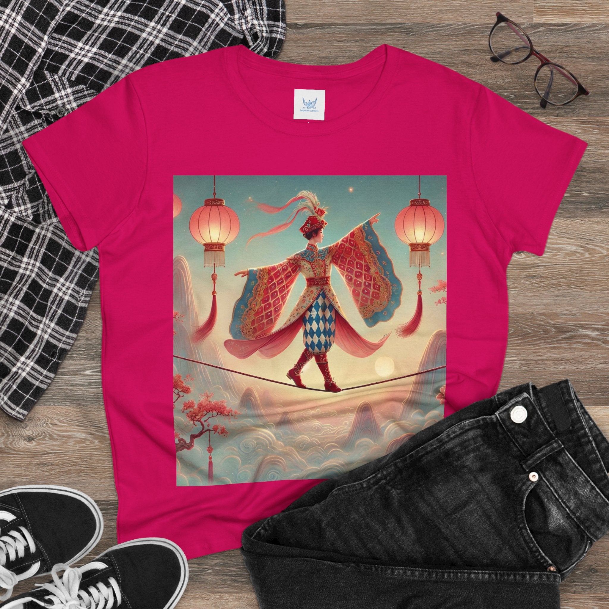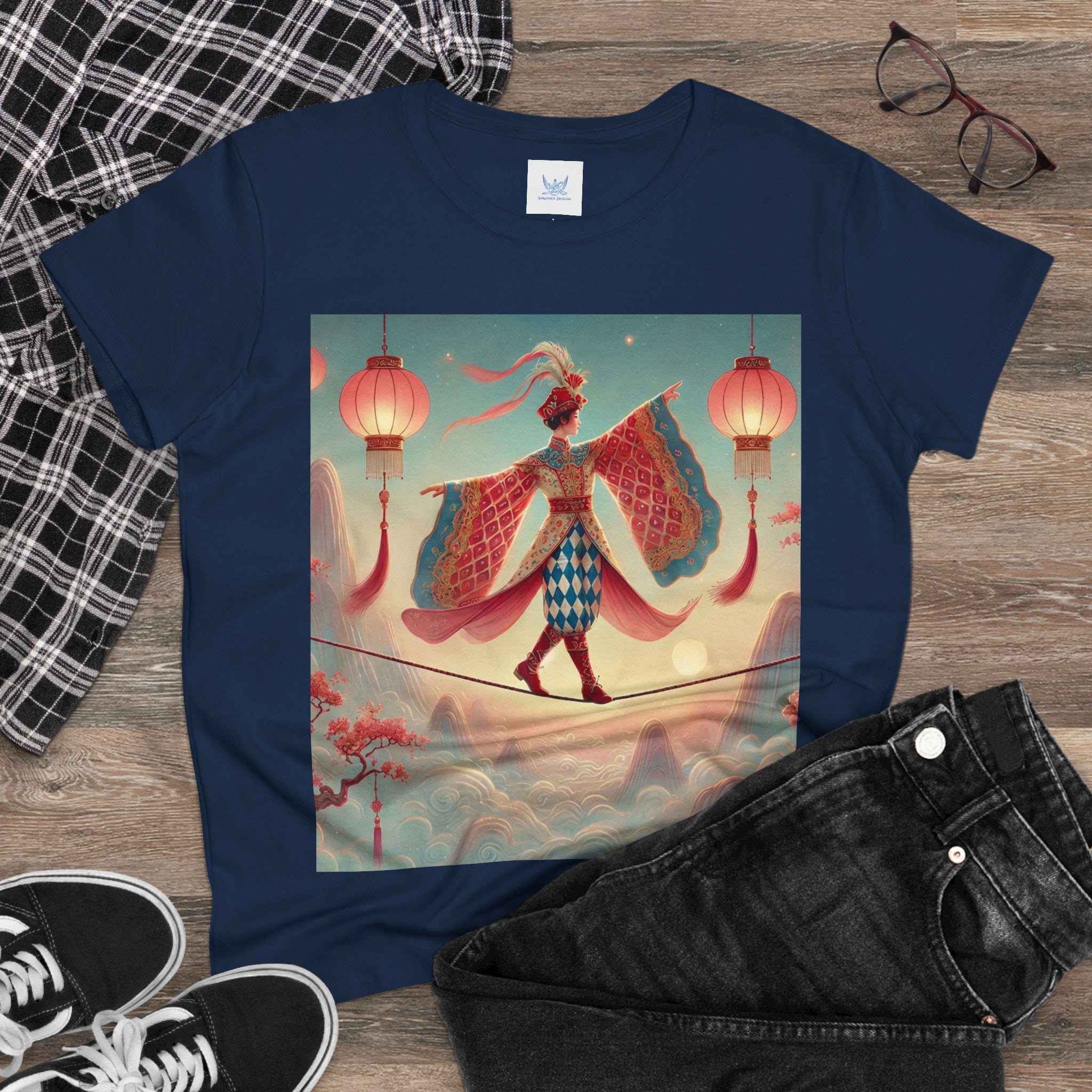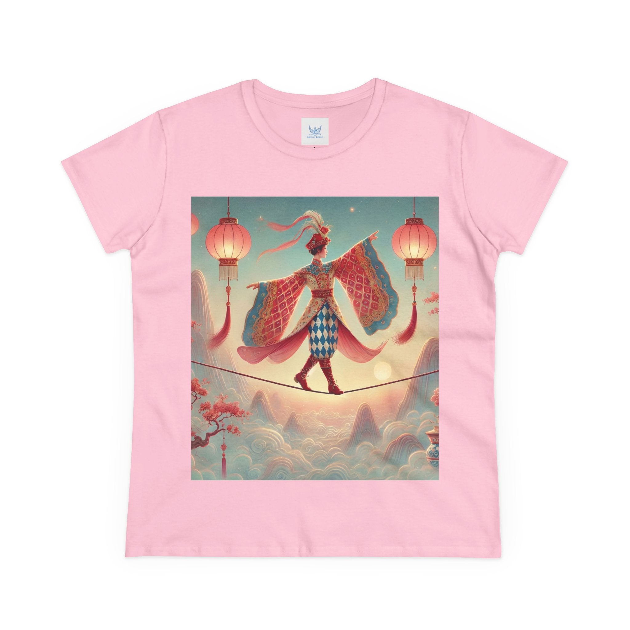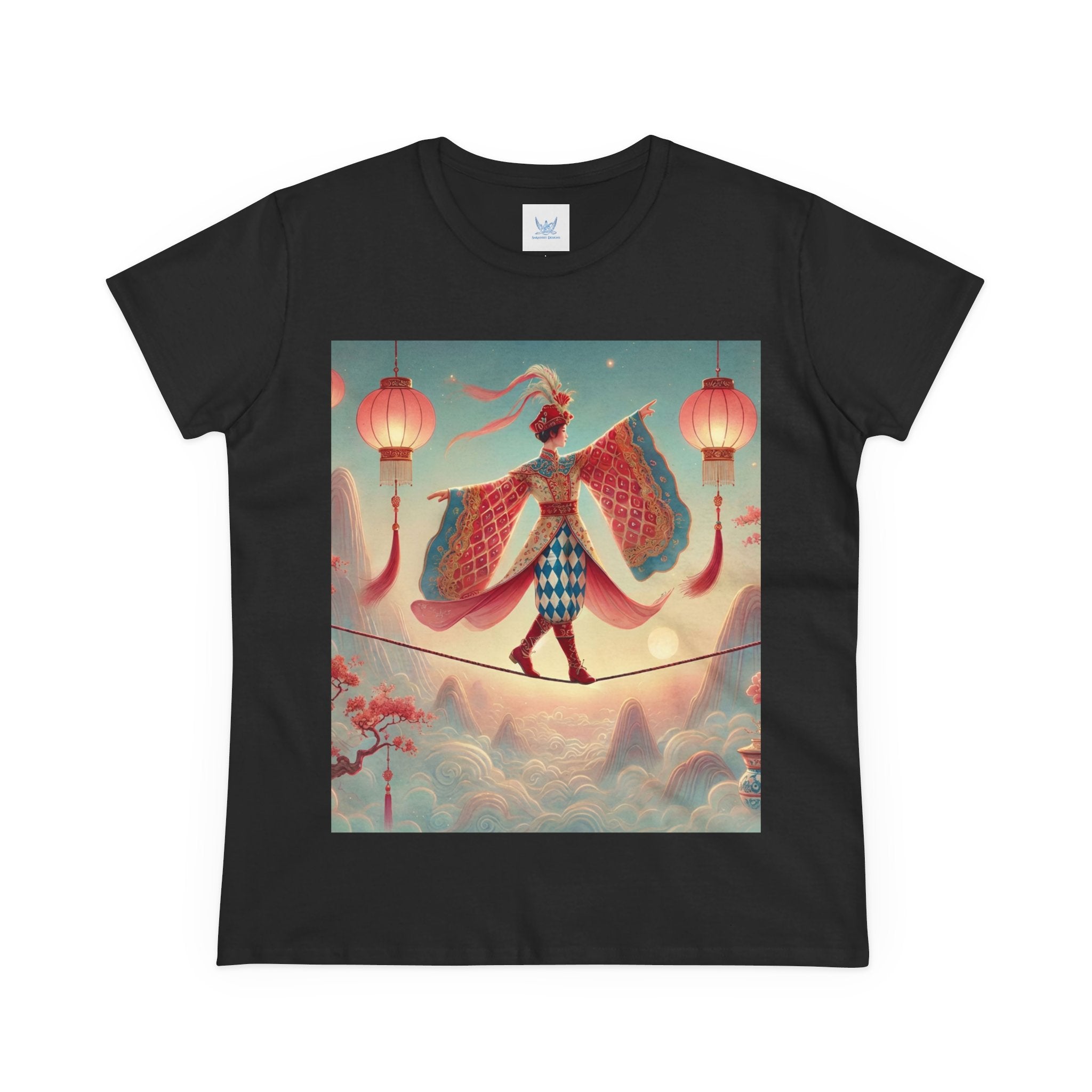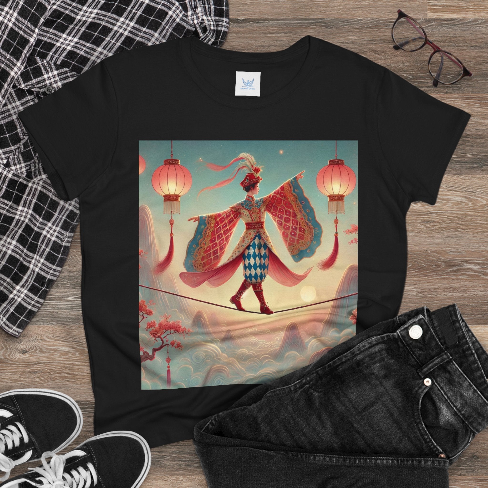 The artwork printed on the tee reveals a serene, dreamlike scene of a graceful figure crossing a narrow rope suspended above drifting clouds, softly illuminated by hanging lanterns. Flowing garments and outstretched sleeves convey balance and quiet motion, while misty mountains and blossoming branches form a calm, fantastical backdrop. Inspired by classical East Asian motifs, the illustration evokes focus, poise, and gentle elegance, turning a casual tee into wearable art.
