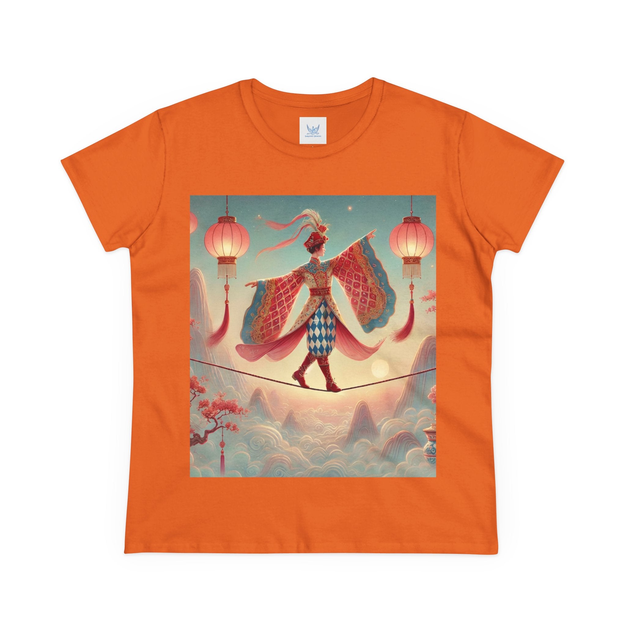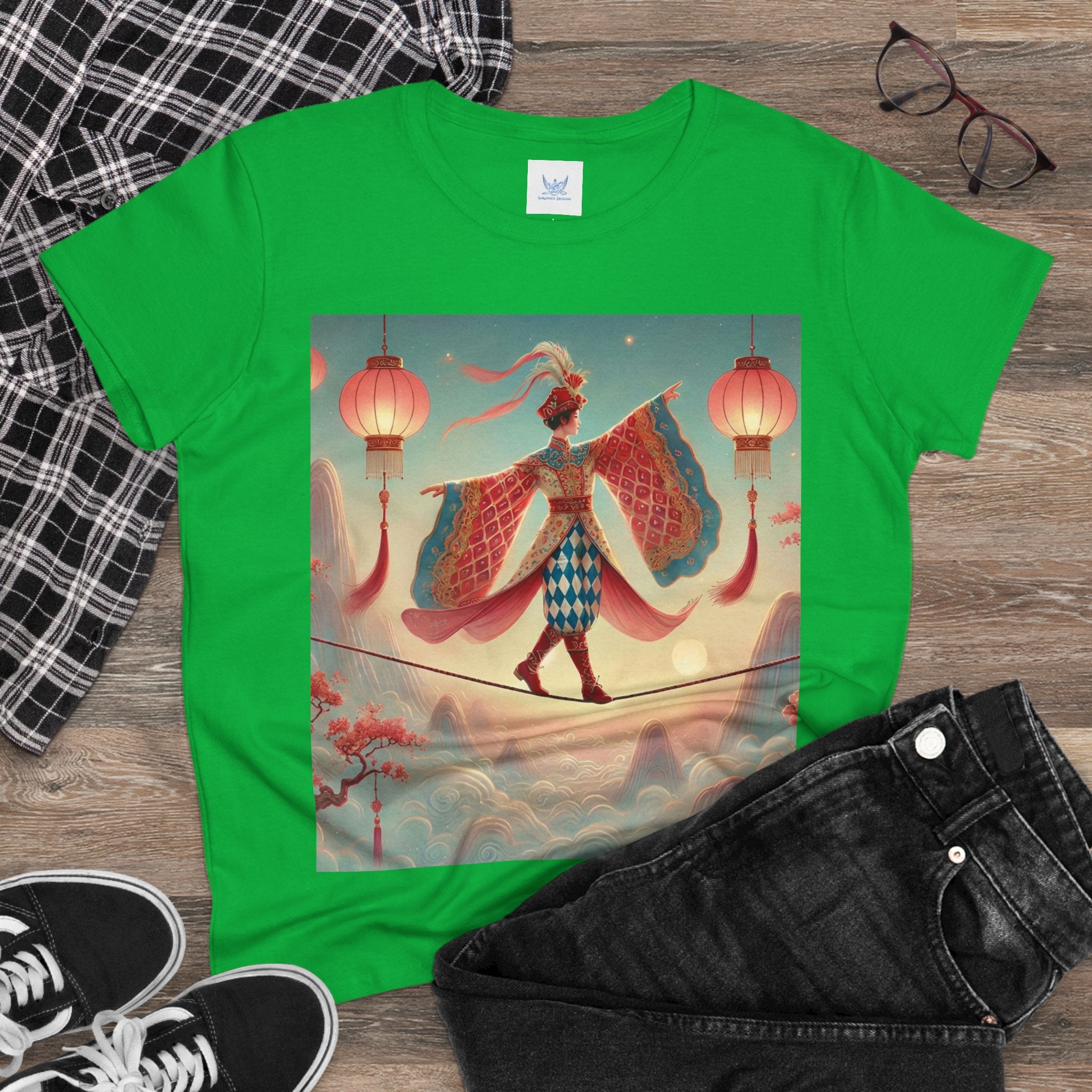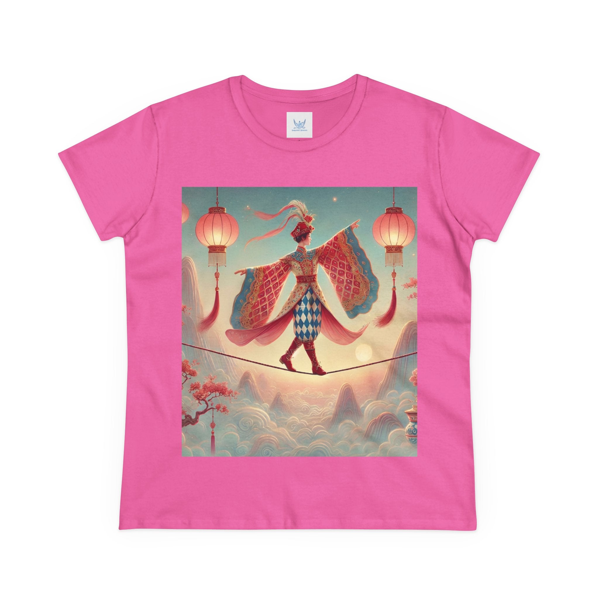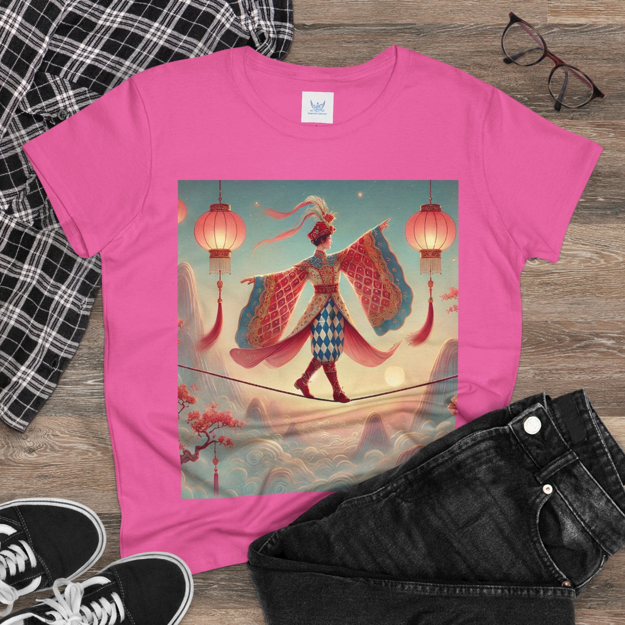 The artwork printed on the tee reveals a serene, dreamlike scene of a graceful figure crossing a narrow rope suspended above drifting clouds, softly illuminated by hanging lanterns. Flowing garments and outstretched sleeves convey balance and quiet motion, while misty mountains and blossoming branches form a calm, fantastical backdrop. Inspired by classical East Asian motifs, the illustration evokes focus, poise, and gentle elegance, turning a casual tee into wearable art.