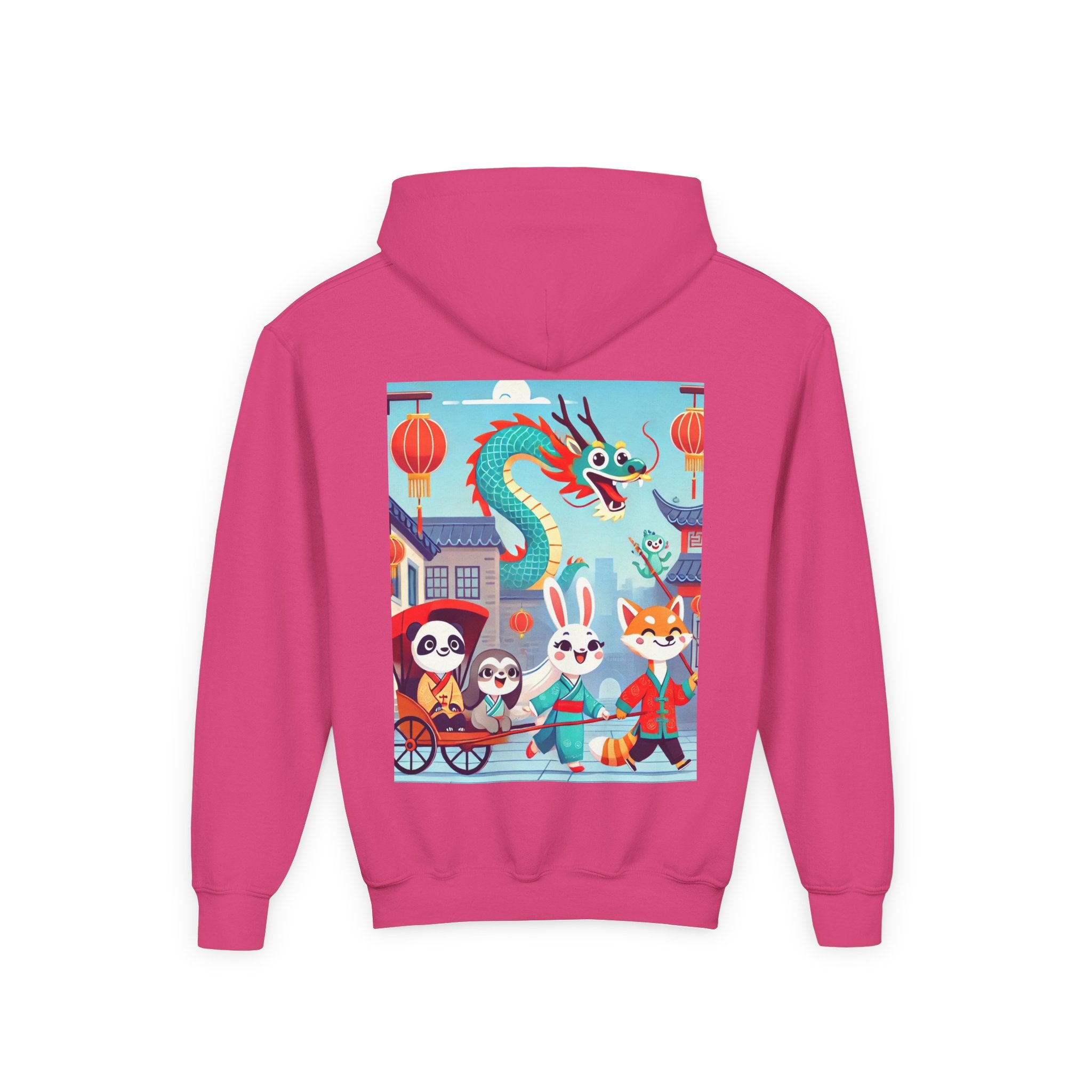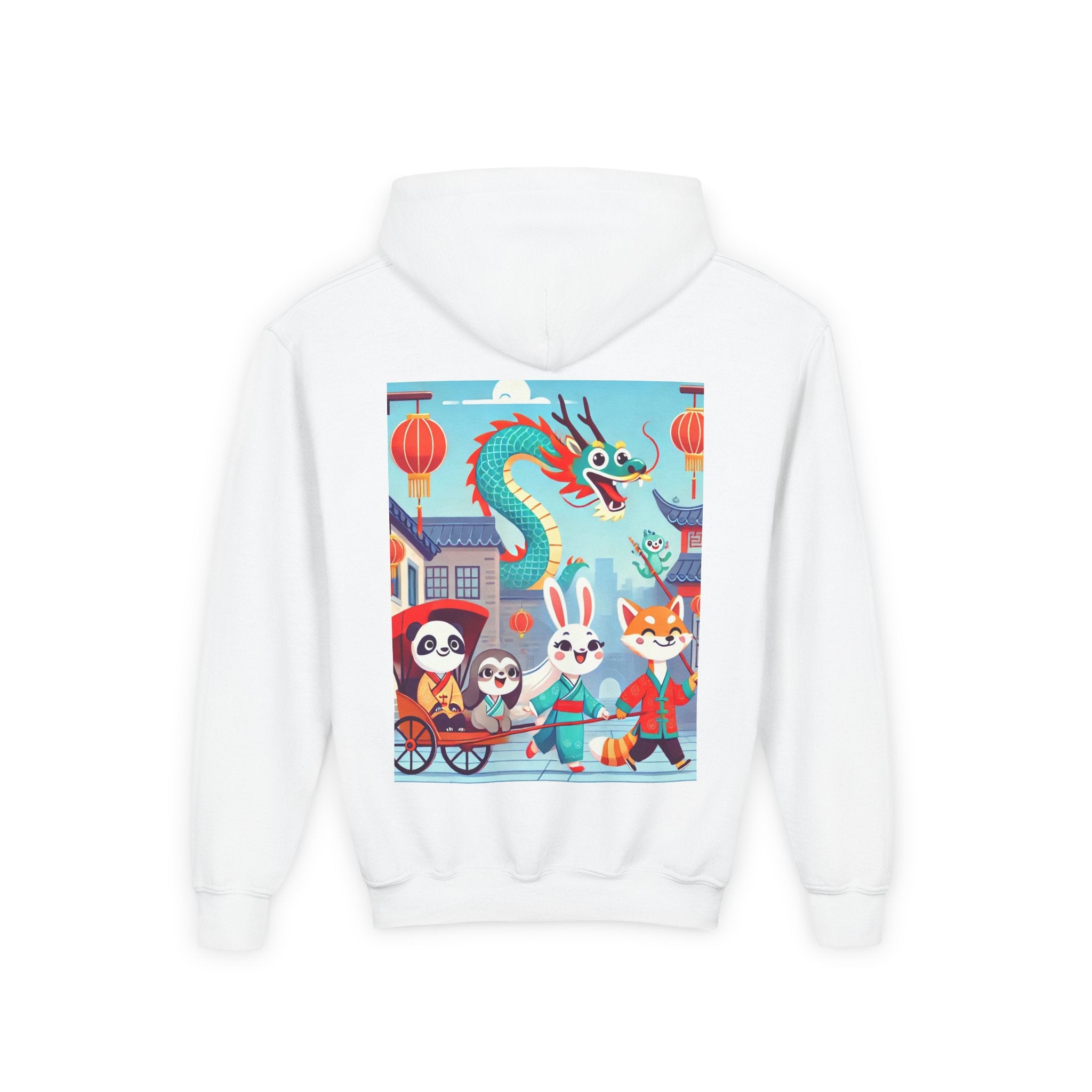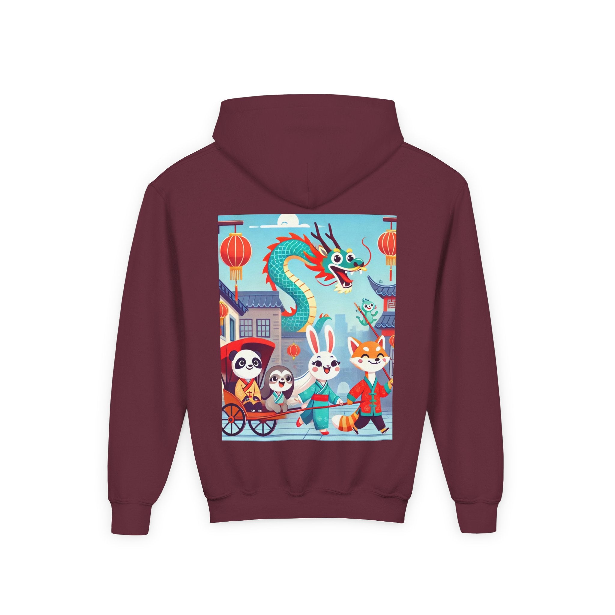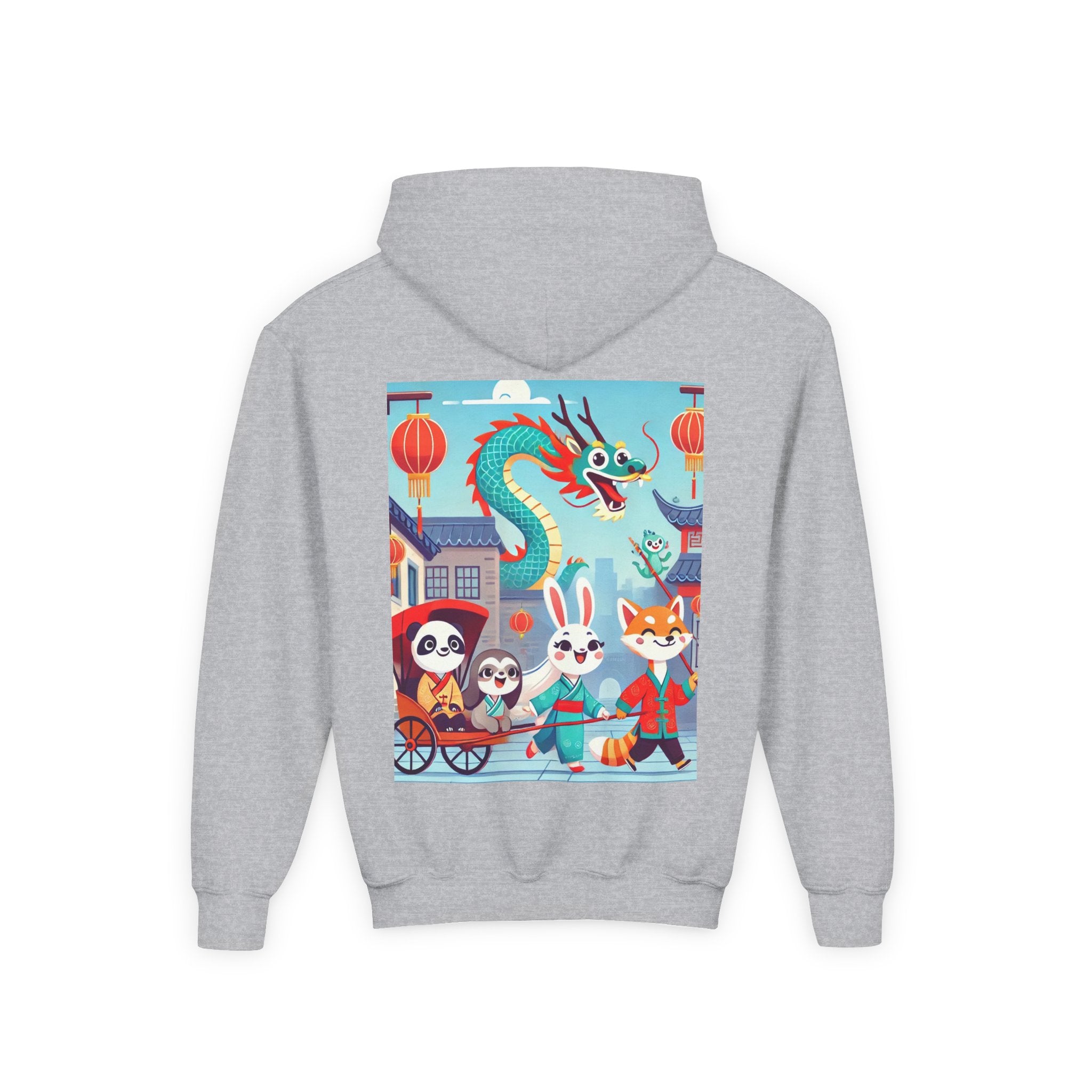 The Little Dragon and Friends Youth Heavy Blend Hooded Sweatshirt wraps kids in ultra-soft, preshrunk fleece while a bright storybook stroll unfolds across the design. The cozy medium-weight fabric feels wonderful against the skin and helps the cheerful scene stay front and center: a smiling dragon swoops overhead as a happy fox, rabbit, panda, and sloth wander through an ancient town in colorful traditional Hanfu. Tiled rooftops and curved eaves frame the path, soft clouds drift above, and glowing red lanterns add warm sparkle—capturing friendship, wonder, and the upbeat feeling of a day out together in clean, vibrant flat-art style.