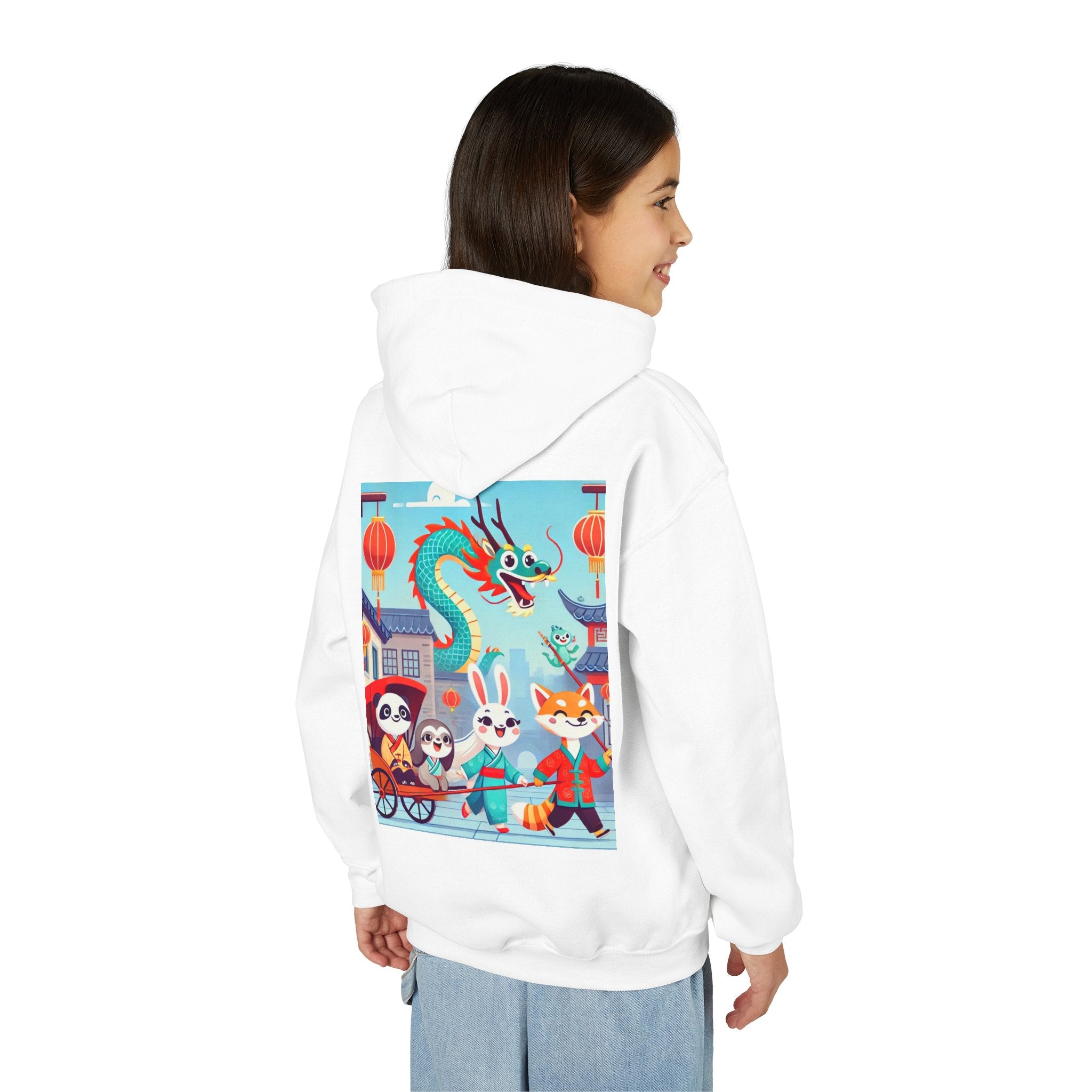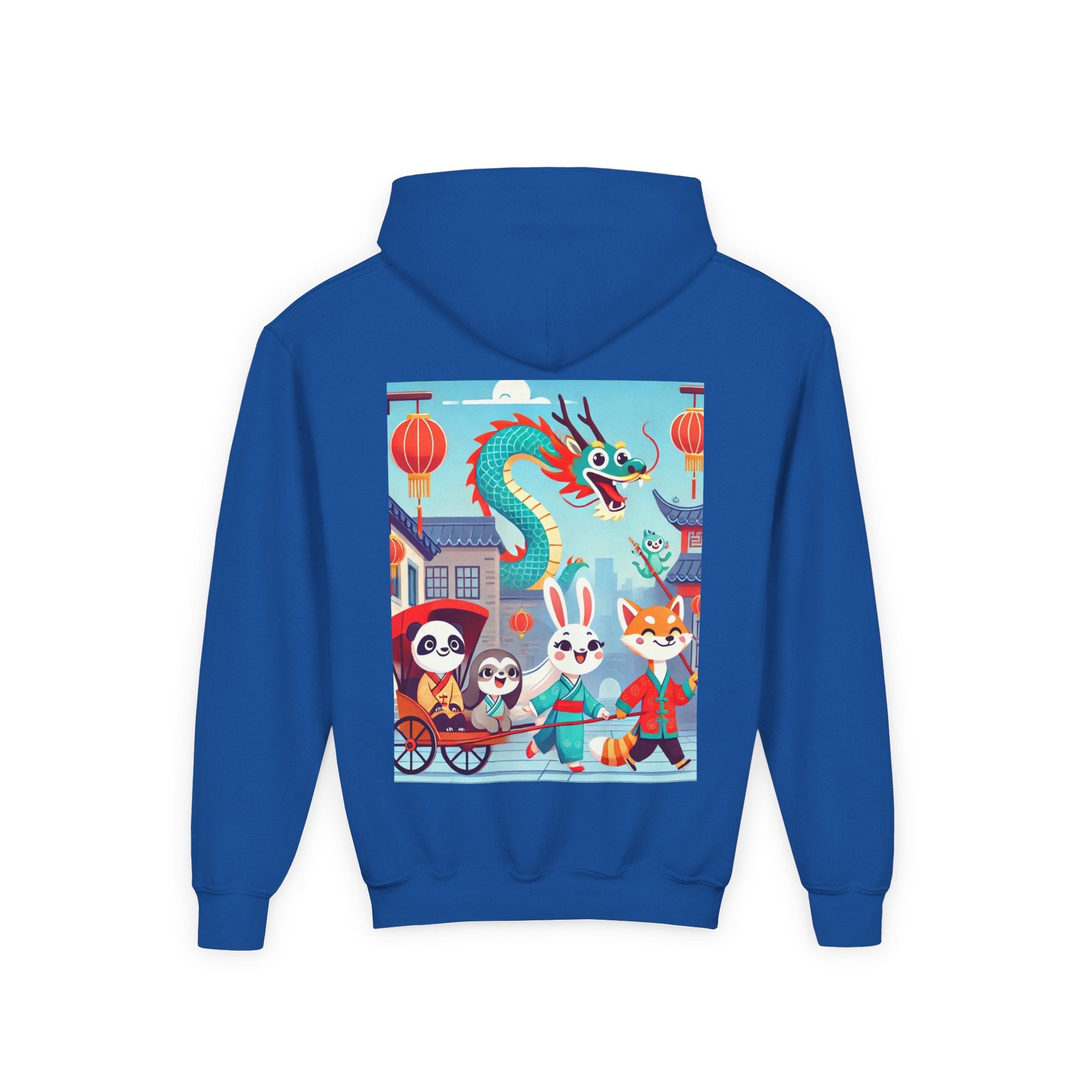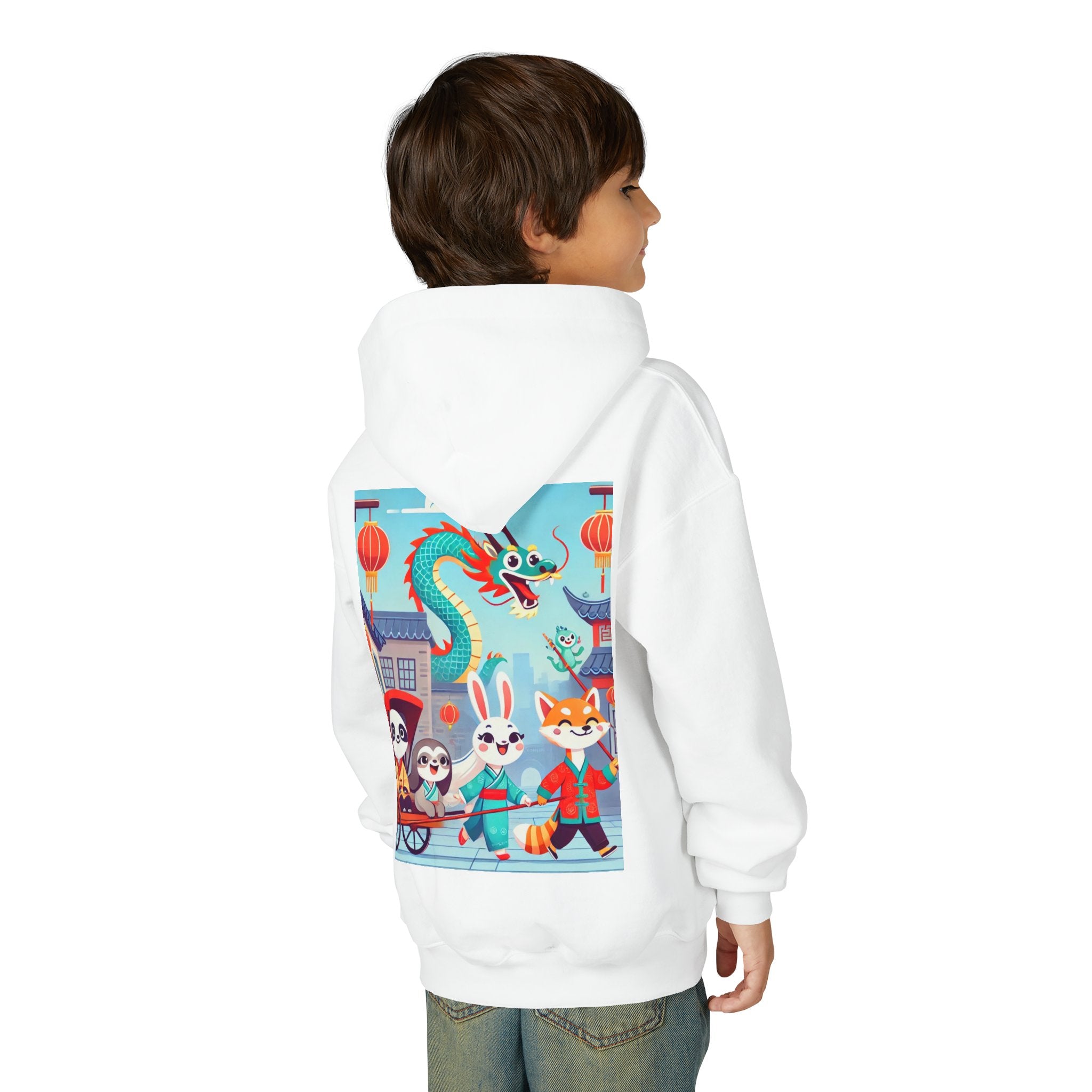 The Little Dragon and Friends Youth Heavy Blend Hooded Sweatshirt wraps kids in ultra-soft, preshrunk fleece while a bright storybook stroll unfolds across the design. The cozy medium-weight fabric feels wonderful against the skin and helps the cheerful scene stay front and center: a smiling dragon swoops overhead as a happy fox, rabbit, panda, and sloth wander through an ancient town in colorful traditional Hanfu. Tiled rooftops and curved eaves frame the path, soft clouds drift above, and glowing red lanterns add warm sparkle—capturing friendship, wonder, and the upbeat feeling of a day out together in clean, vibrant flat-art style.