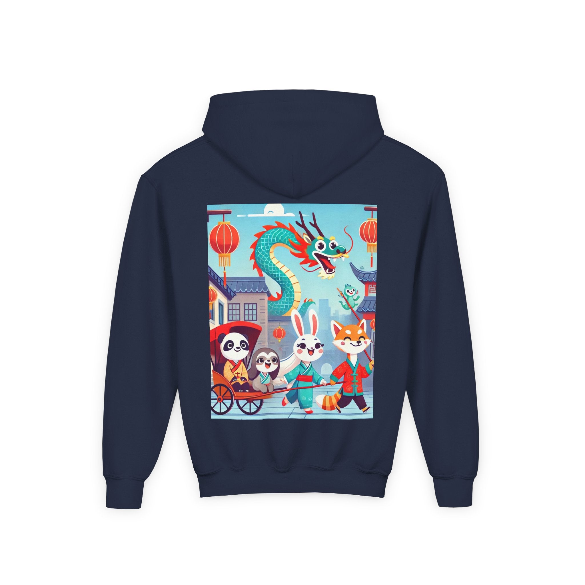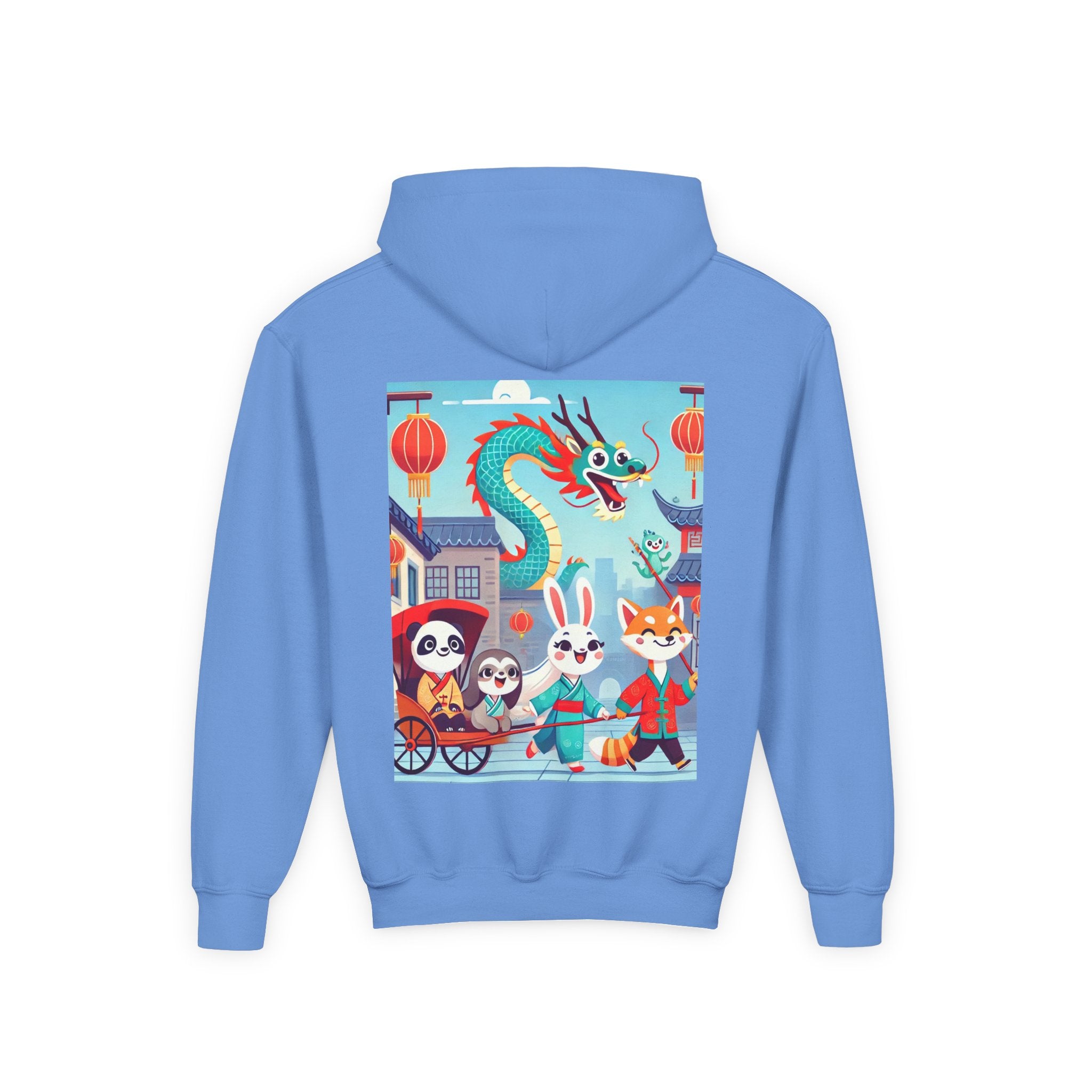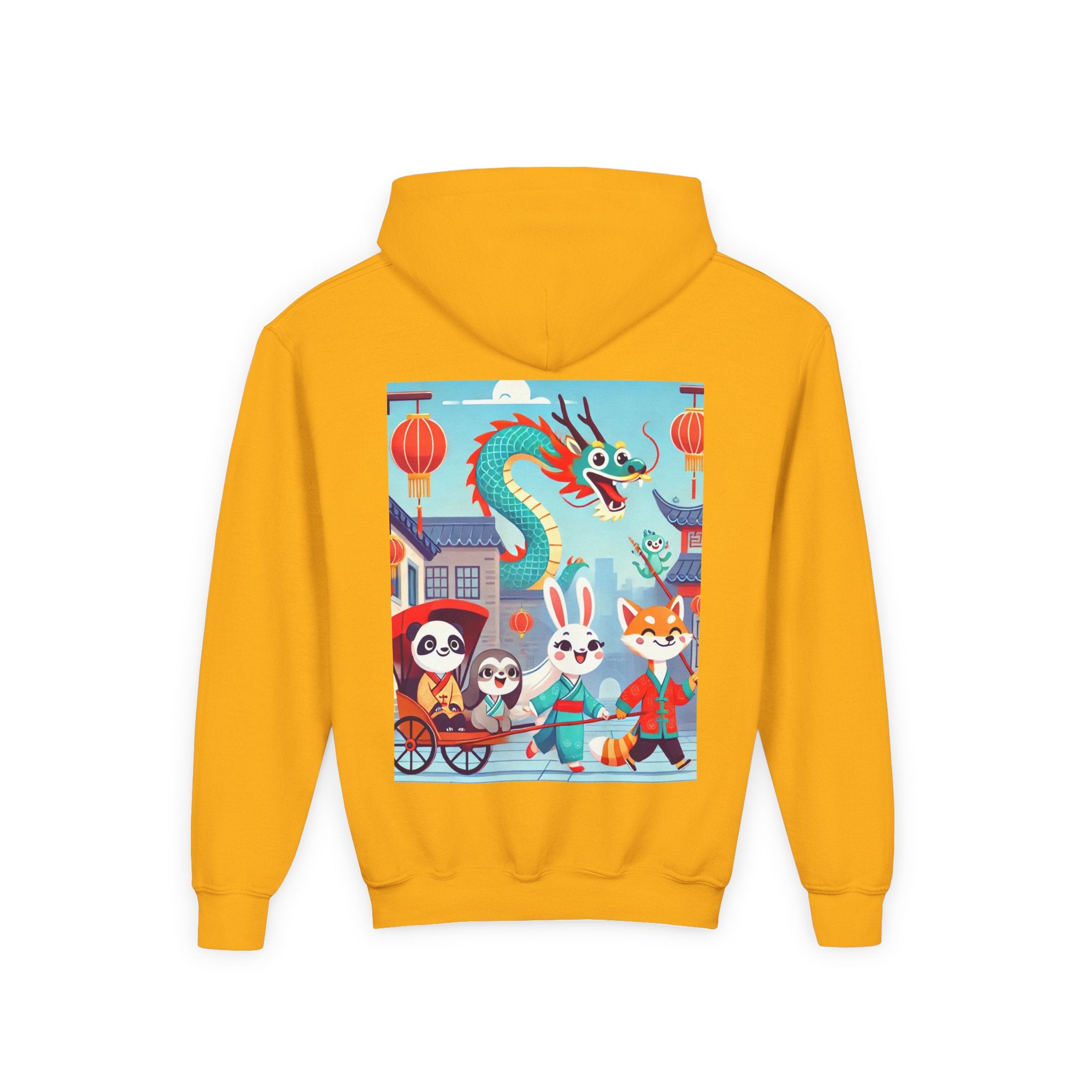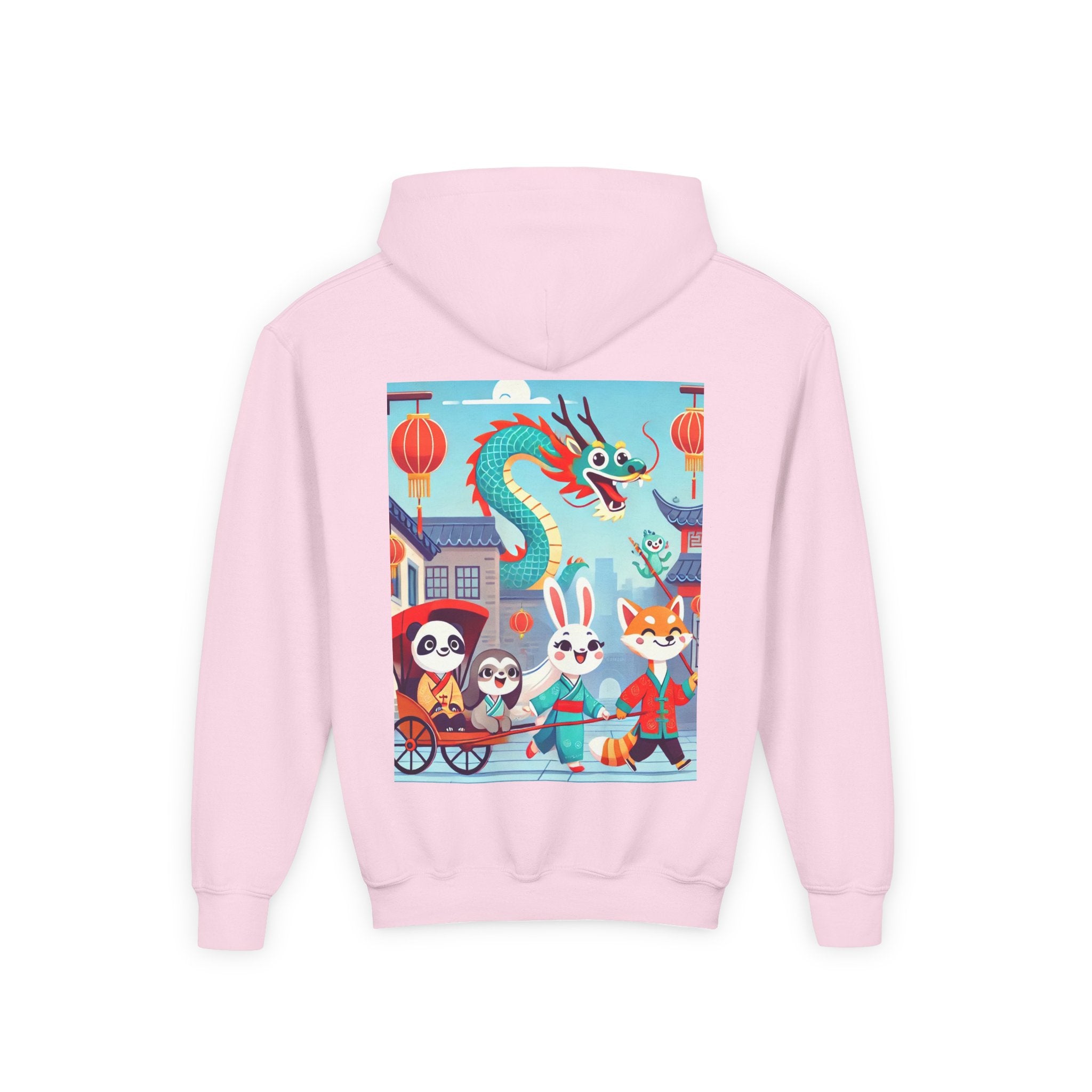 The Little Dragon and Friends Youth Heavy Blend Hooded Sweatshirt wraps kids in ultra-soft, preshrunk fleece while a bright storybook stroll unfolds across the design. The cozy medium-weight fabric feels wonderful against the skin and helps the cheerful scene stay front and center: a smiling dragon swoops overhead as a happy fox, rabbit, panda, and sloth wander through an ancient town in colorful traditional Hanfu. Tiled rooftops and curved eaves frame the path, soft clouds drift above, and glowing red lanterns add warm sparkle—capturing friendship, wonder, and the upbeat feeling of a day out together in clean, vibrant flat-art style.