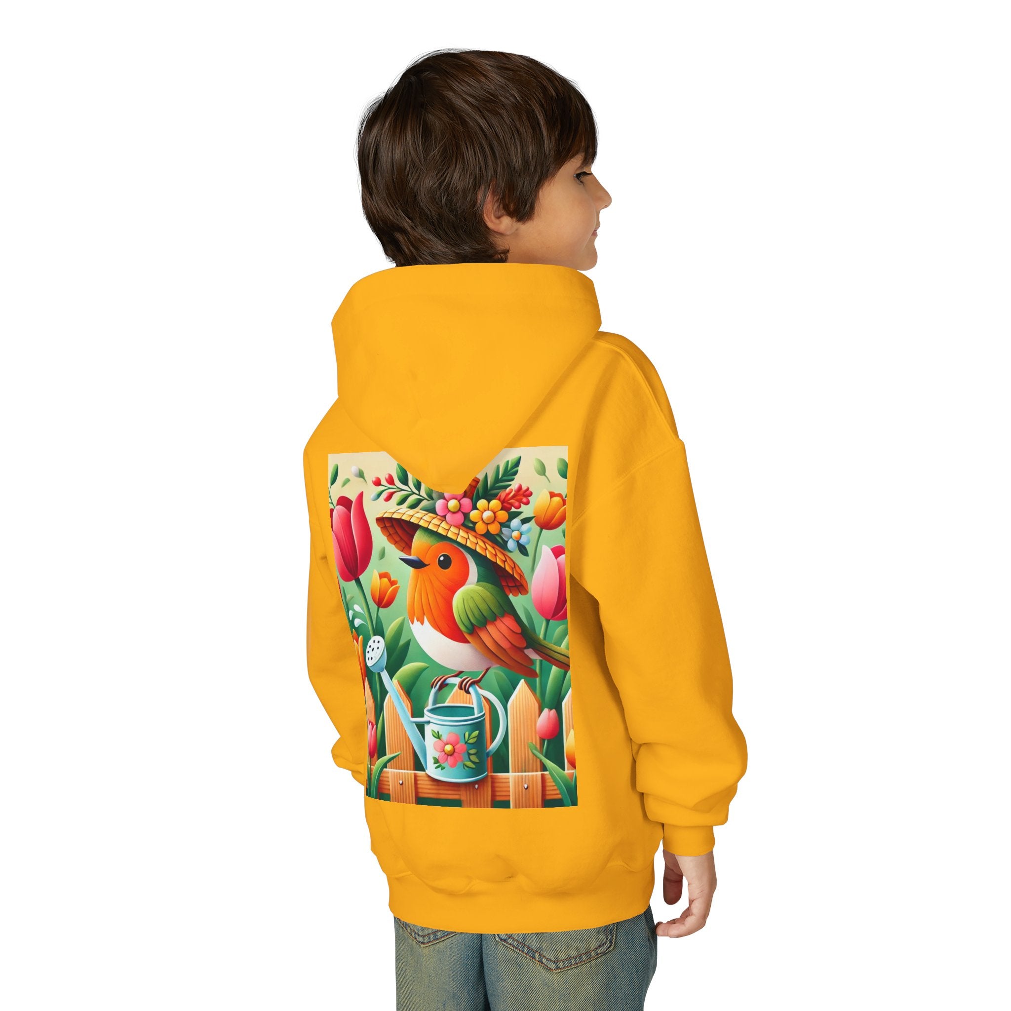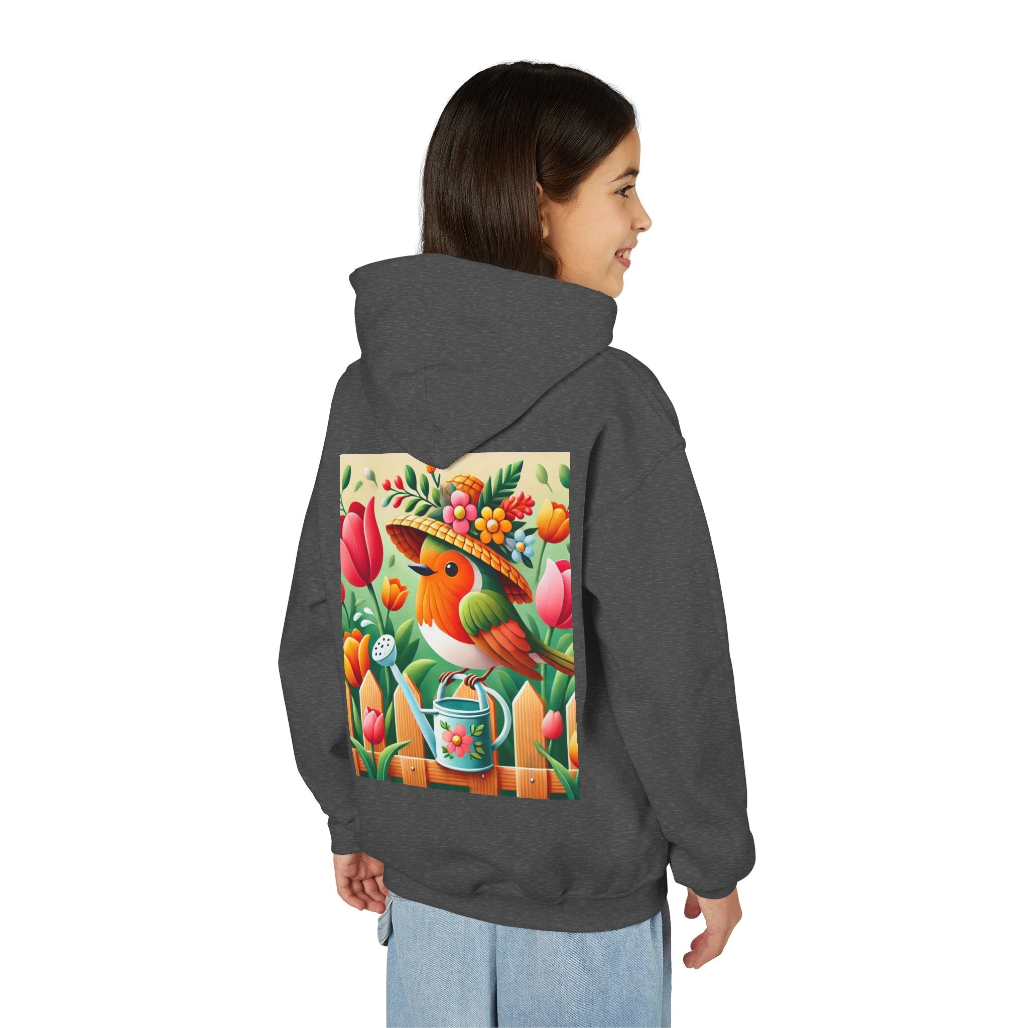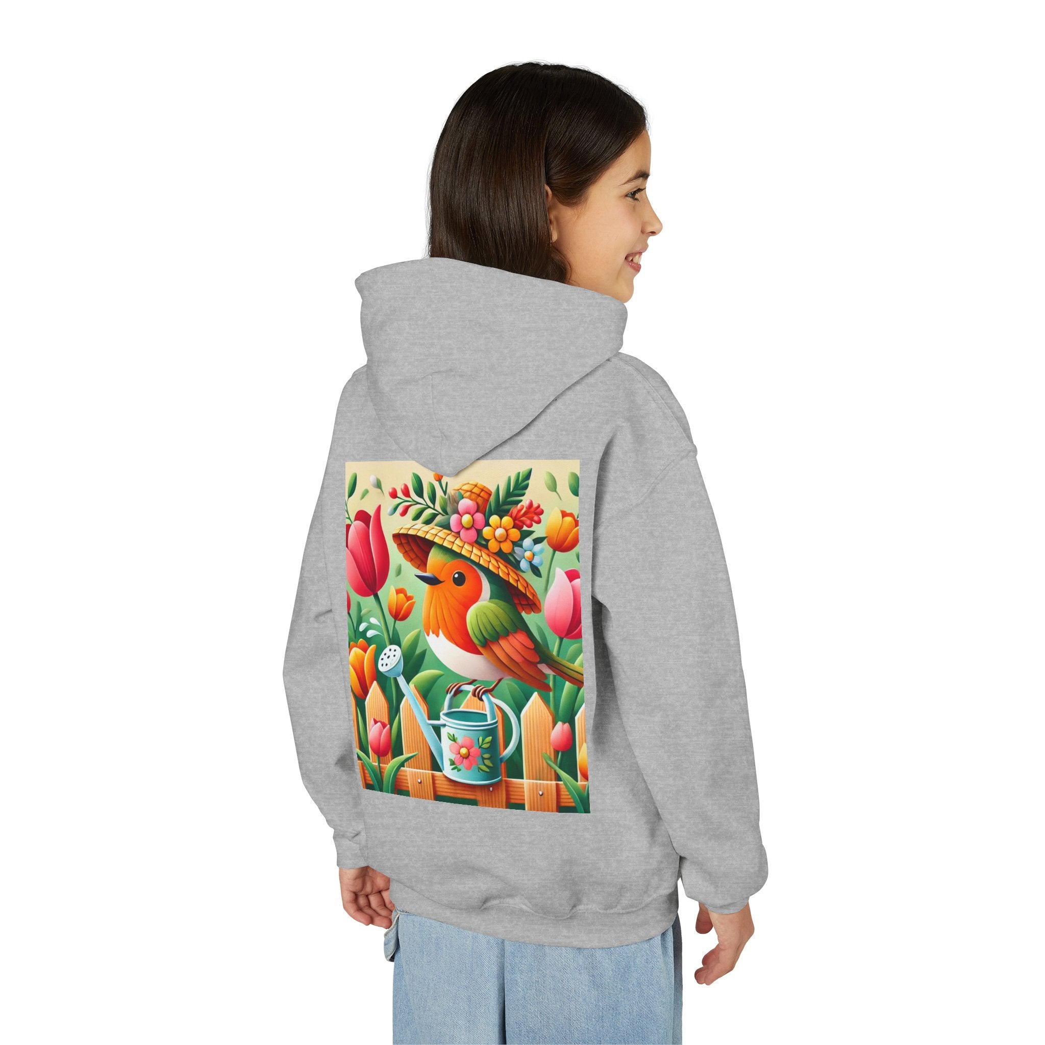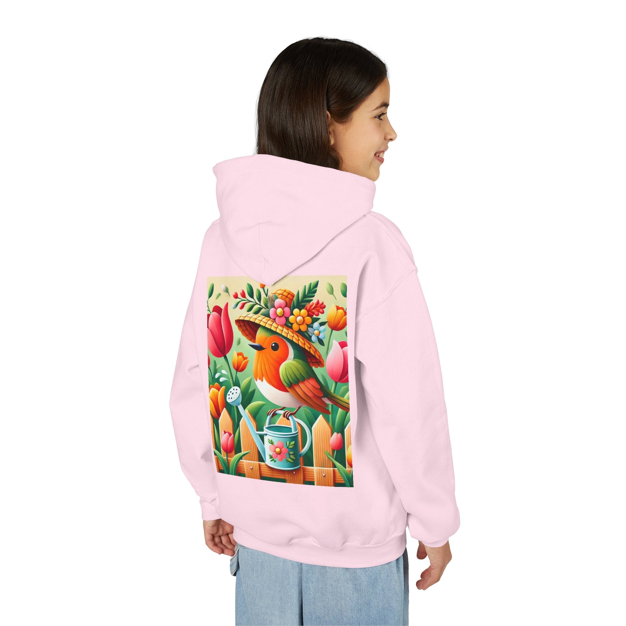 The Little Garden Tender Youth Heavy Blend Hooded Sweatshirt brings sunshine, sweetness, and storybook charm to a cozy everyday layer. The artwork features a cheerful songbird pausing atop a garden fence, wearing a straw hat crowned with blossoms as it tends a colorful bed of tulips. A tiny watering can rests nearby, while flowers bloom in warm pinks, oranges, and fresh greens, filling the scene with gentle care, bright imagination, and sunny optimism.