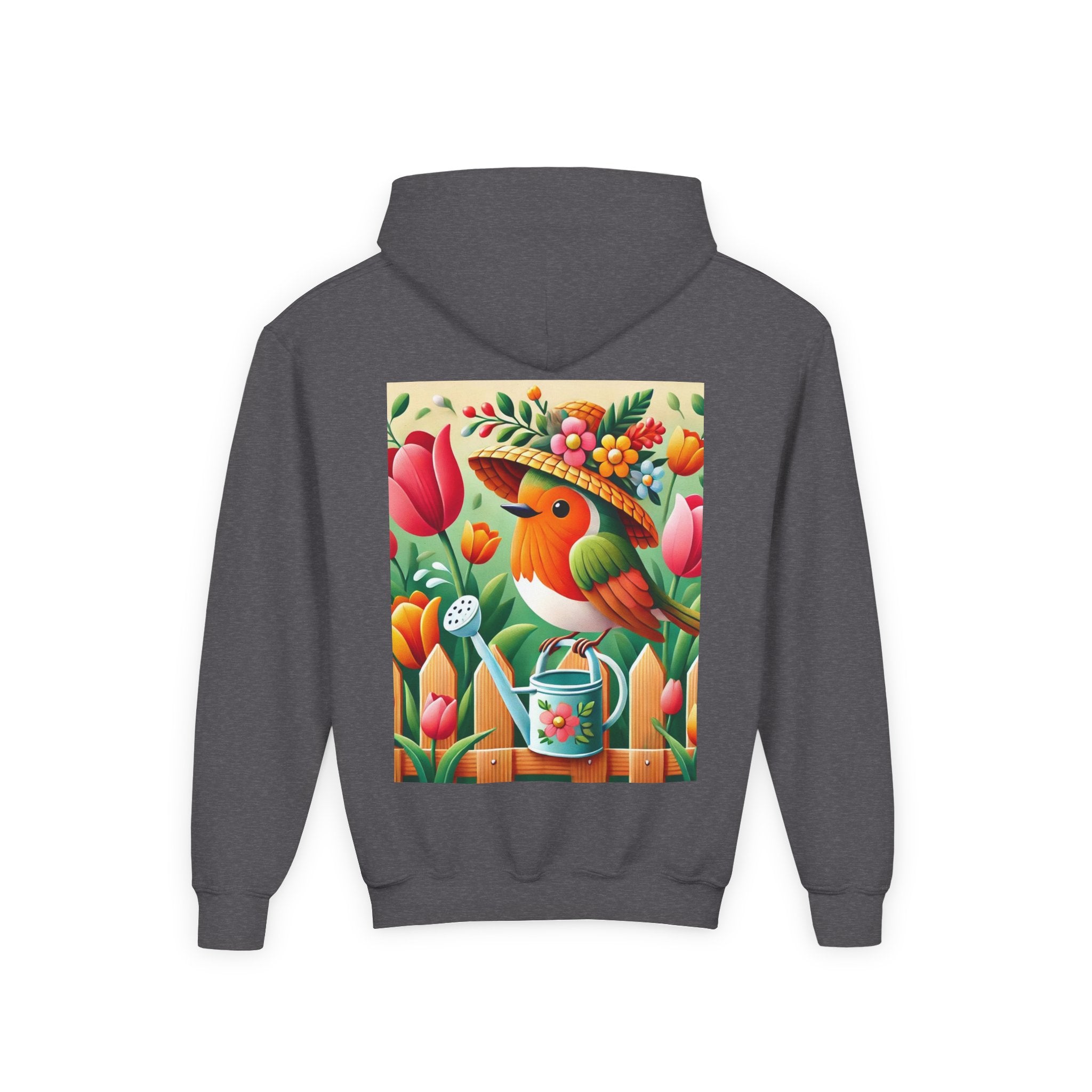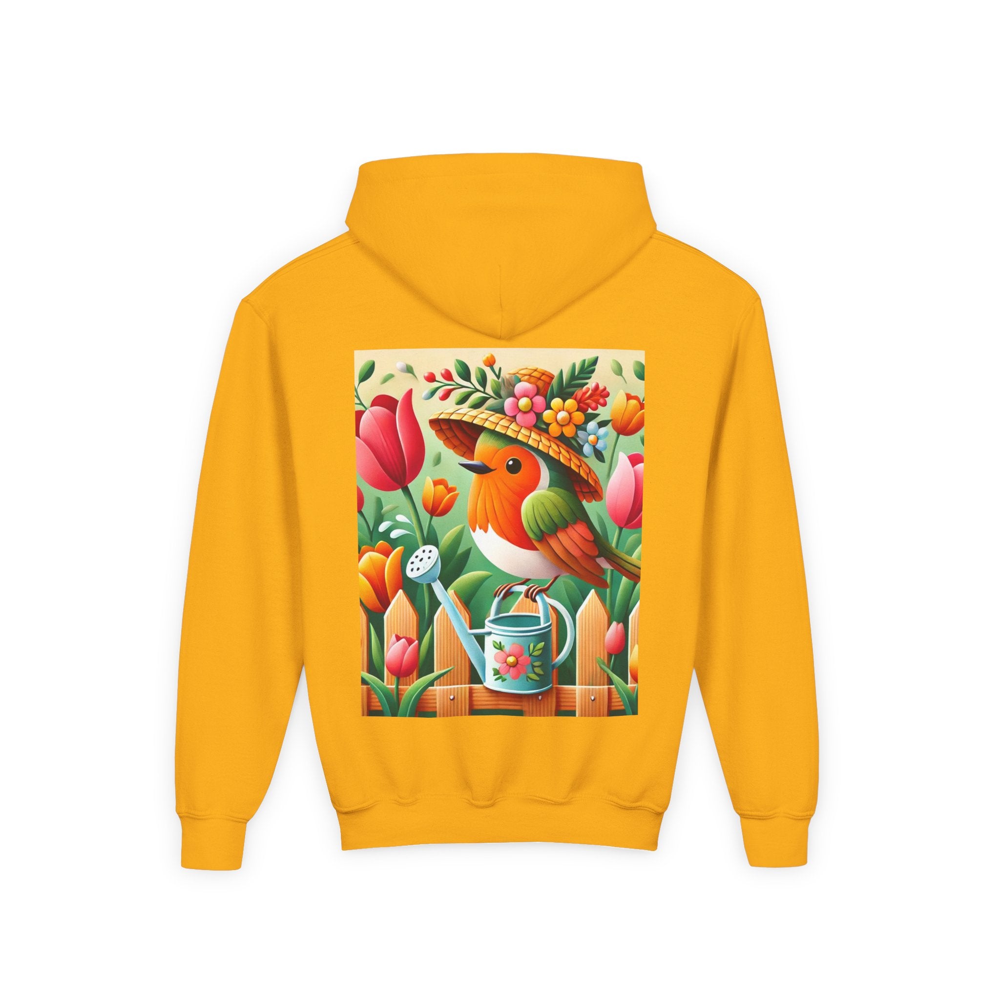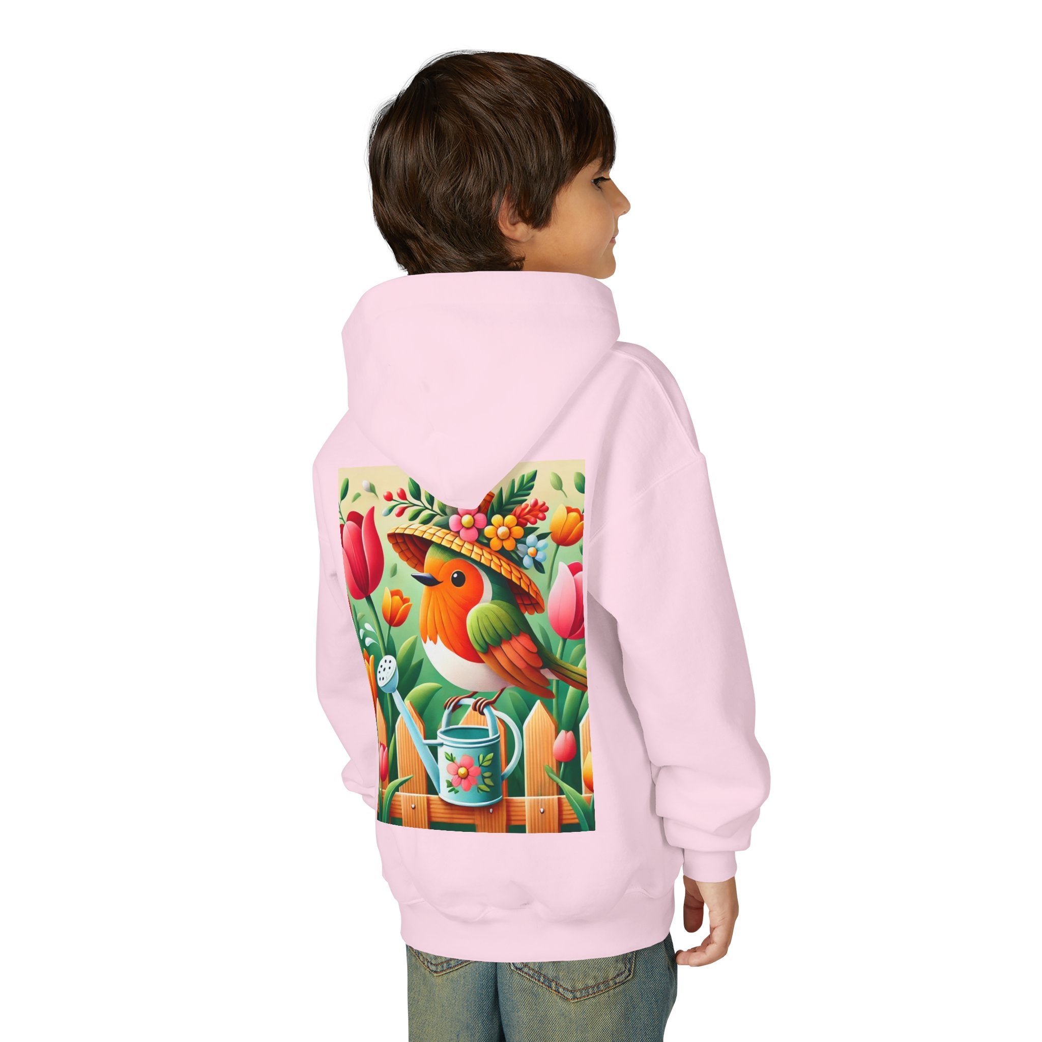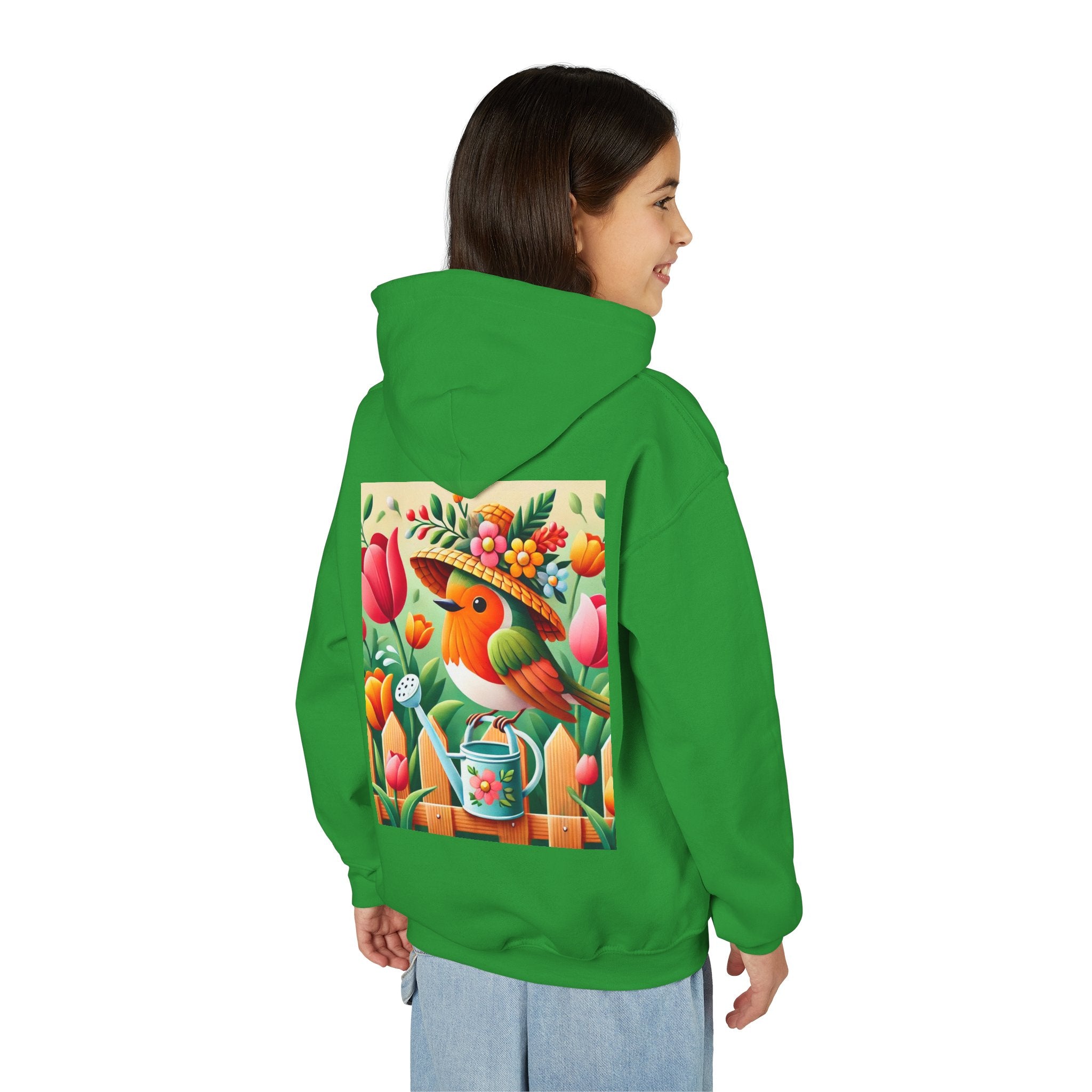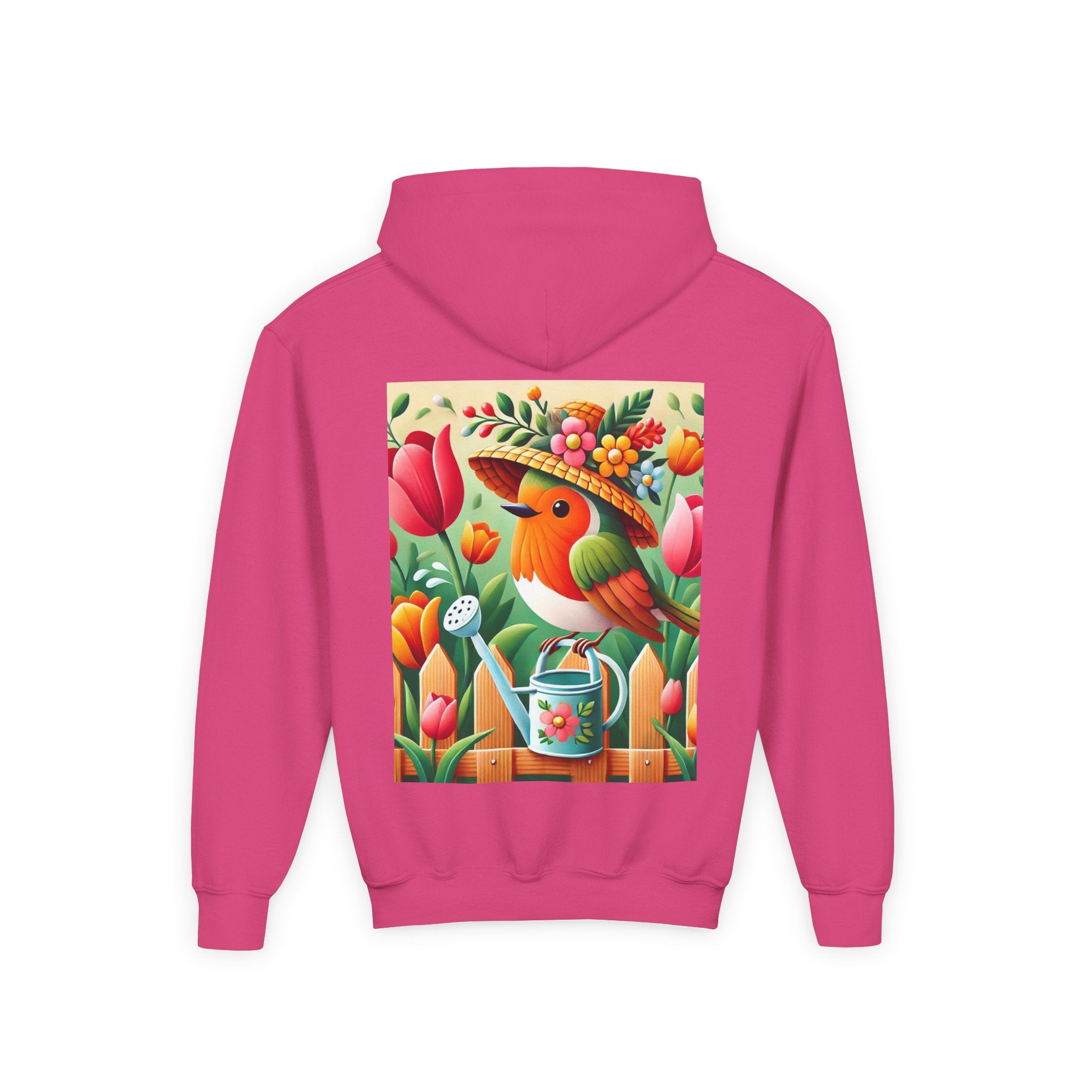 The Little Garden Tender Youth Heavy Blend Hooded Sweatshirt brings sunshine, sweetness, and storybook charm to a cozy everyday layer. The artwork features a cheerful songbird pausing atop a garden fence, wearing a straw hat crowned with blossoms as it tends a colorful bed of tulips. A tiny watering can rests nearby, while flowers bloom in warm pinks, oranges, and fresh greens, filling the scene with gentle care, bright imagination, and sunny optimism.