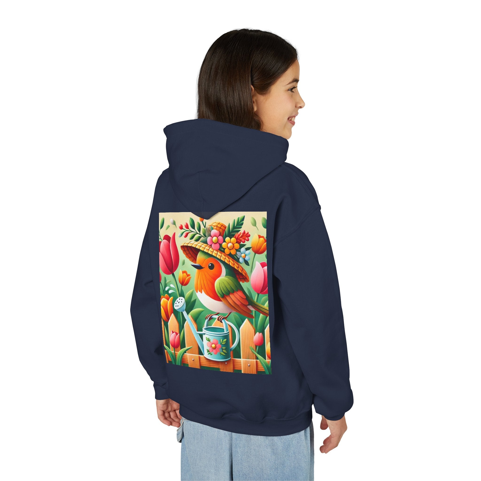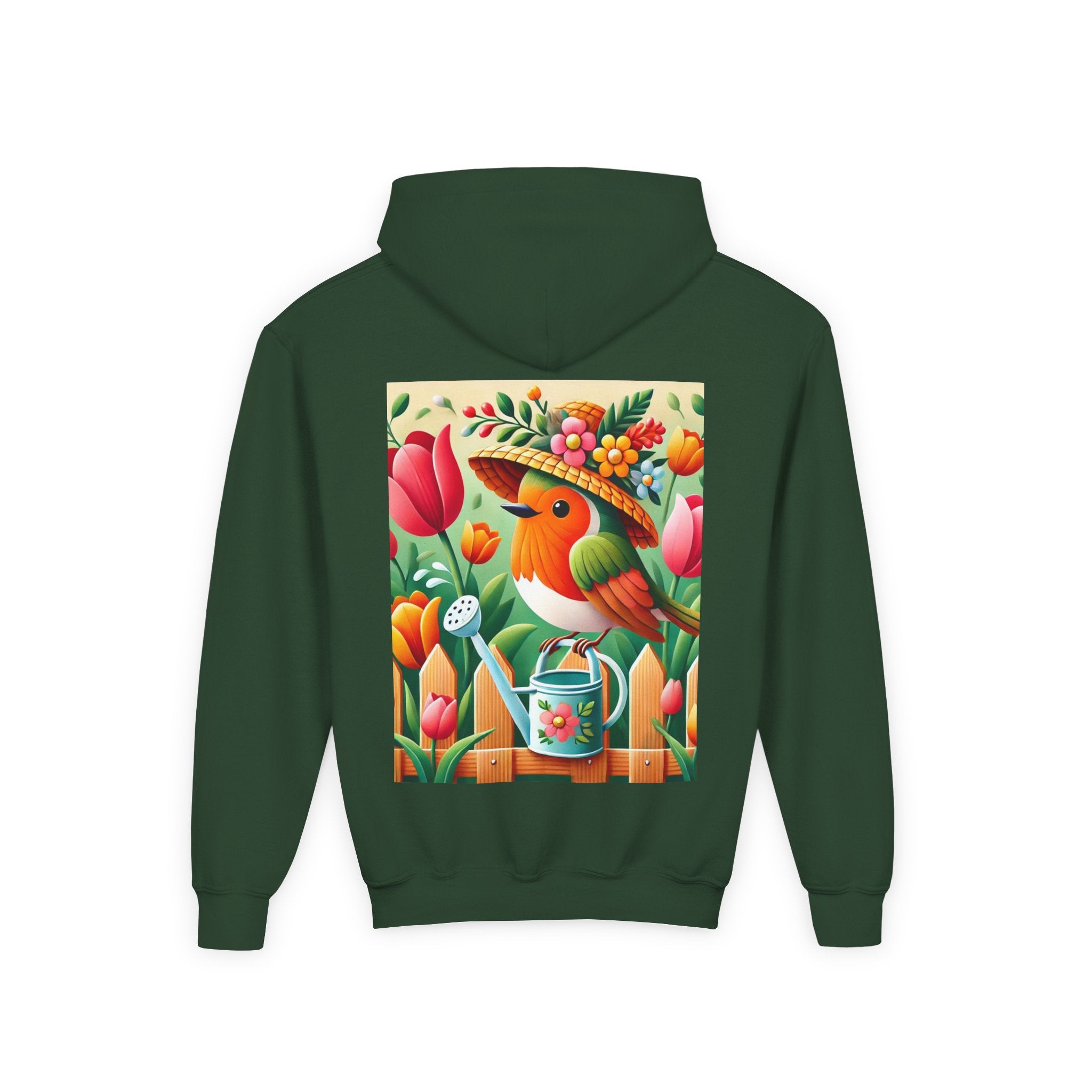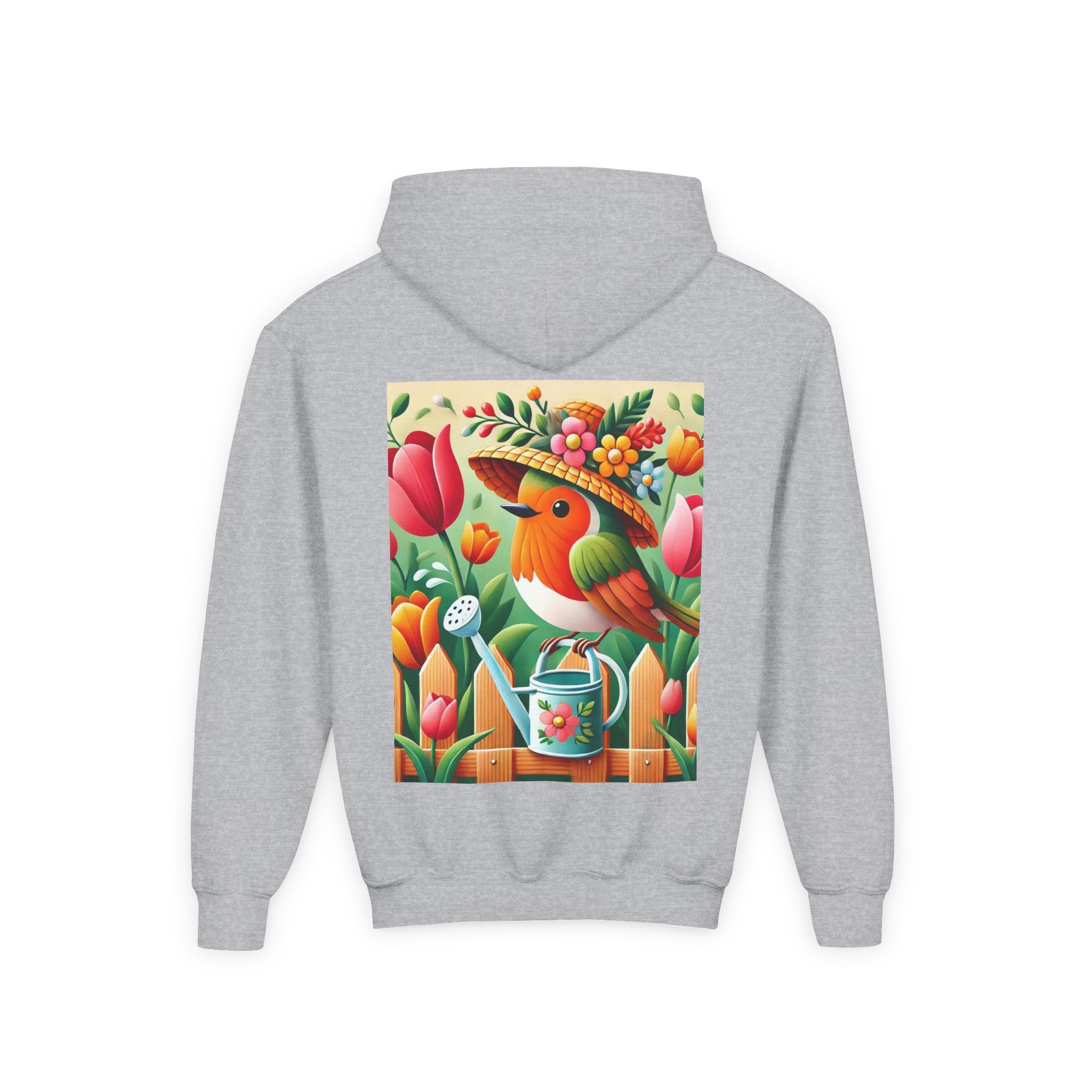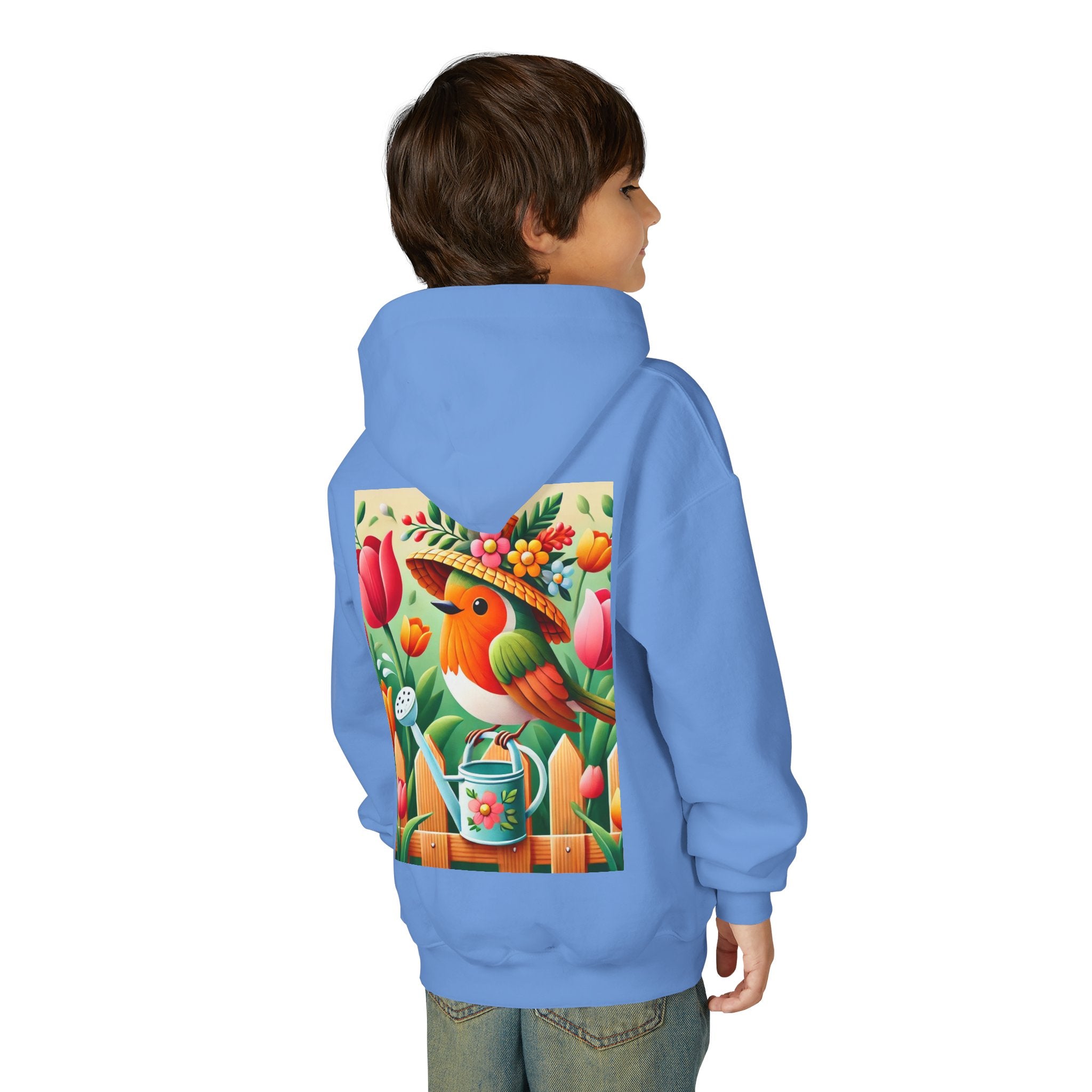 The Little Garden Tender Youth Heavy Blend Hooded Sweatshirt brings sunshine, sweetness, and storybook charm to a cozy everyday layer. The artwork features a cheerful songbird pausing atop a garden fence, wearing a straw hat crowned with blossoms as it tends a colorful bed of tulips. A tiny watering can rests nearby, while flowers bloom in warm pinks, oranges, and fresh greens, filling the scene with gentle care, bright imagination, and sunny optimism.