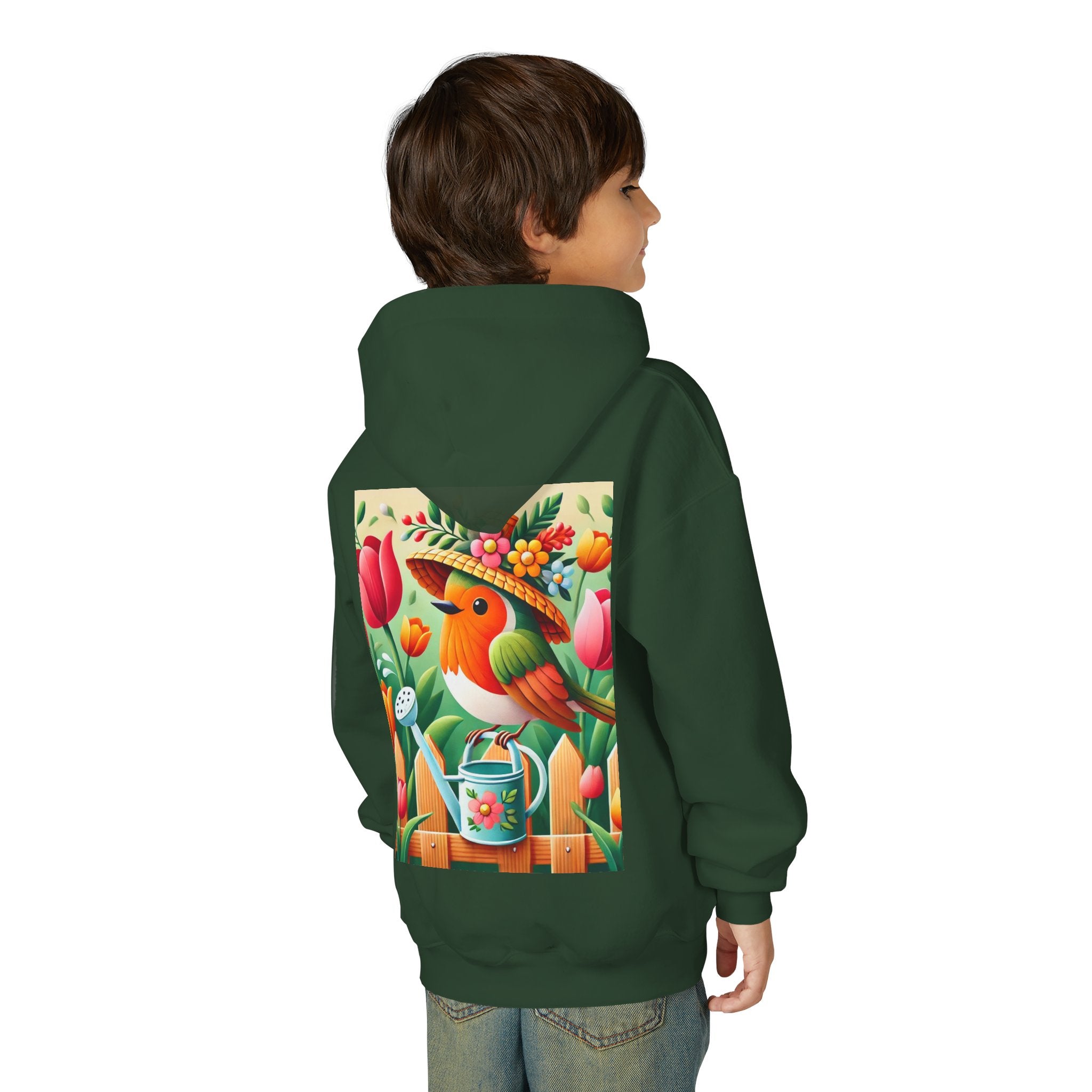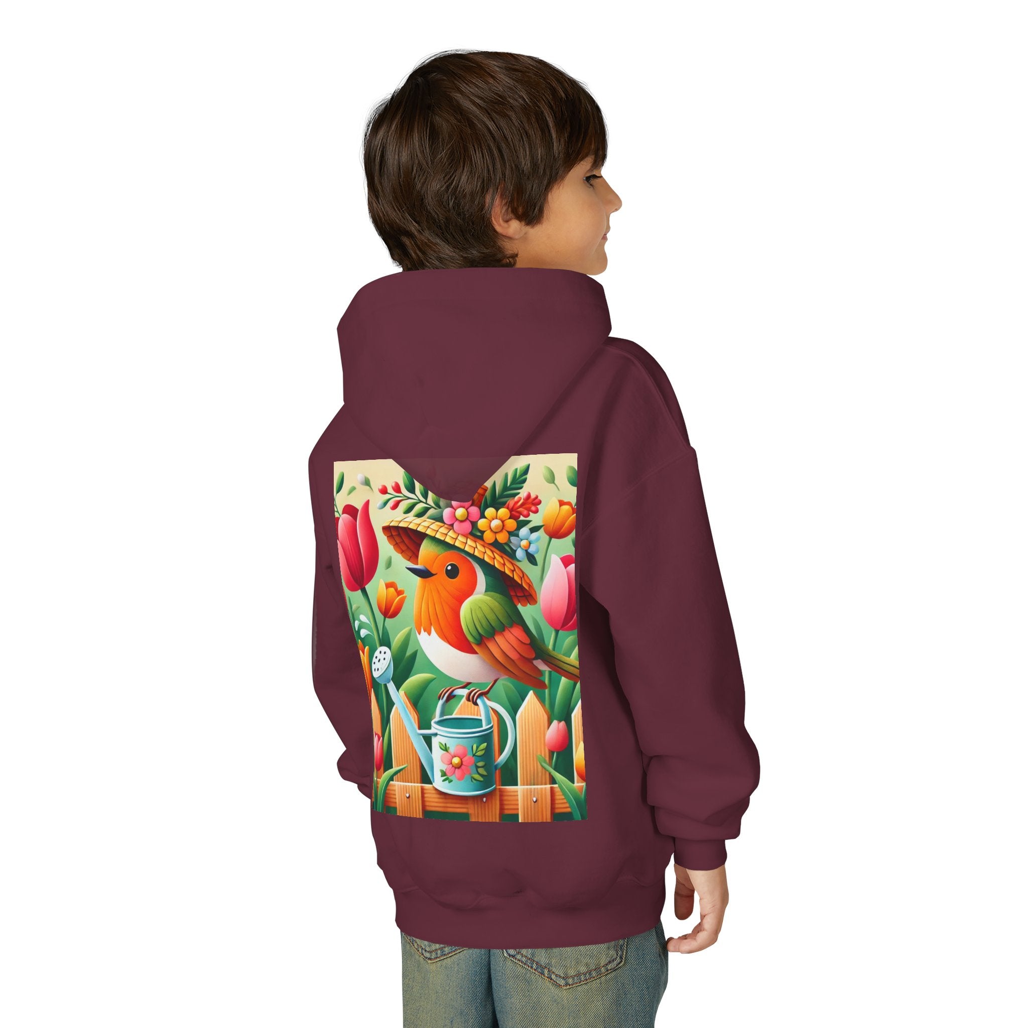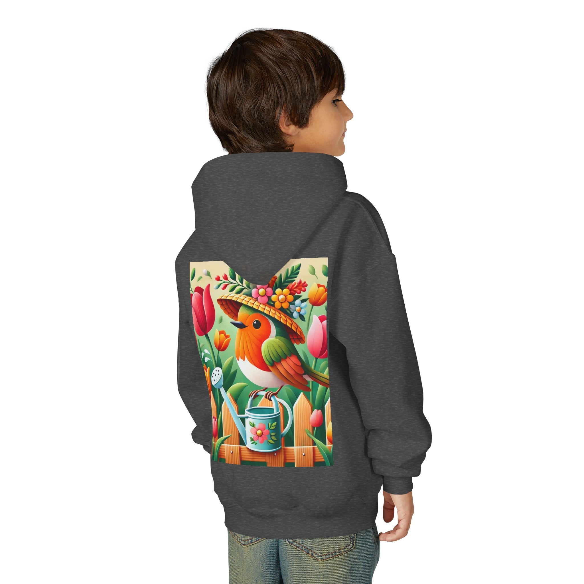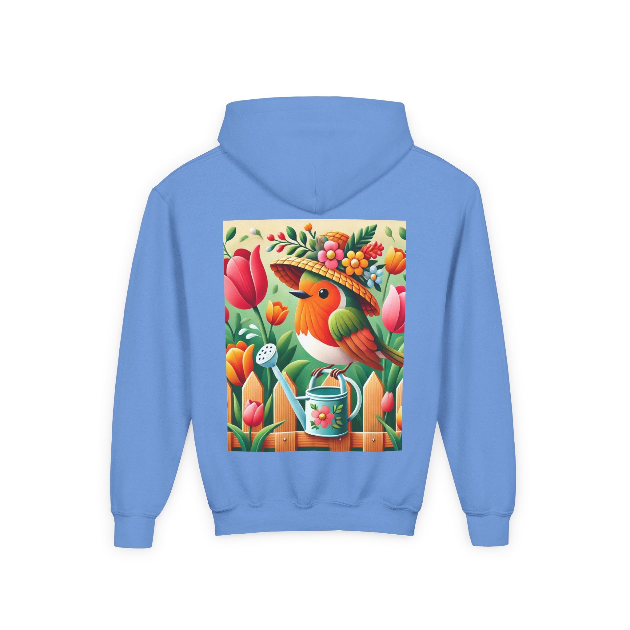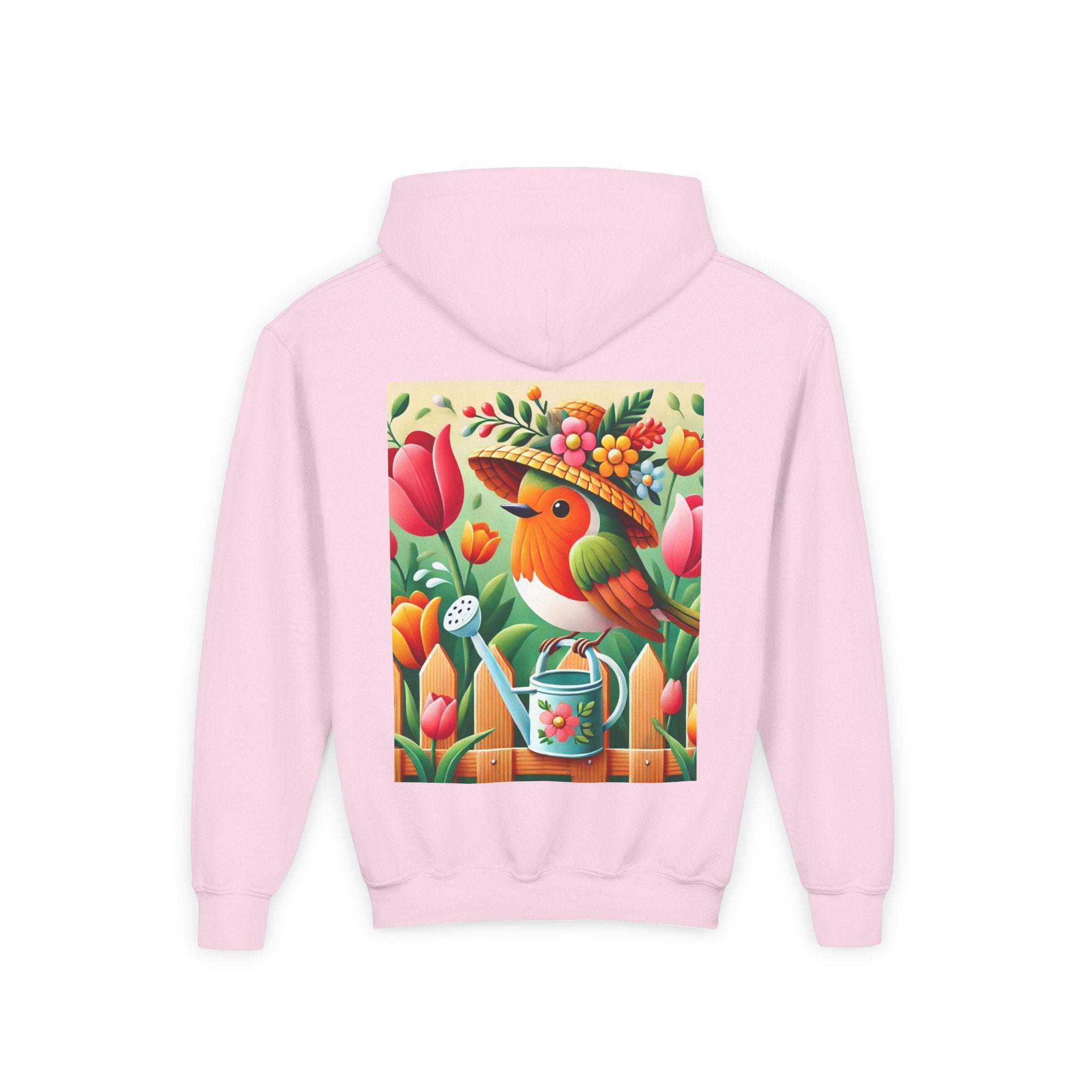 The Little Garden Tender Youth Heavy Blend Hooded Sweatshirt brings sunshine, sweetness, and storybook charm to a cozy everyday layer. The artwork features a cheerful songbird pausing atop a garden fence, wearing a straw hat crowned with blossoms as it tends a colorful bed of tulips. A tiny watering can rests nearby, while flowers bloom in warm pinks, oranges, and fresh greens, filling the scene with gentle care, bright imagination, and sunny optimism.