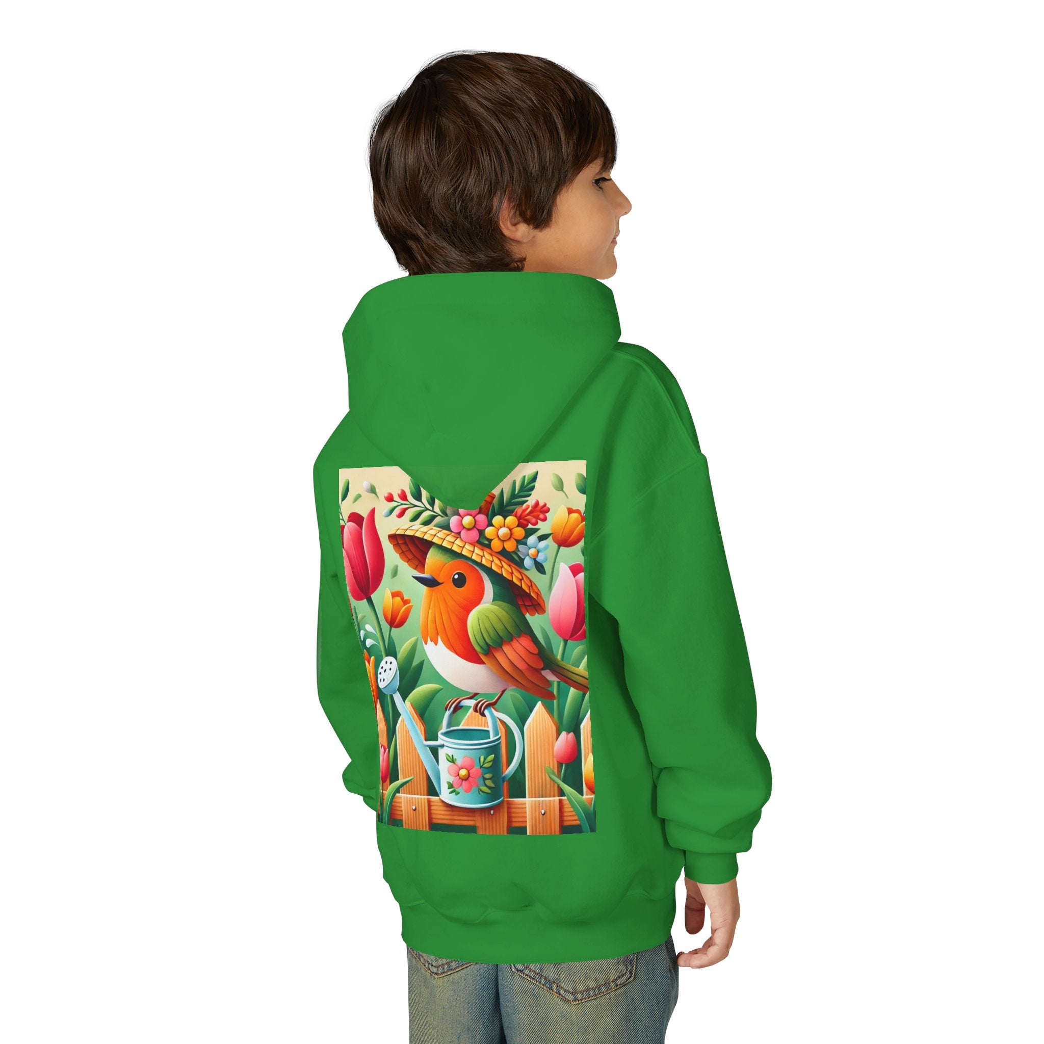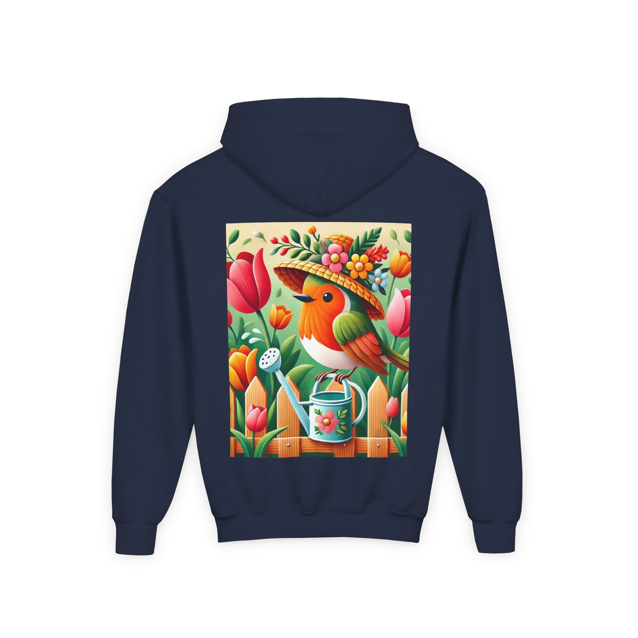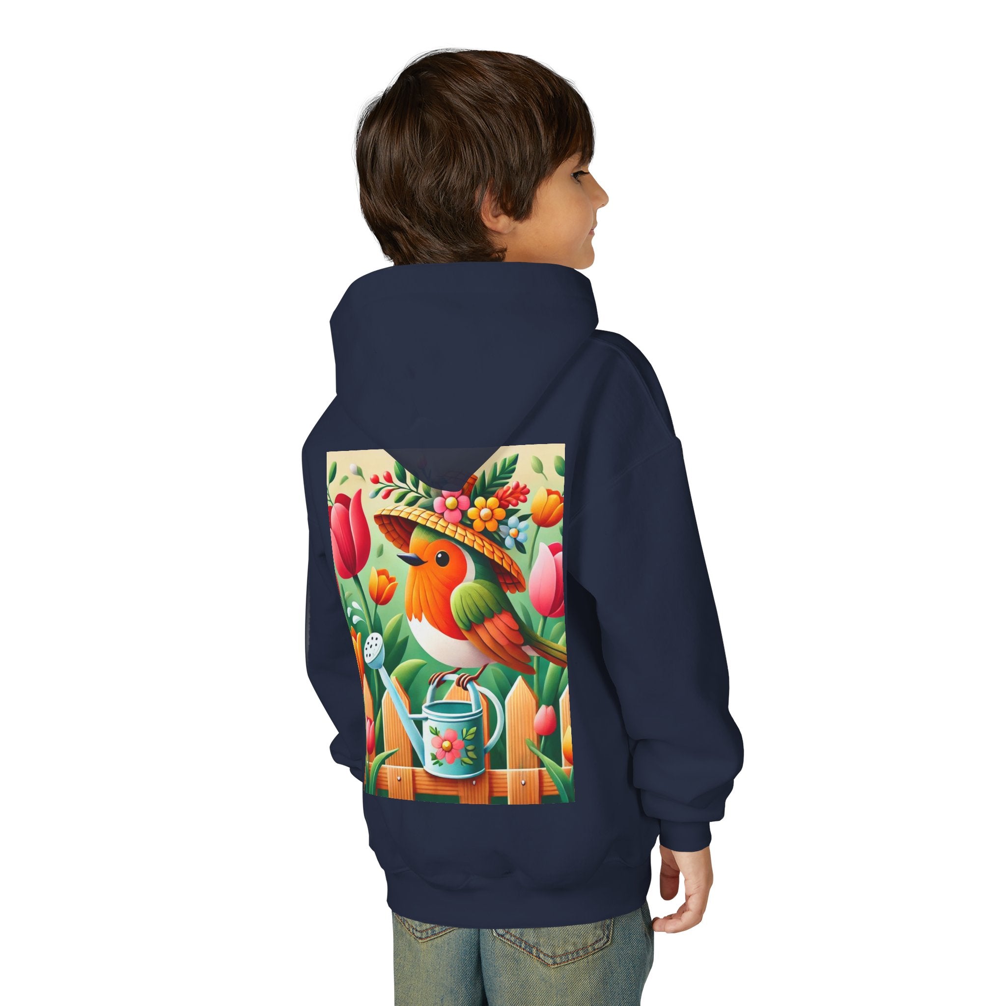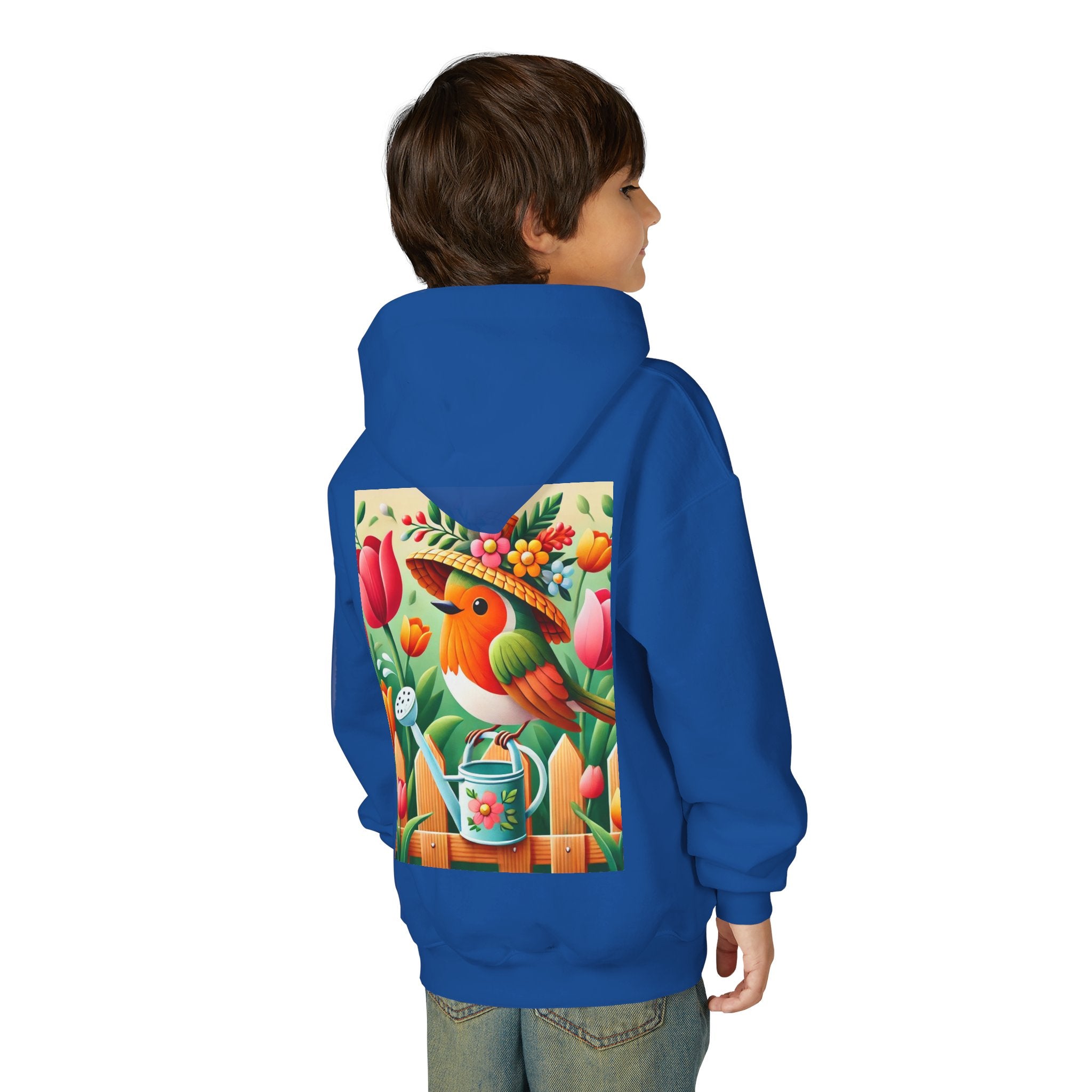The Little Garden Tender Youth Heavy Blend Hooded Sweatshirt brings sunshine, sweetness, and storybook charm to a cozy everyday layer. The artwork features a cheerful songbird pausing atop a garden fence, wearing a straw hat crowned with blossoms as it tends a colorful bed of tulips. A tiny watering can rests nearby, while flowers bloom in warm pinks, oranges, and fresh greens, filling the scene with gentle care, bright imagination, and sunny optimism.