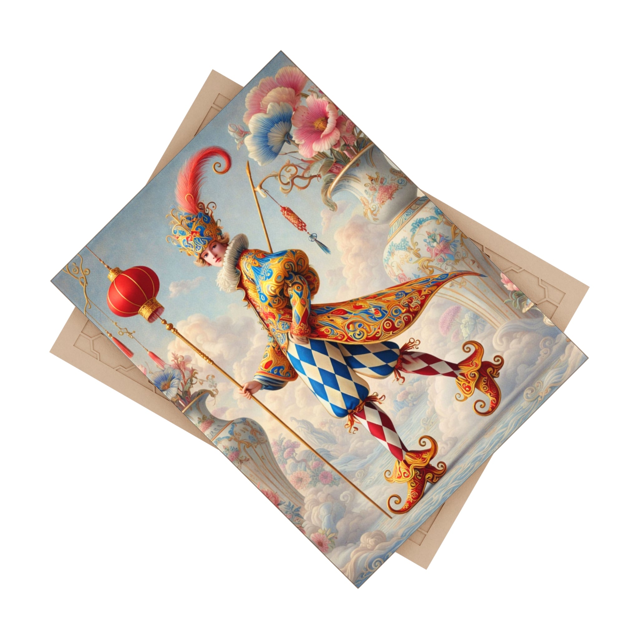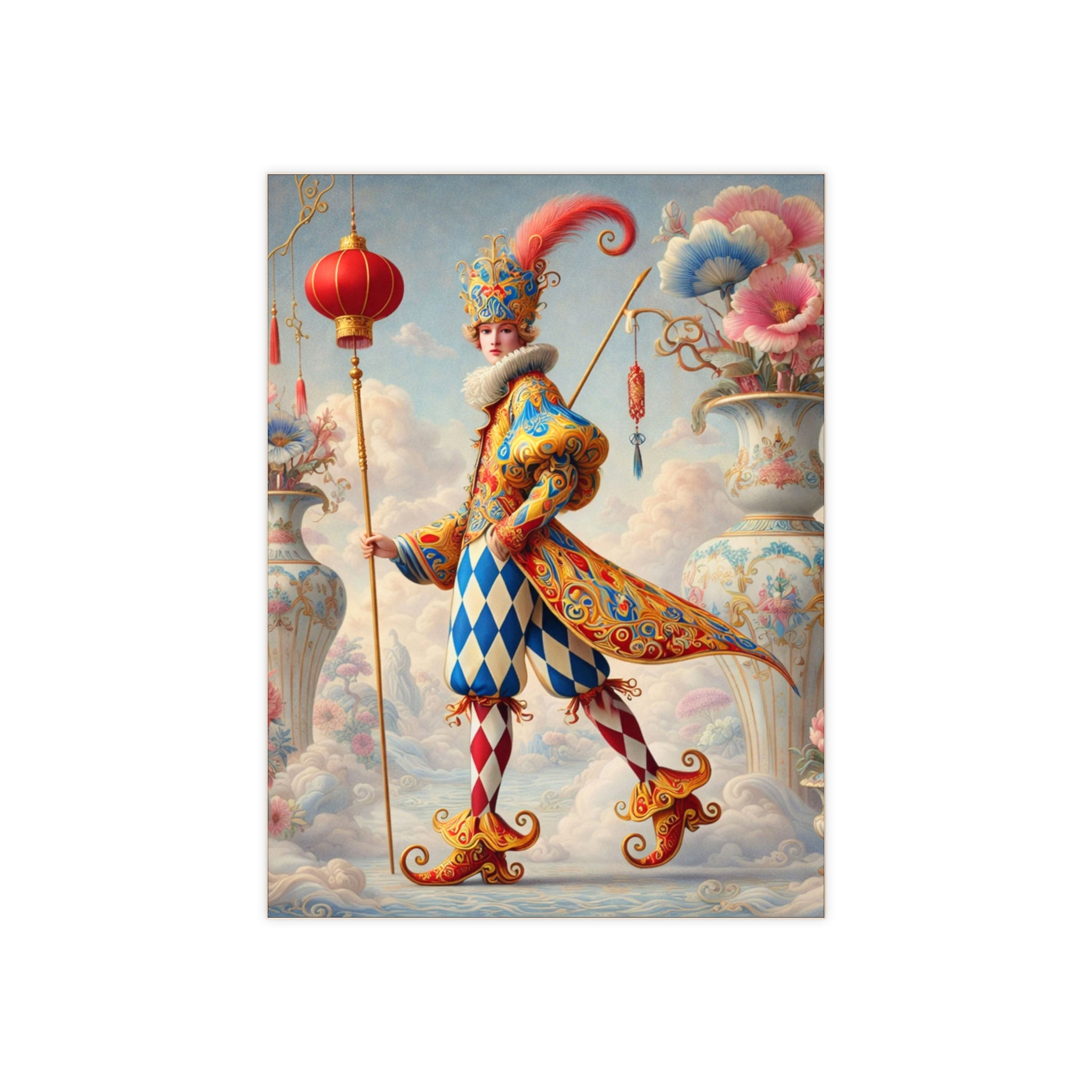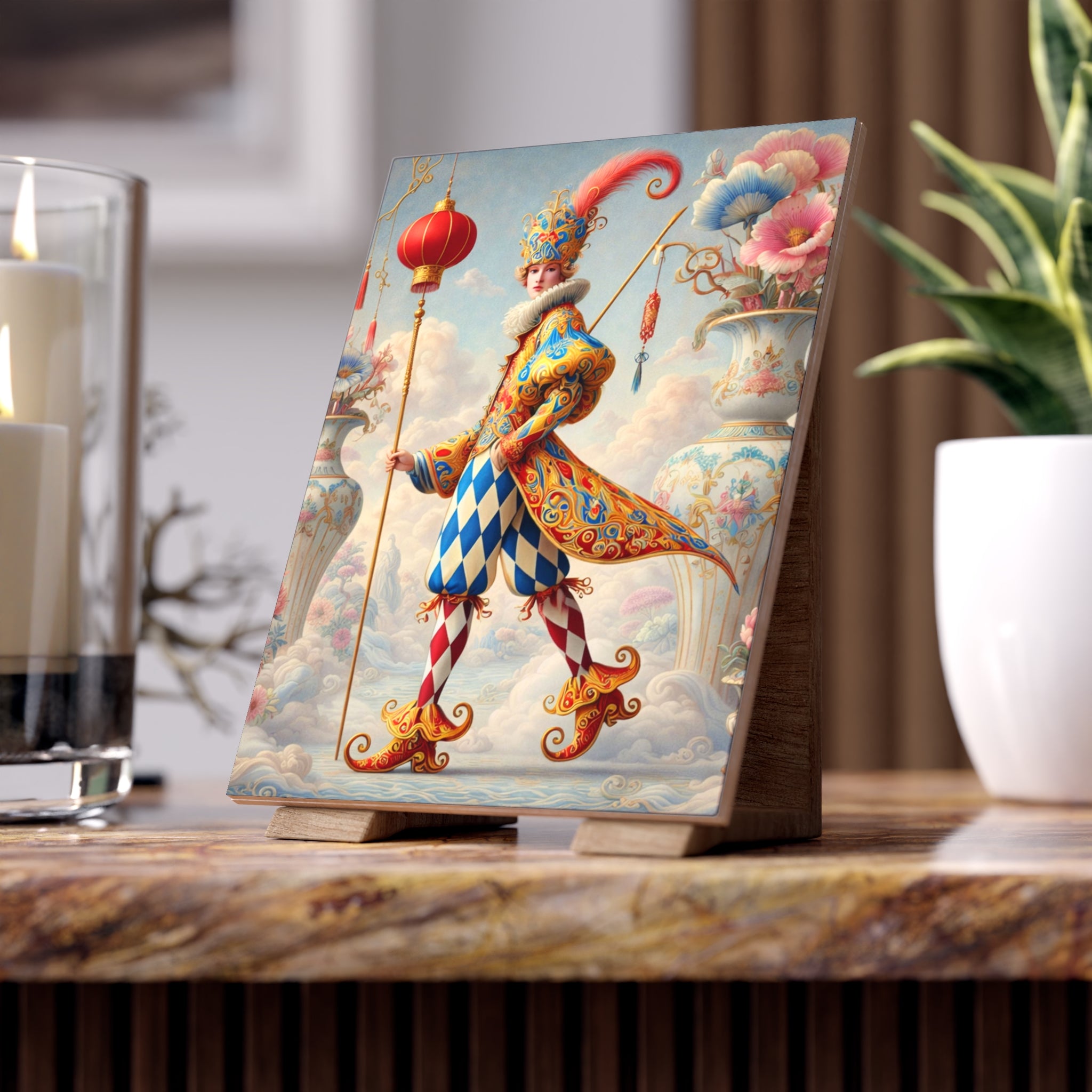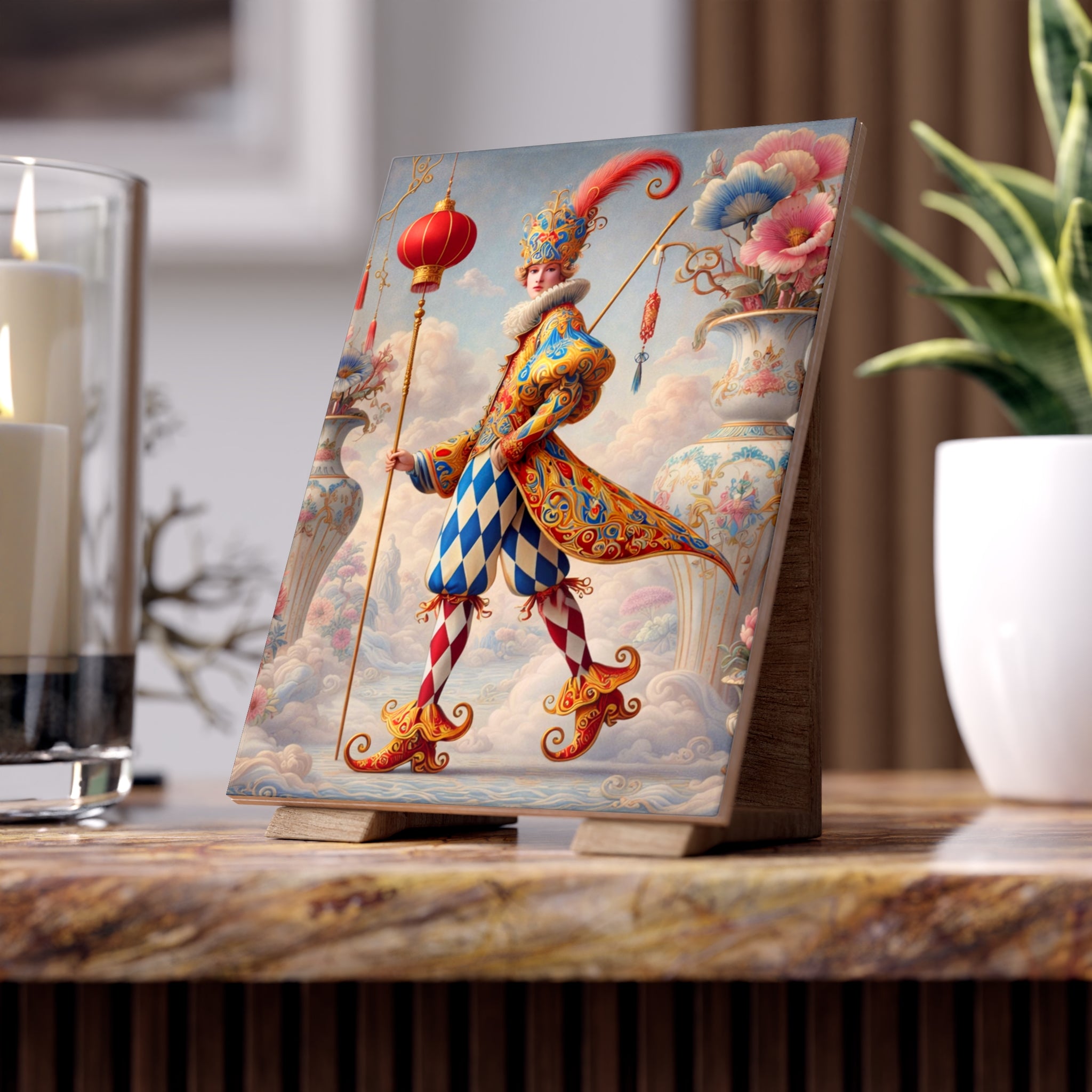 The artwork features The Ornamental Jester, a poised theatrical figure rendered in porcelain whites, soft blush, and muted pastels. Rather than playful comedy, the jester’s patterned costume, floral ornamentation, and sculptural silhouette suggest ritual, pageantry, and quiet performance. The restrained palette and balanced composition give the tile a sense of refinement and symbolic calm, elevating it from décor to collectible art.