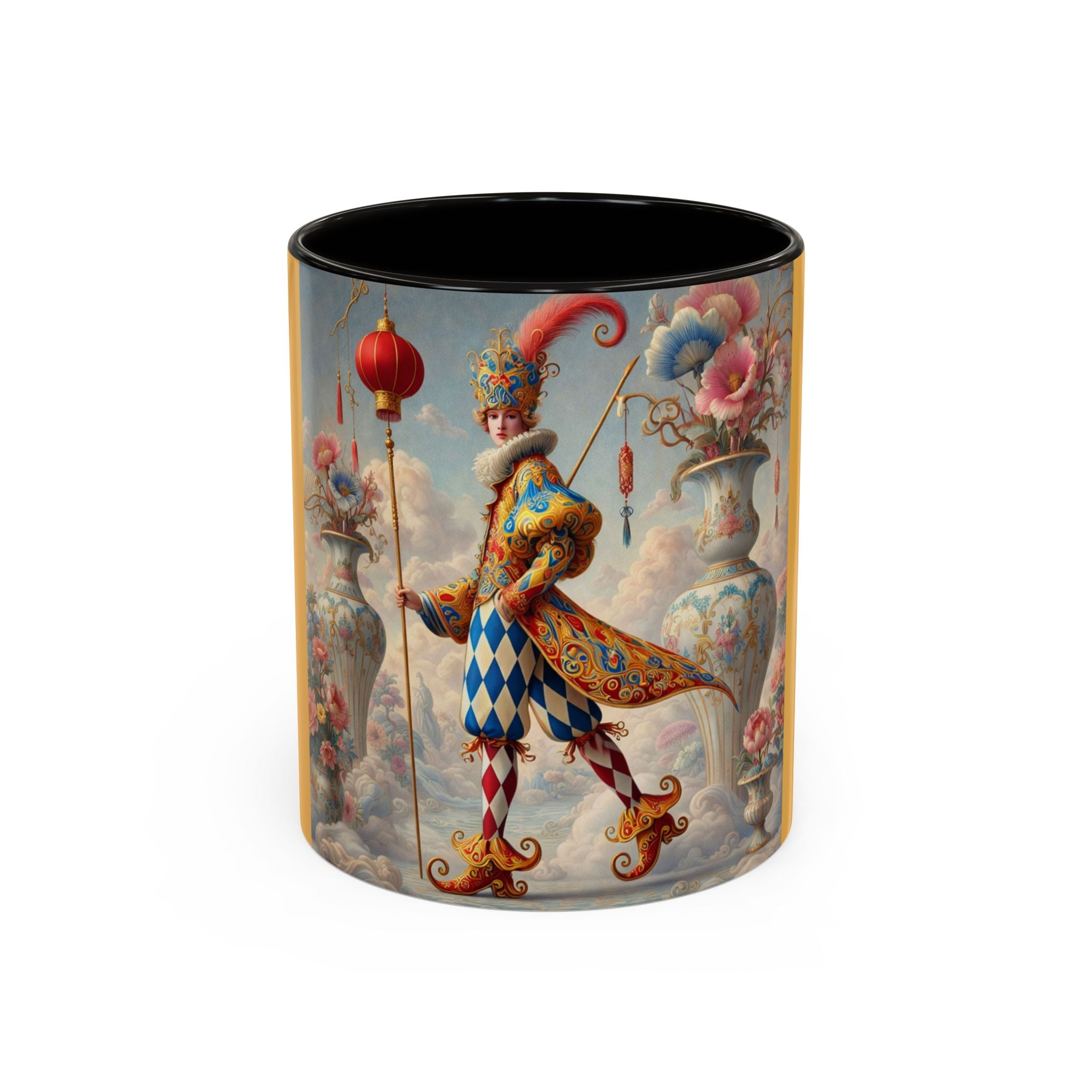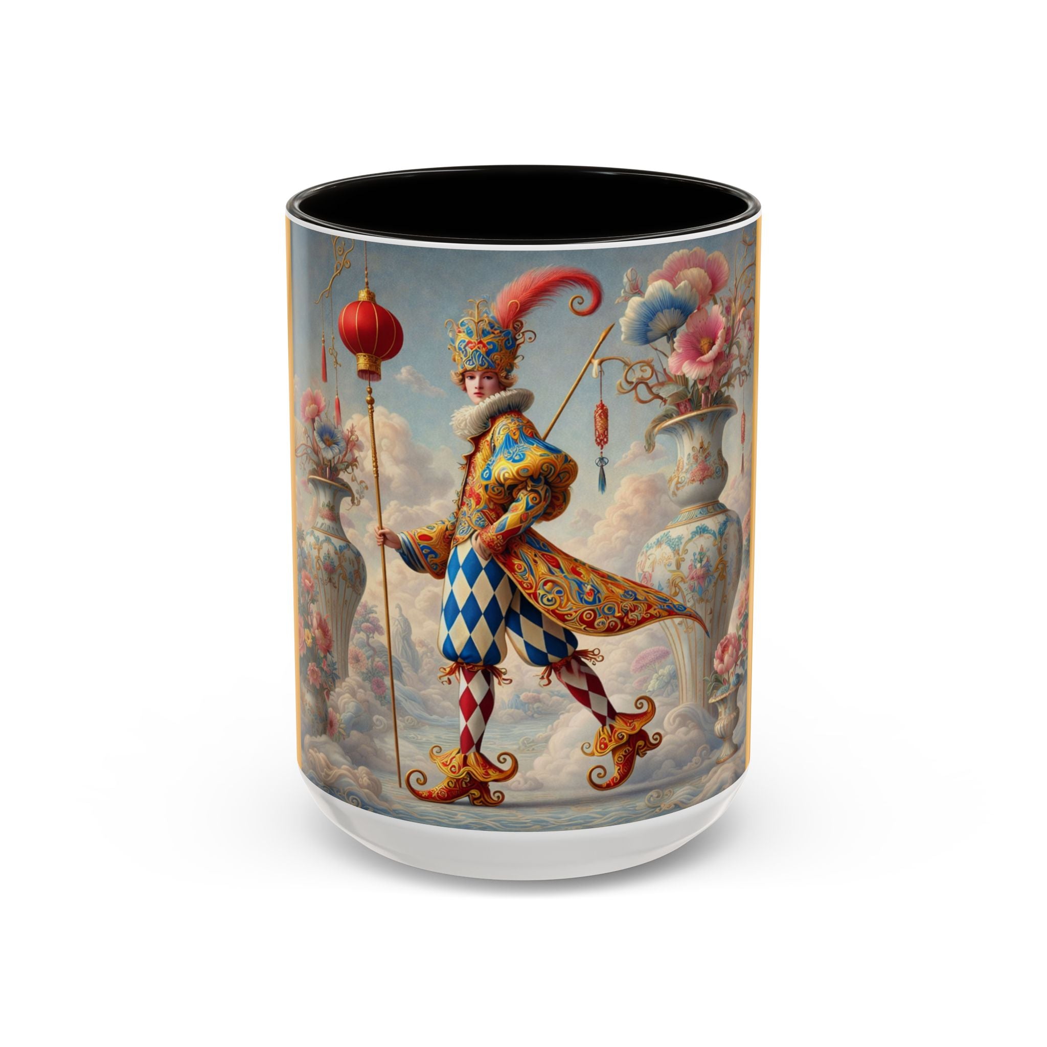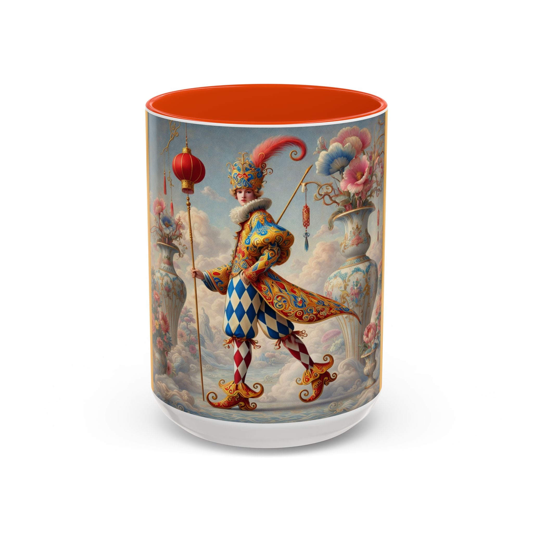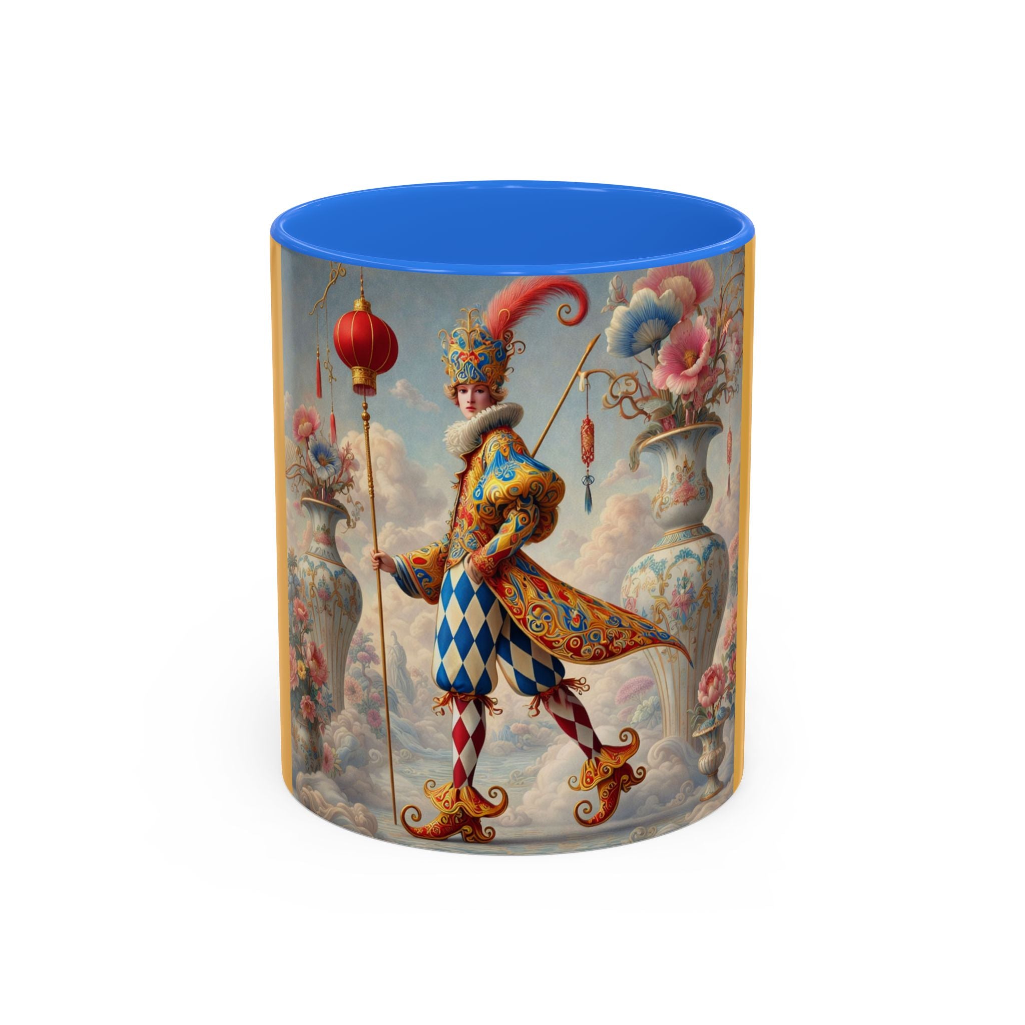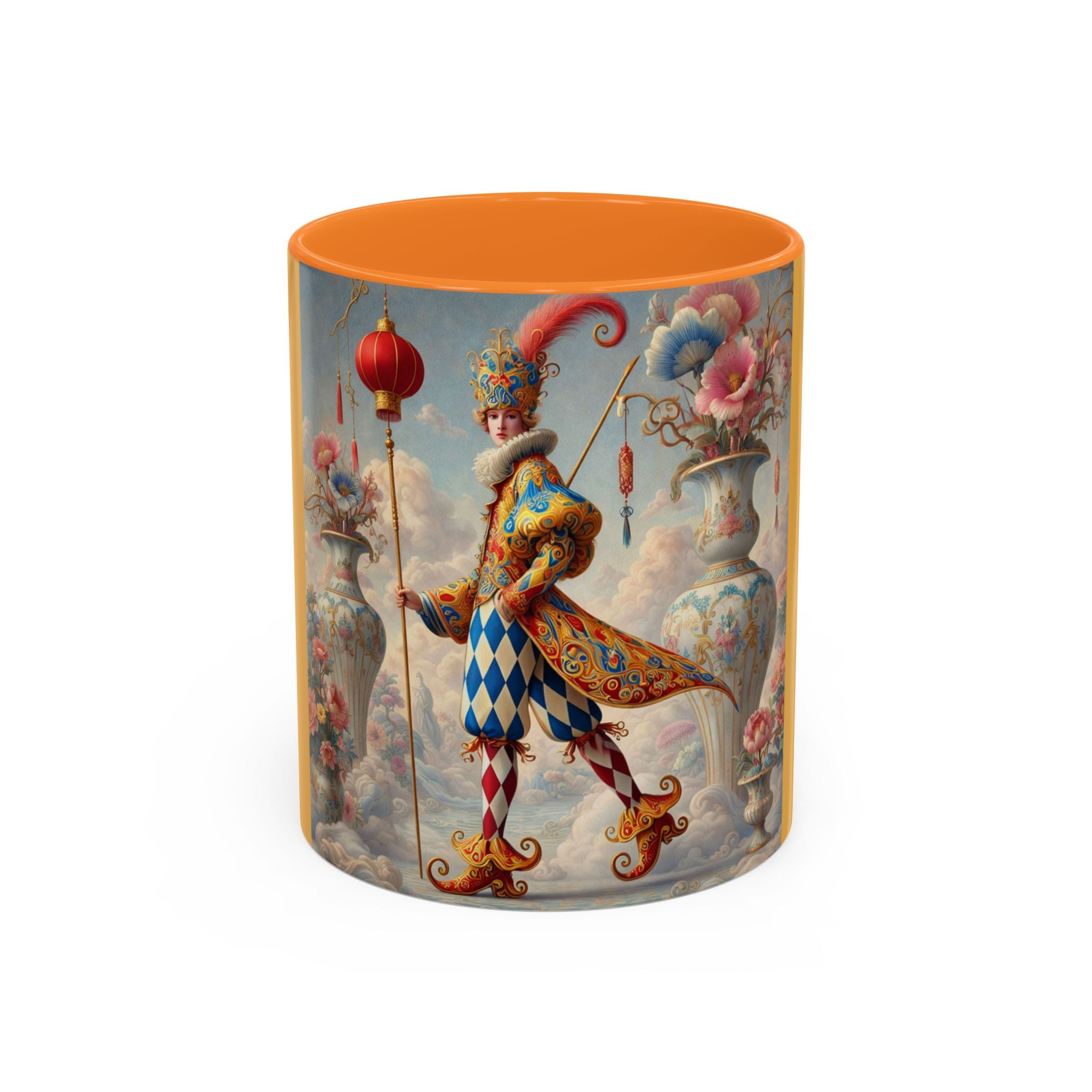 The Ornamental Jester Colorful Mugs (11oz, 15oz) bring everyday ritual and refined artistry together, turning your morning coffee or afternoon tea into a moment of quiet theater. Crafted from glossy ceramic and finished with a colored handle and interior, these mugs are available in two practical sizes and twelve accent colors, making them as expressive as they are functional. As you lift the mug, the artwork reveals a poised jester figure—elegant rather than comedic—rendered in porcelain whites, soft blush, and muted pastels, where ornamental costume details and floral accents suggest ceremony, balance, and curated beauty rather than spectacle. The result is a mug that feels timeless, decorative, and thoughtfully composed, perfect for both daily use and display.