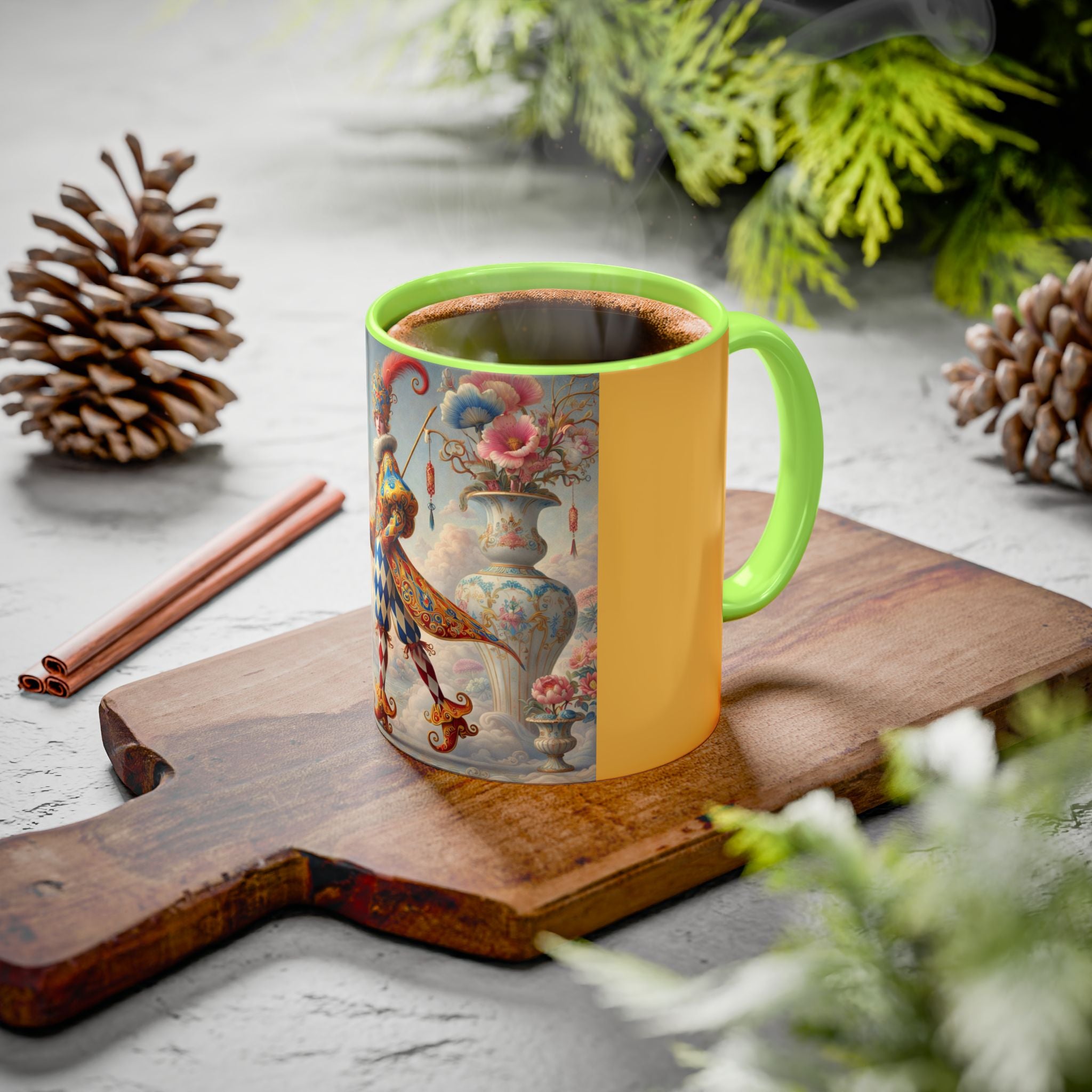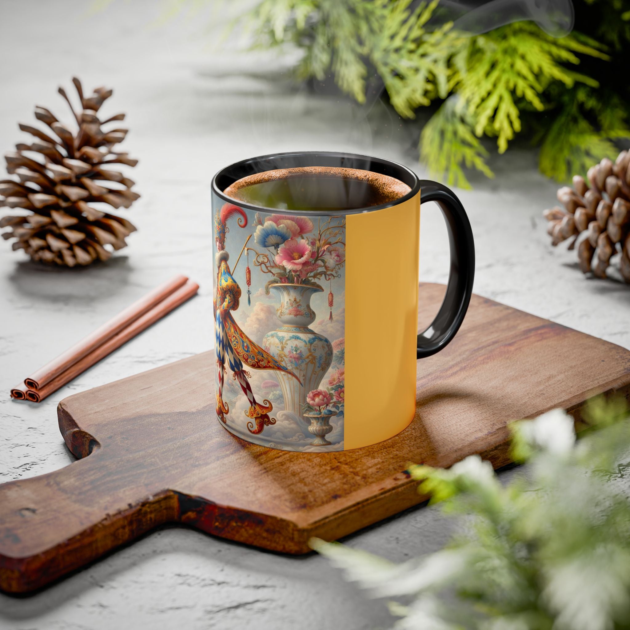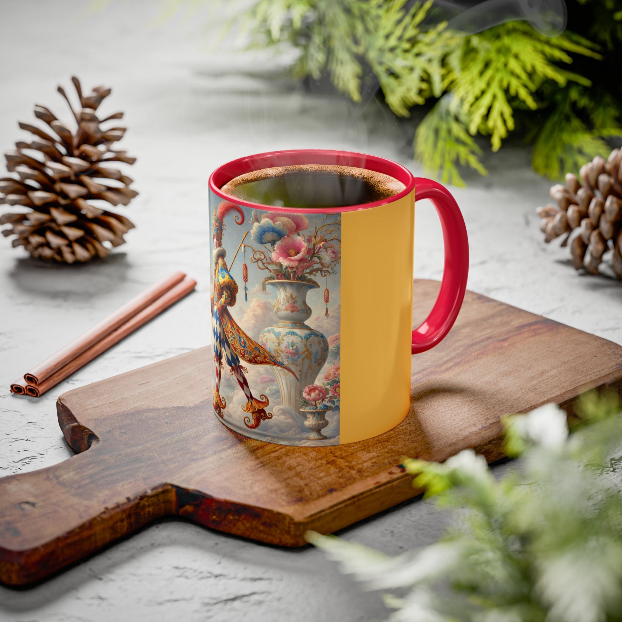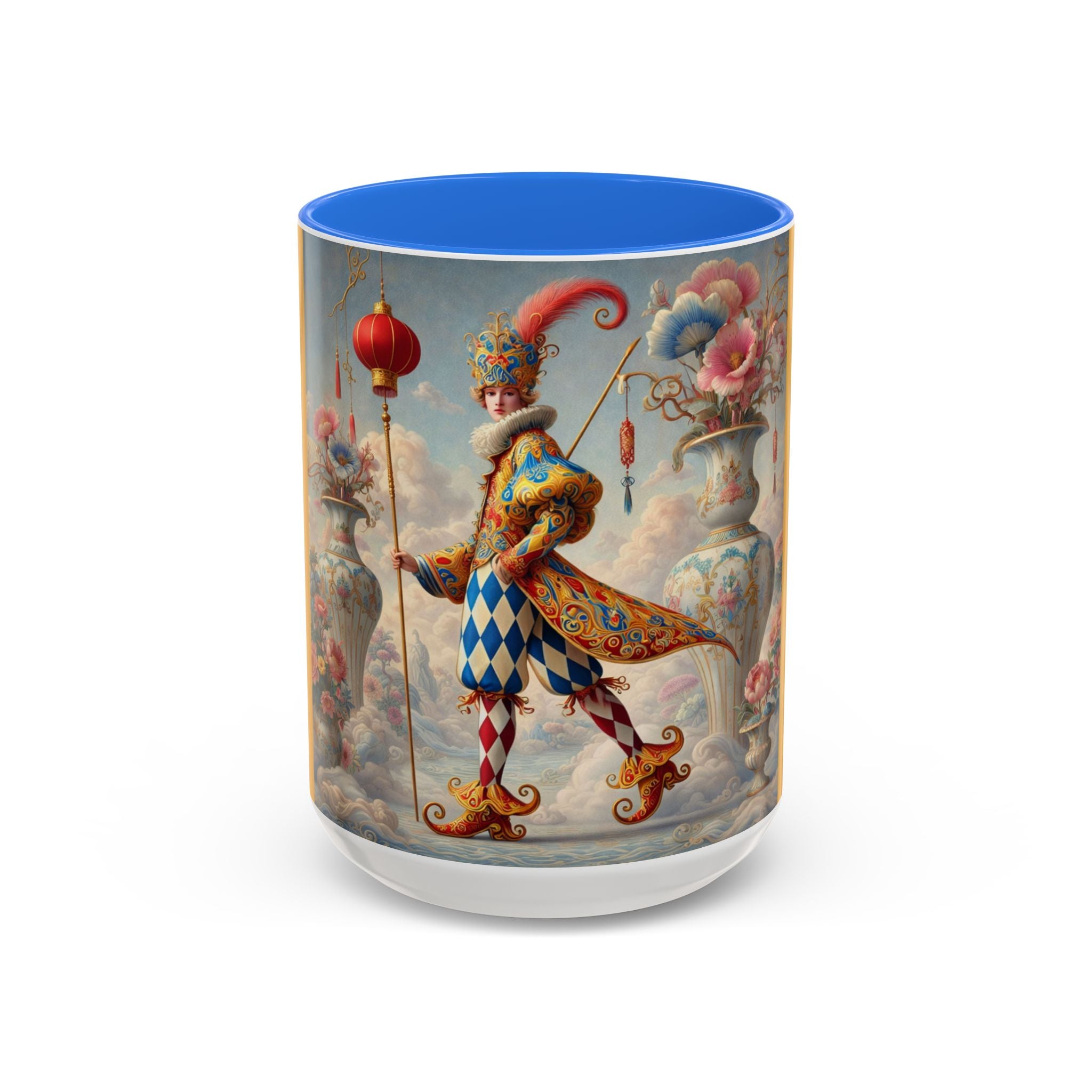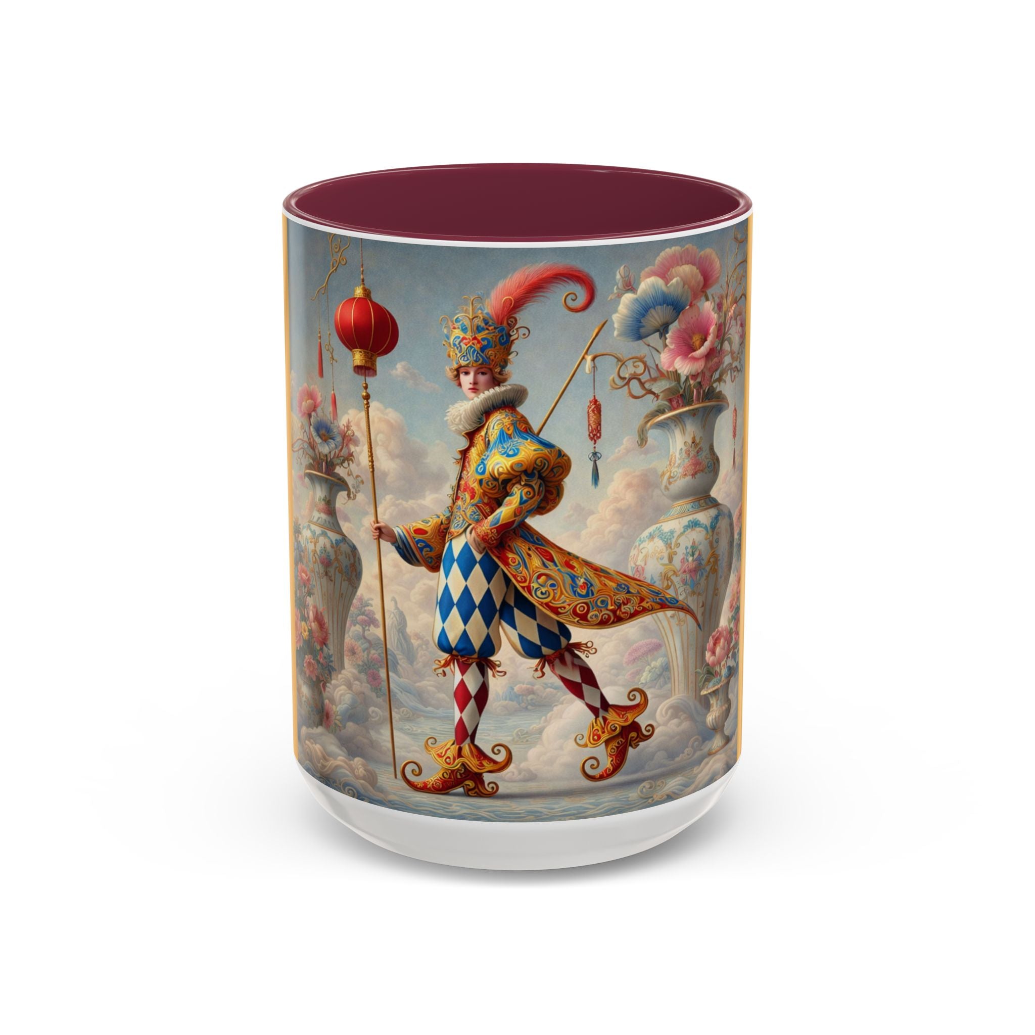 The Ornamental Jester Colorful Mugs (11oz, 15oz) bring everyday ritual and refined artistry together, turning your morning coffee or afternoon tea into a moment of quiet theater. Crafted from glossy ceramic and finished with a colored handle and interior, these mugs are available in two practical sizes and twelve accent colors, making them as expressive as they are functional. As you lift the mug, the artwork reveals a poised jester figure—elegant rather than comedic—rendered in porcelain whites, soft blush, and muted pastels, where ornamental costume details and floral accents suggest ceremony, balance, and curated beauty rather than spectacle. The result is a mug that feels timeless, decorative, and thoughtfully composed, perfect for both daily use and display.