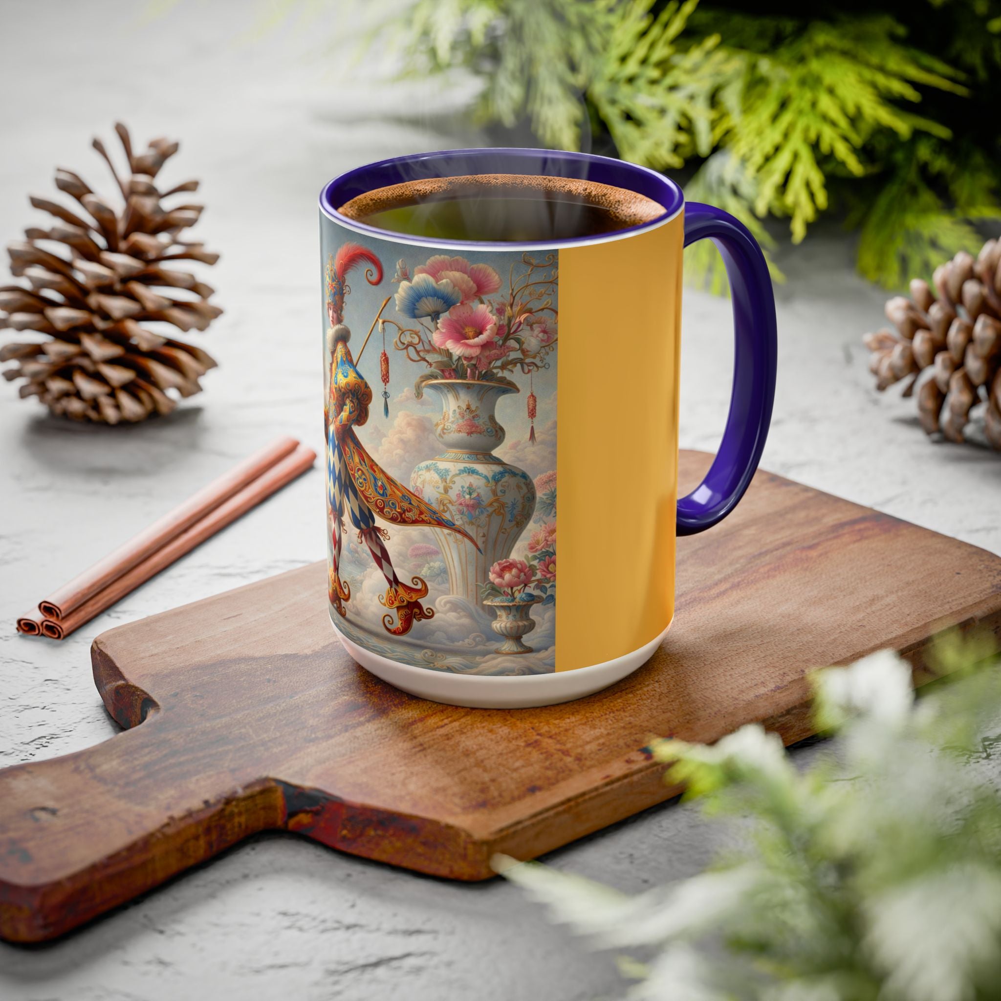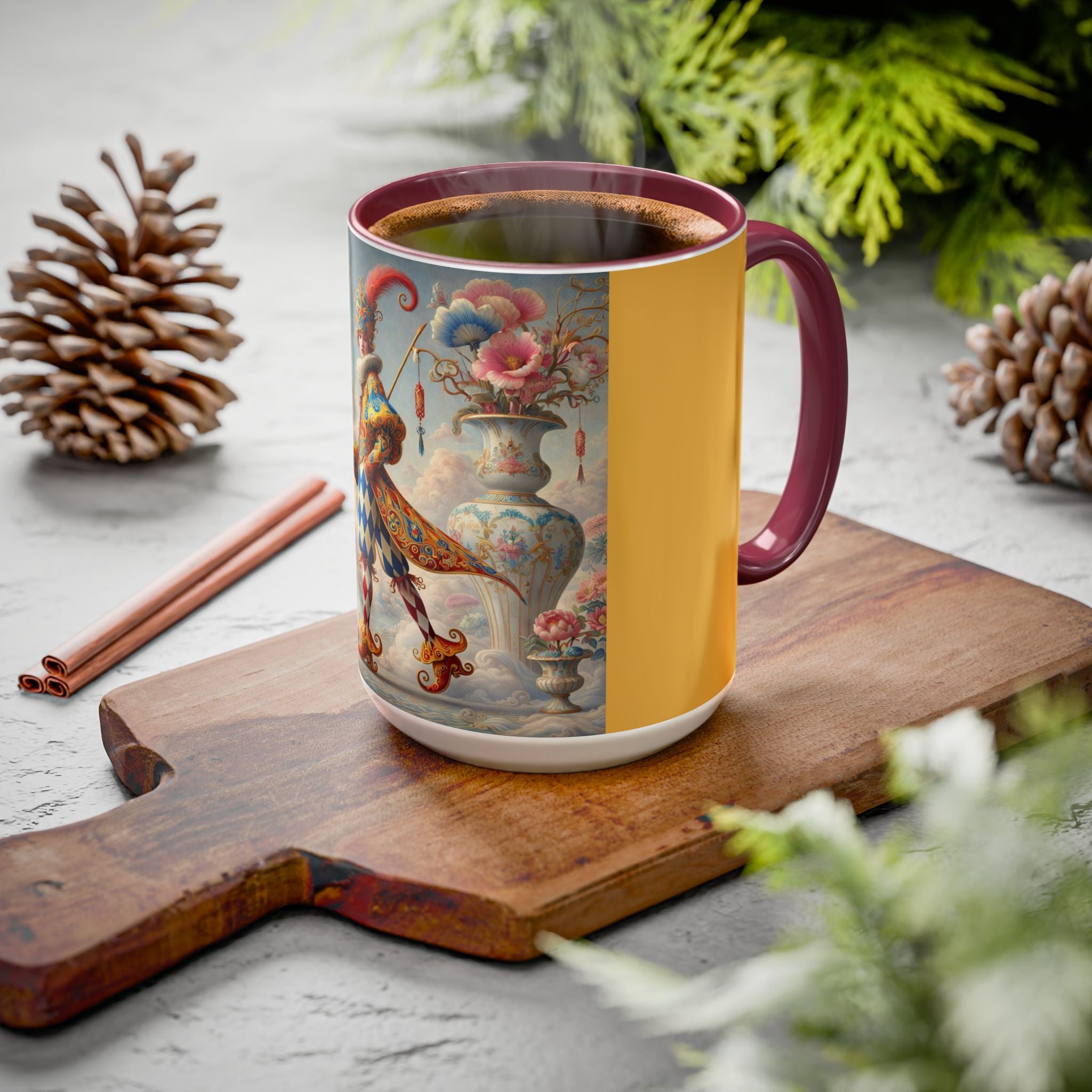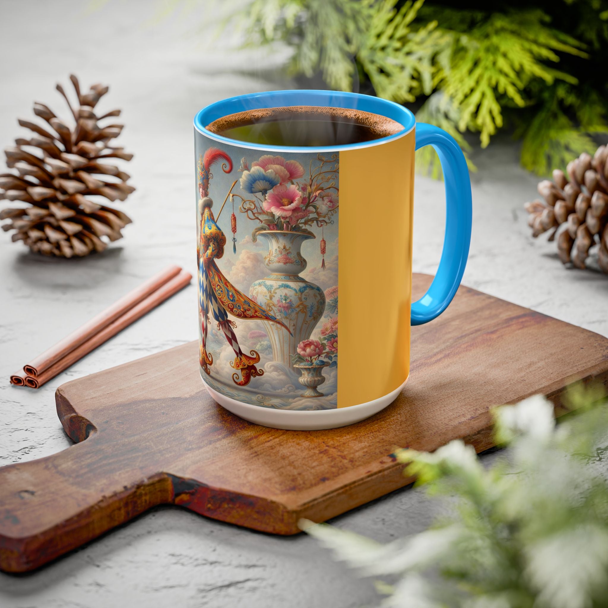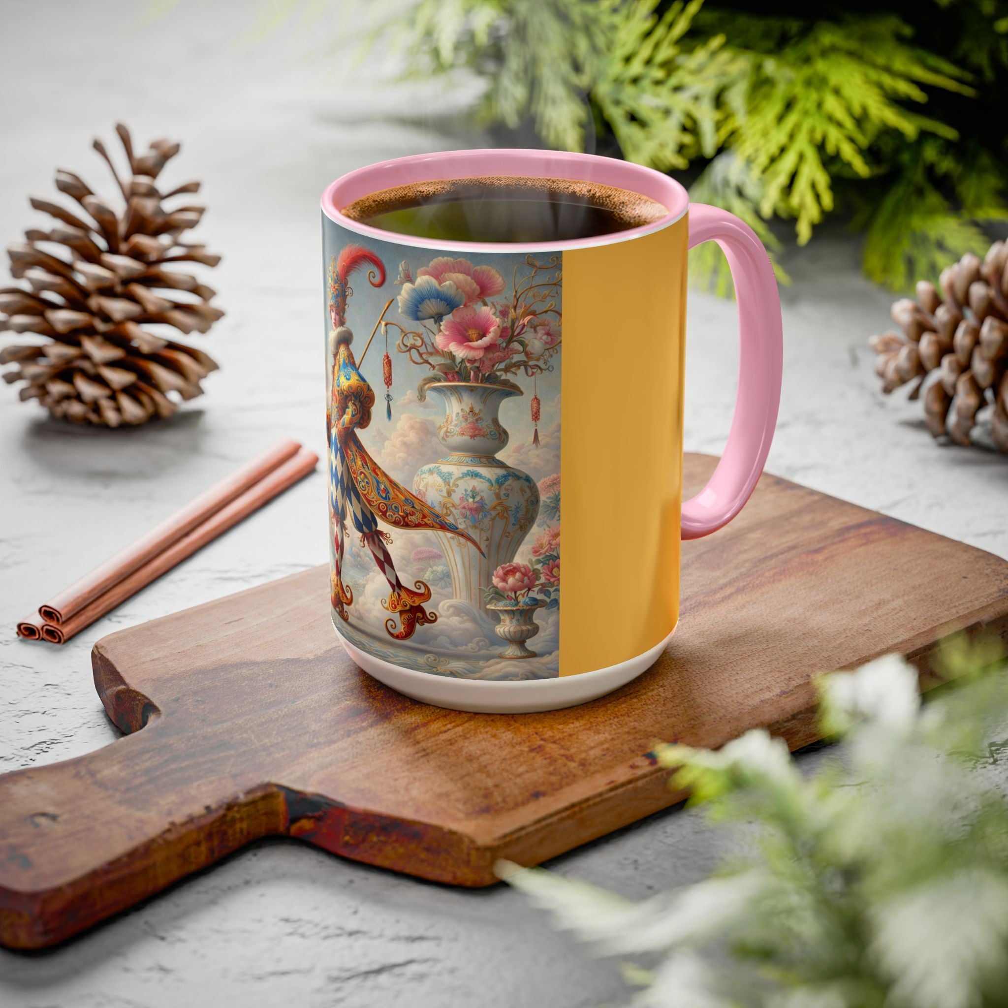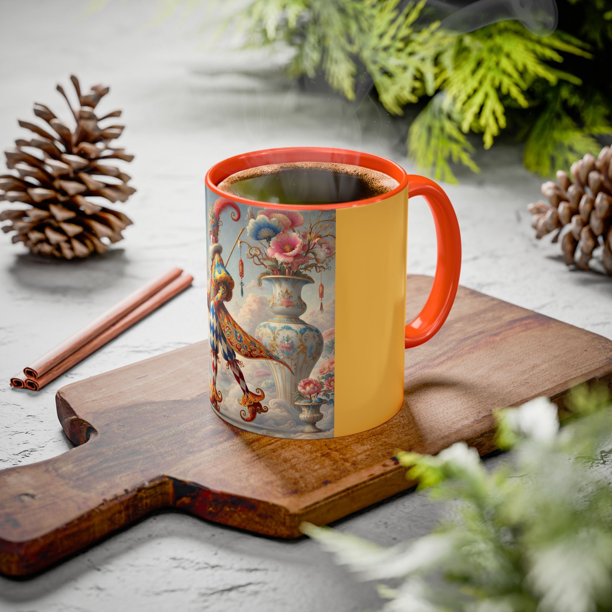 The Ornamental Jester Colorful Mugs (11oz, 15oz) bring everyday ritual and refined artistry together, turning your morning coffee or afternoon tea into a moment of quiet theater. Crafted from glossy ceramic and finished with a colored handle and interior, these mugs are available in two practical sizes and twelve accent colors, making them as expressive as they are functional. As you lift the mug, the artwork reveals a poised jester figure—elegant rather than comedic—rendered in porcelain whites, soft blush, and muted pastels, where ornamental costume details and floral accents suggest ceremony, balance, and curated beauty rather than spectacle. The result is a mug that feels timeless, decorative, and thoughtfully composed, perfect for both daily use and display.