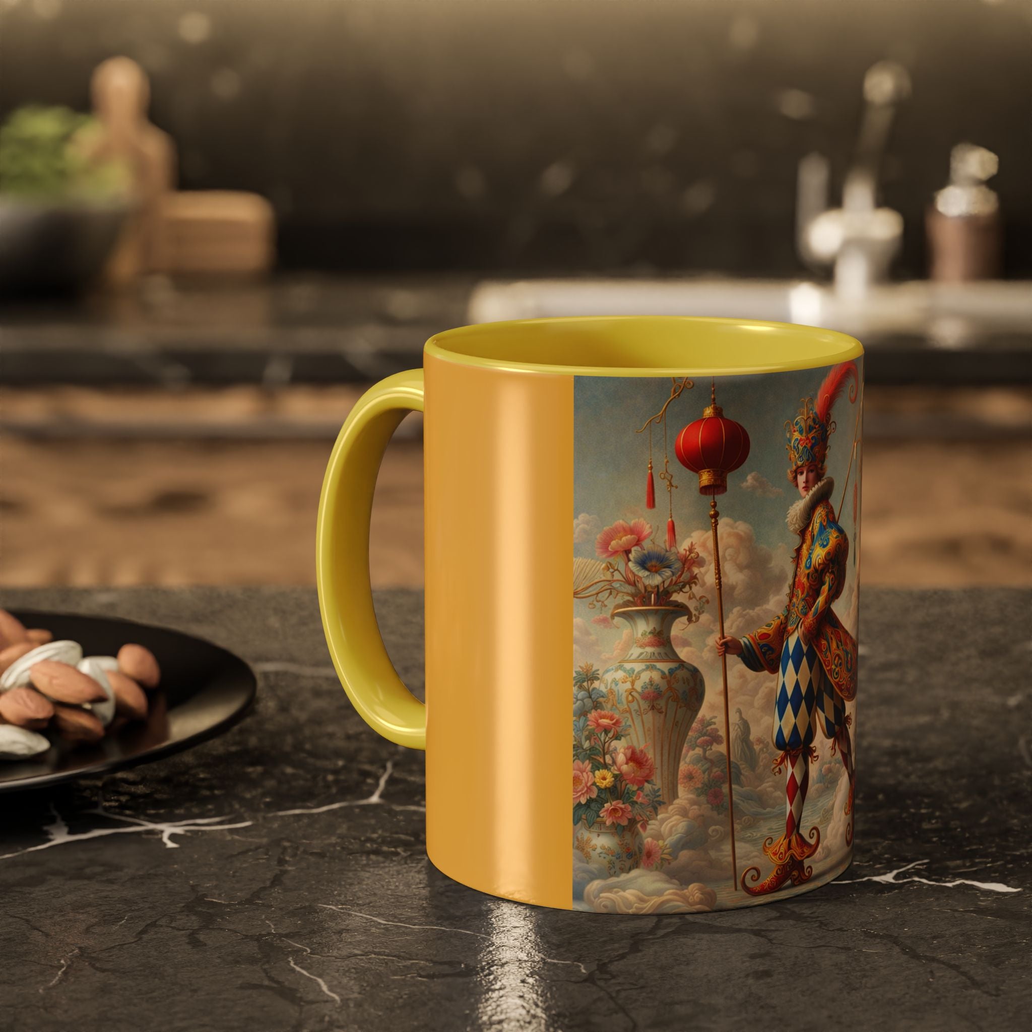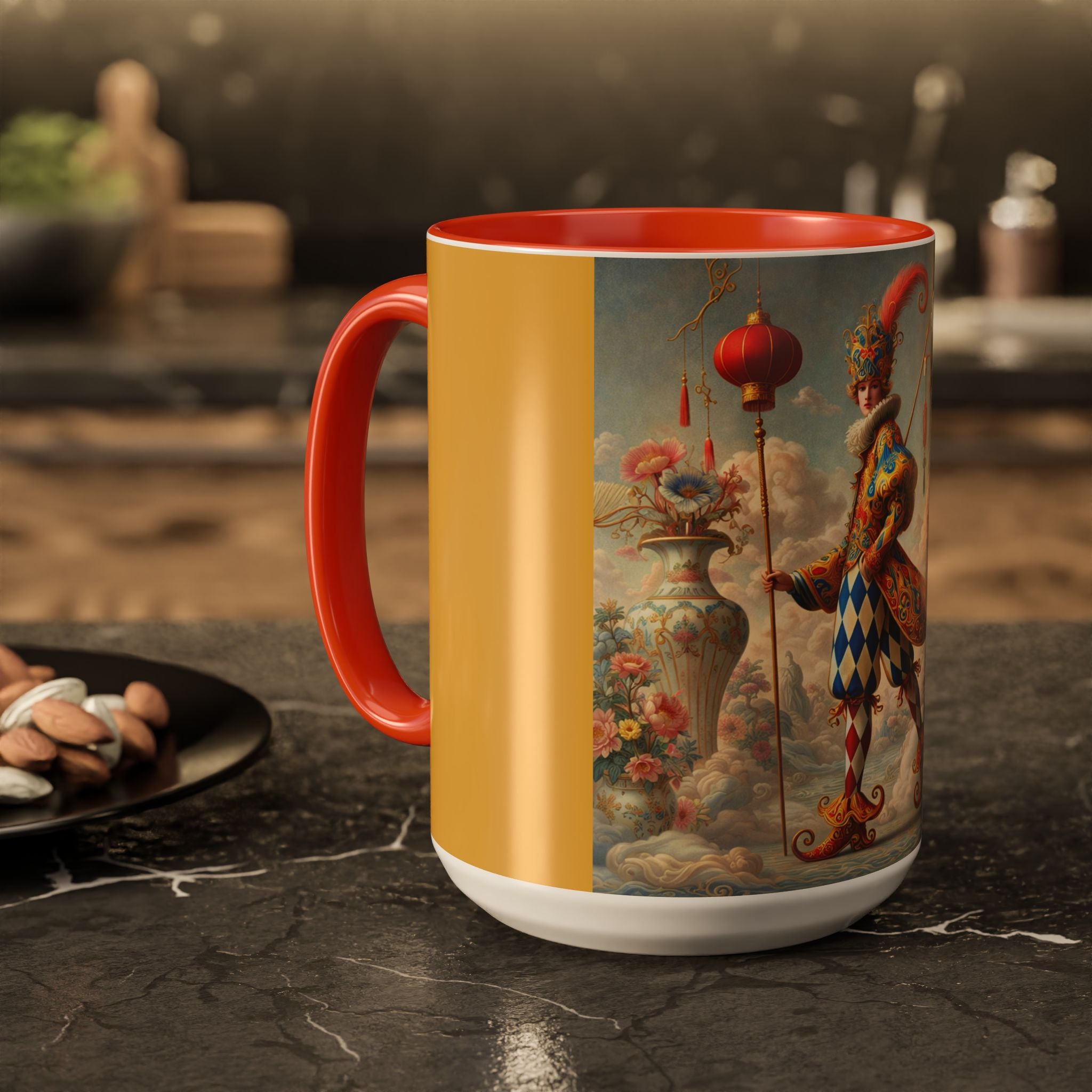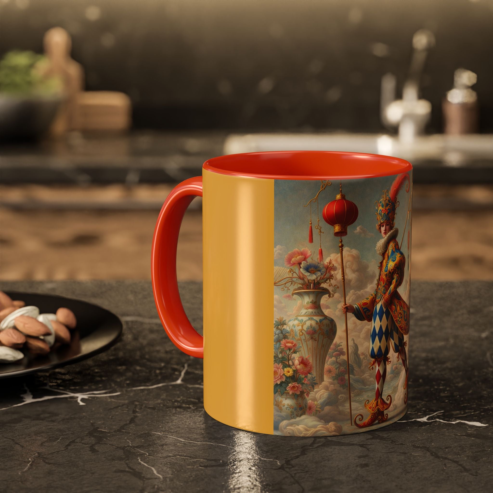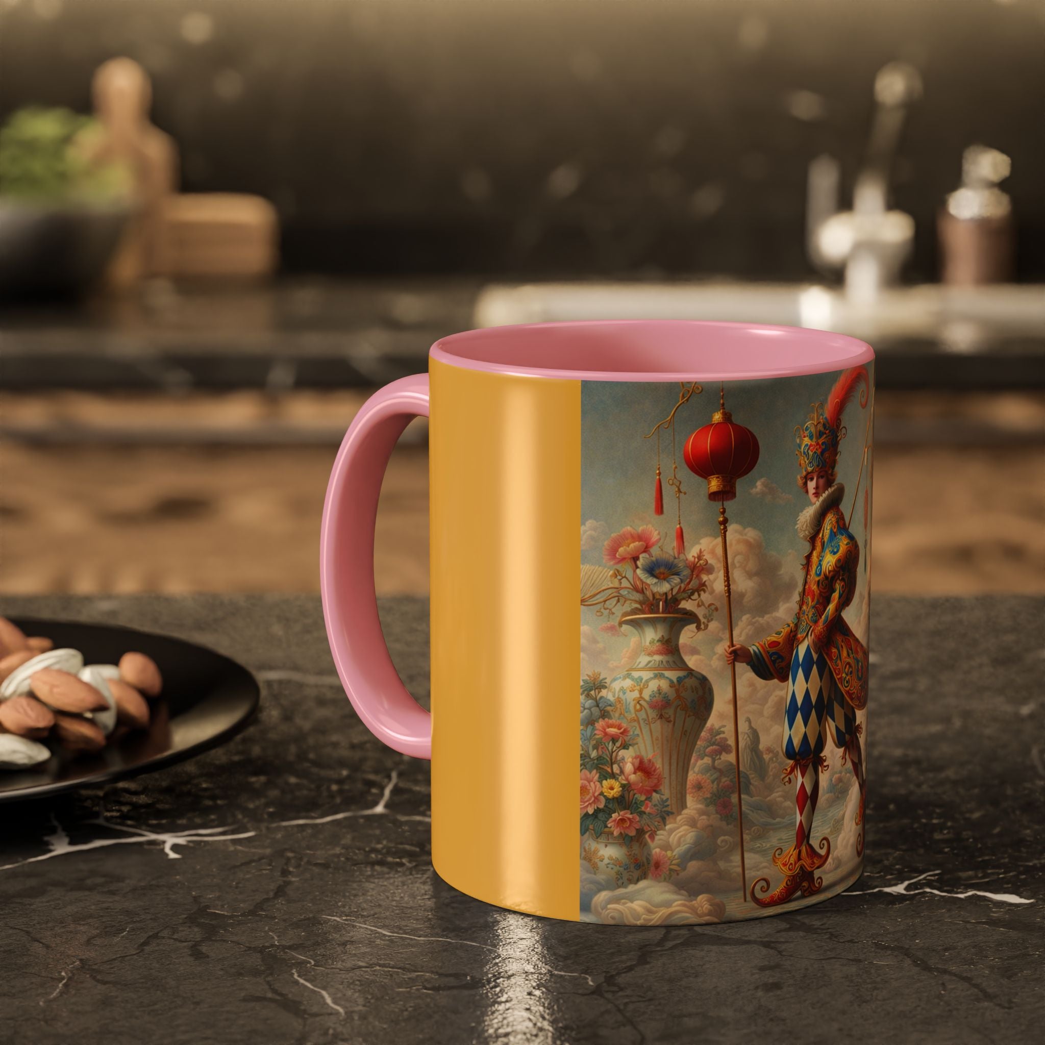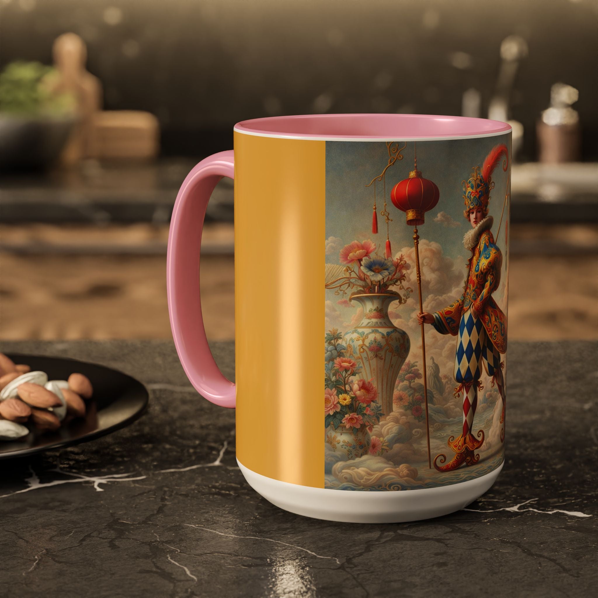 The Ornamental Jester Colorful Mugs (11oz, 15oz) bring everyday ritual and refined artistry together, turning your morning coffee or afternoon tea into a moment of quiet theater. Crafted from glossy ceramic and finished with a colored handle and interior, these mugs are available in two practical sizes and twelve accent colors, making them as expressive as they are functional. As you lift the mug, the artwork reveals a poised jester figure—elegant rather than comedic—rendered in porcelain whites, soft blush, and muted pastels, where ornamental costume details and floral accents suggest ceremony, balance, and curated beauty rather than spectacle. The result is a mug that feels timeless, decorative, and thoughtfully composed, perfect for both daily use and display.