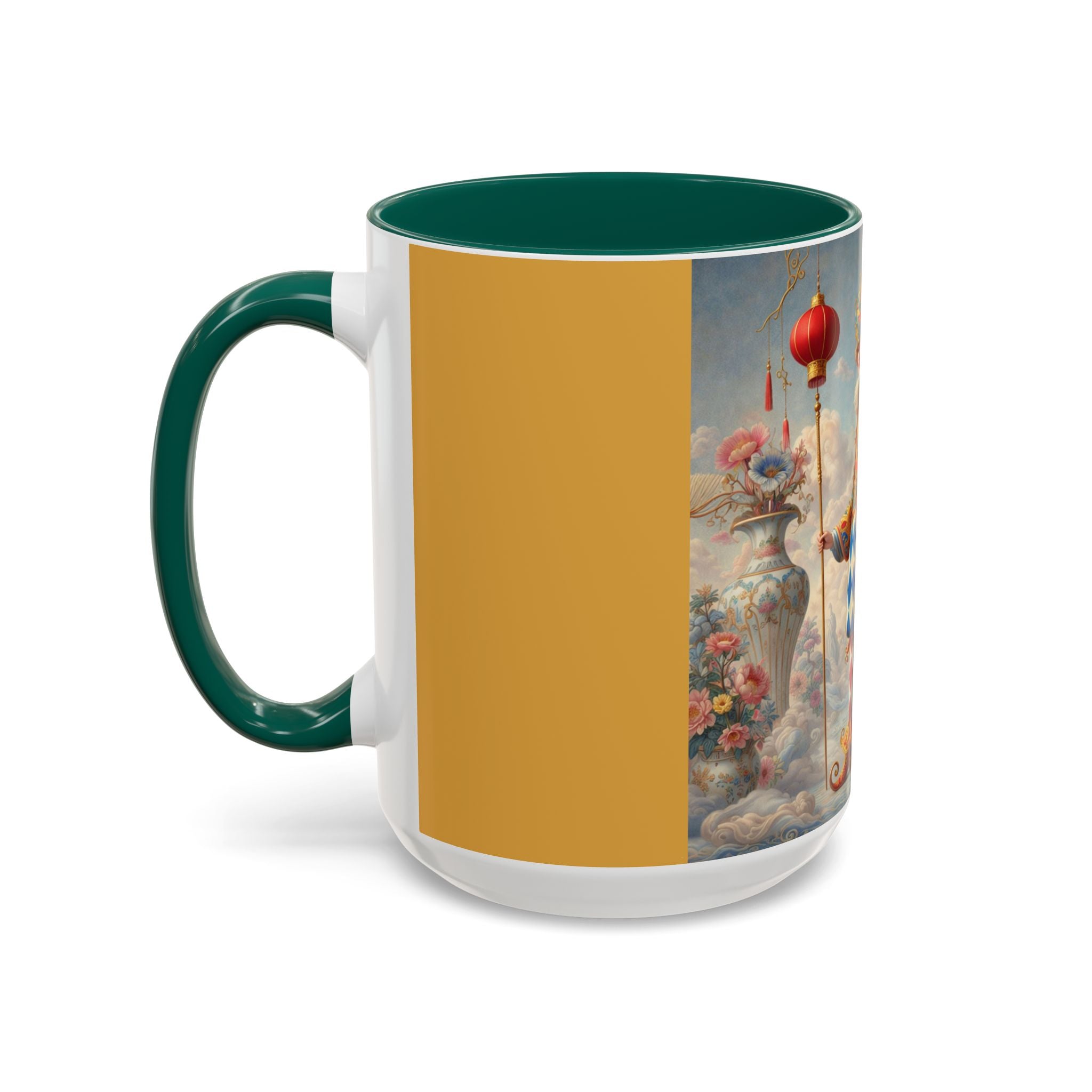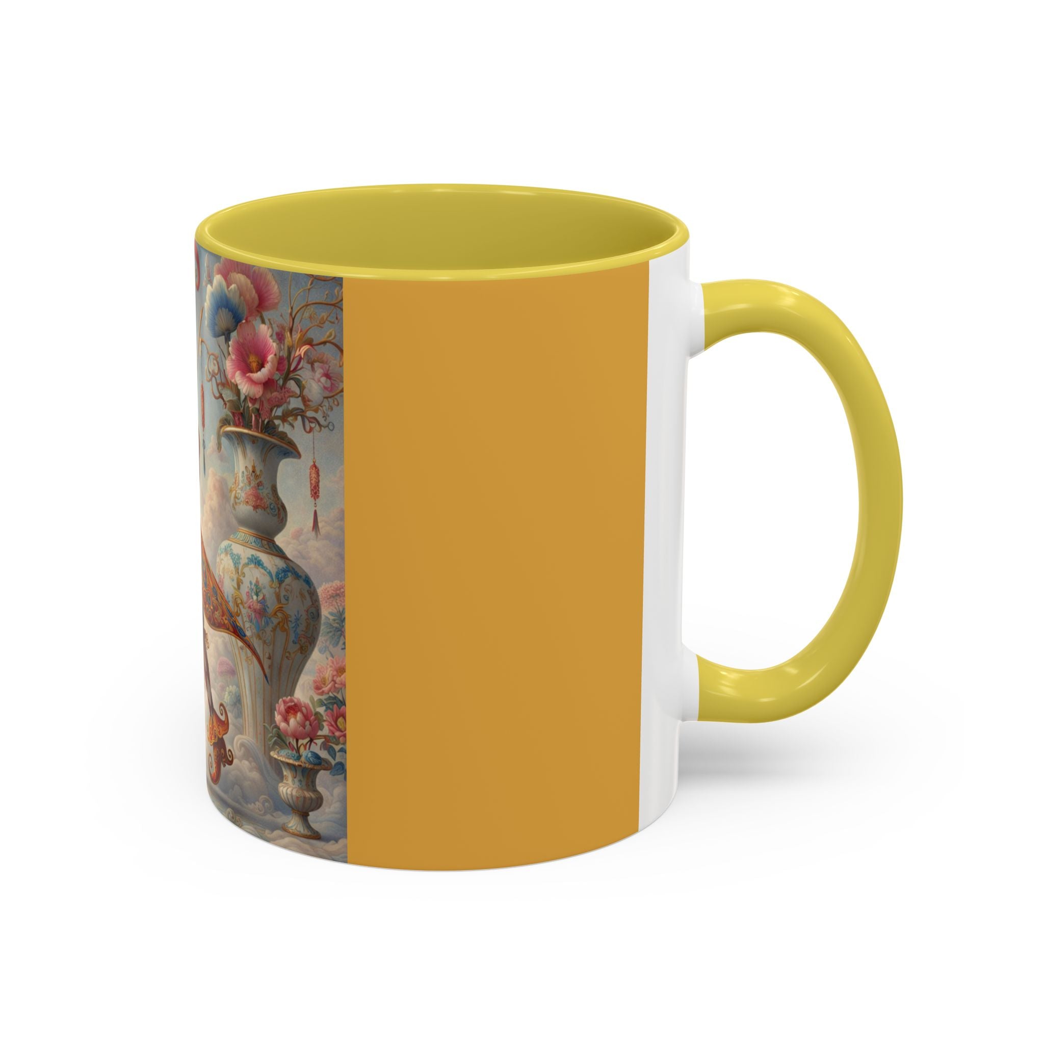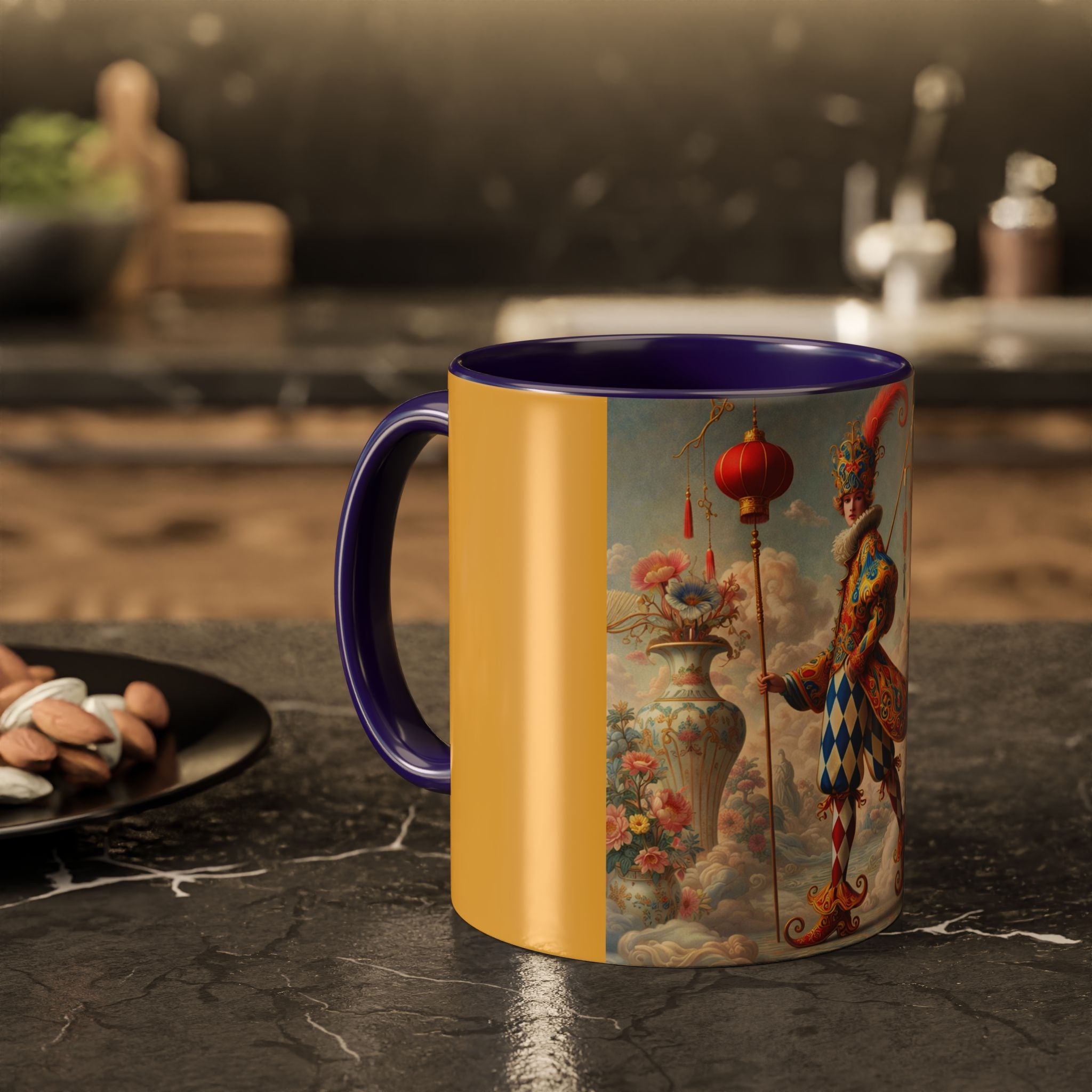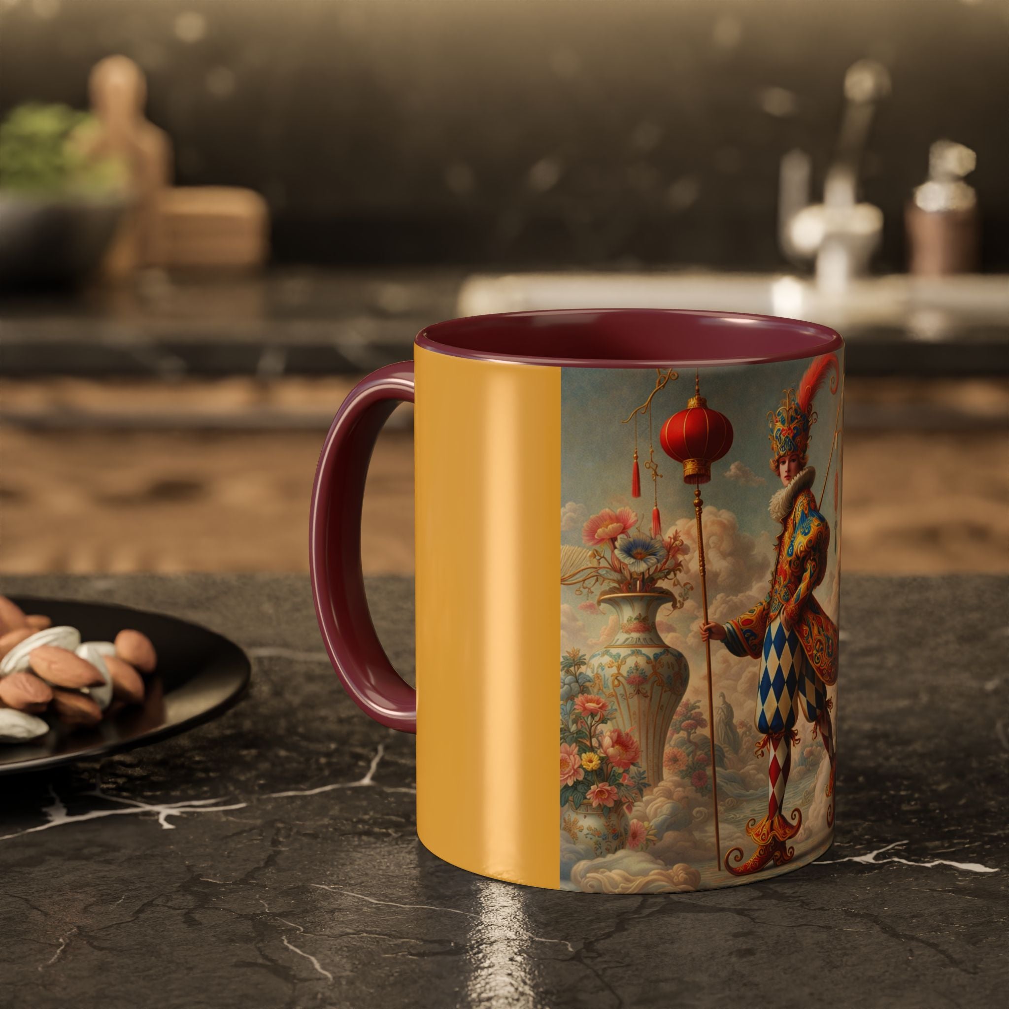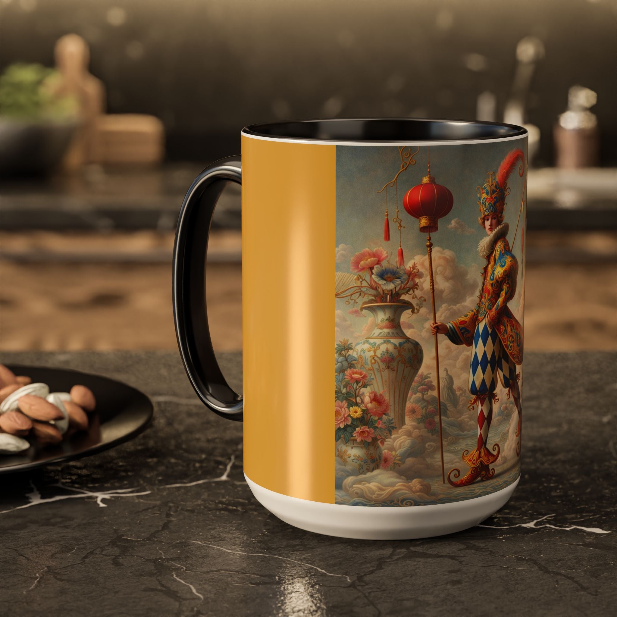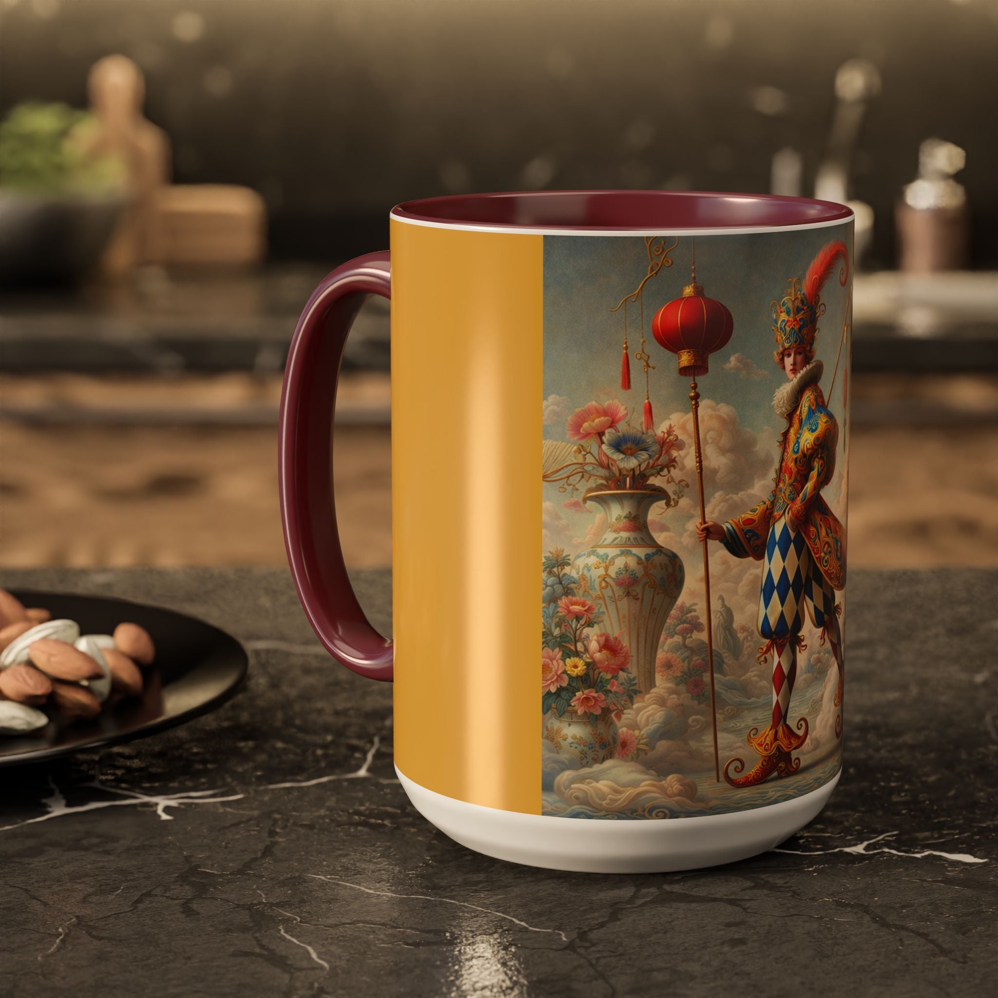 The Ornamental Jester Colorful Mugs (11oz, 15oz) bring everyday ritual and refined artistry together, turning your morning coffee or afternoon tea into a moment of quiet theater. Crafted from glossy ceramic and finished with a colored handle and interior, these mugs are available in two practical sizes and twelve accent colors, making them as expressive as they are functional. As you lift the mug, the artwork reveals a poised jester figure—elegant rather than comedic—rendered in porcelain whites, soft blush, and muted pastels, where ornamental costume details and floral accents suggest ceremony, balance, and curated beauty rather than spectacle. The result is a mug that feels timeless, decorative, and thoughtfully composed, perfect for both daily use and display.